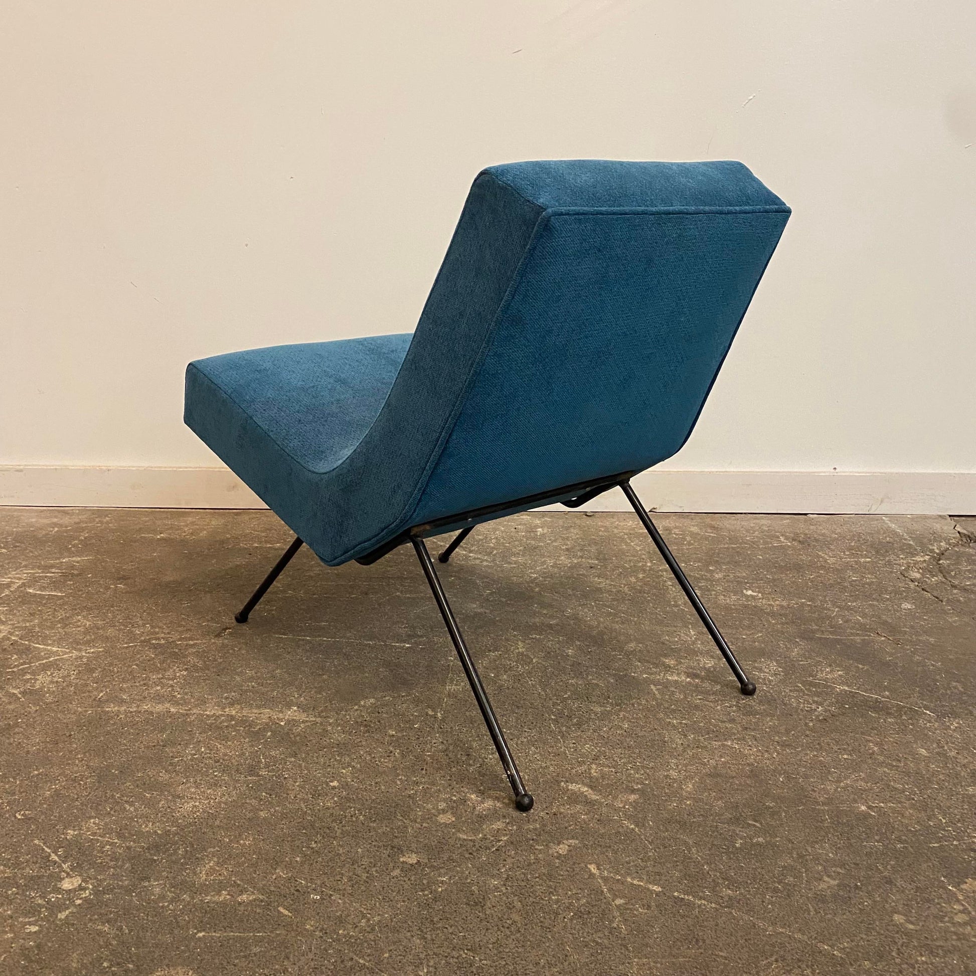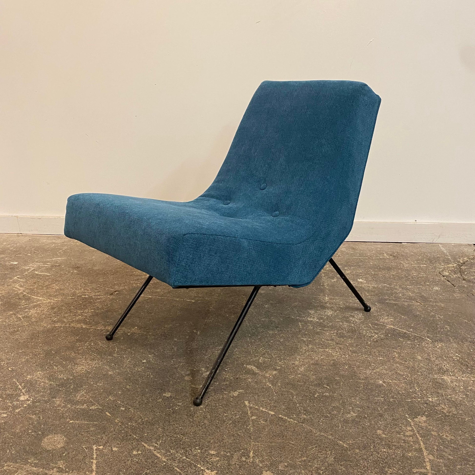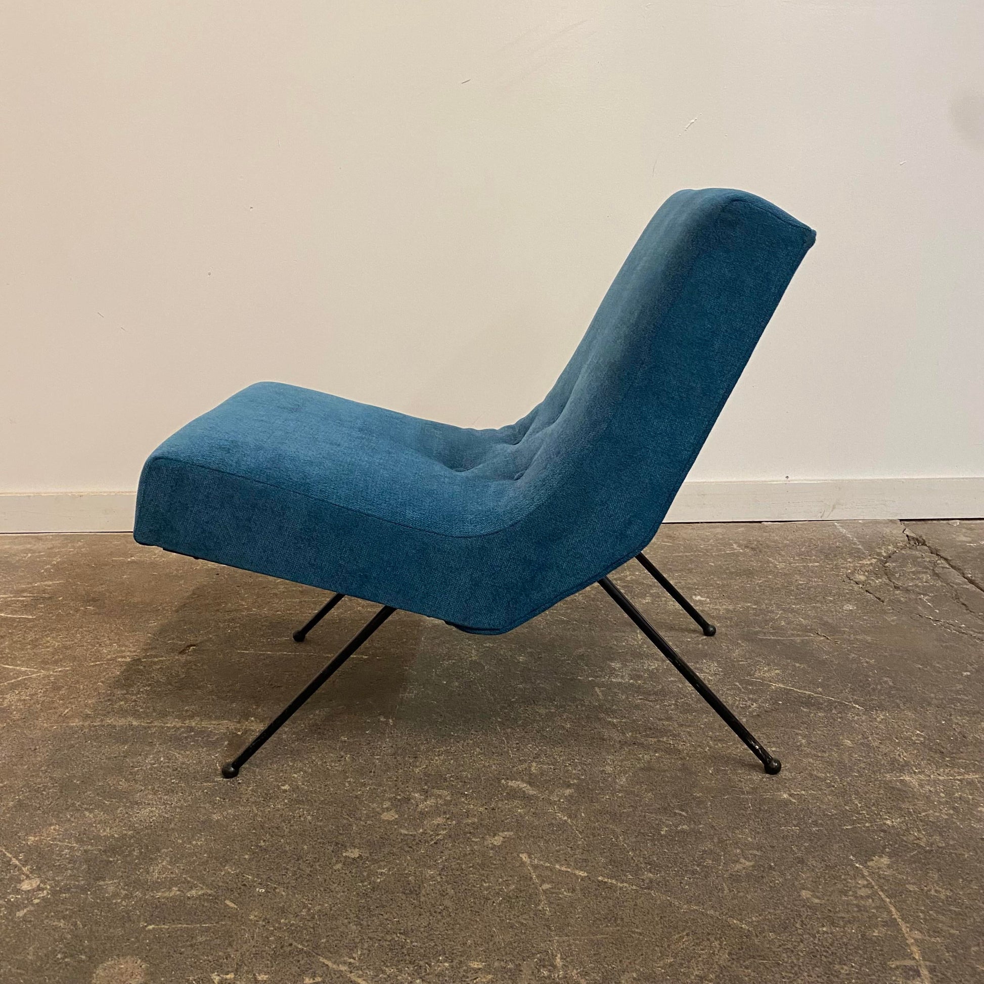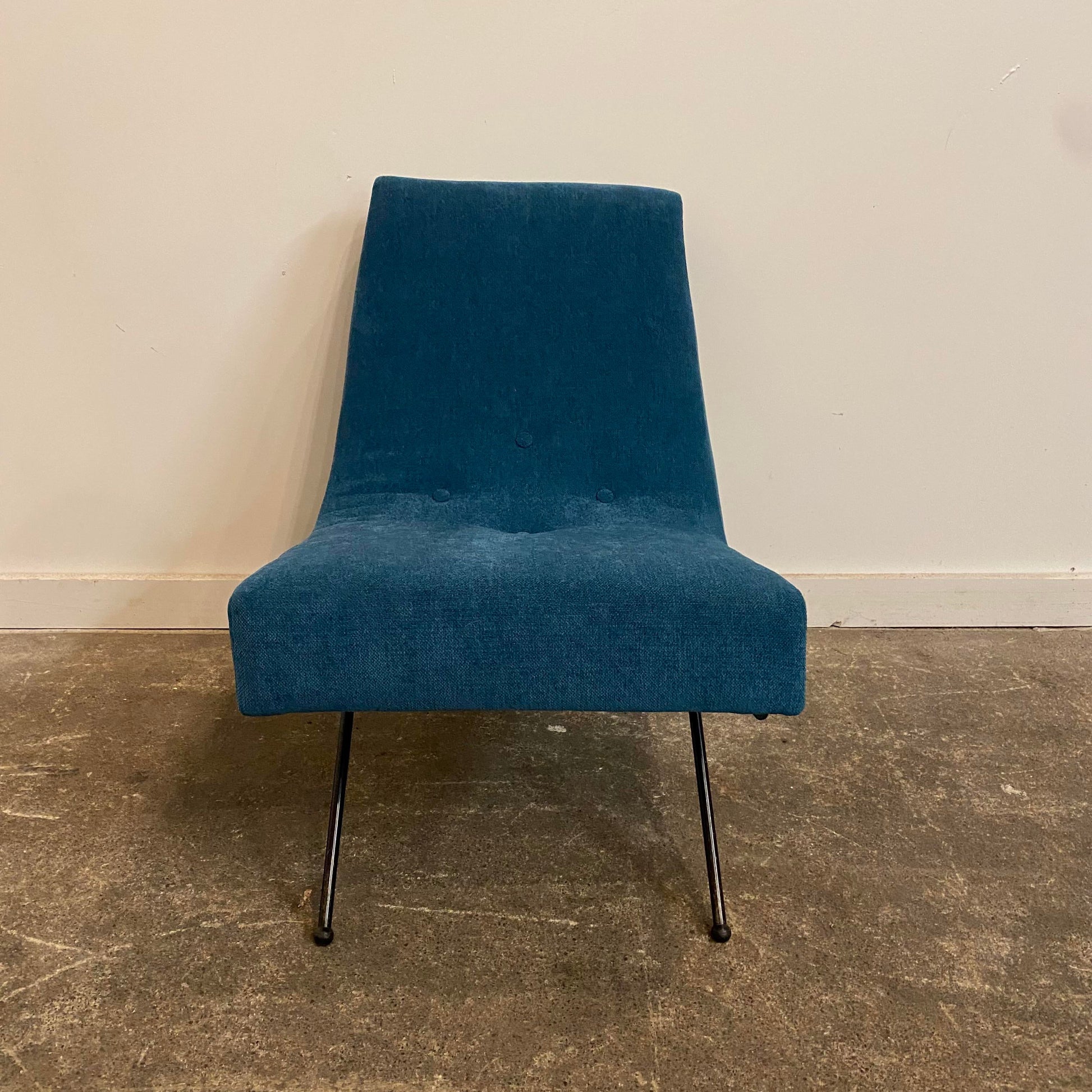 An uncommon mid-century modern slipper chair by Adrian Pearsall with iron legs. The chair has been completely reupholstered with new foam in a teal crypton fabric. Crypton fabric is stain, water and bacteria resistant.