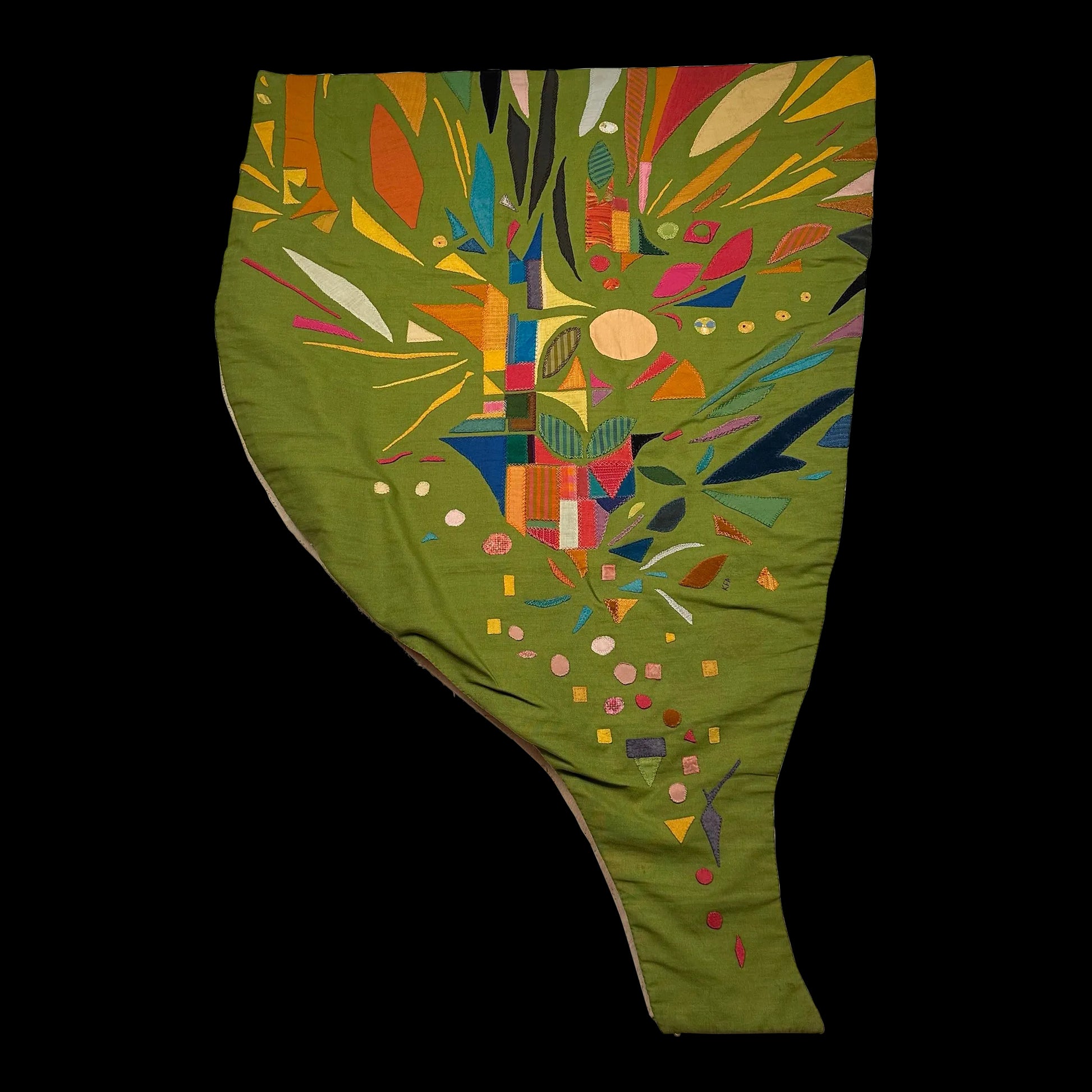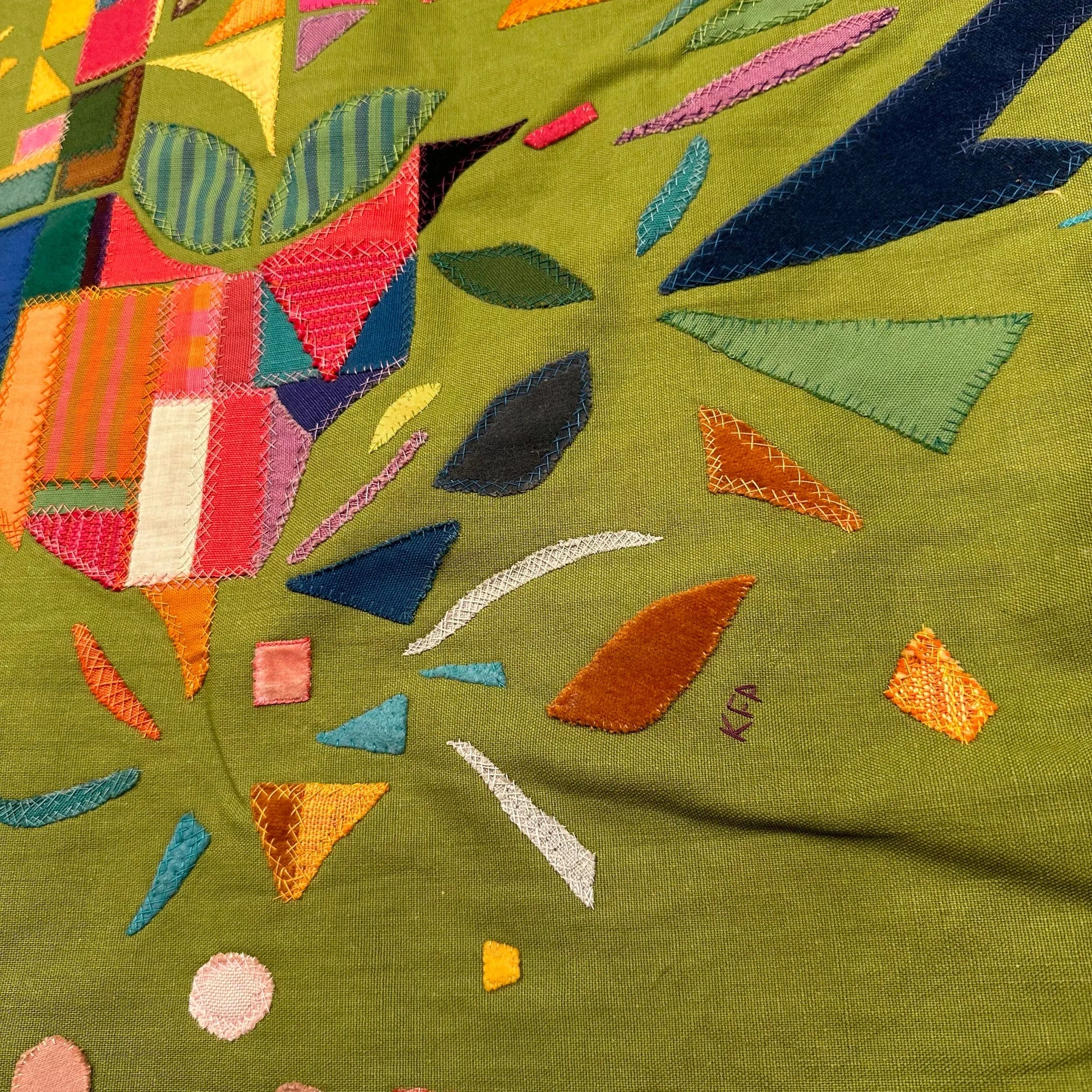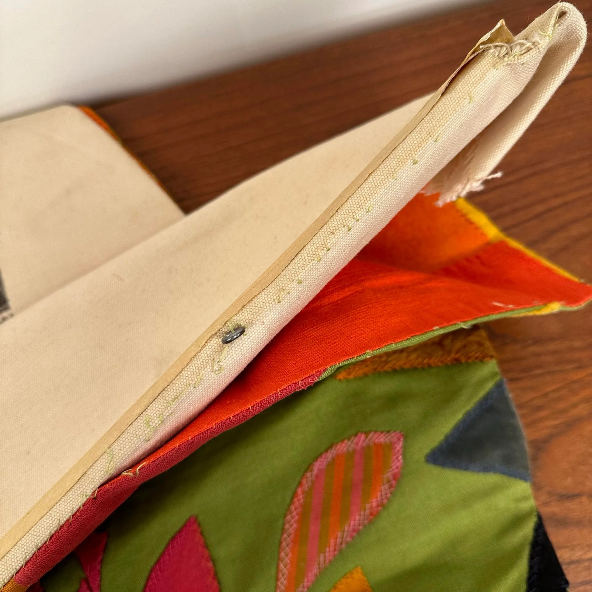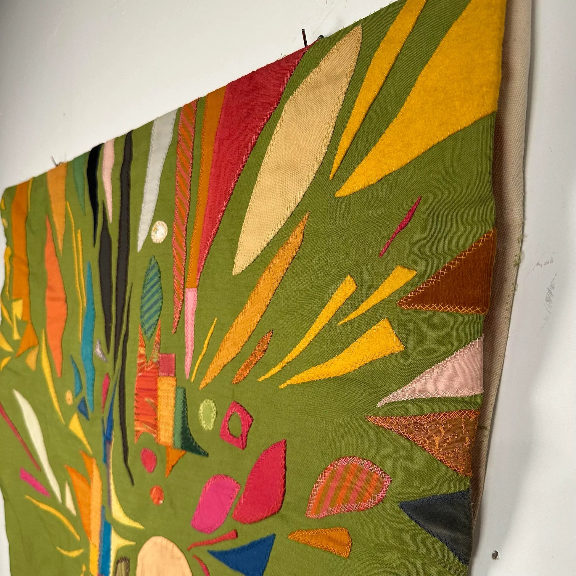 1960s Studio Fiber Art Tapestry titles “Joy” by New York artist Kristina Friberg. This quilted fiber art is an abstract collage of fabrics, shapes, and colors. The piece is dated and singed multiple times by the artist.