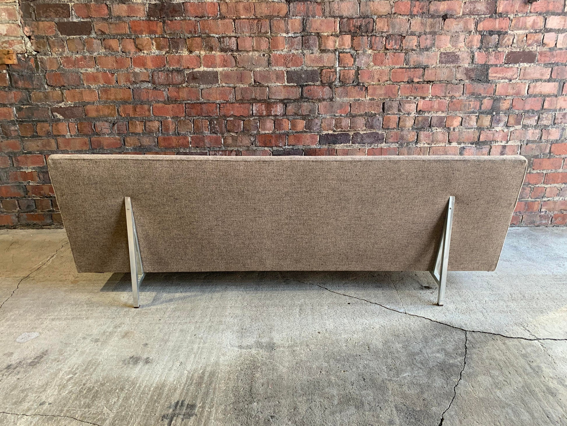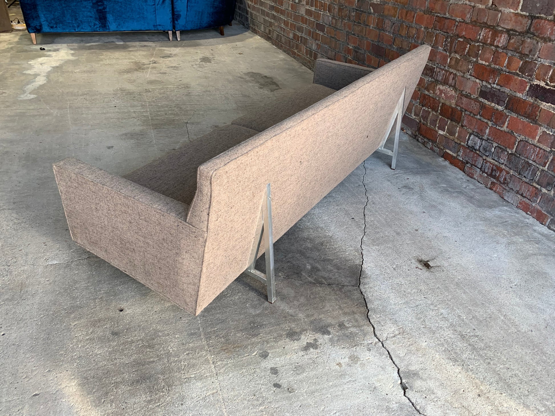 This rare mid-century modern custom Dunbar sofa is in very good vintage condition. The metal base extends up the back for an interesting design detail. It has rosewood caps to the feet.