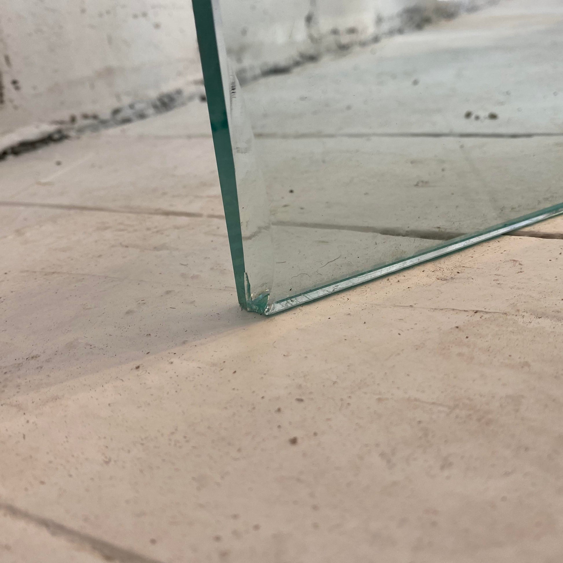 This is an amazing piece. The four glass sections are each curved and sandblasted with design. They are connected by brass hardware that add to the design.