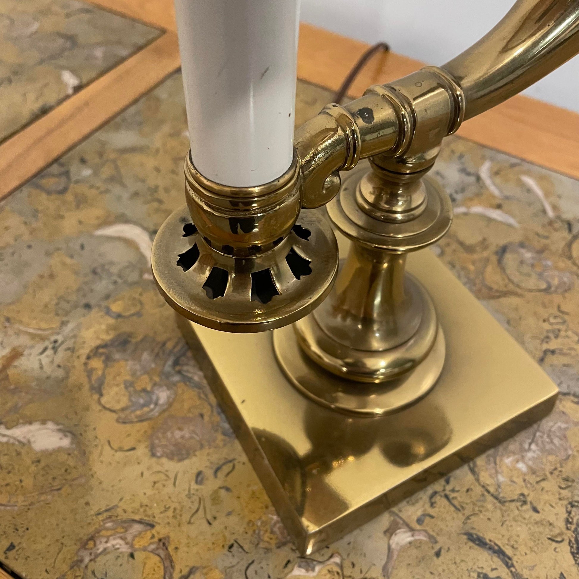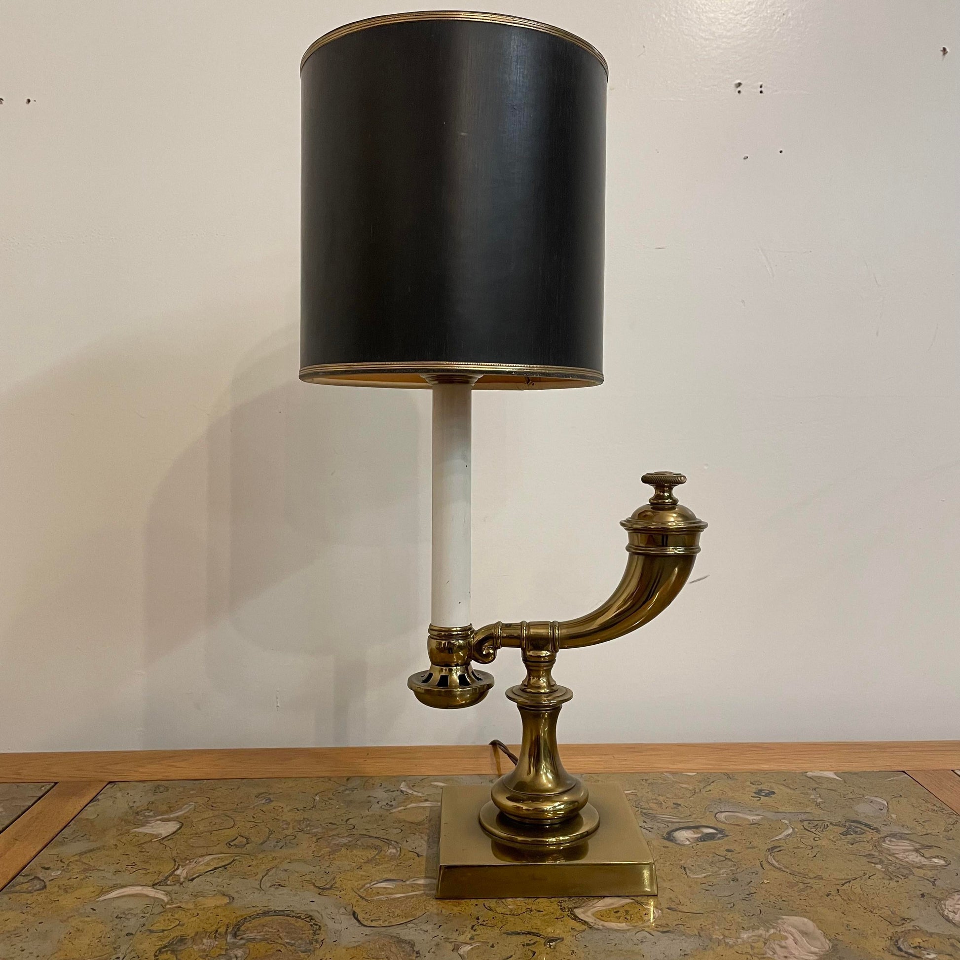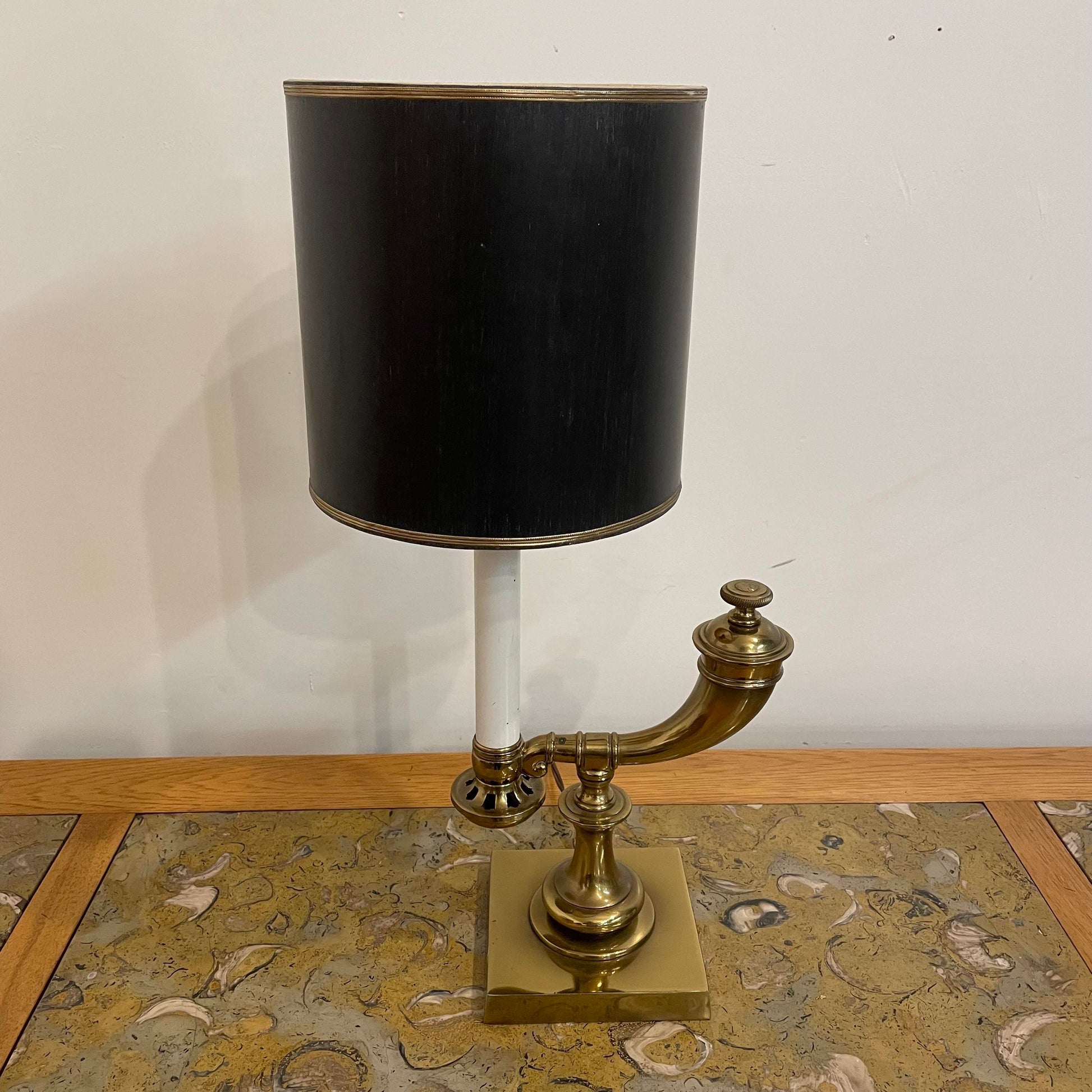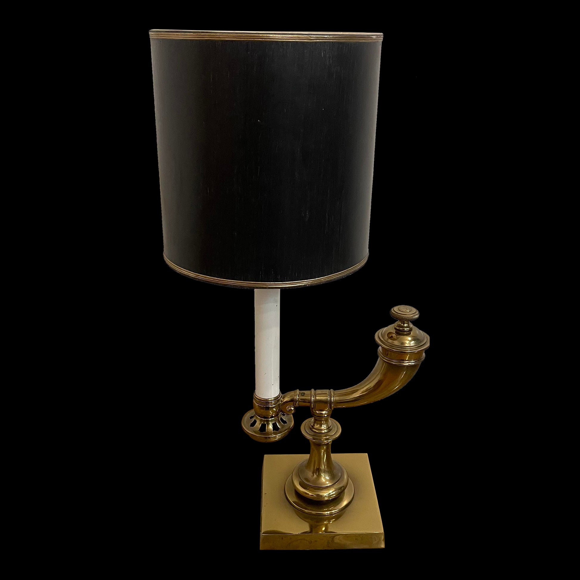The base is brass with a black shade and brass details