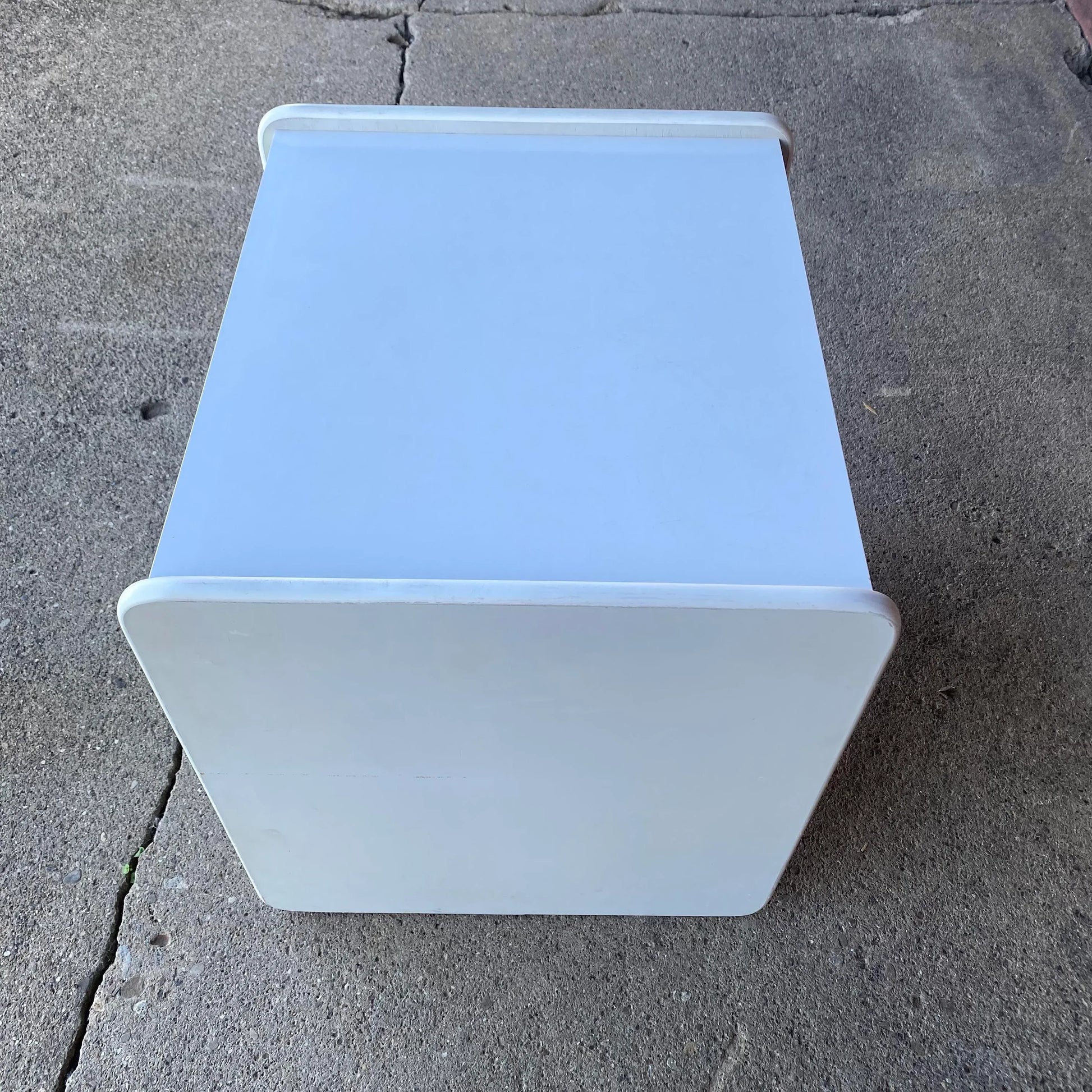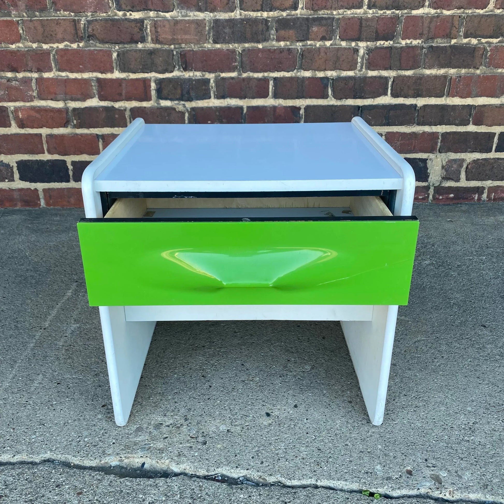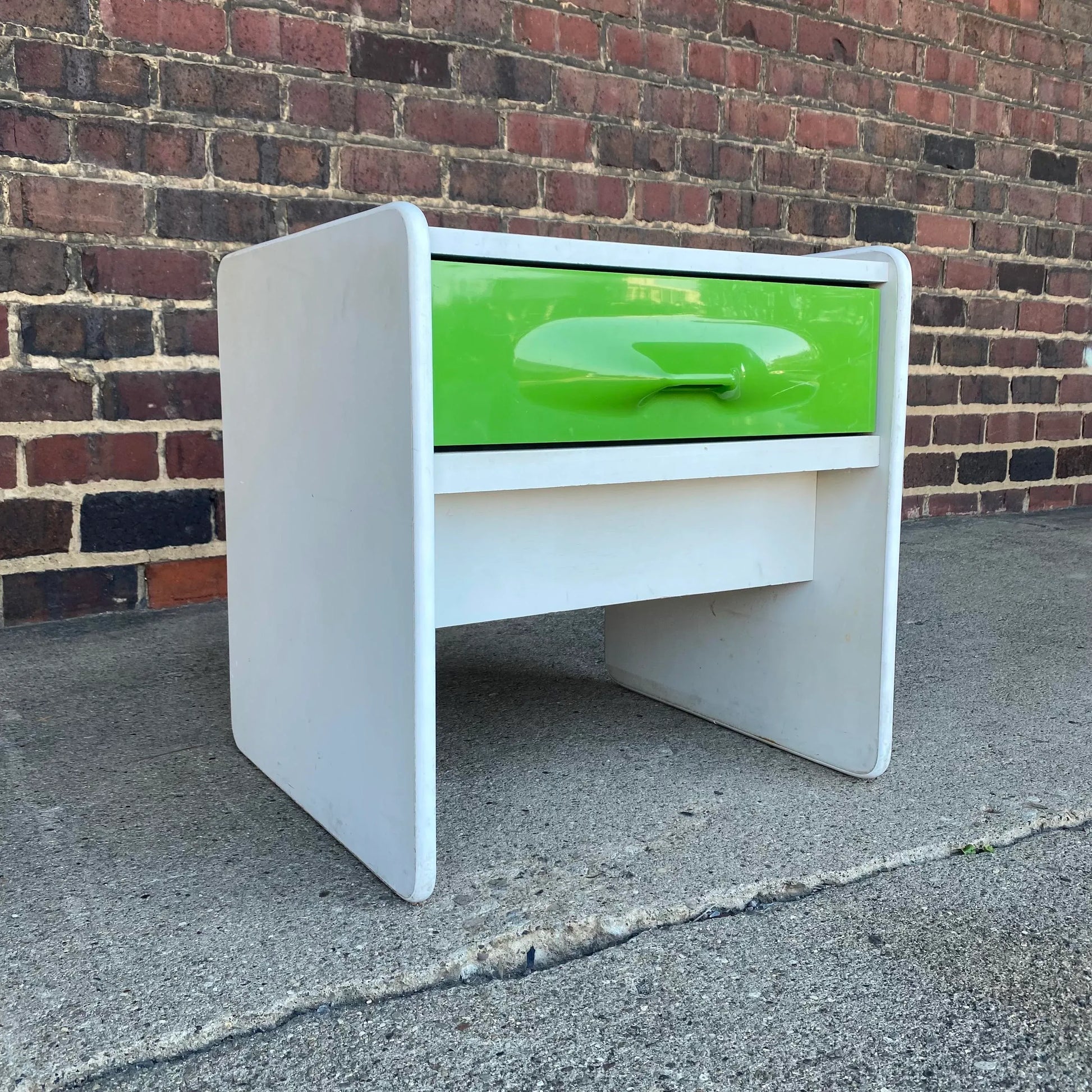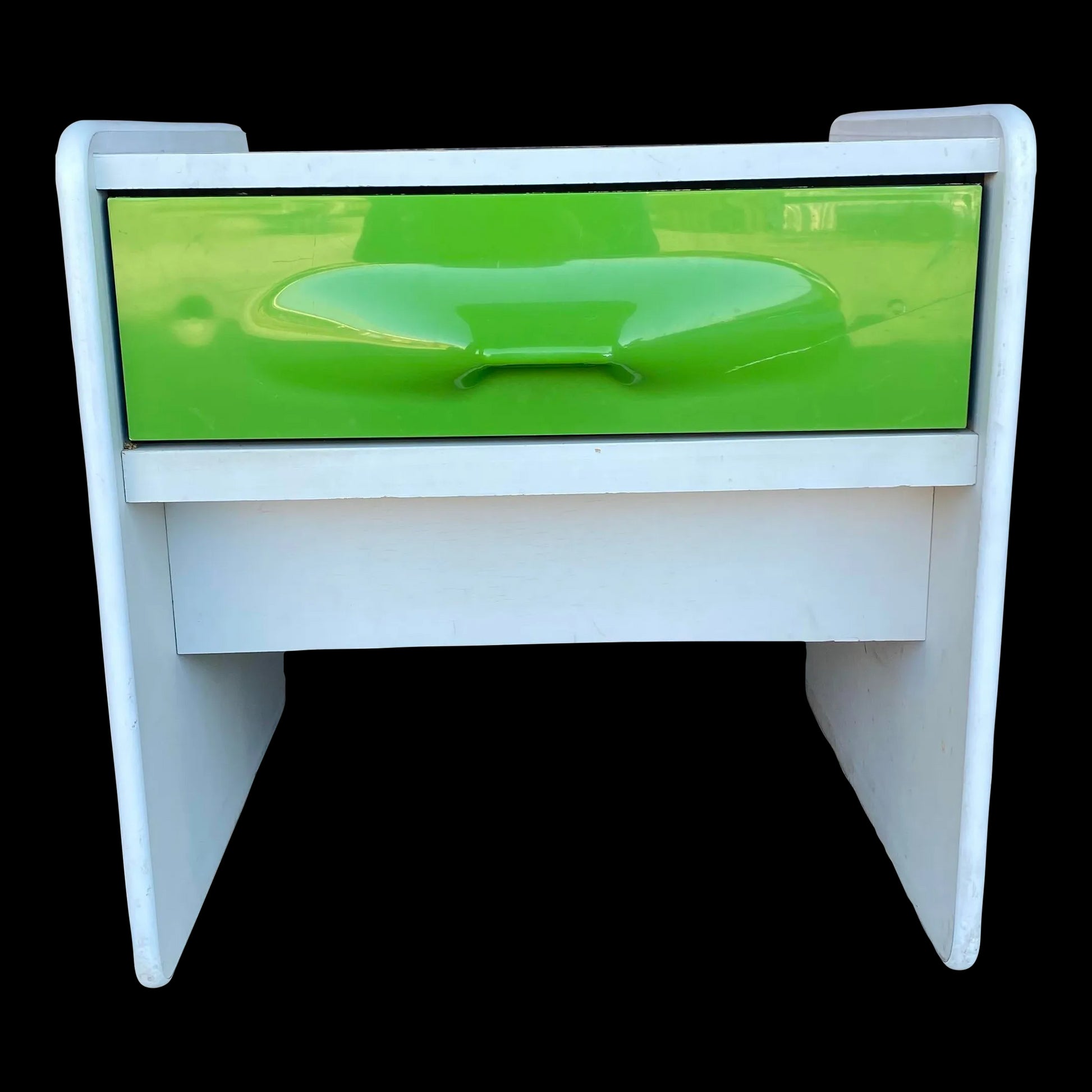 1970s space-age night stand designed by Giovanni Maur for Treco. This piece features a bright green ABS molded drawer front and curved waterfall sides.