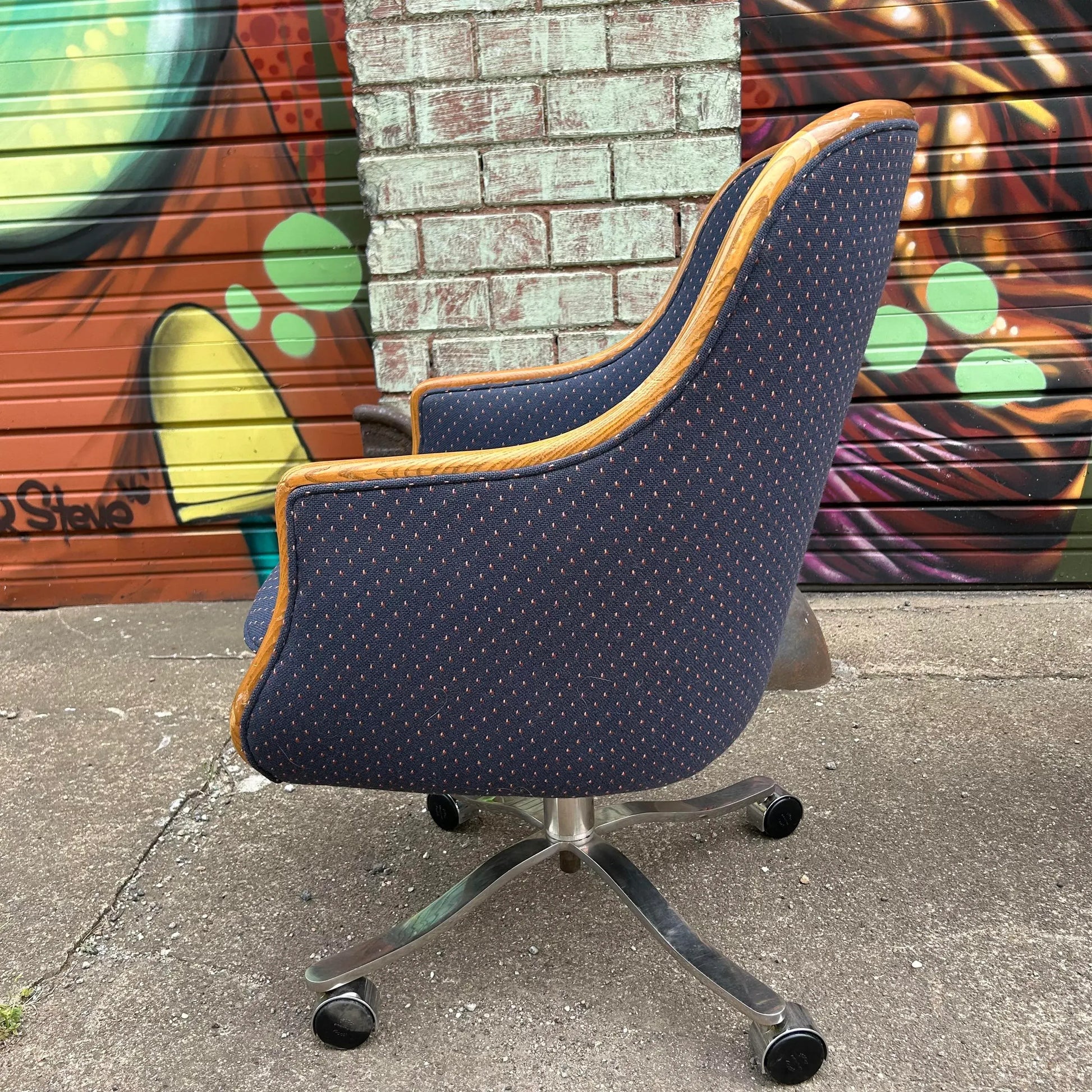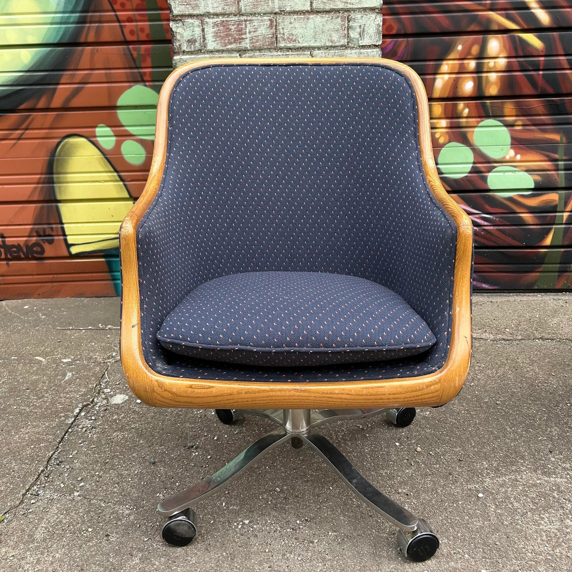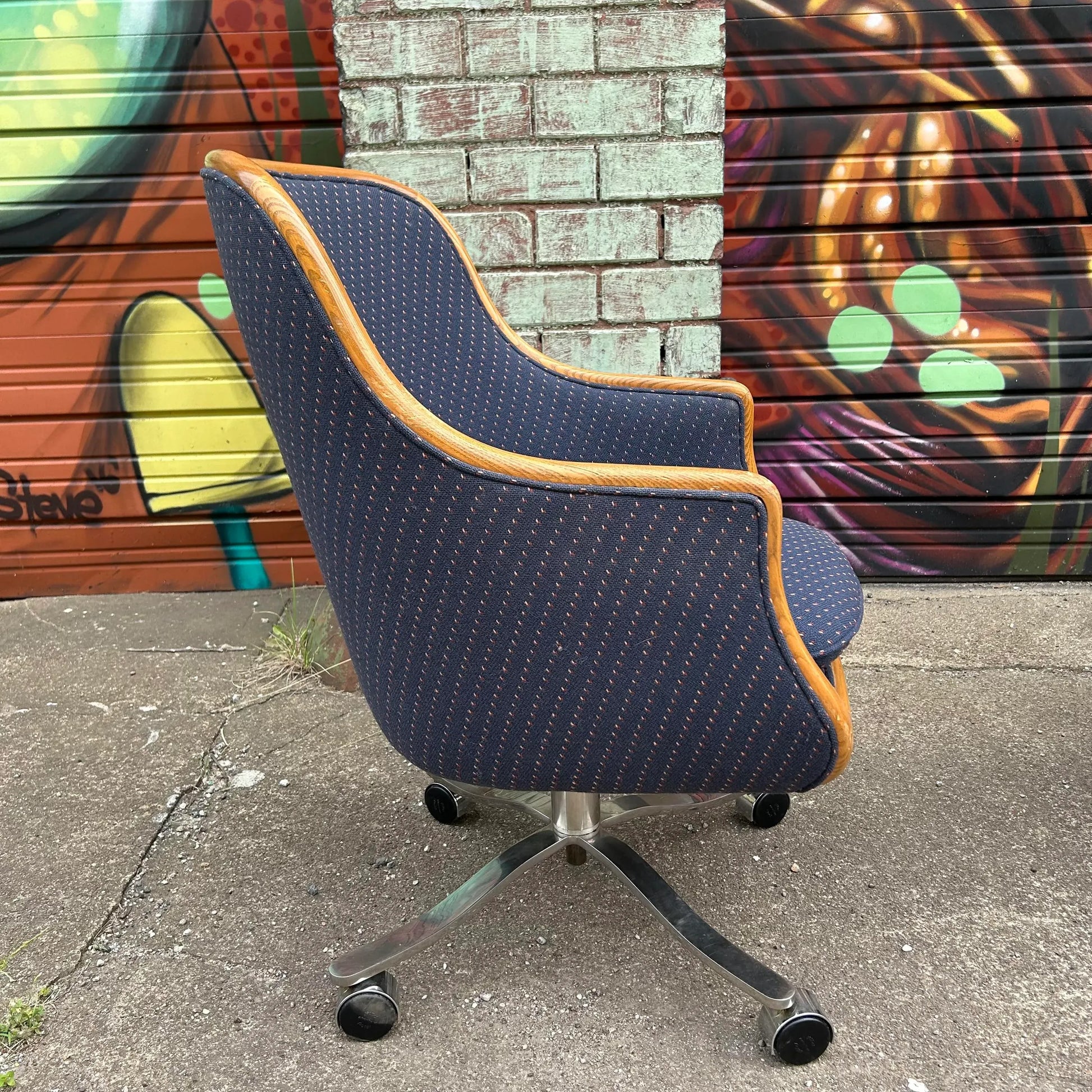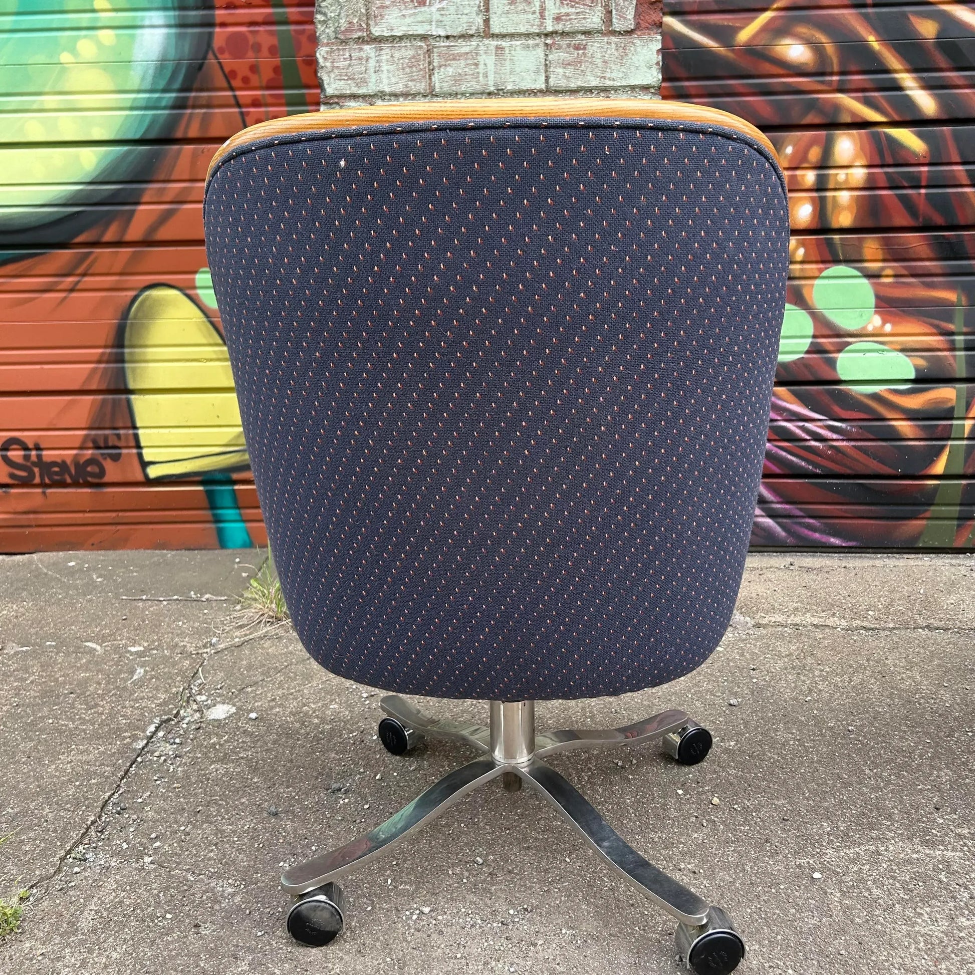Amazing wood trimmed office chair design with thick stainless propeller base on castors by ward Bennett for brickel Associates