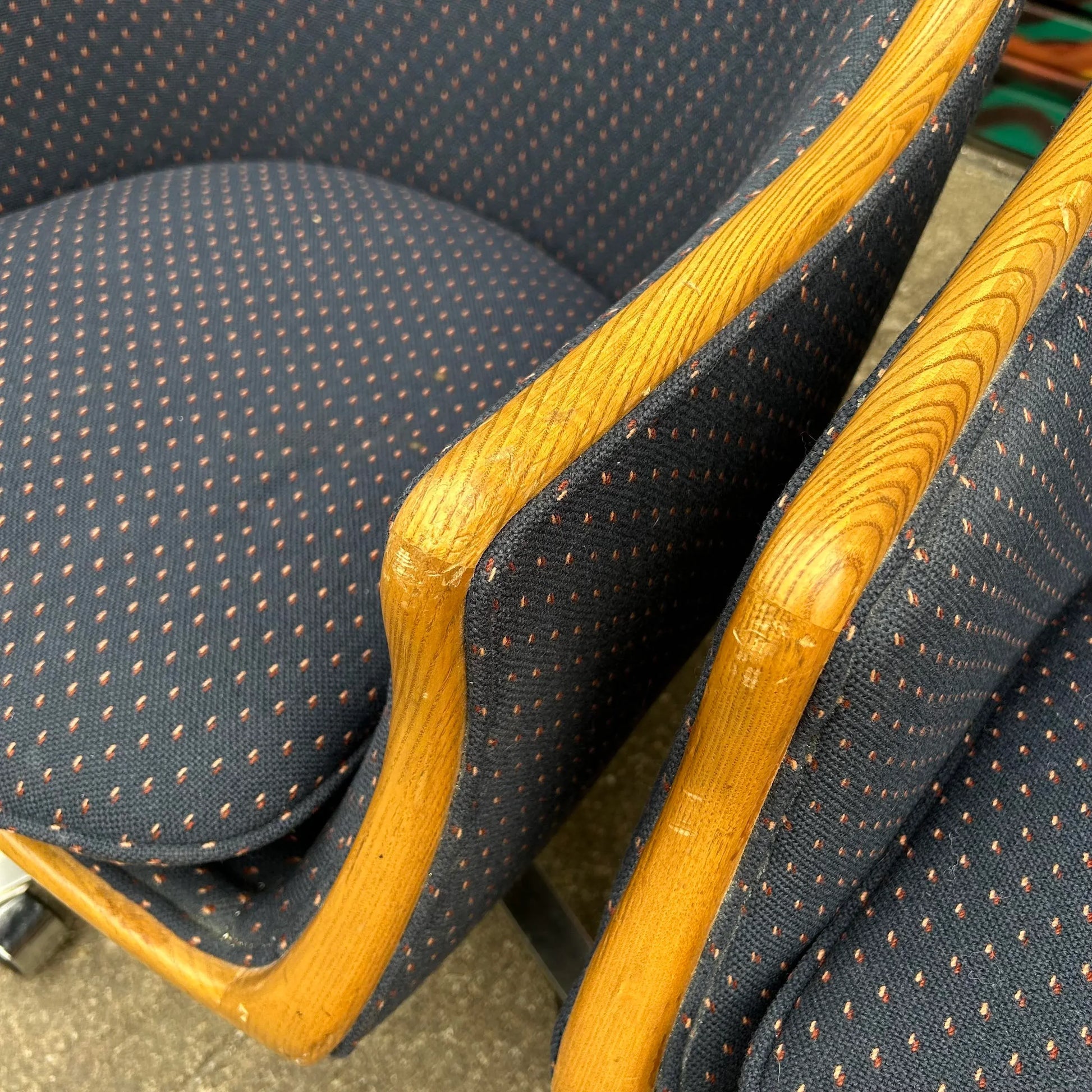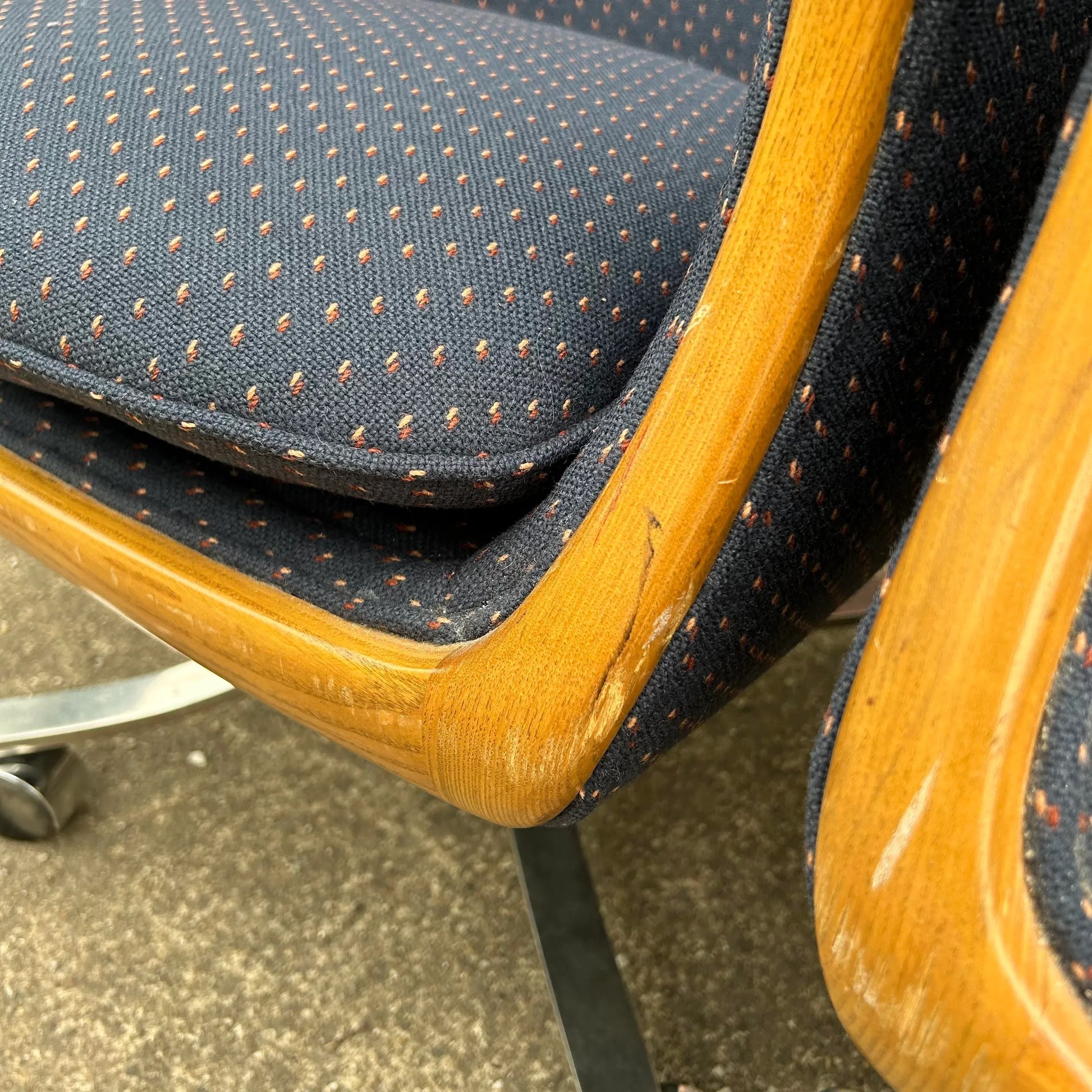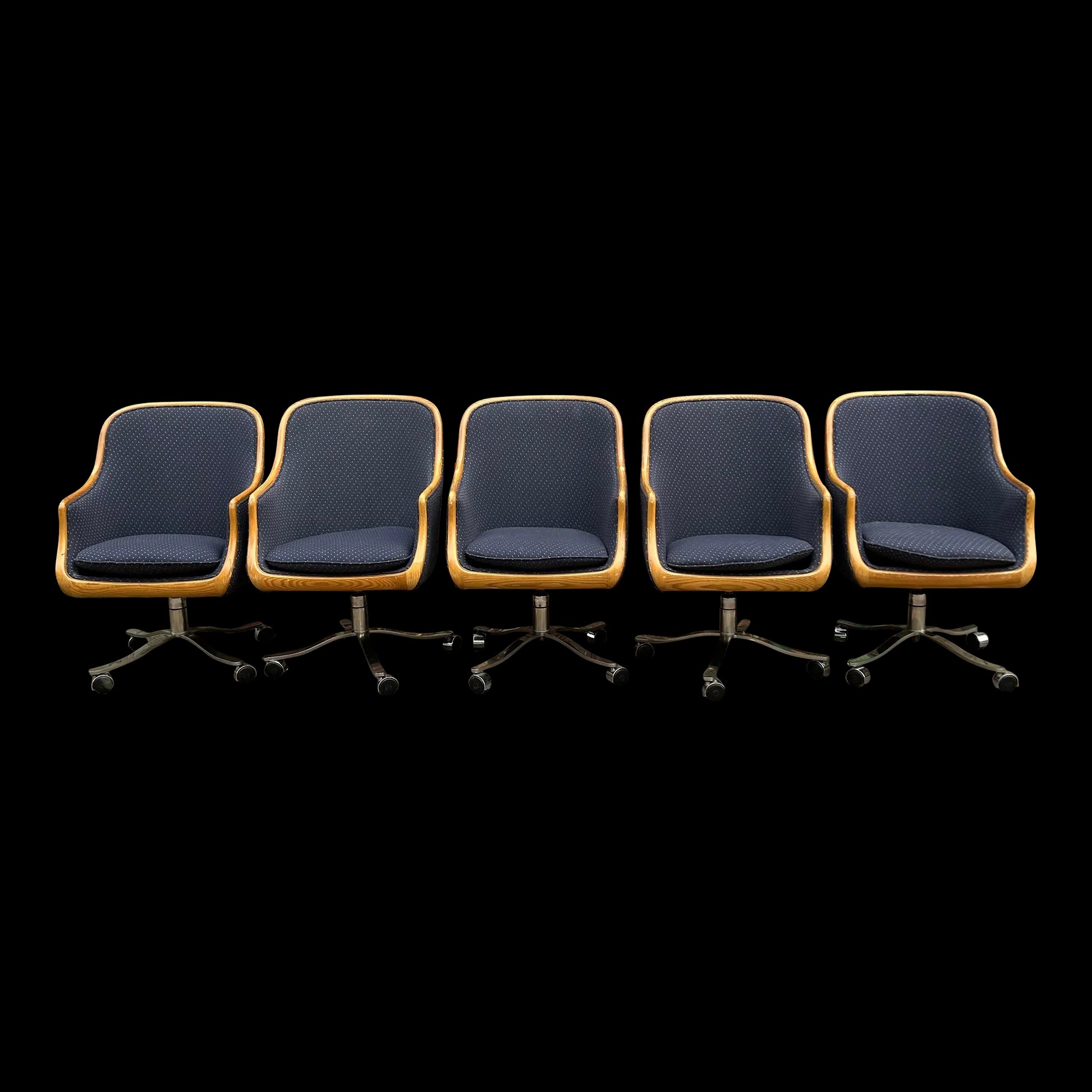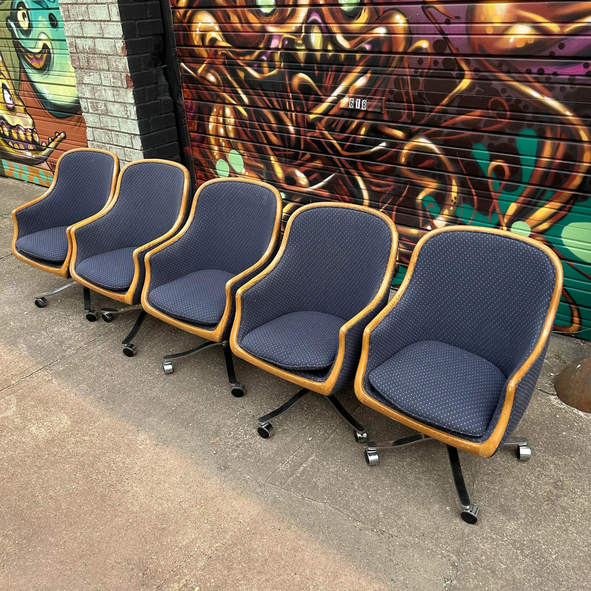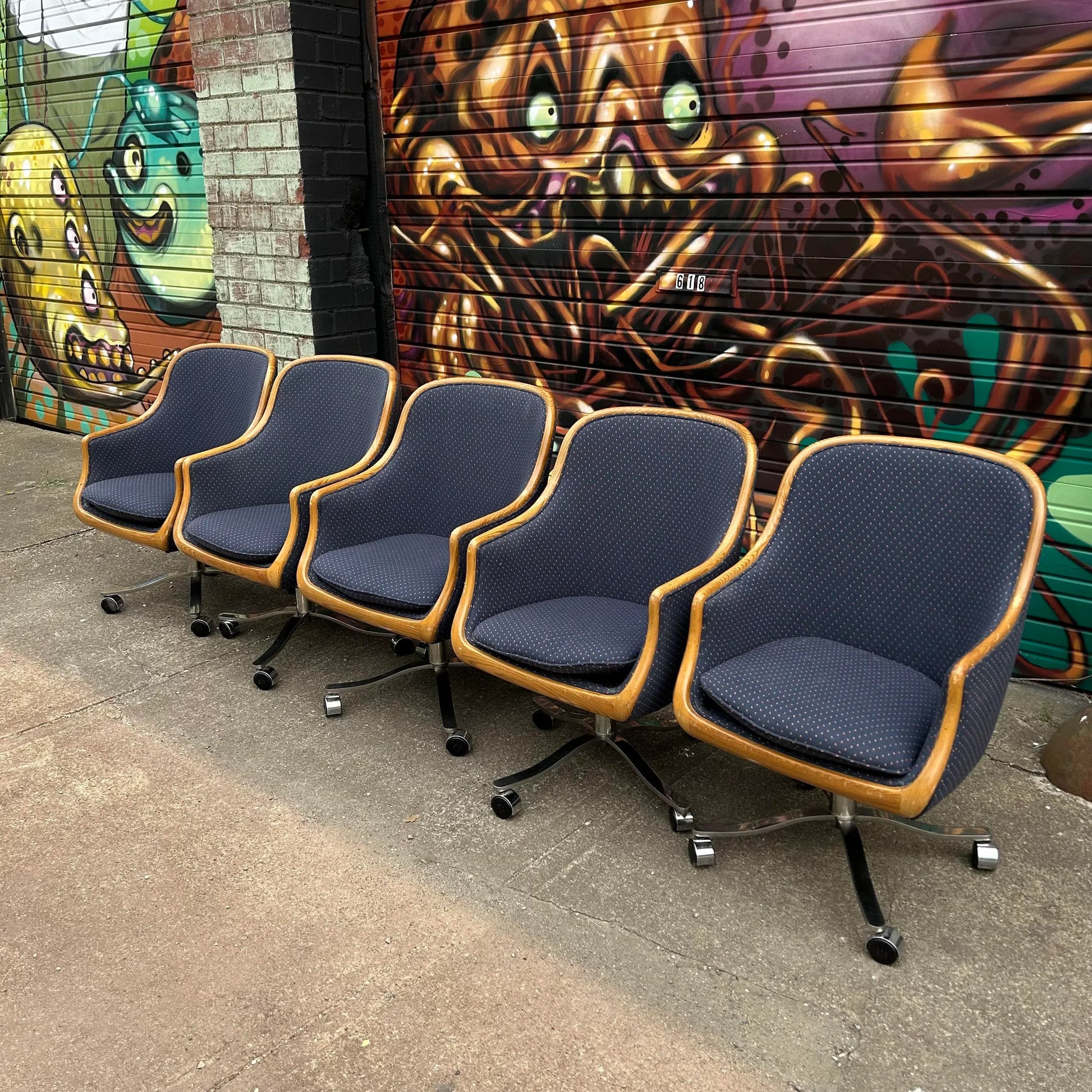 Amazing wood trimmed office chair design with thick stainless propeller base on castors by ward Bennett for brickel Associates