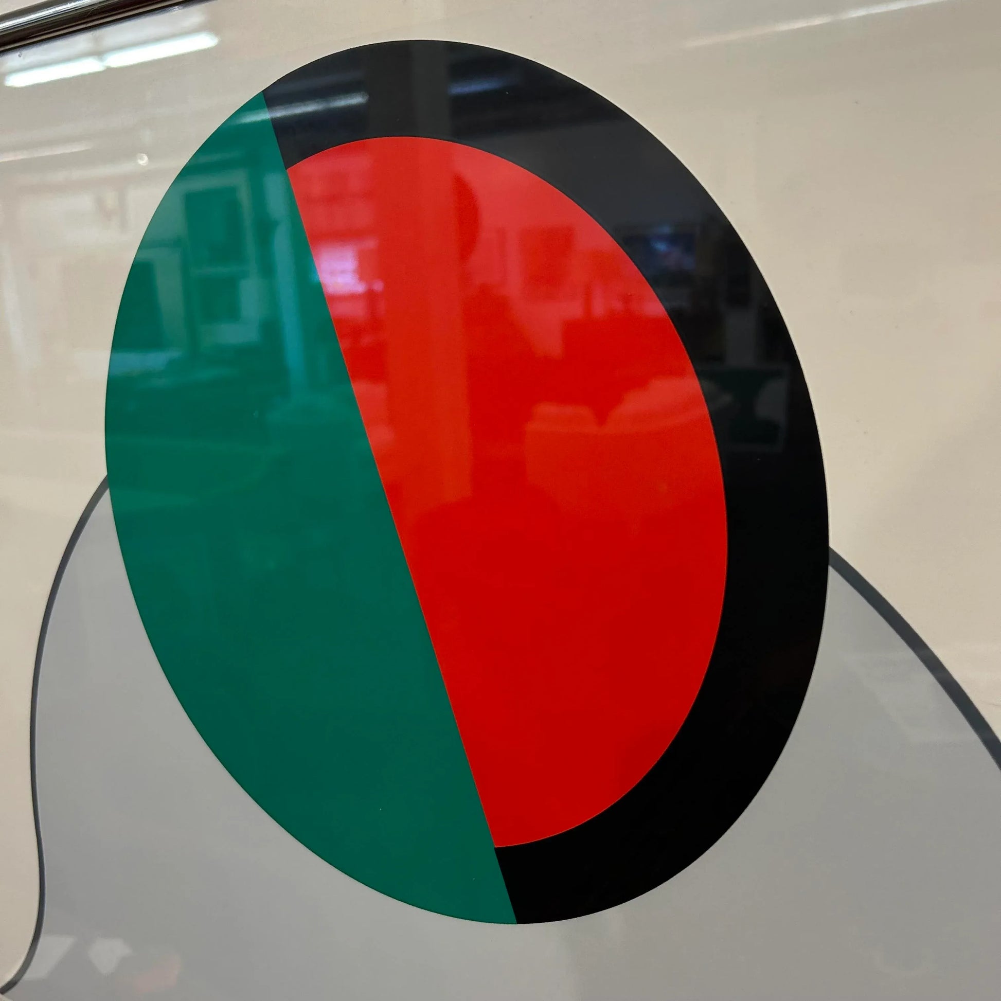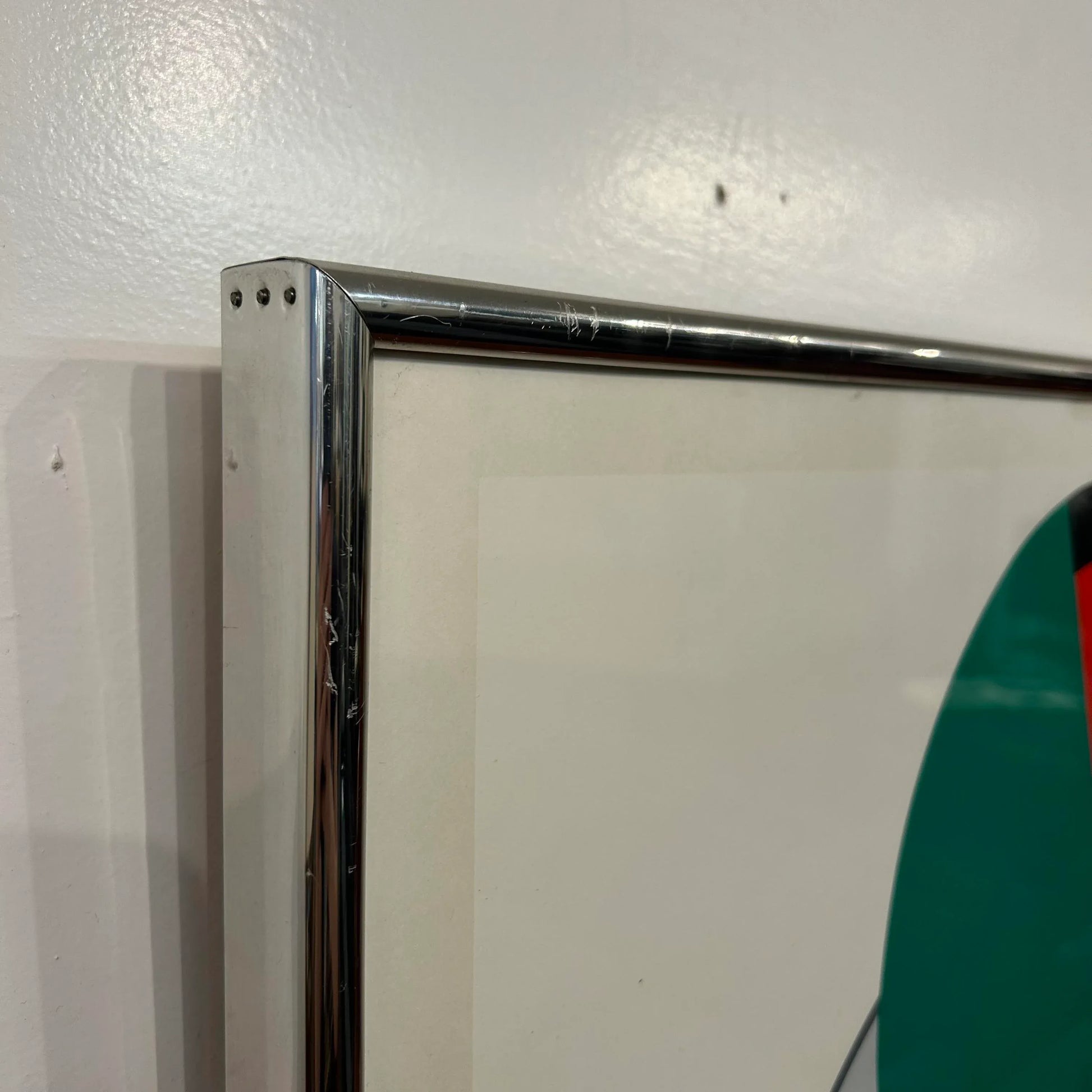 This framed Takesada Matsuani serigraph is bold, minimalistic, and colorful. It features colors of red, green, gray, black and white. It is signed, dated, and numbered 70/75.
