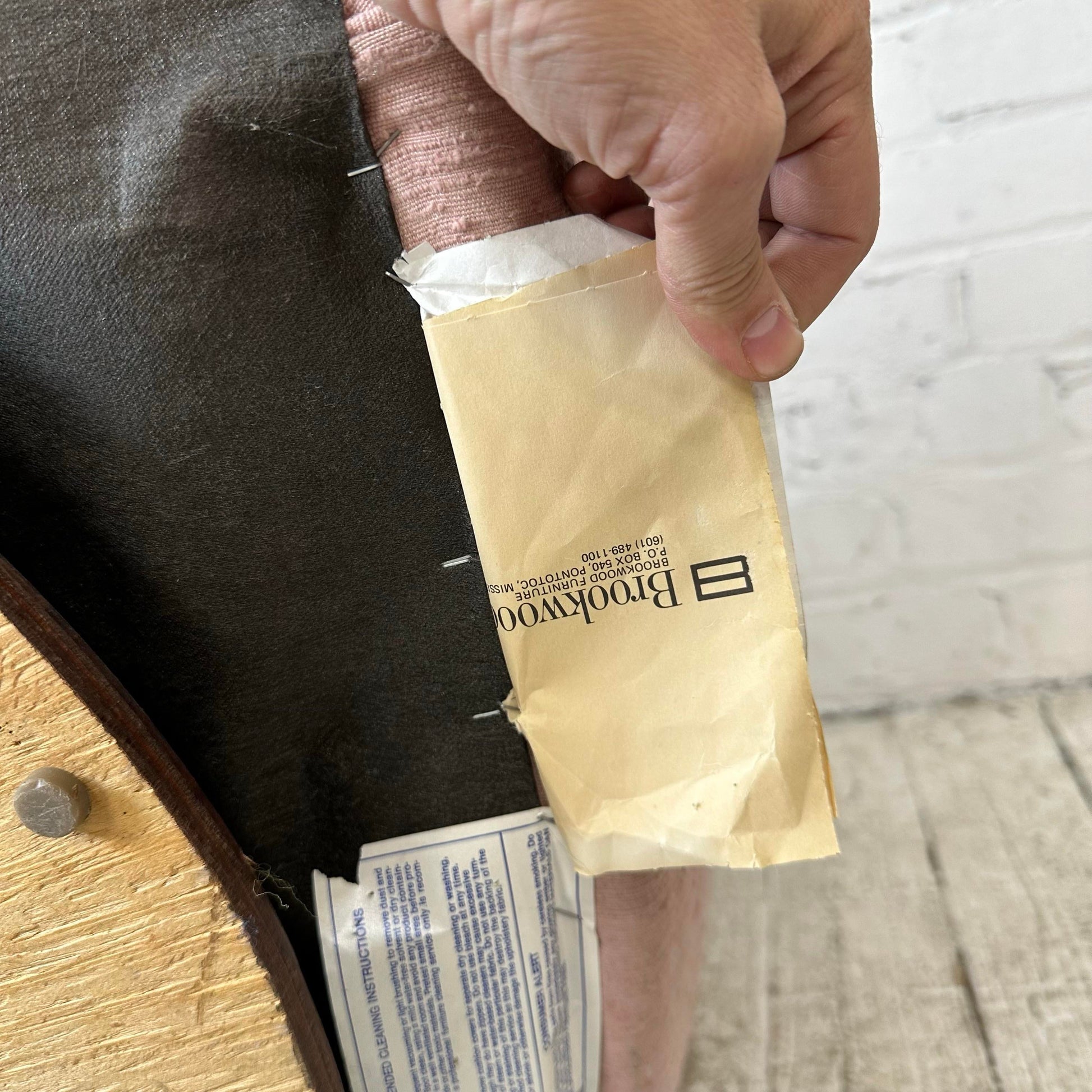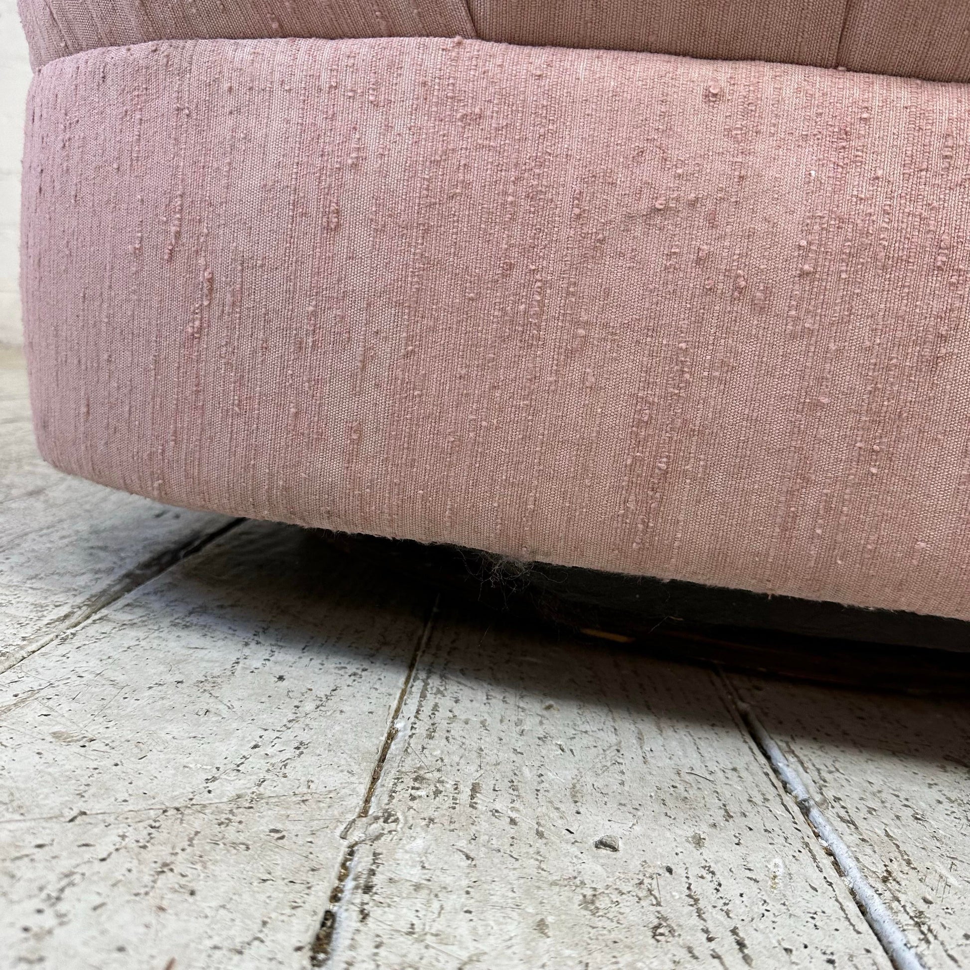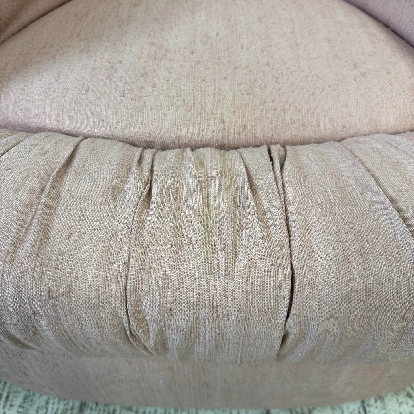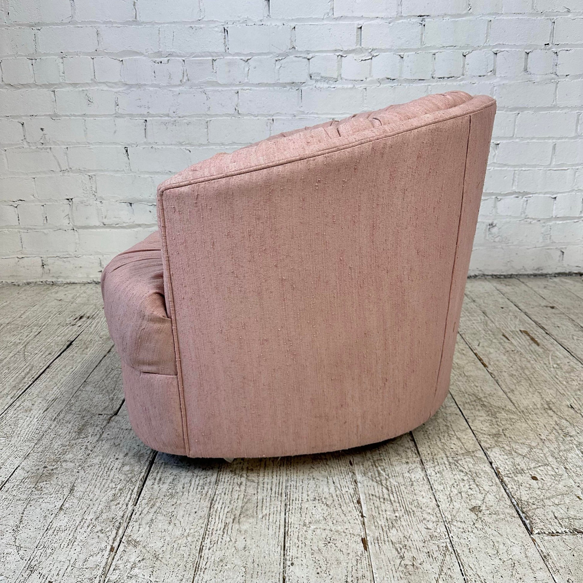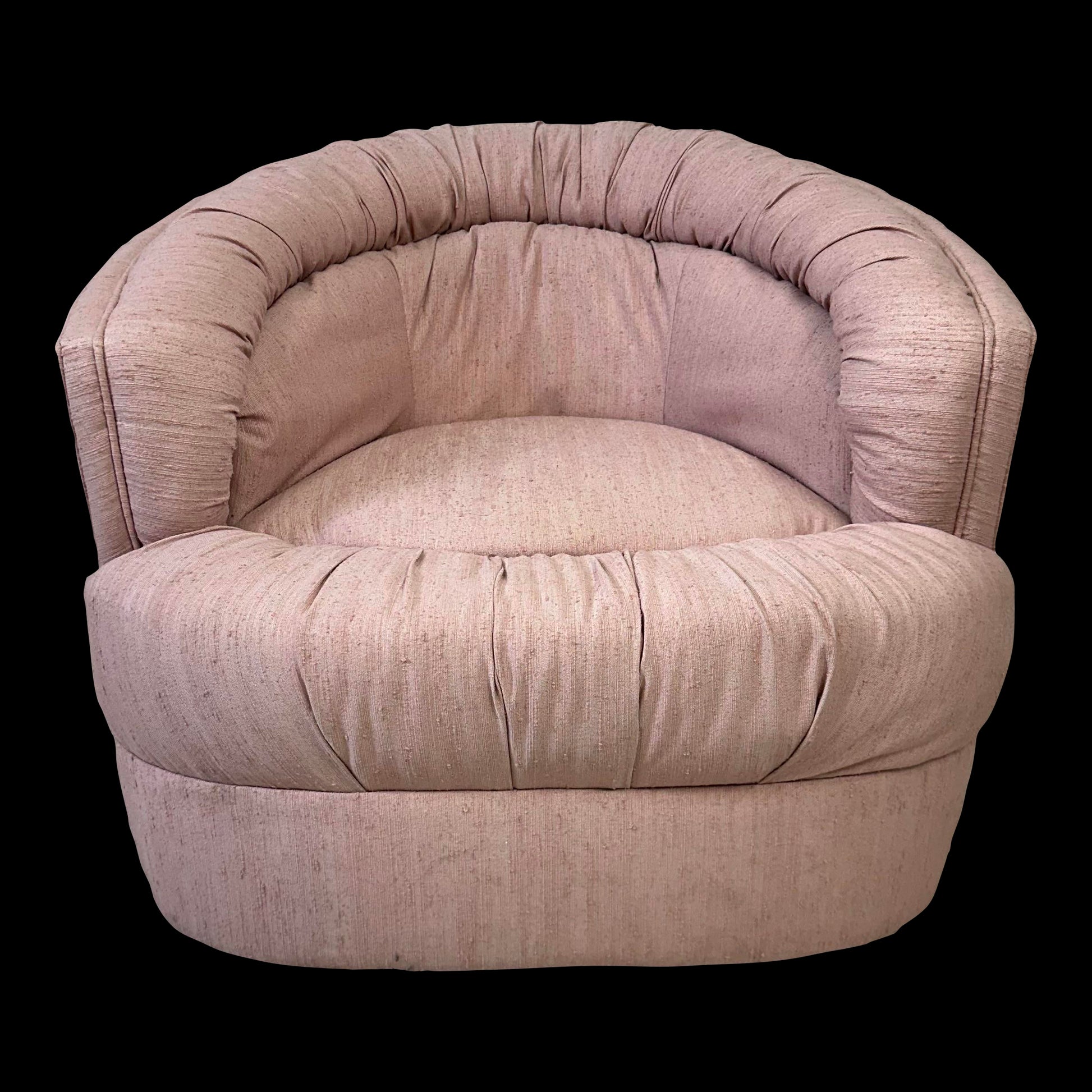 This chair features a barrel shaped back with a 1980s style plush pink ruched upholstery detailing. This chair has a 360 degree swivel.