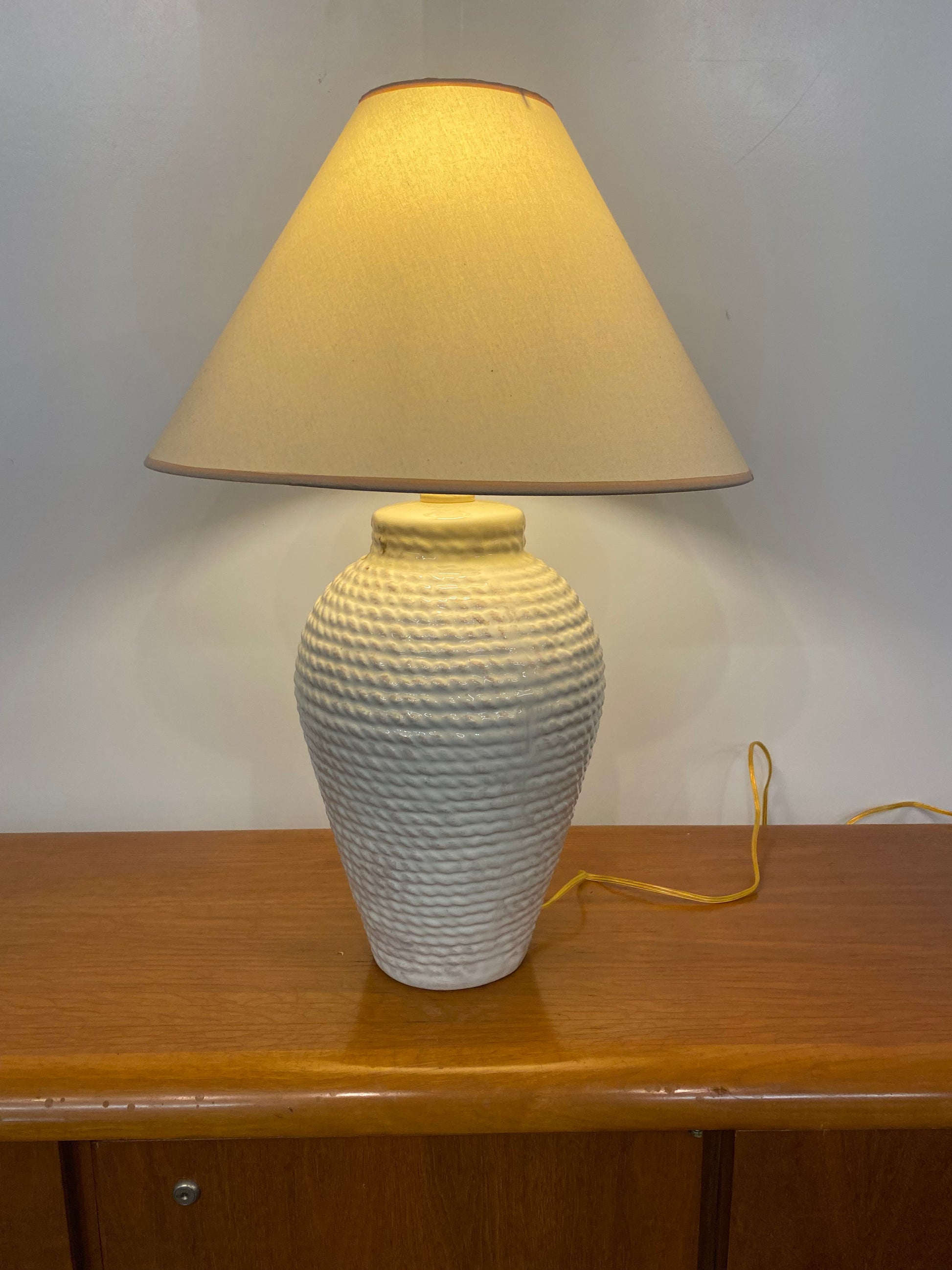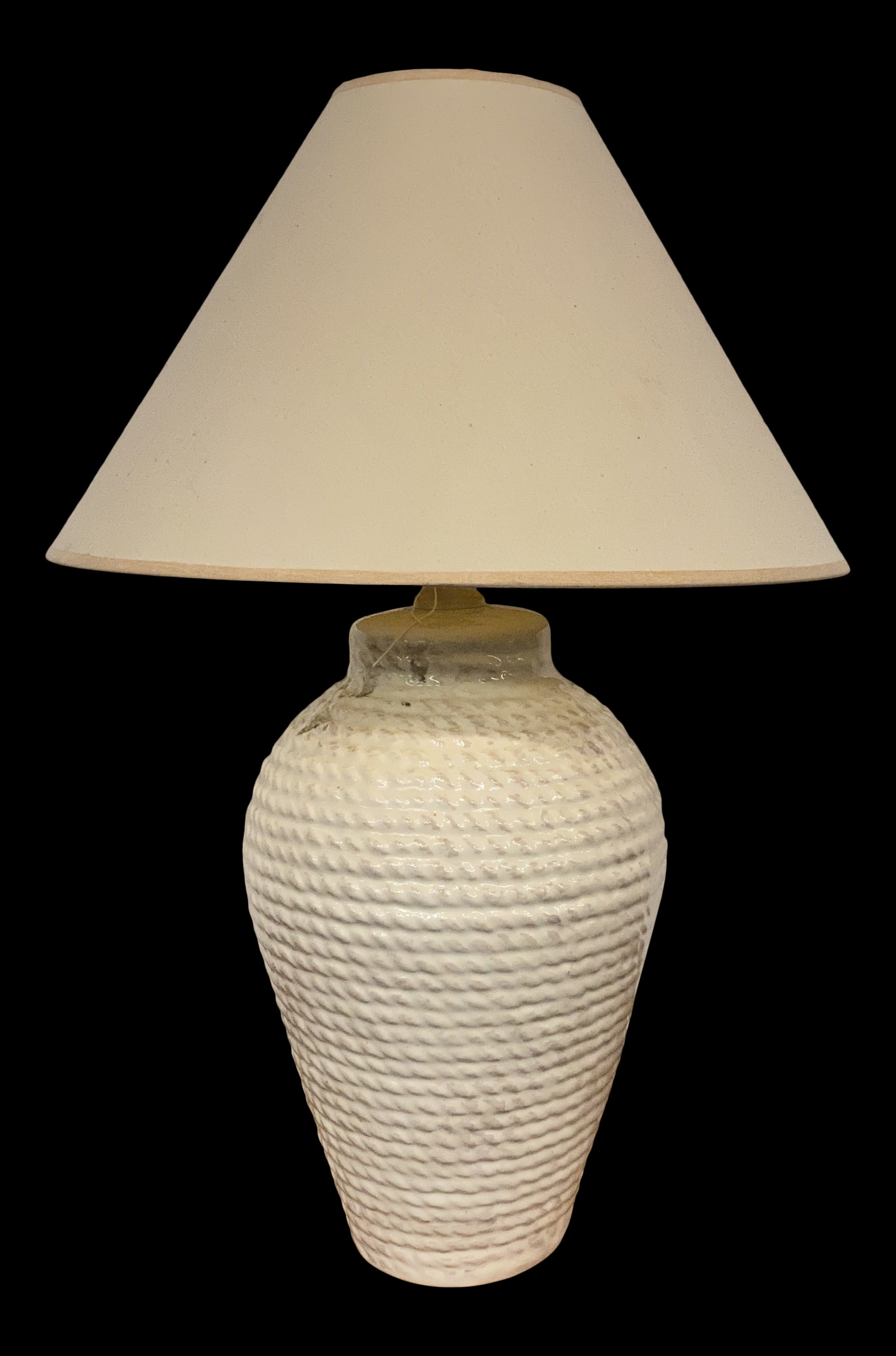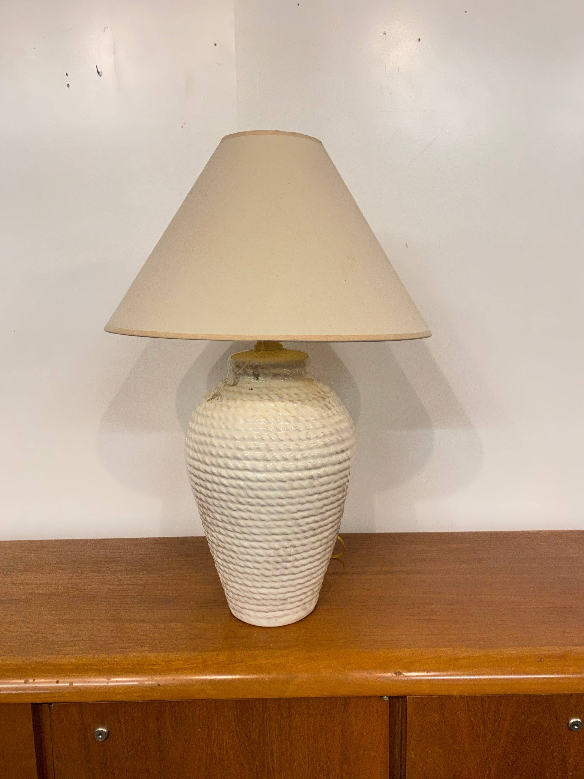 1980s white faux rope ceramic table lamp with shade.