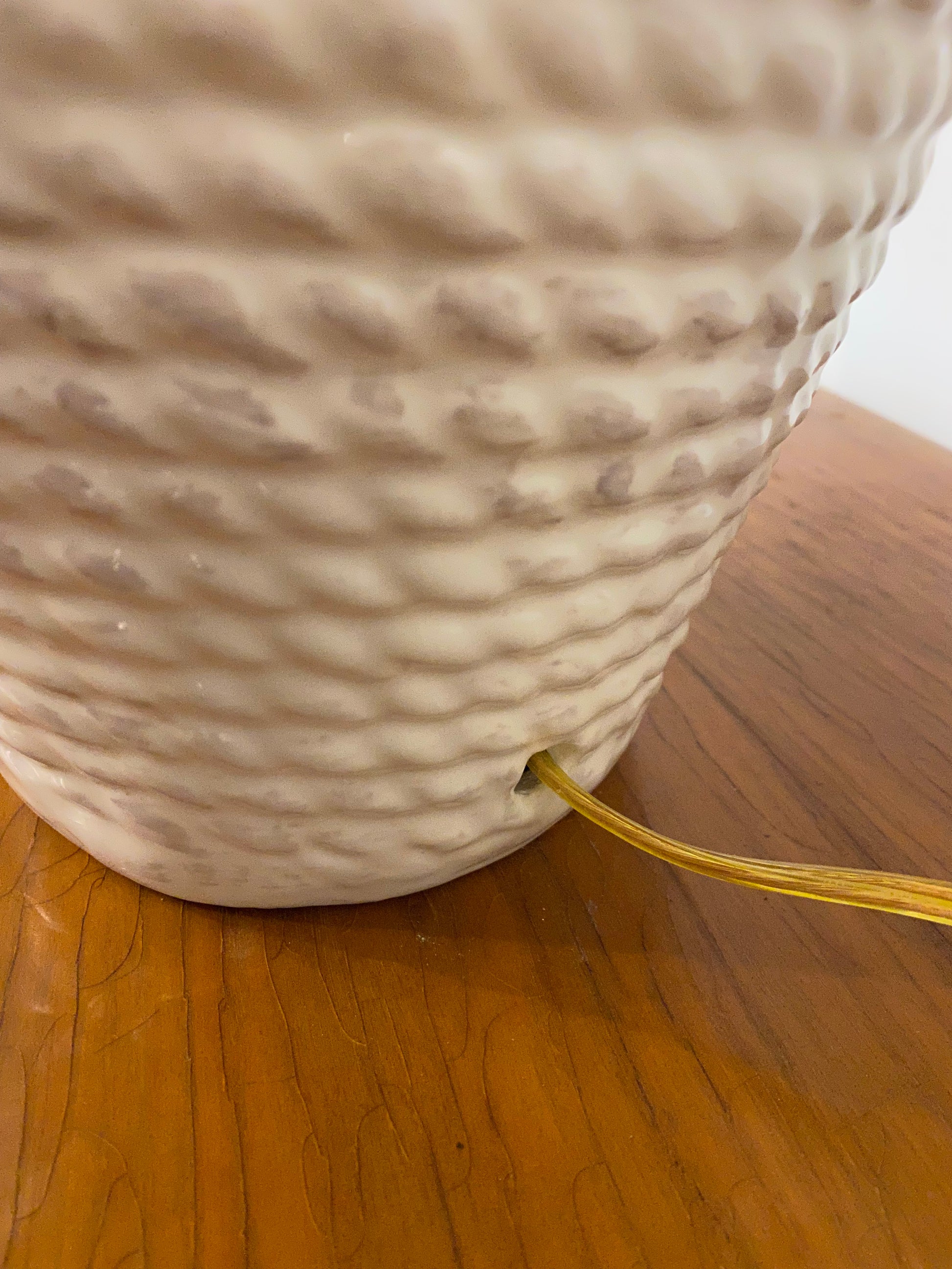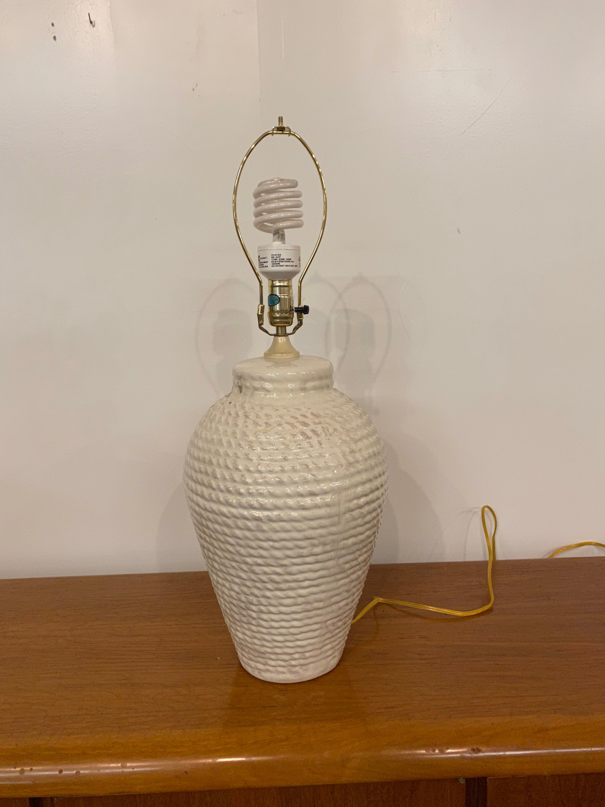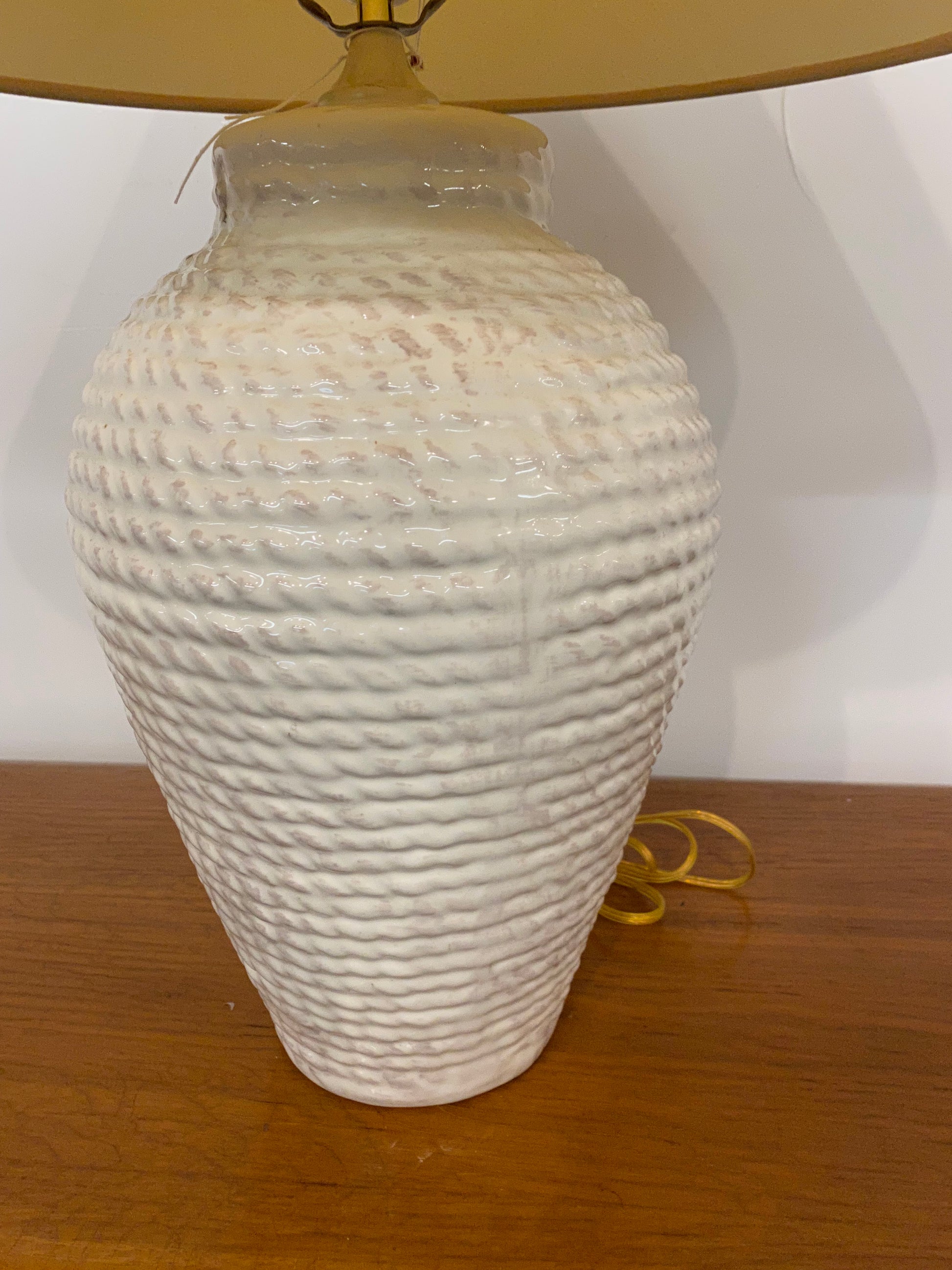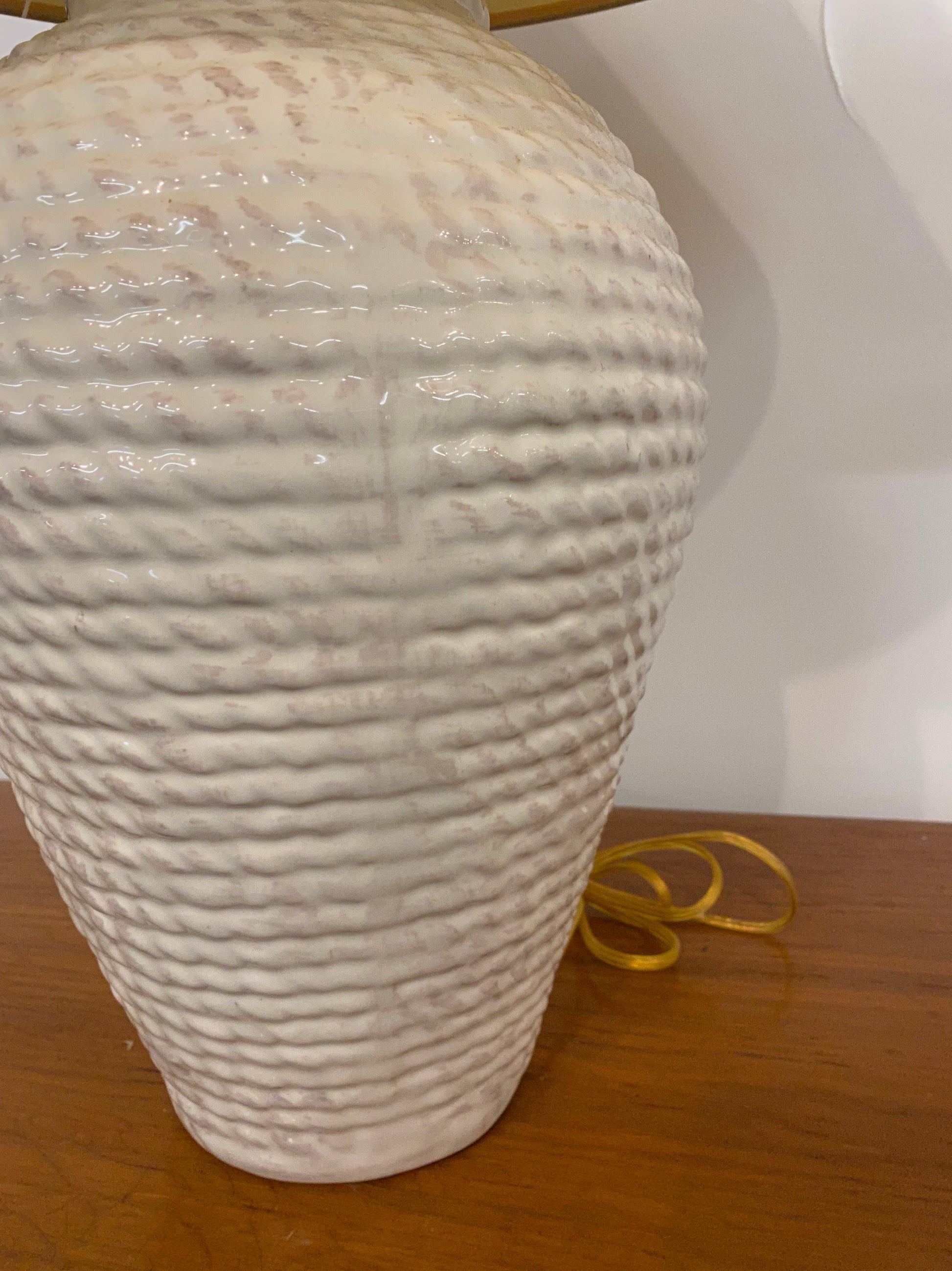 1980s white faux rope ceramic table lamp with shade.