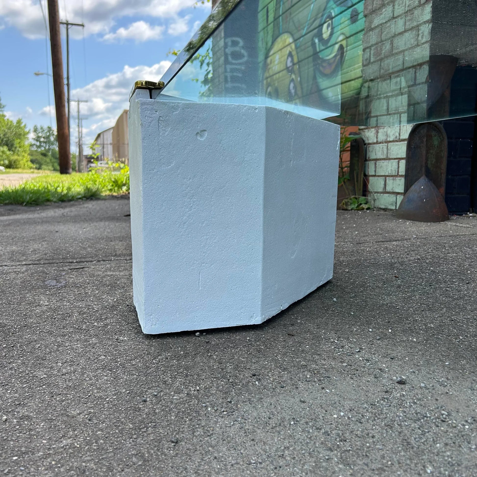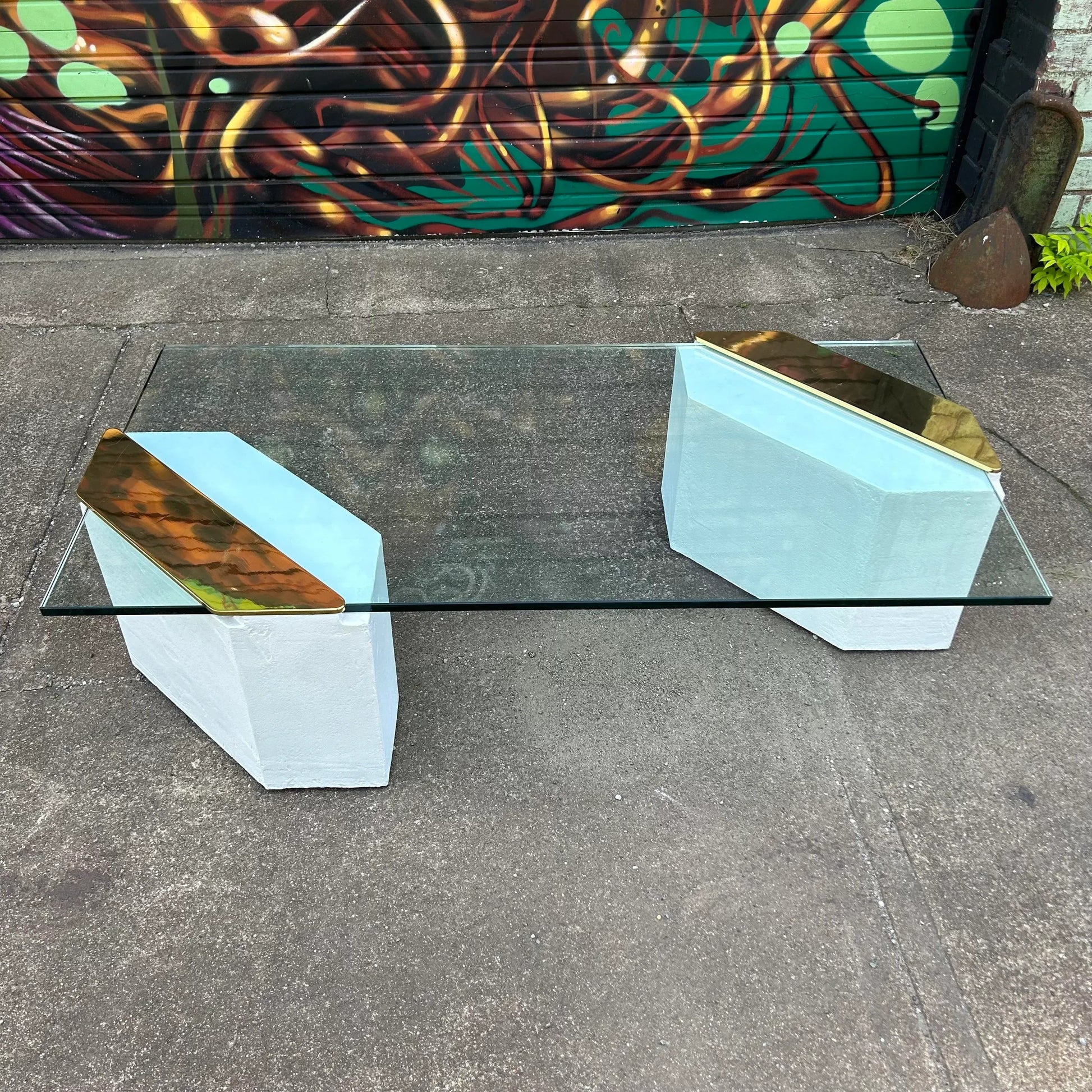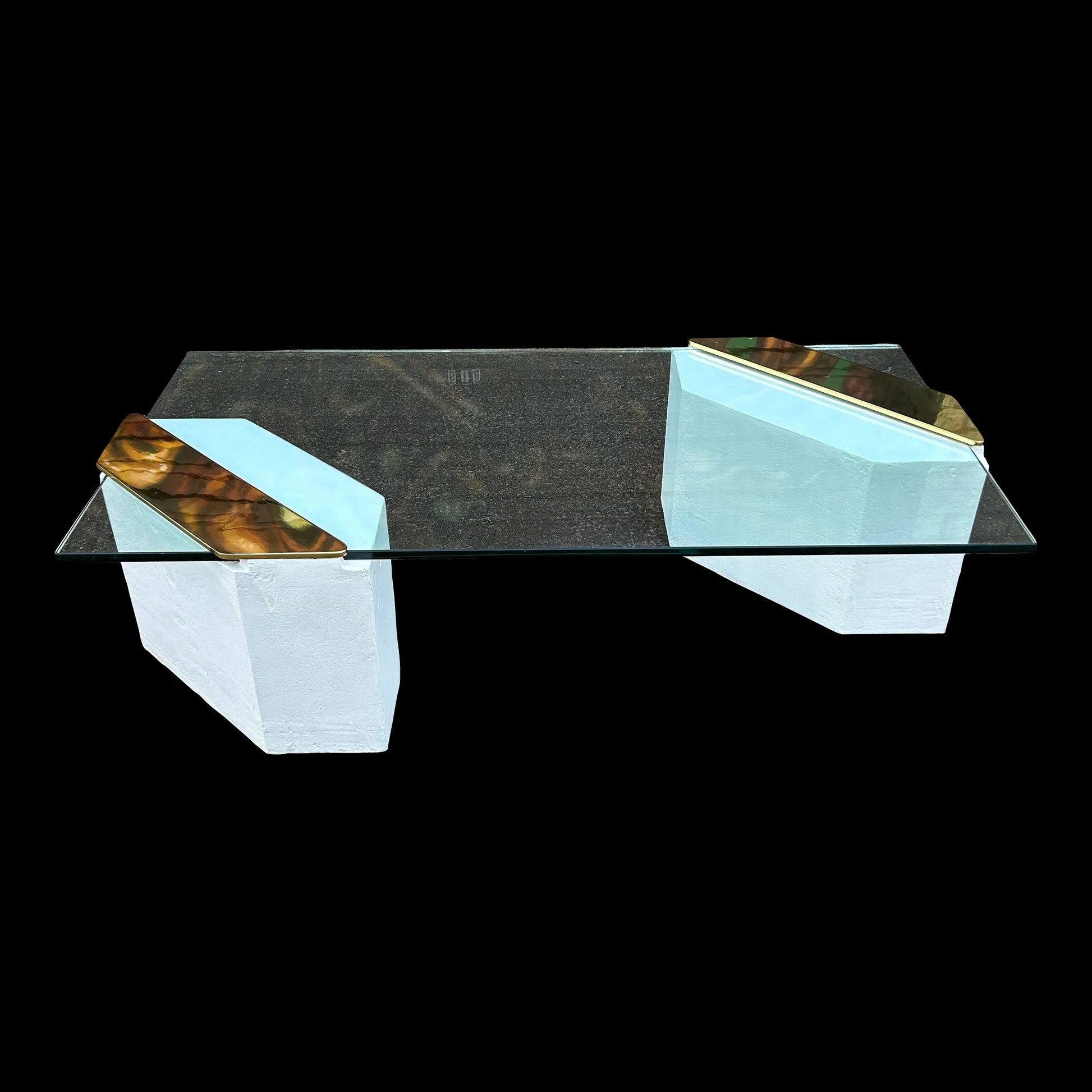 1980s postmodern coffee table constructed out of plaster and glass, with brass accents.
