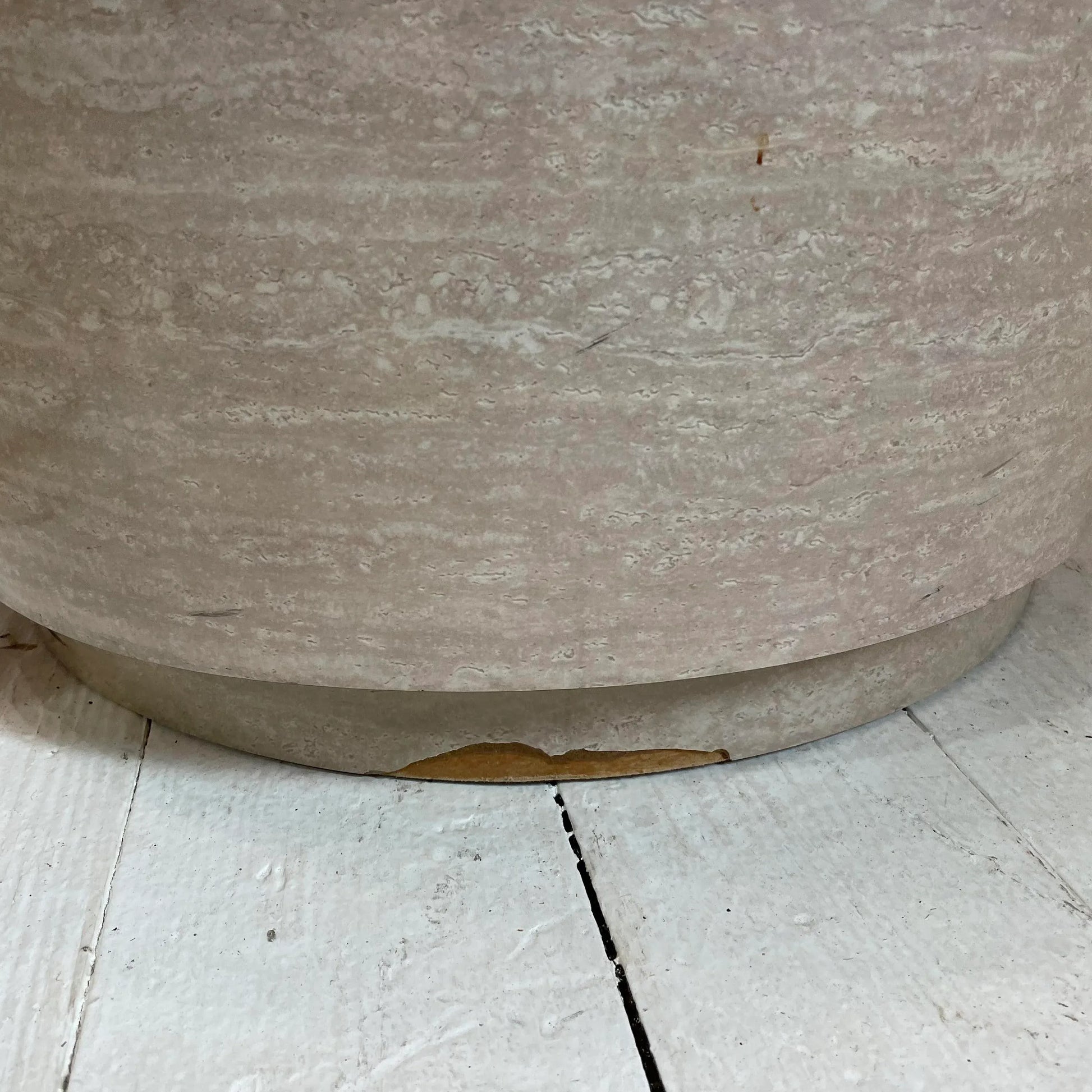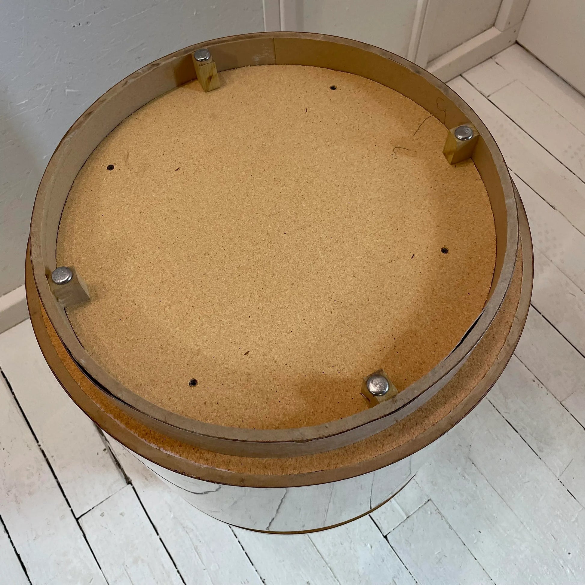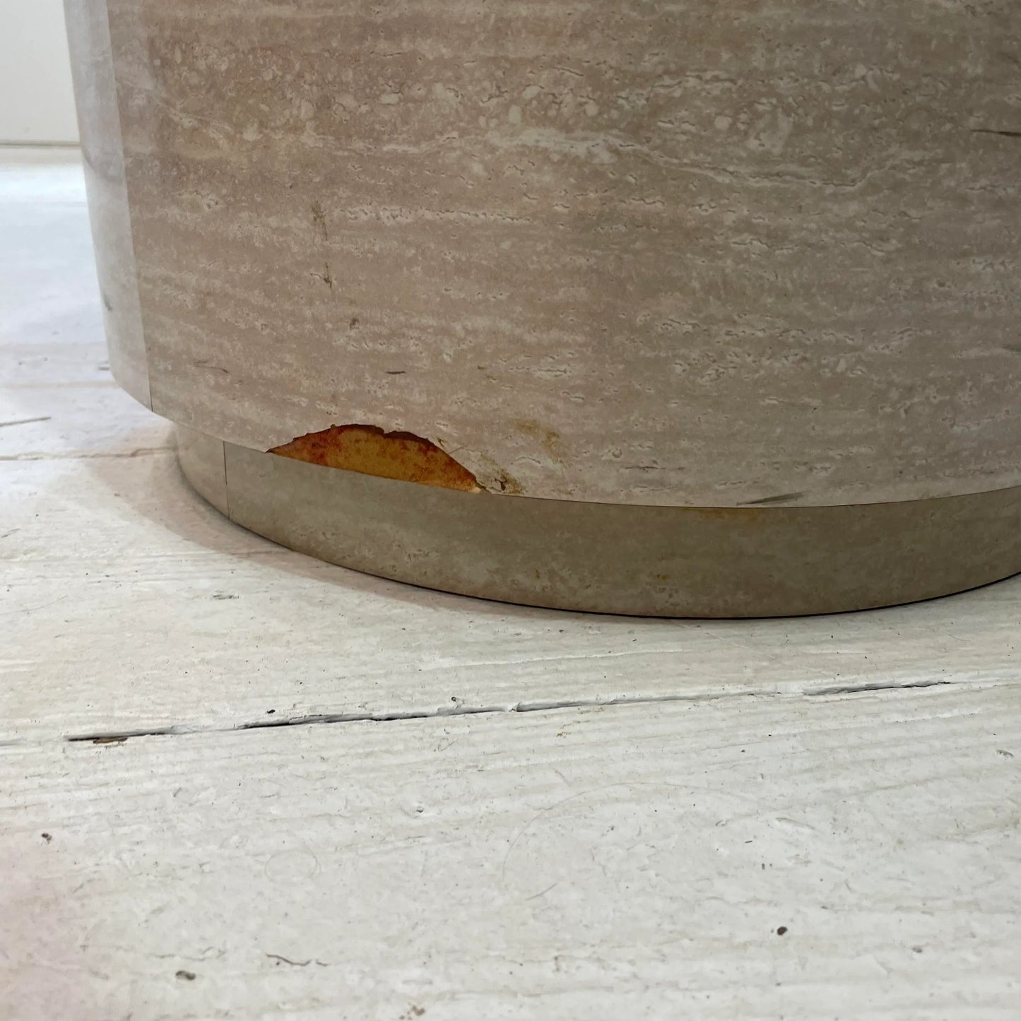 Pair of awesome 80’s travertine laminate with chrome trim Drum side tables.