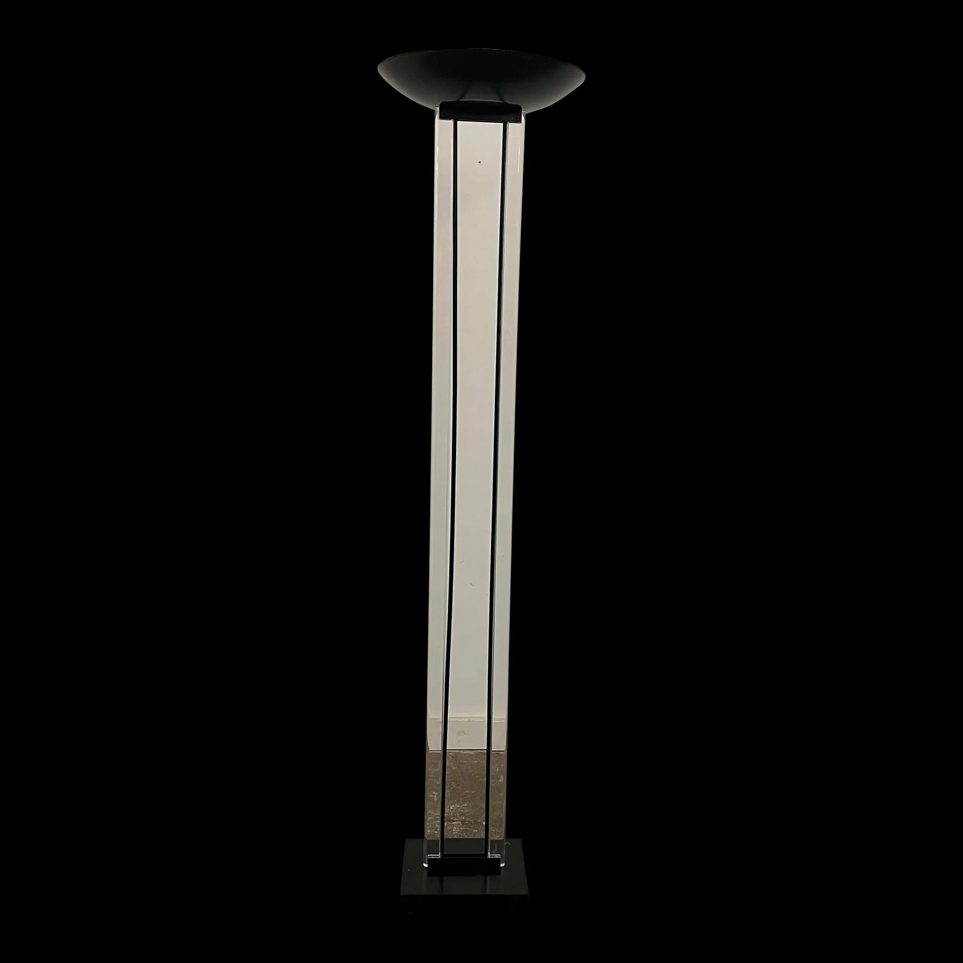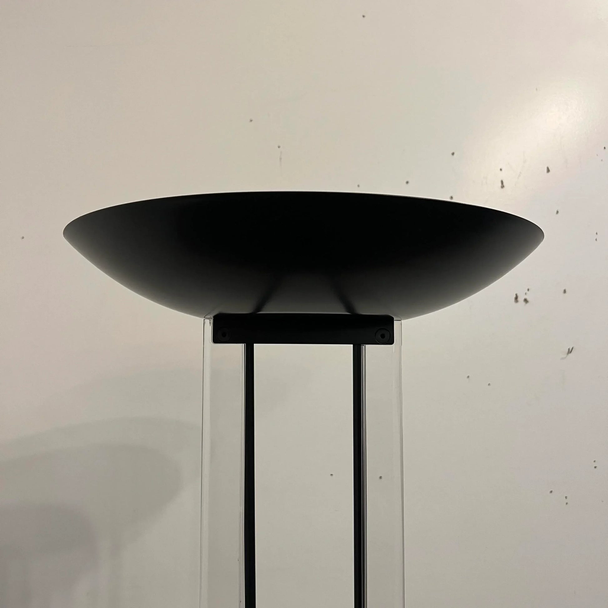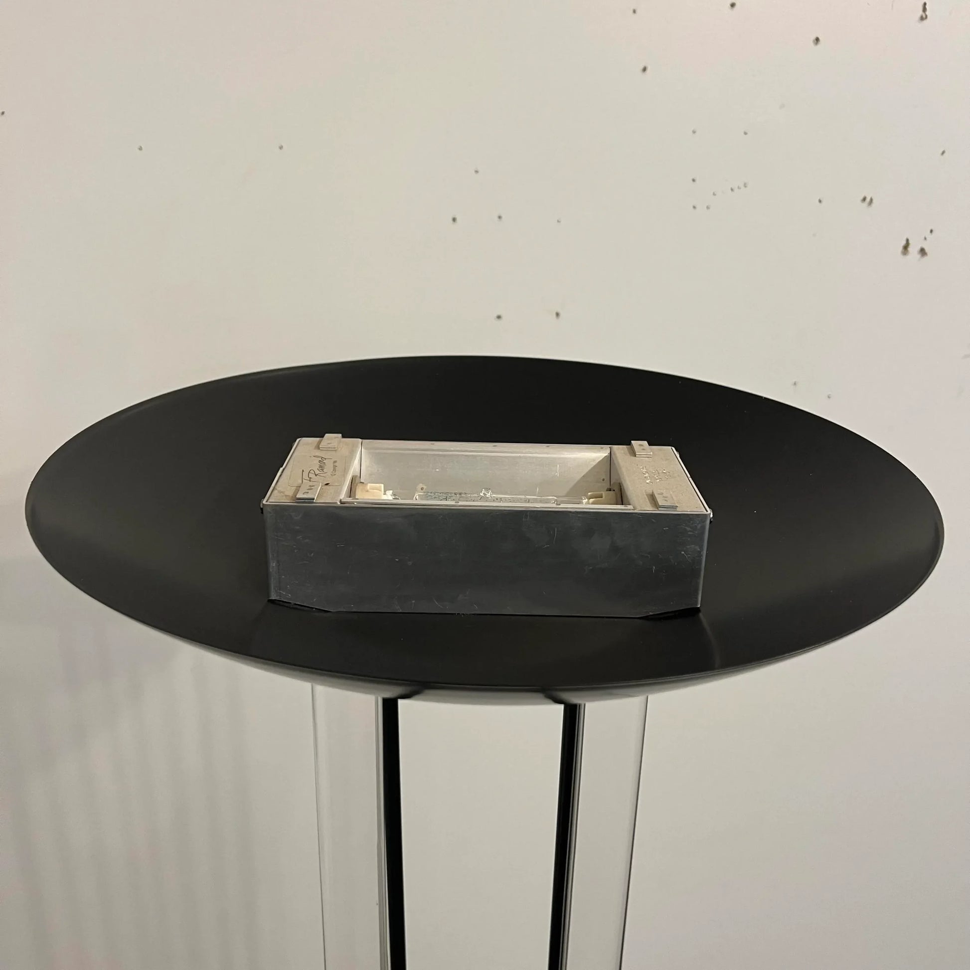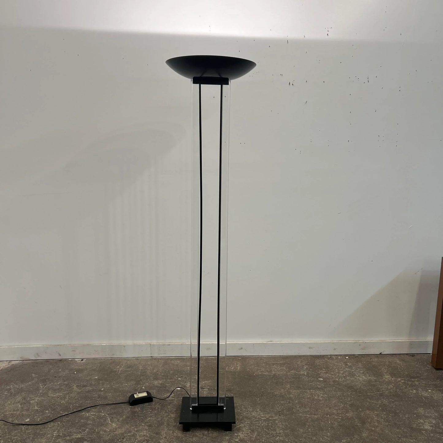 Torchiere post modern floor lamp featuring a lucite body and black base. Designed by Fredrick Raymond.