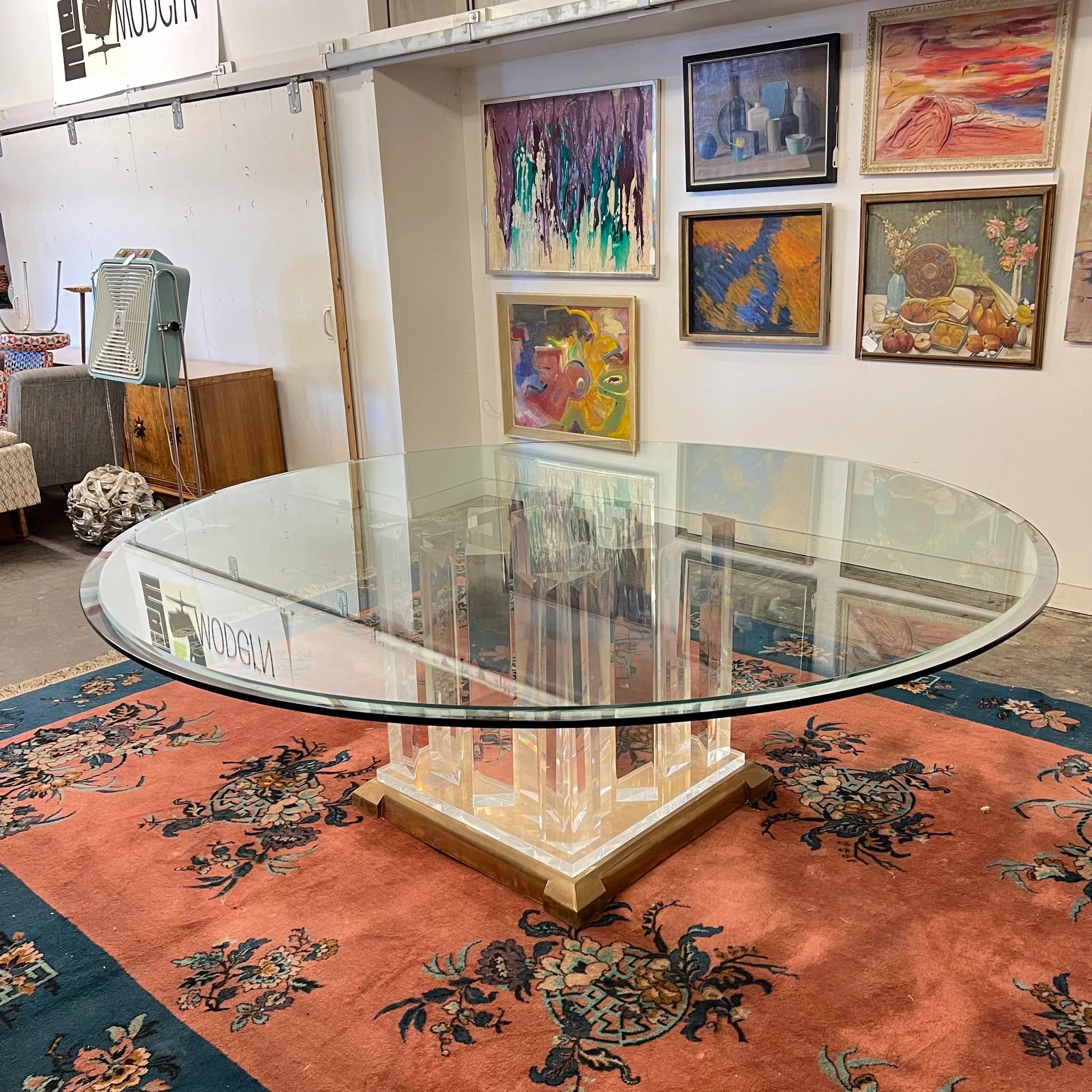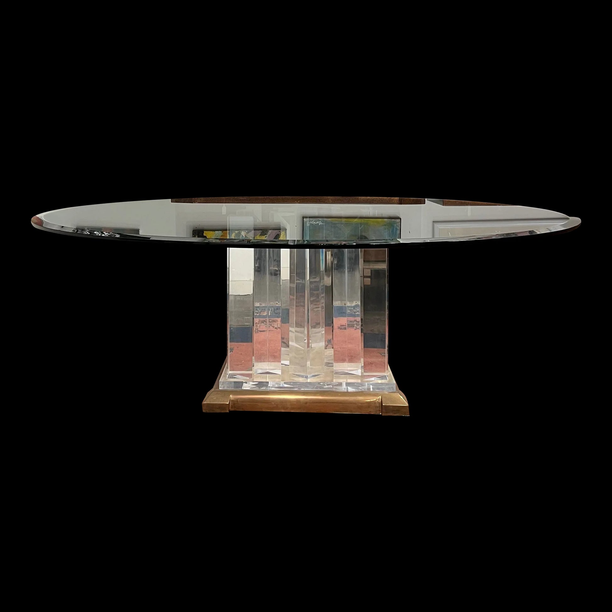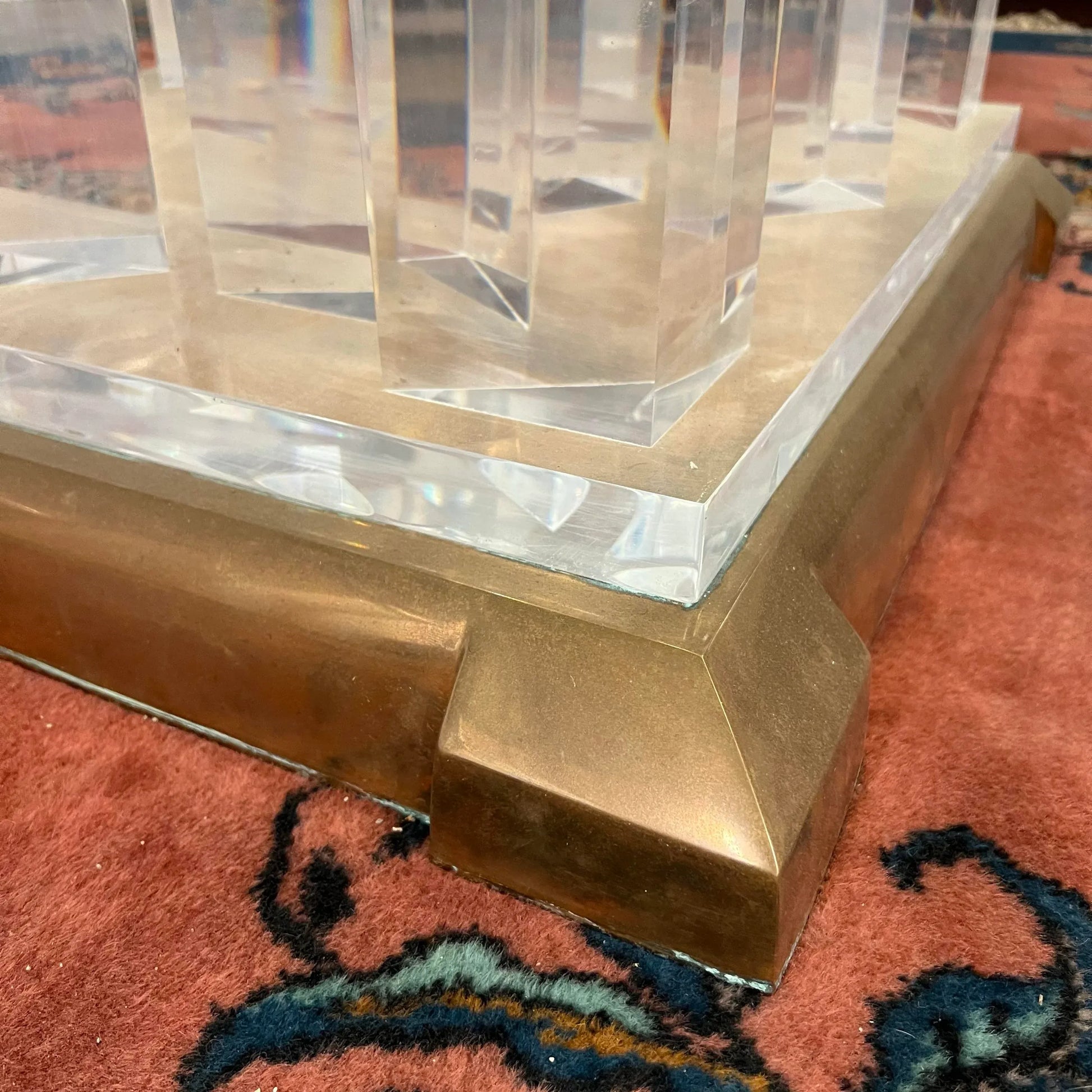 This is a table that will be impressive in any room which 8’ round 3/4 inch thick tapered glass top on top of a lucite pedestal and solid copper/brass base