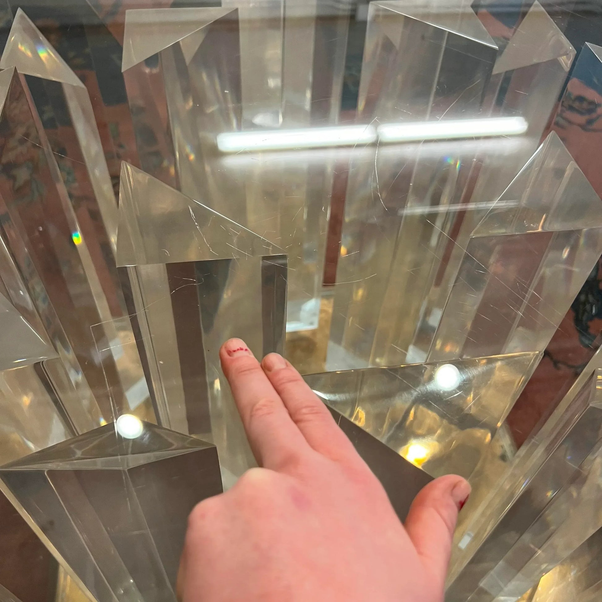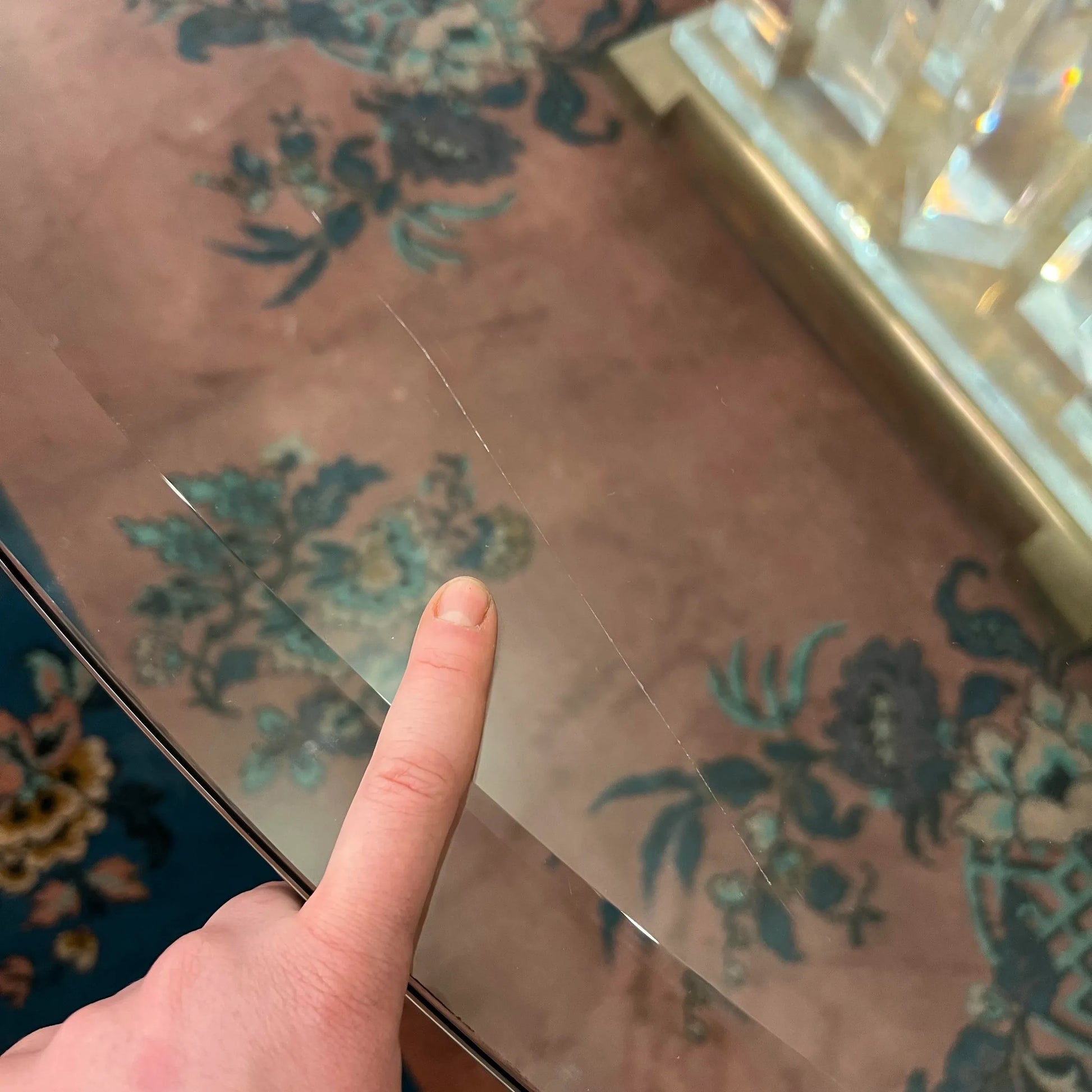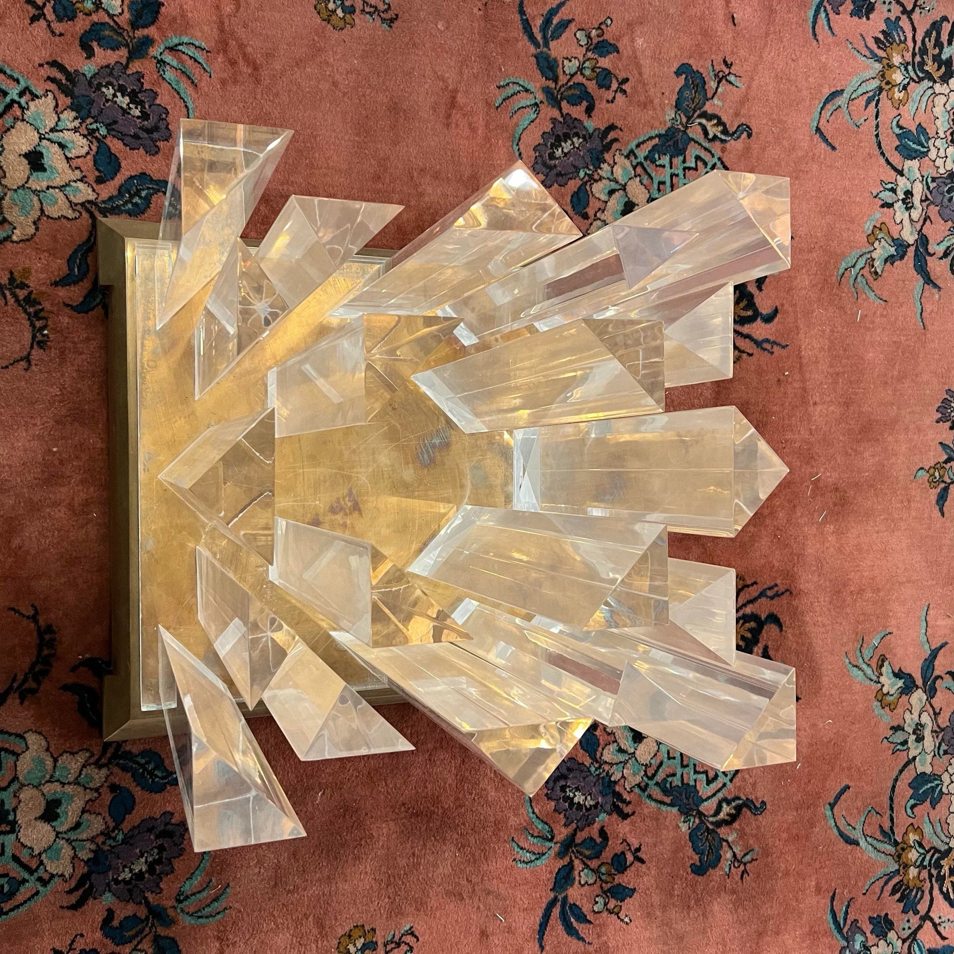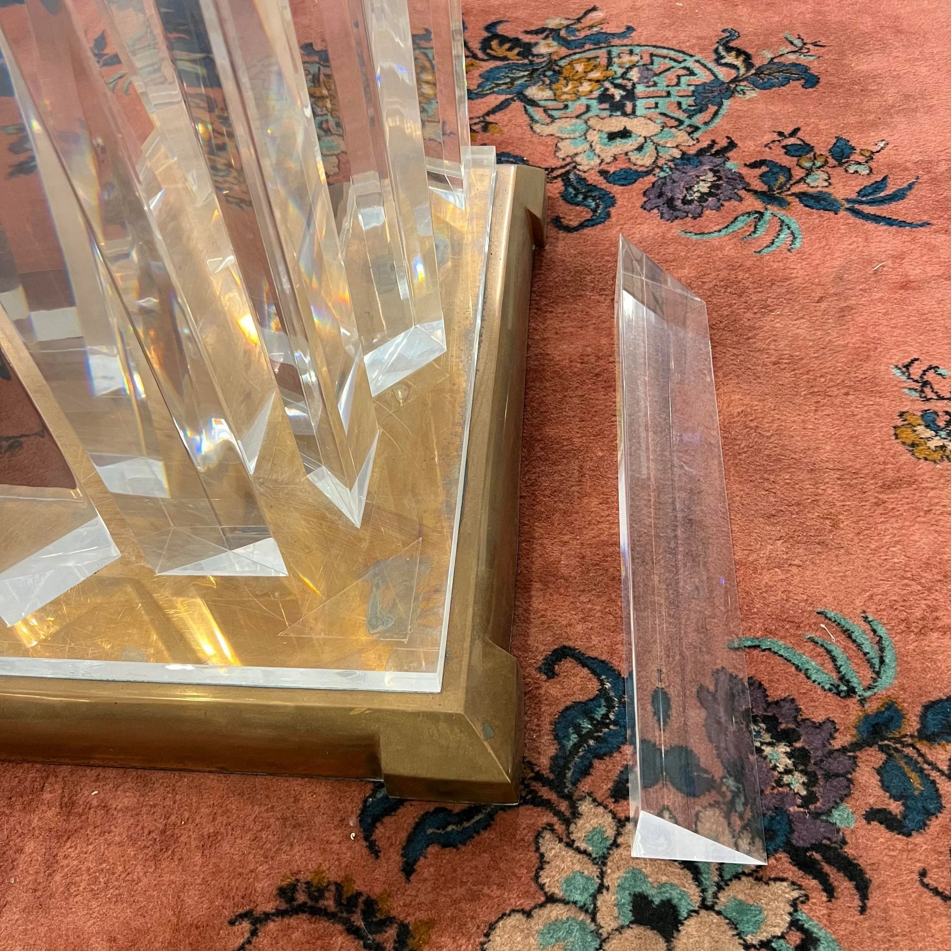This is a table that will be impressive in any room which 8’ round 3/4 inch thick tapered glass top on top of a lucite pedestal and solid copper/brass base