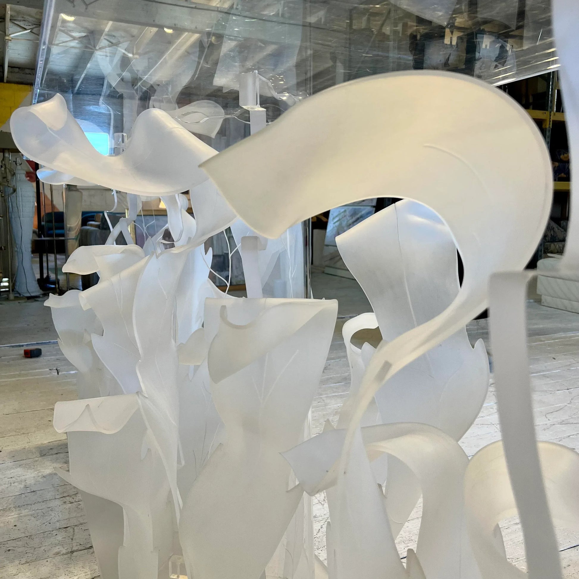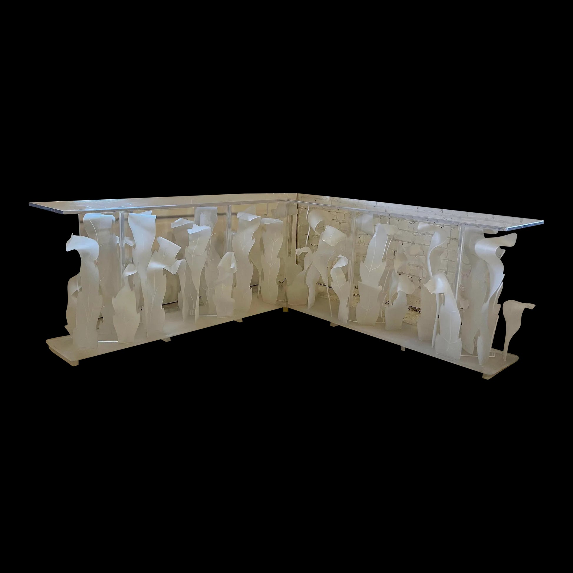 This piece was made for the CEO of a record labels home in Miami. Custom made L shaped bar constructed out of lucite. The bar top is supported by transparent pieces of lucite, surrounded by frosted lucite leaves that emerge from the base. Lights go in the bottom to light it up. It is about impossible to Capture how amazing it is in real life. It does come apart into pieces for moving.