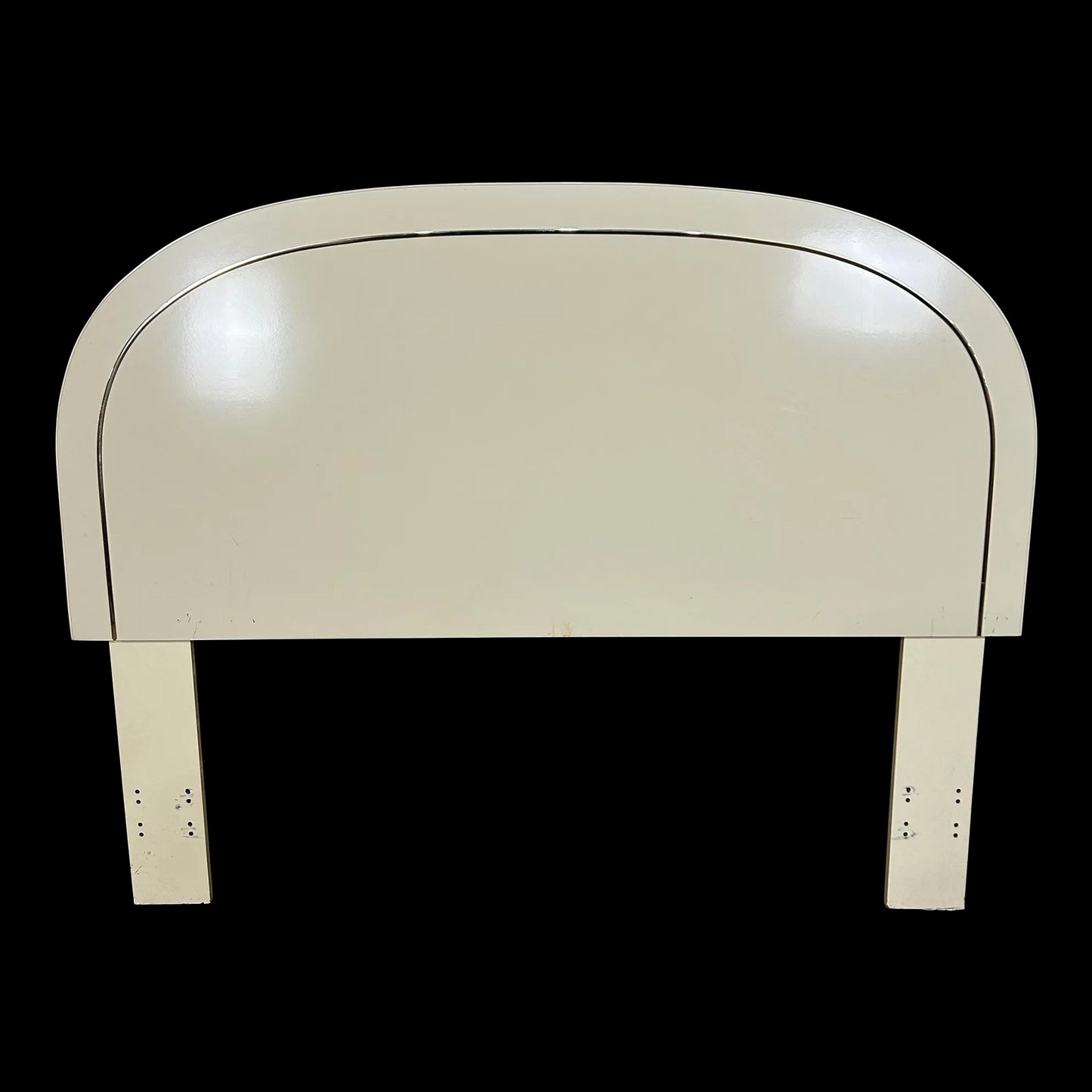 Postmodern 80s full size headboard featuring lacquered wood in a lovely cream color and a lipped brass detail. This piece shows signs of previous use, but there is the original Sears tag still on back of the headboard.