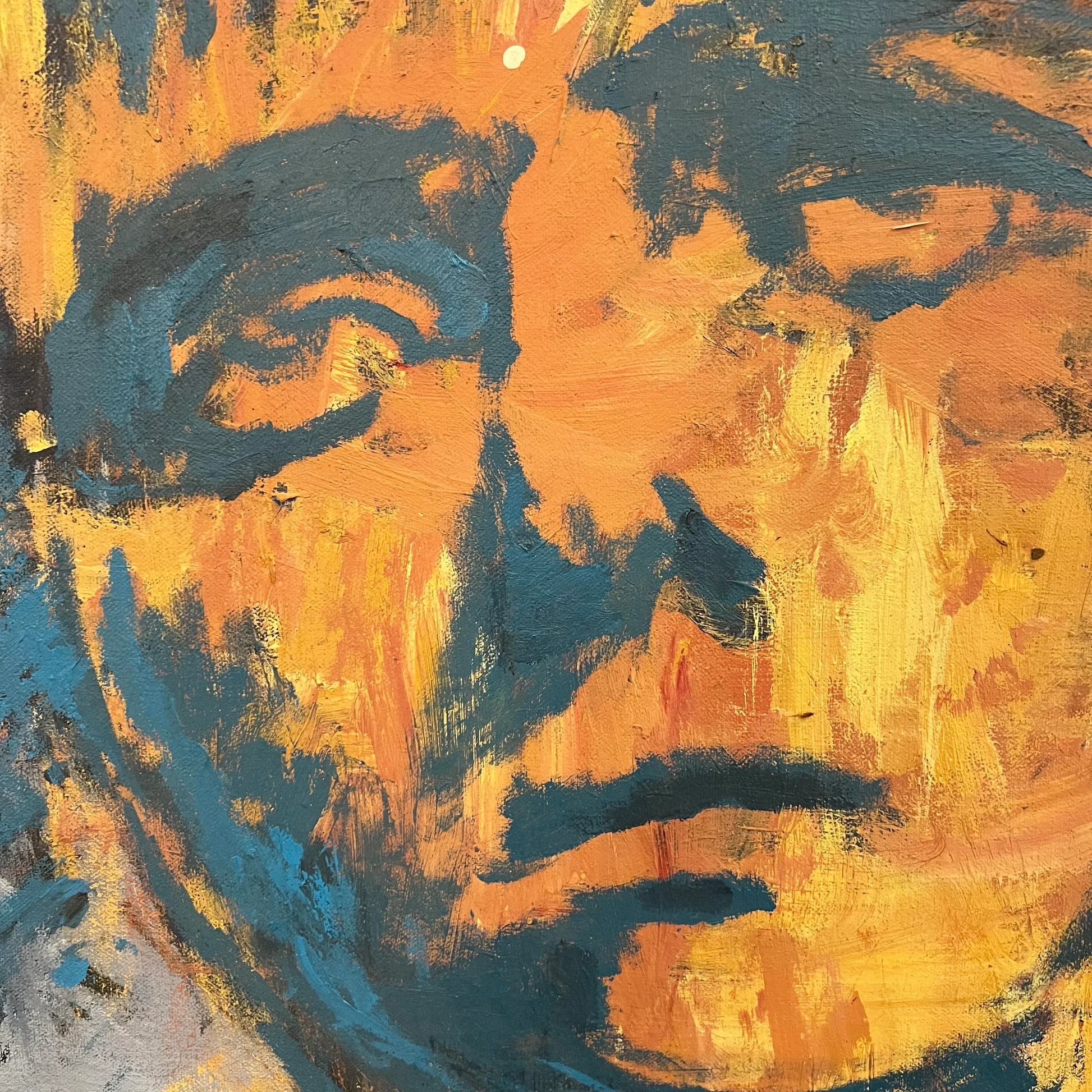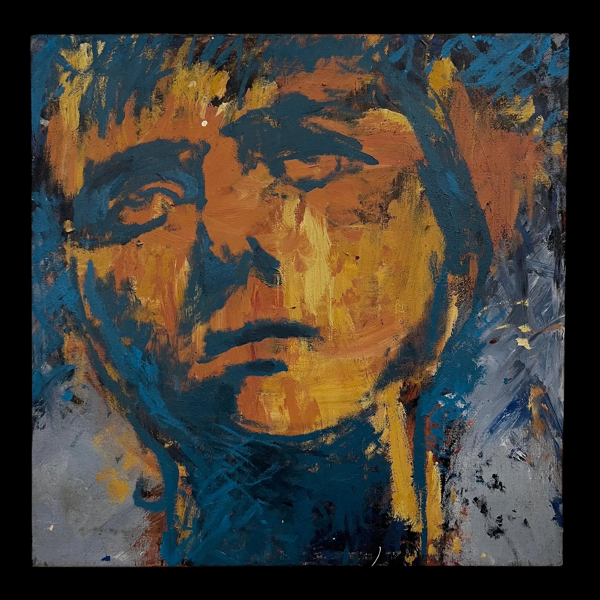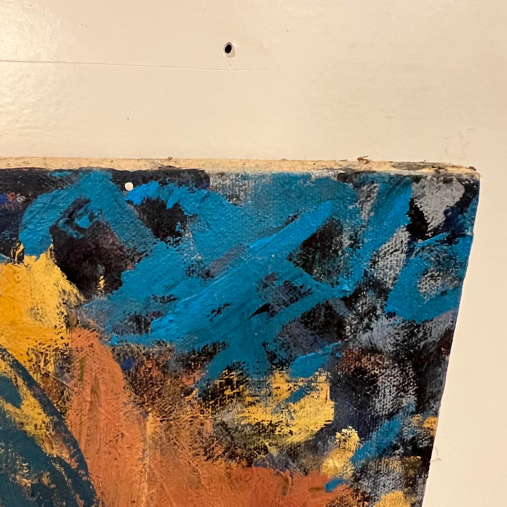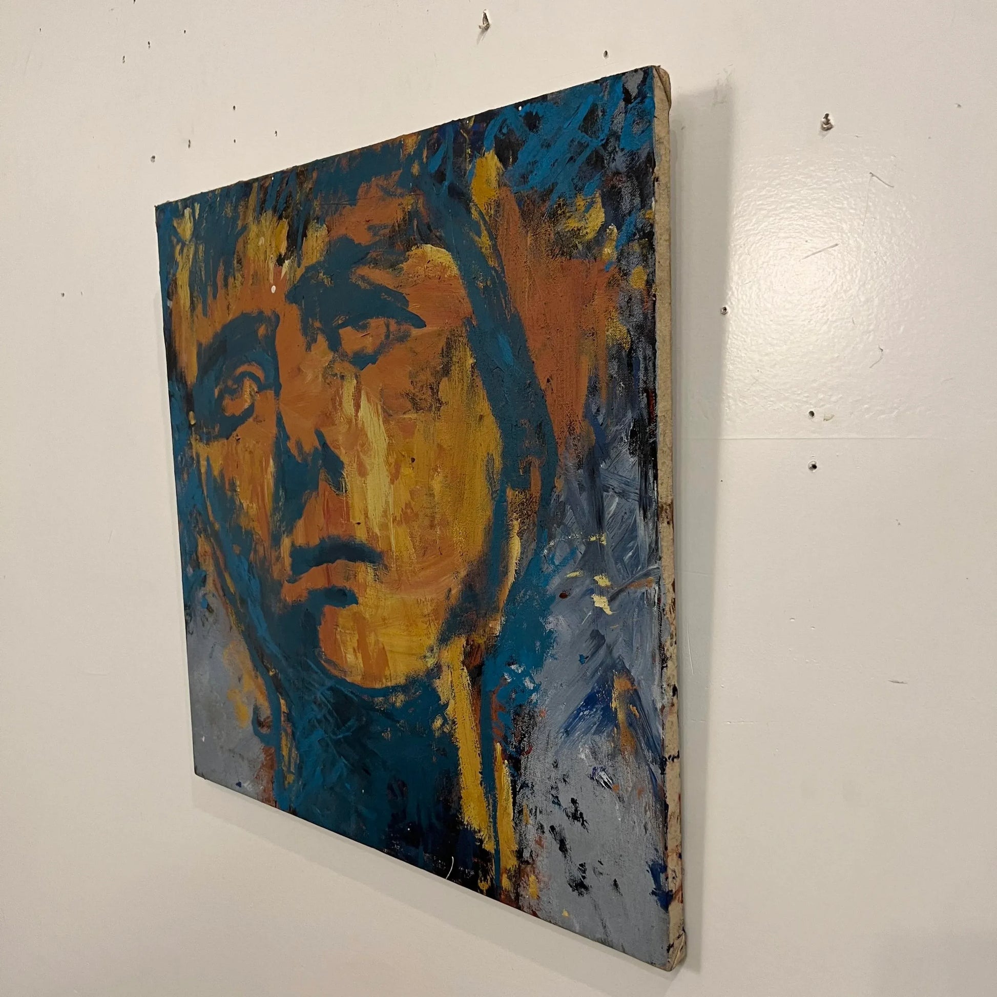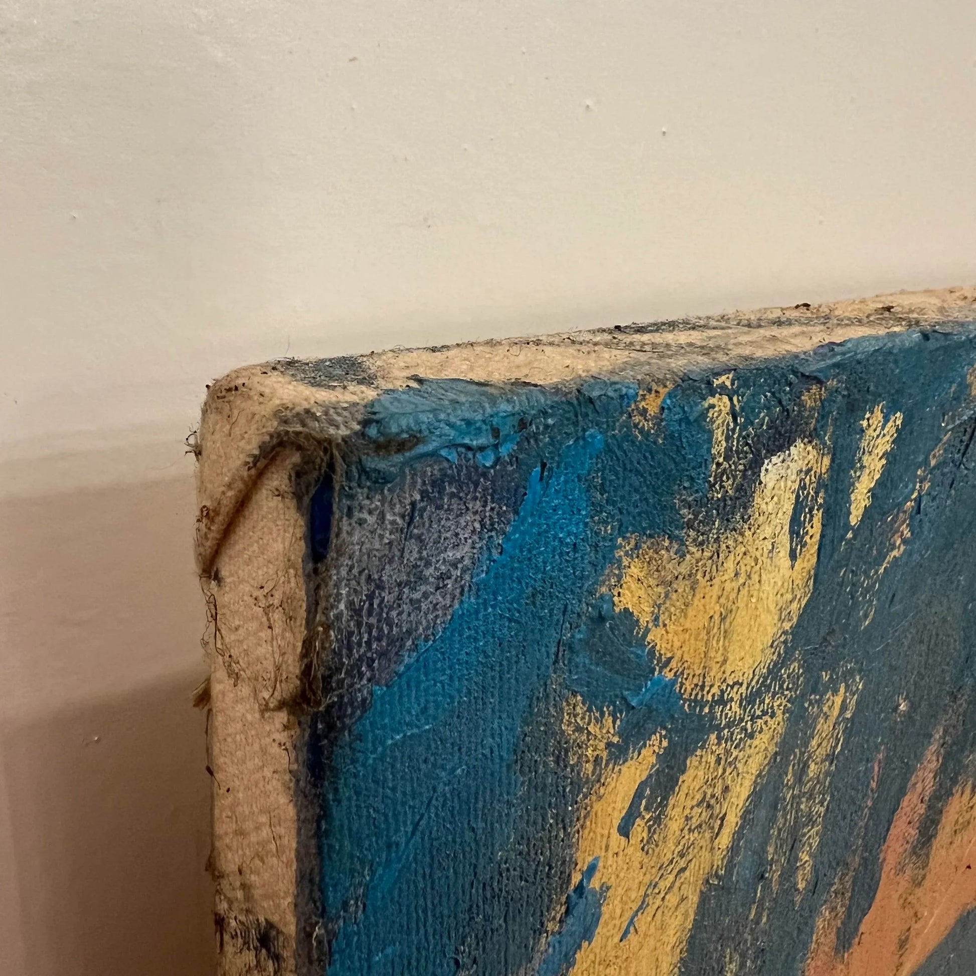 Mid century portrait painting using shades of blues and yellows. Artist and year made are unknown.