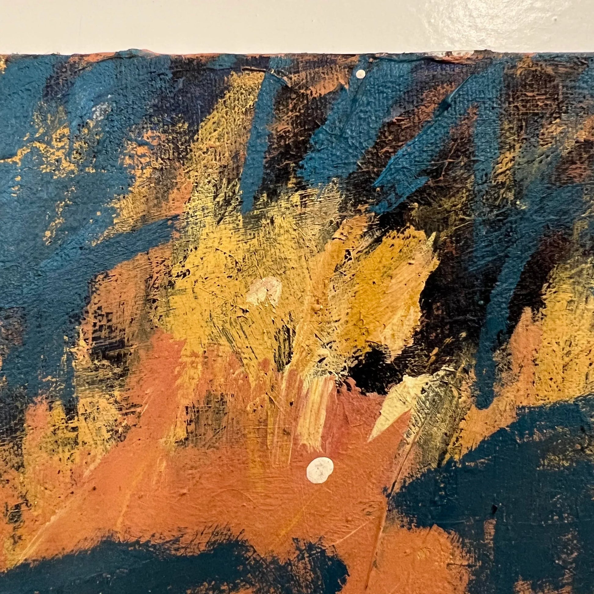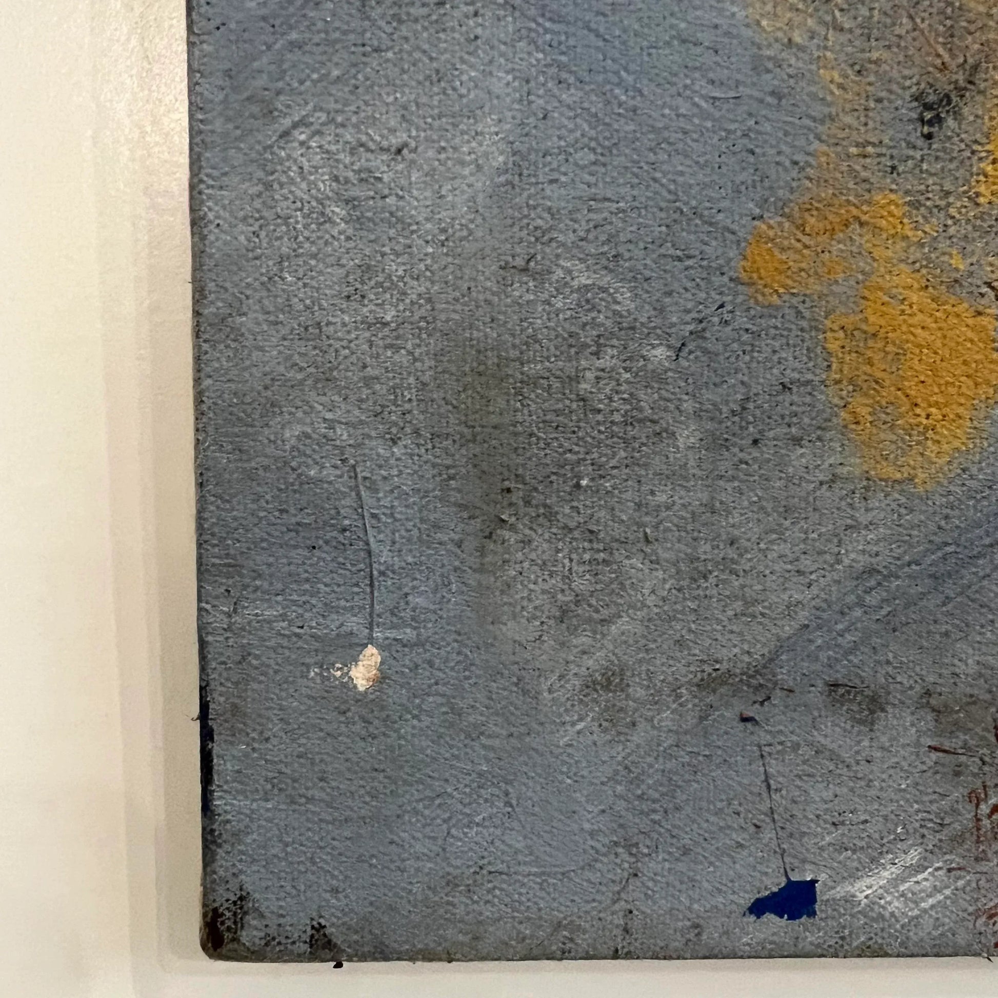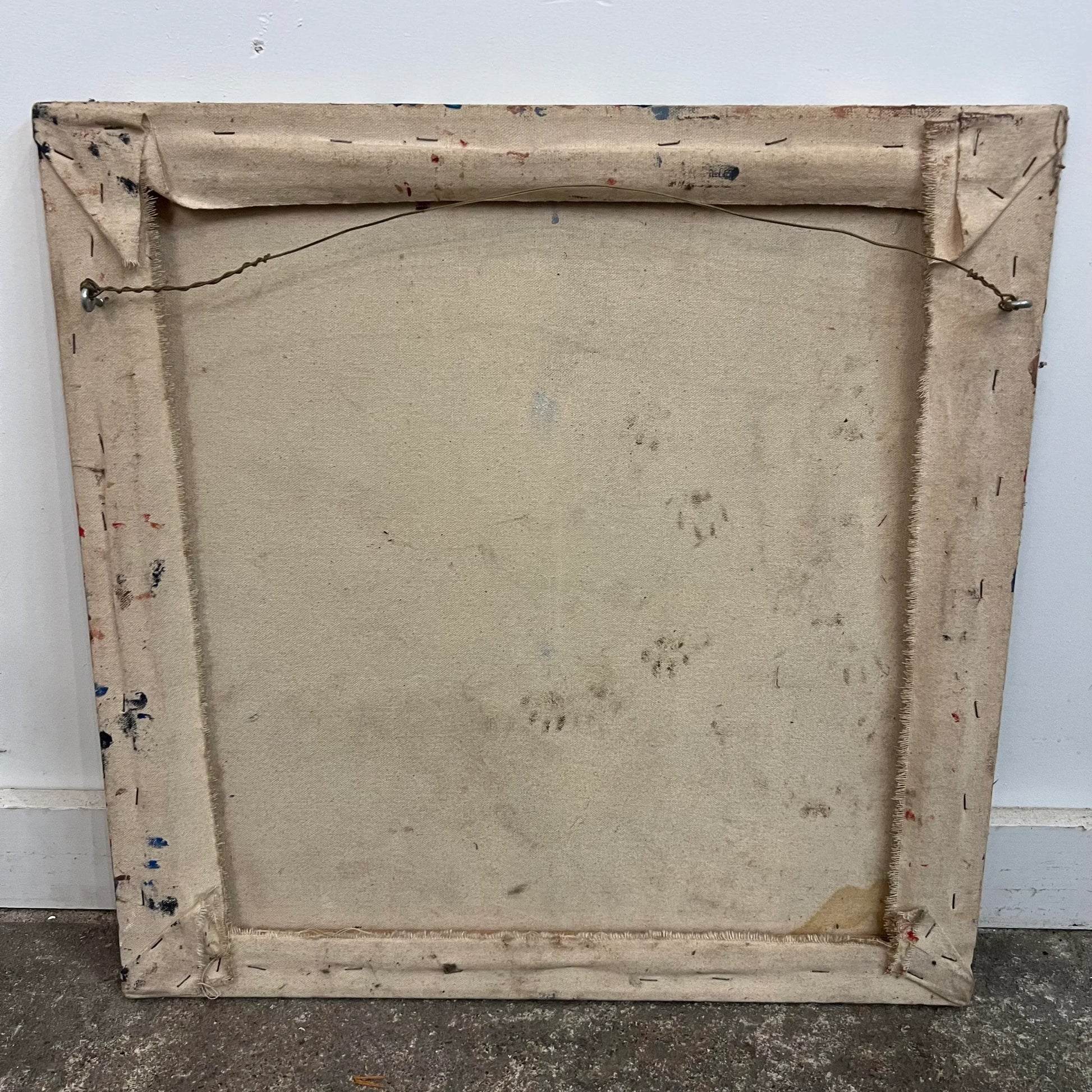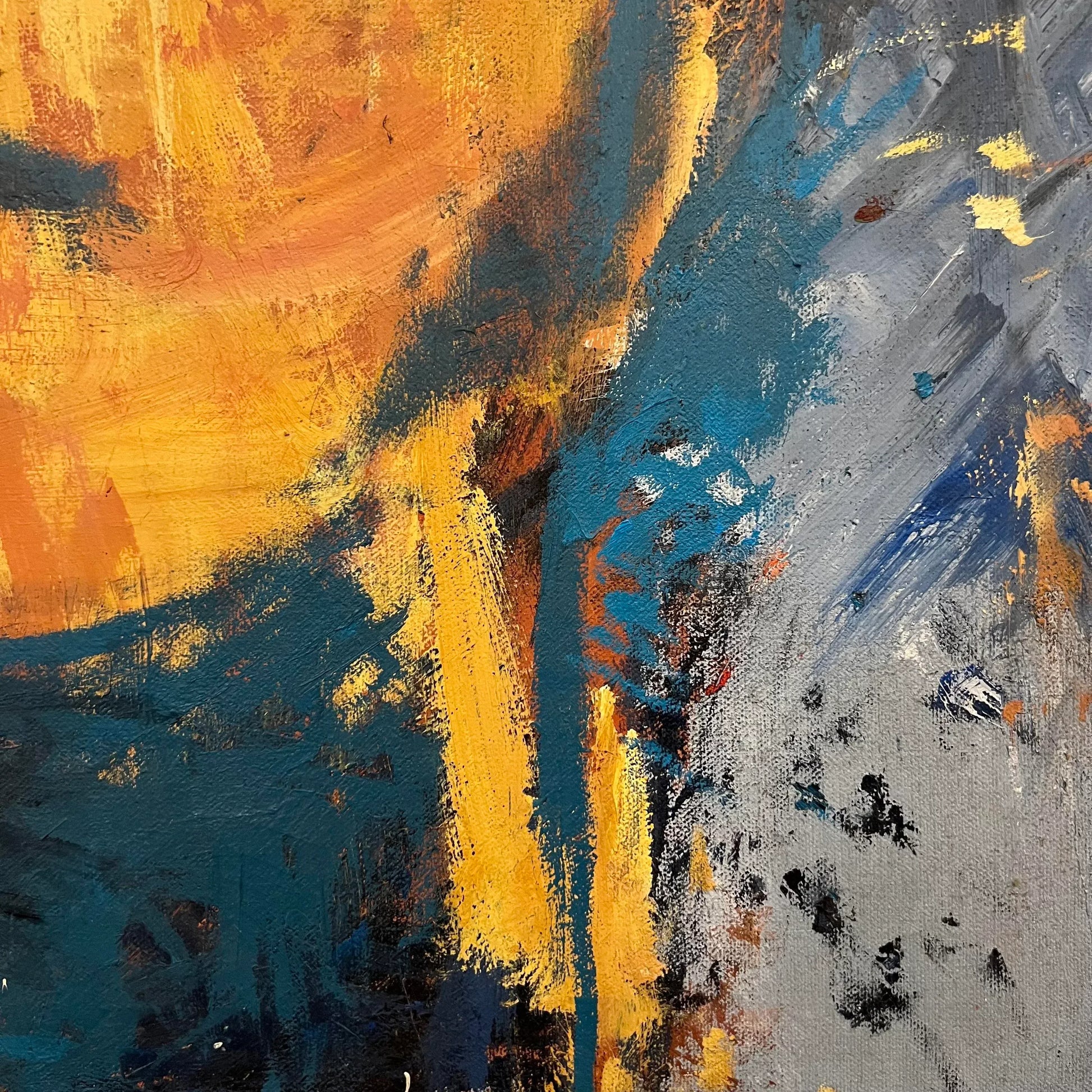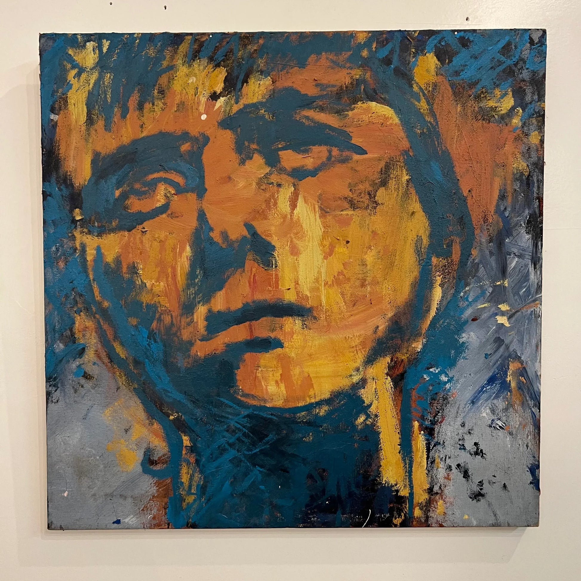 Mid century portrait painting using shades of blues and yellows. Artist and year made are unknown.