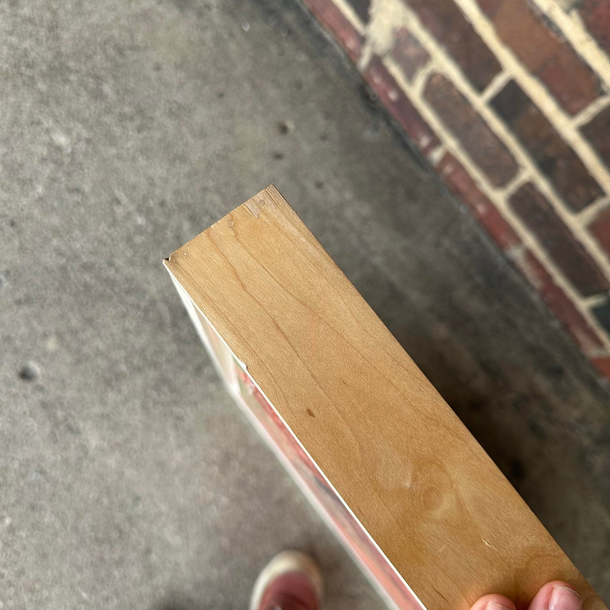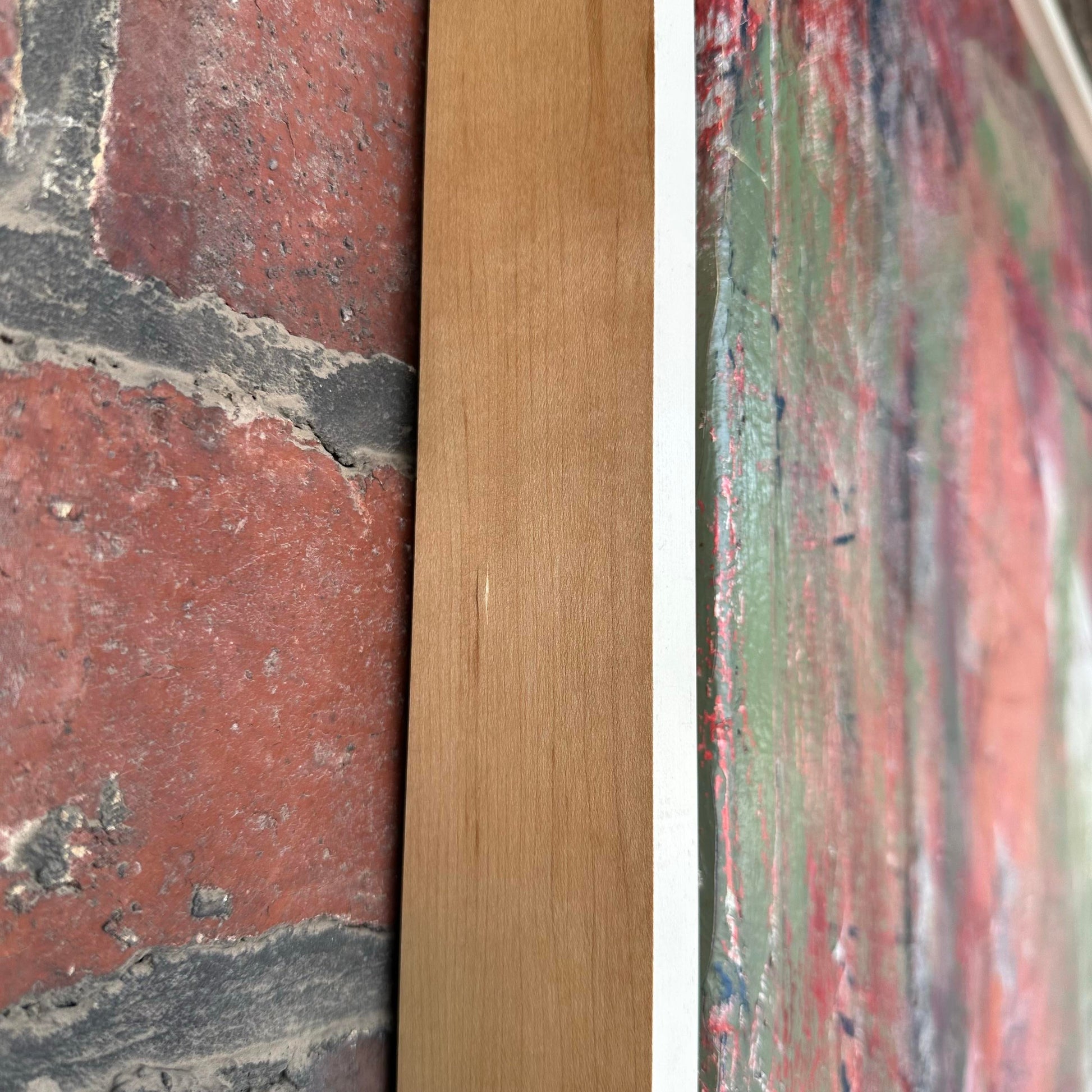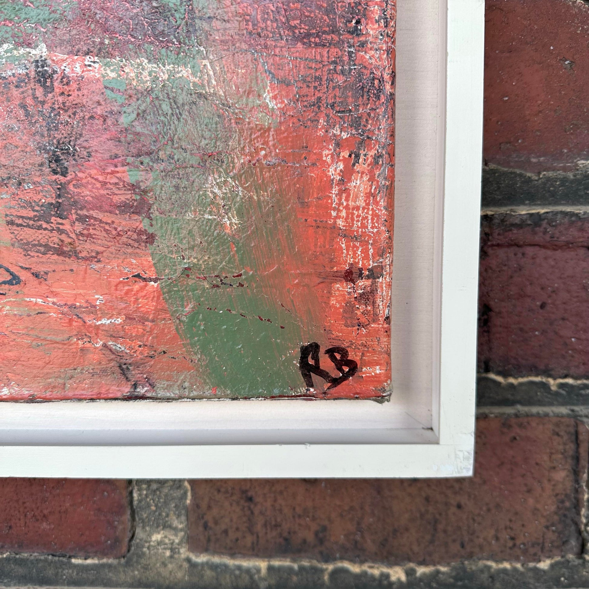 This stunning abstract painting features a mix of reds, oranges, greens, blues and whites. The face of the frame is white while the sides are a light wood tone. It is signed RB in the bottom right corner.