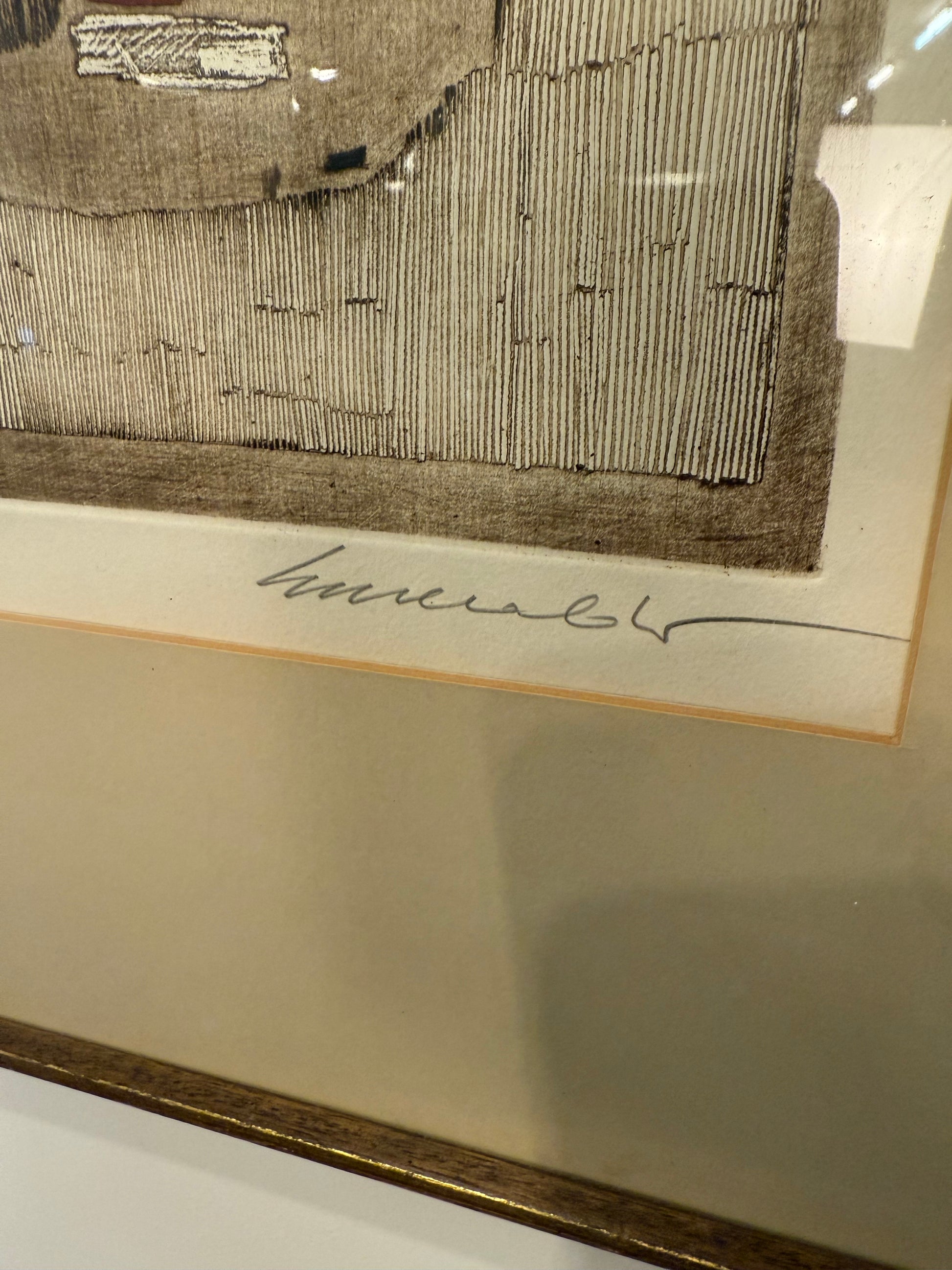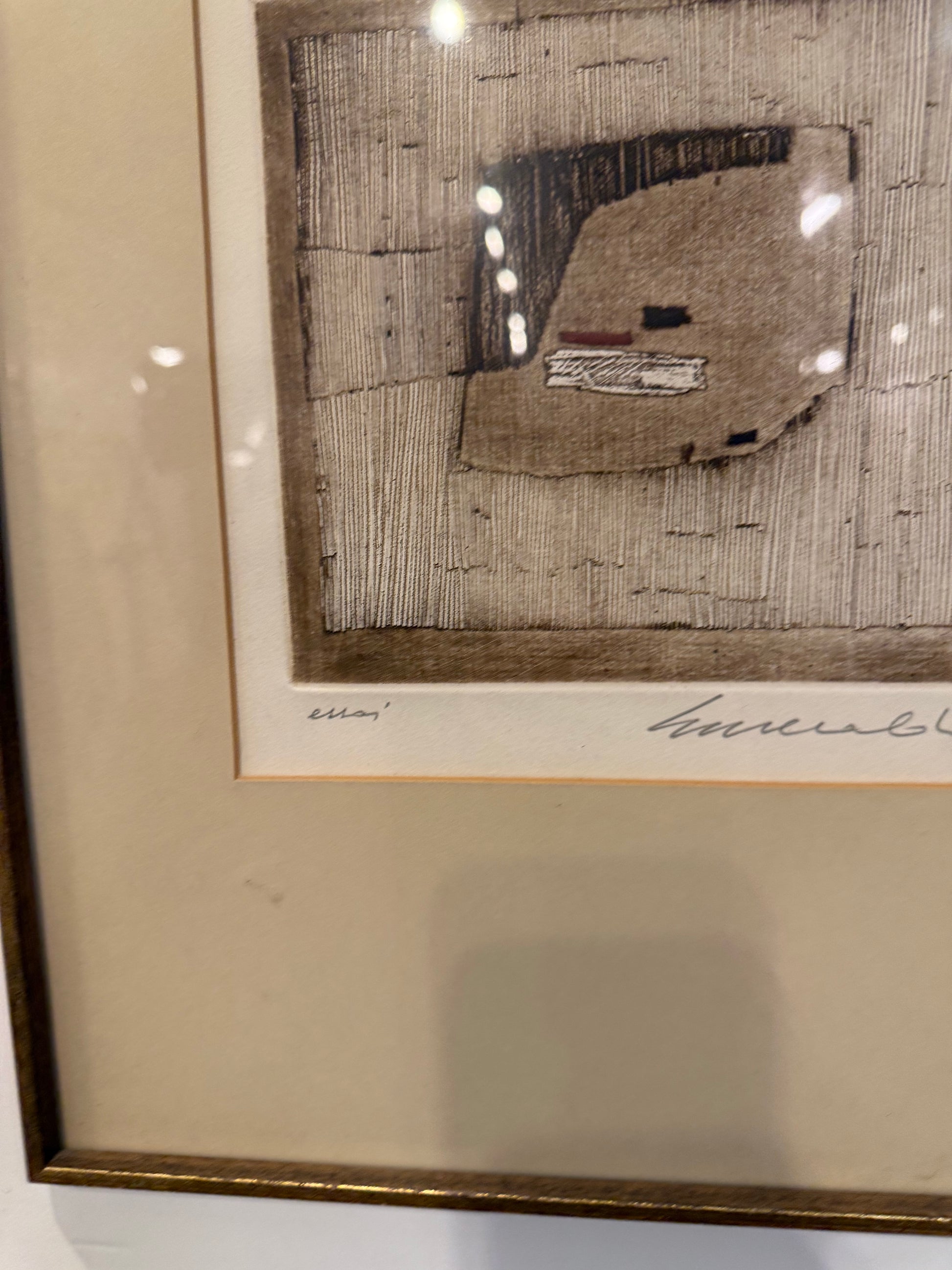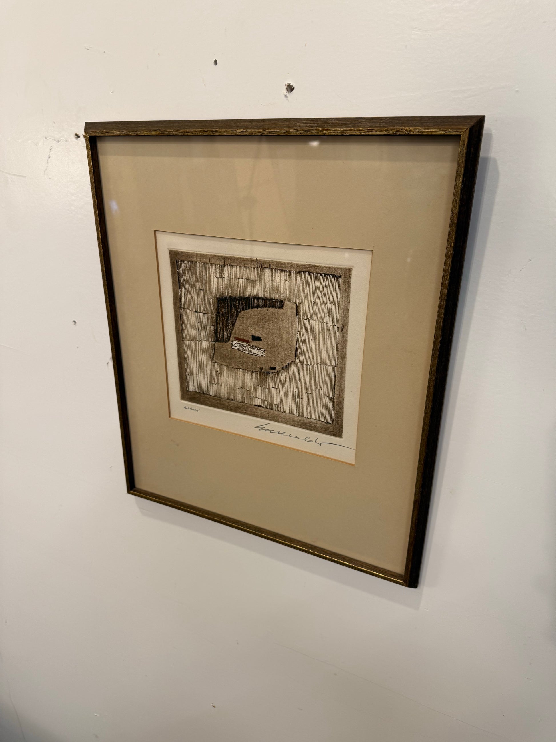Abstract Print Signed. We are unable to identify the artist or the title of the piece. The print features browns, black and red ink on paper. The piece has been professionally framed in a gold painted wooden frame.
