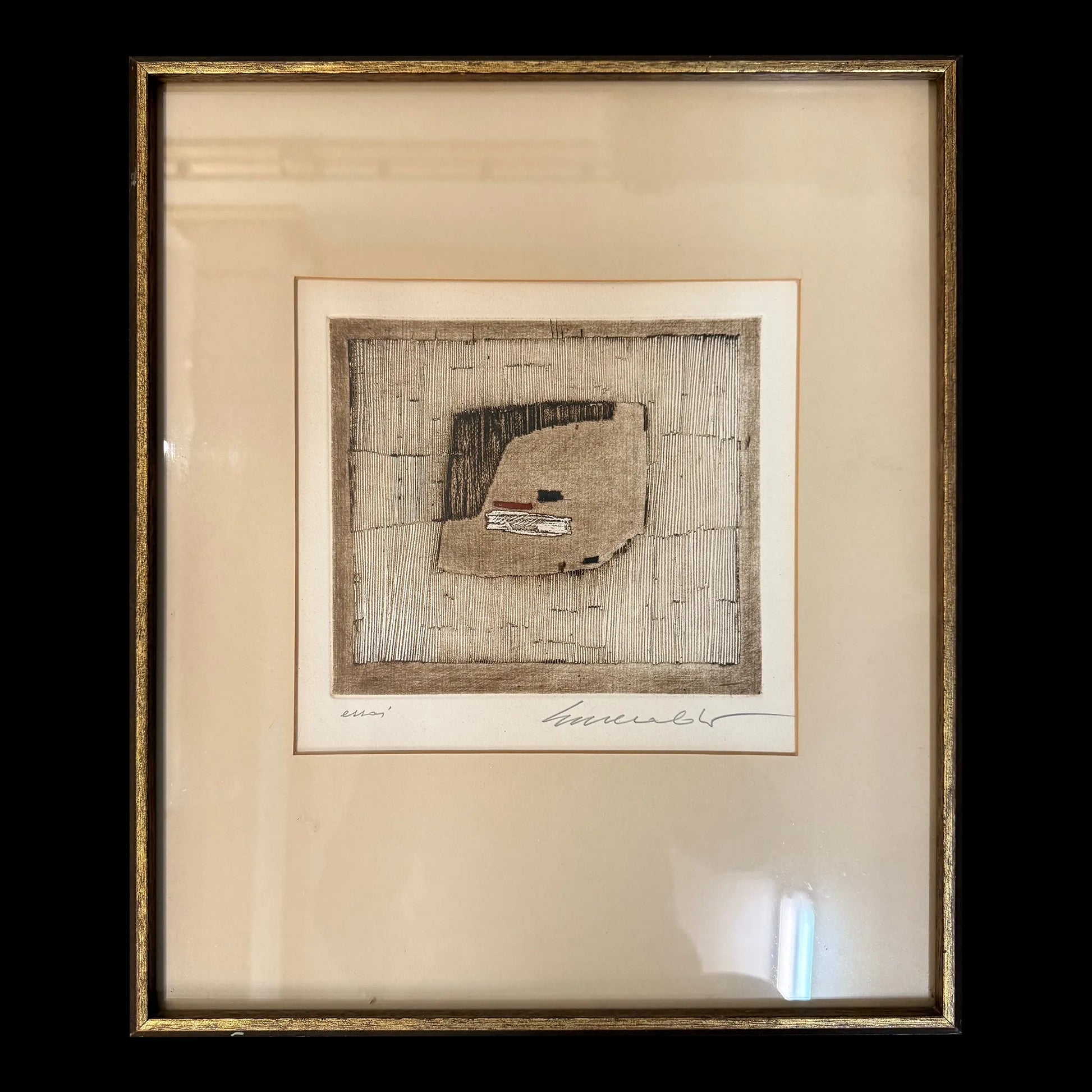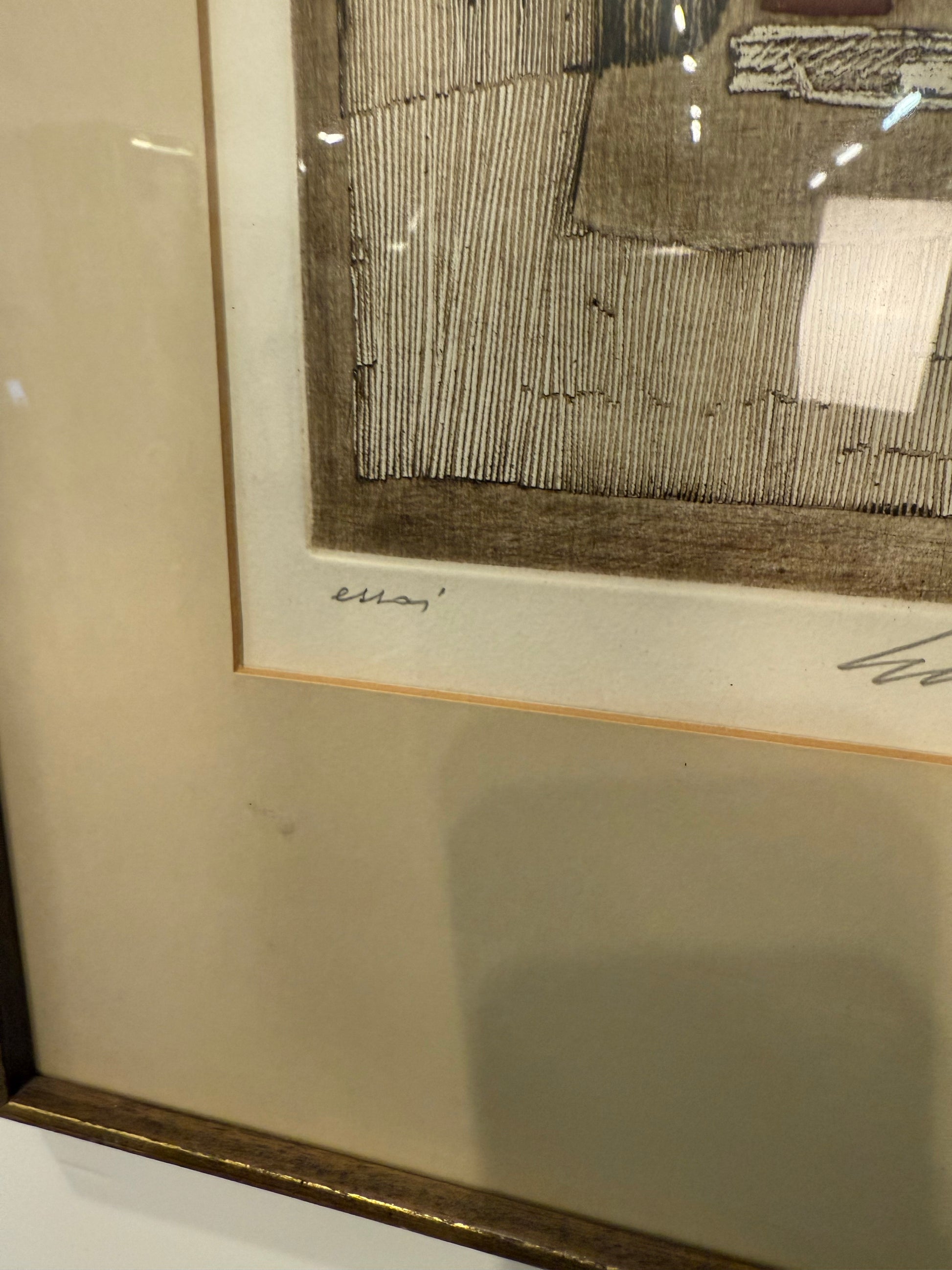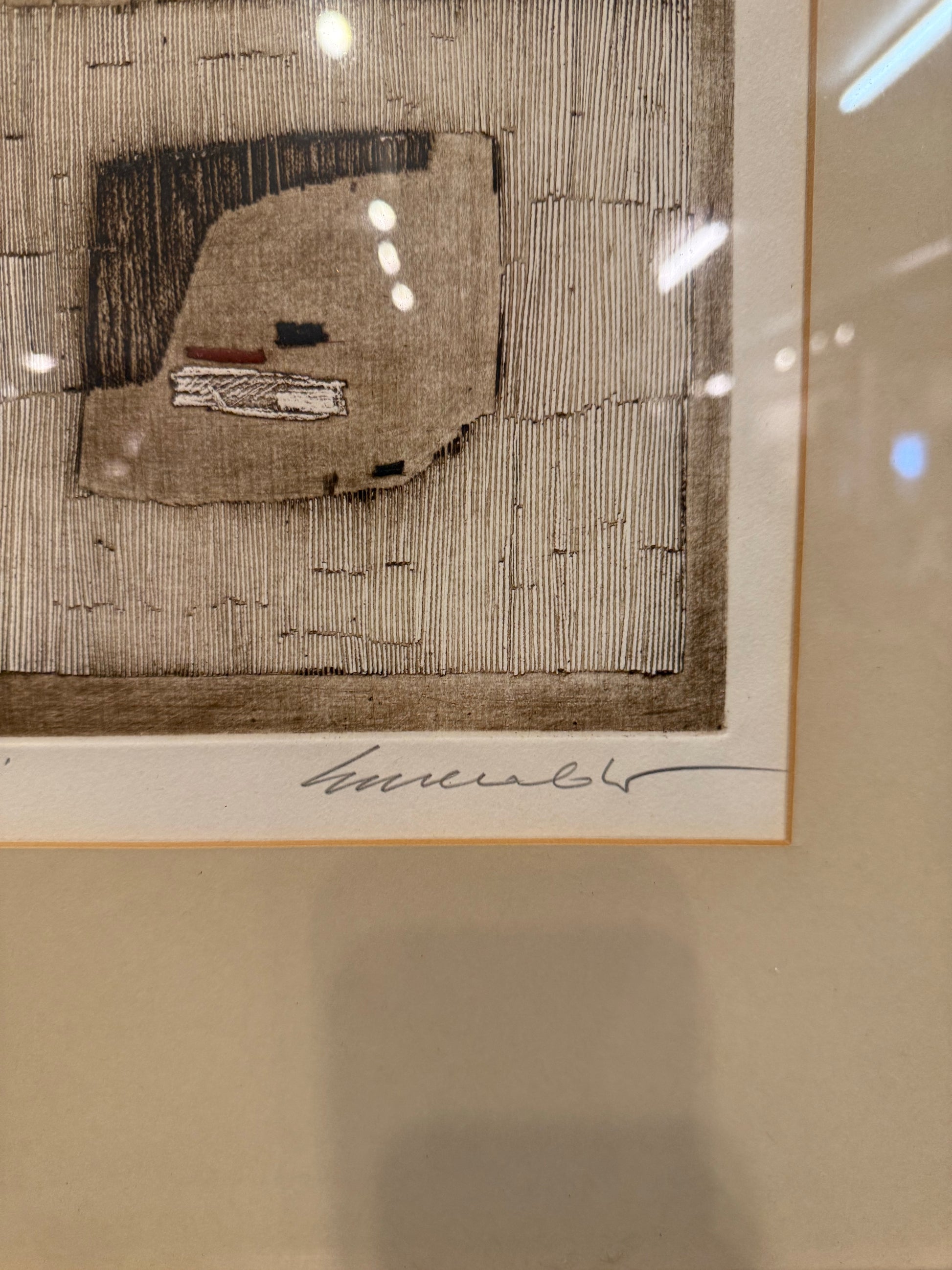 Abstract Print Signed. We are unable to identify the artist or the title of the piece. The print features browns, black and red ink on paper. The piece has been professionally framed in a gold painted wooden frame.