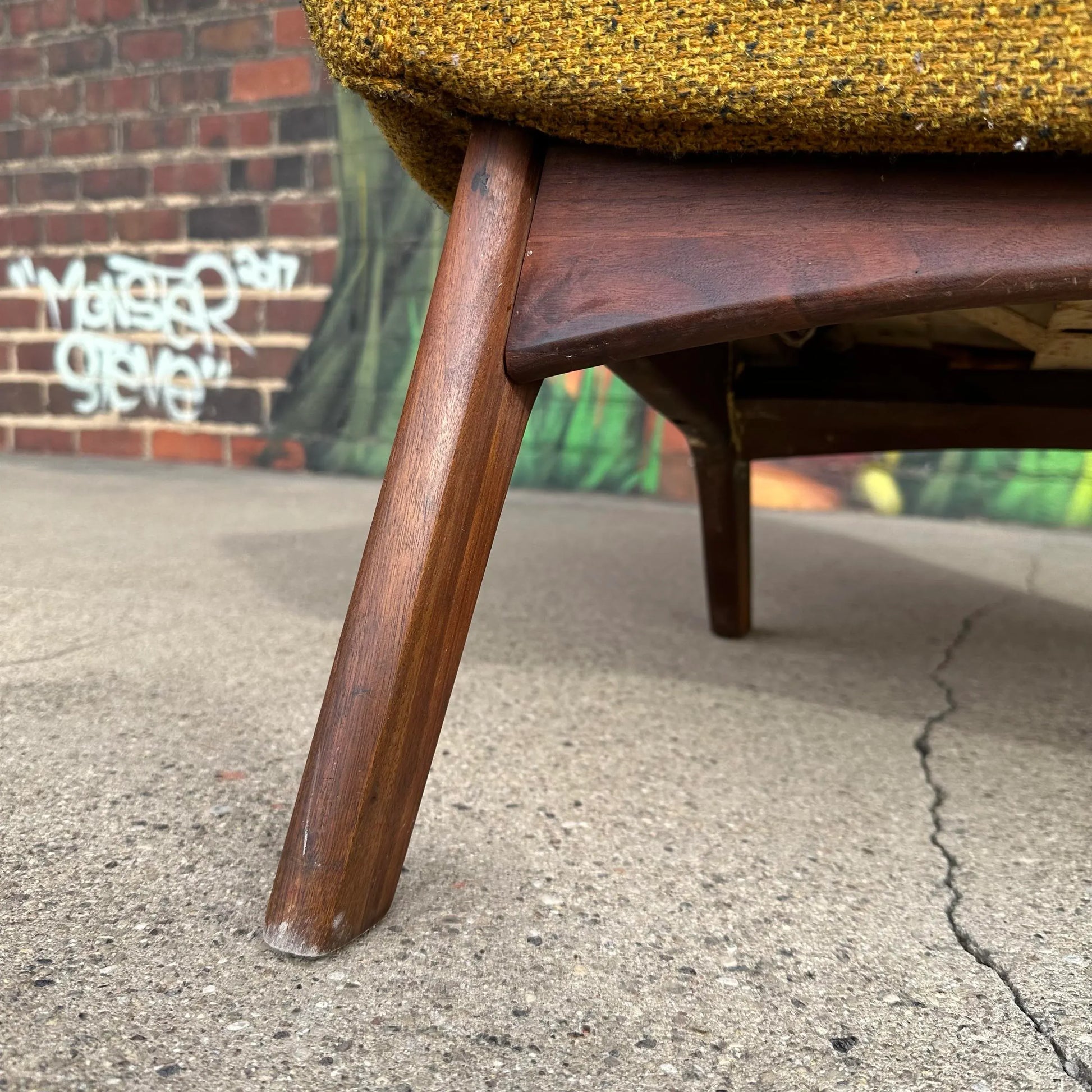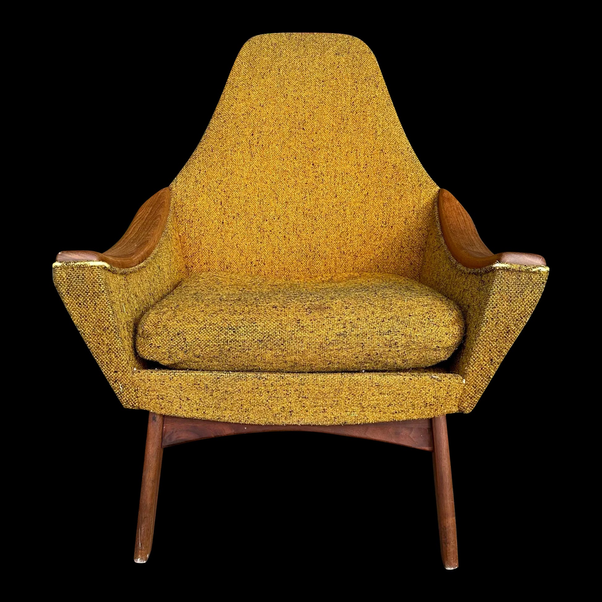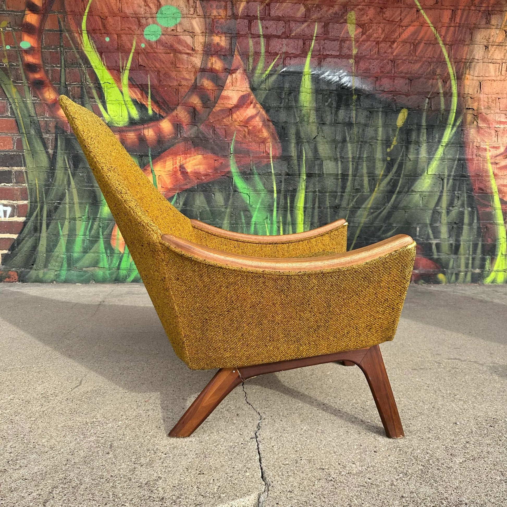 Adrian Pearsall for Craft Associates walnut lounge chair. This chair has a classic retro silhouette that blends sculptural and stylish elements in a practical way. The tall back tapers and the arm rests have solid walnut detailing.