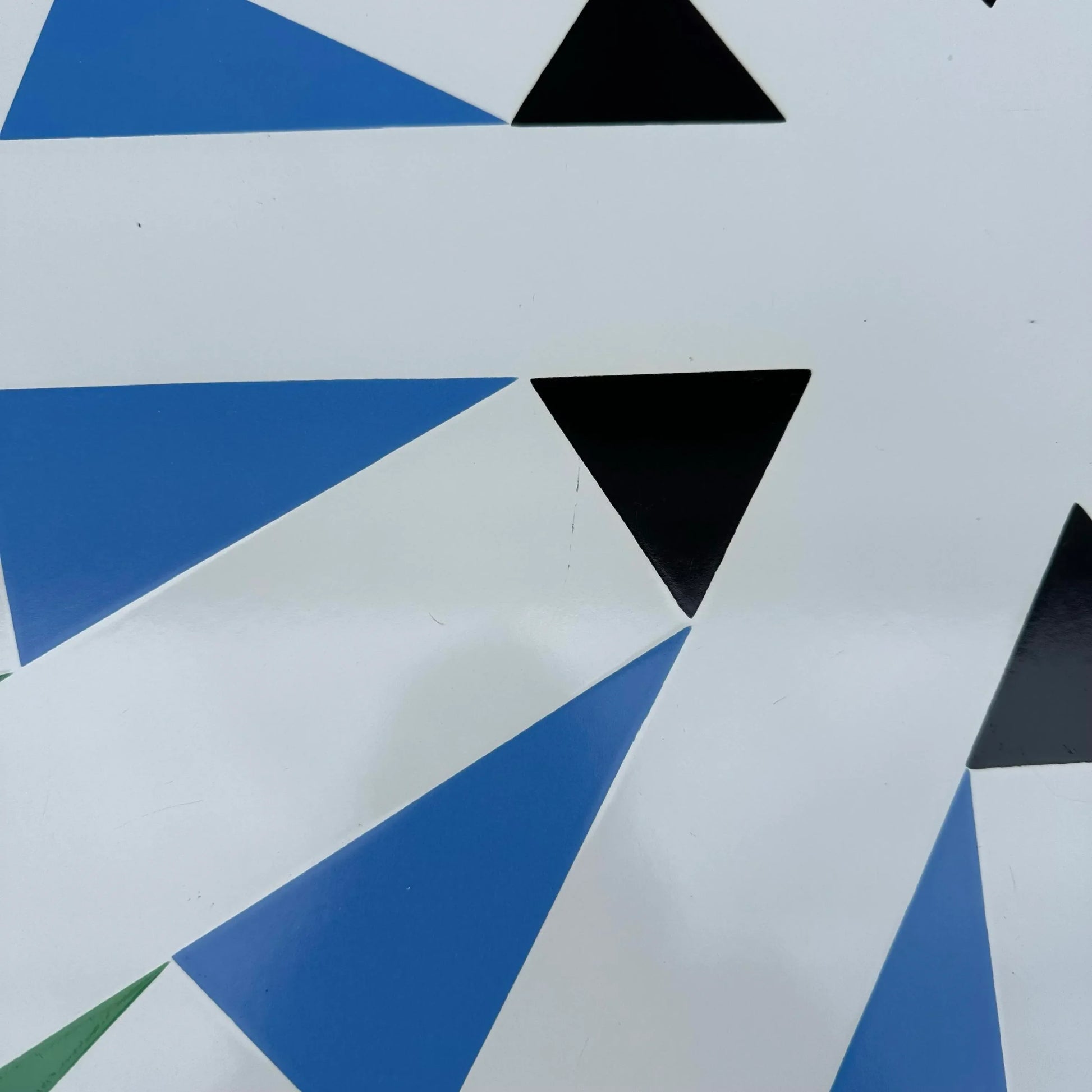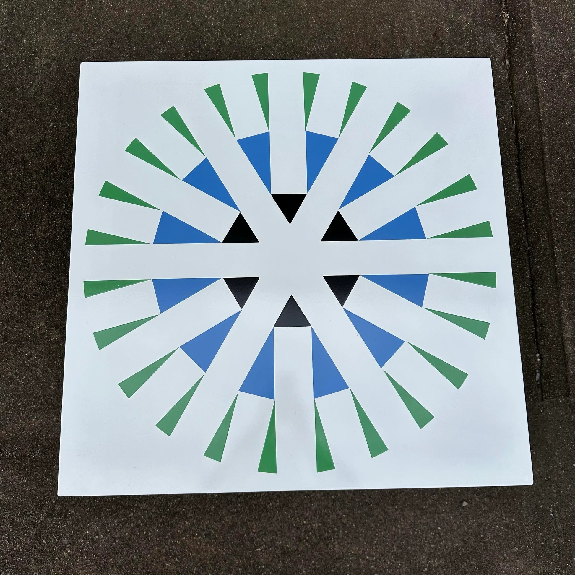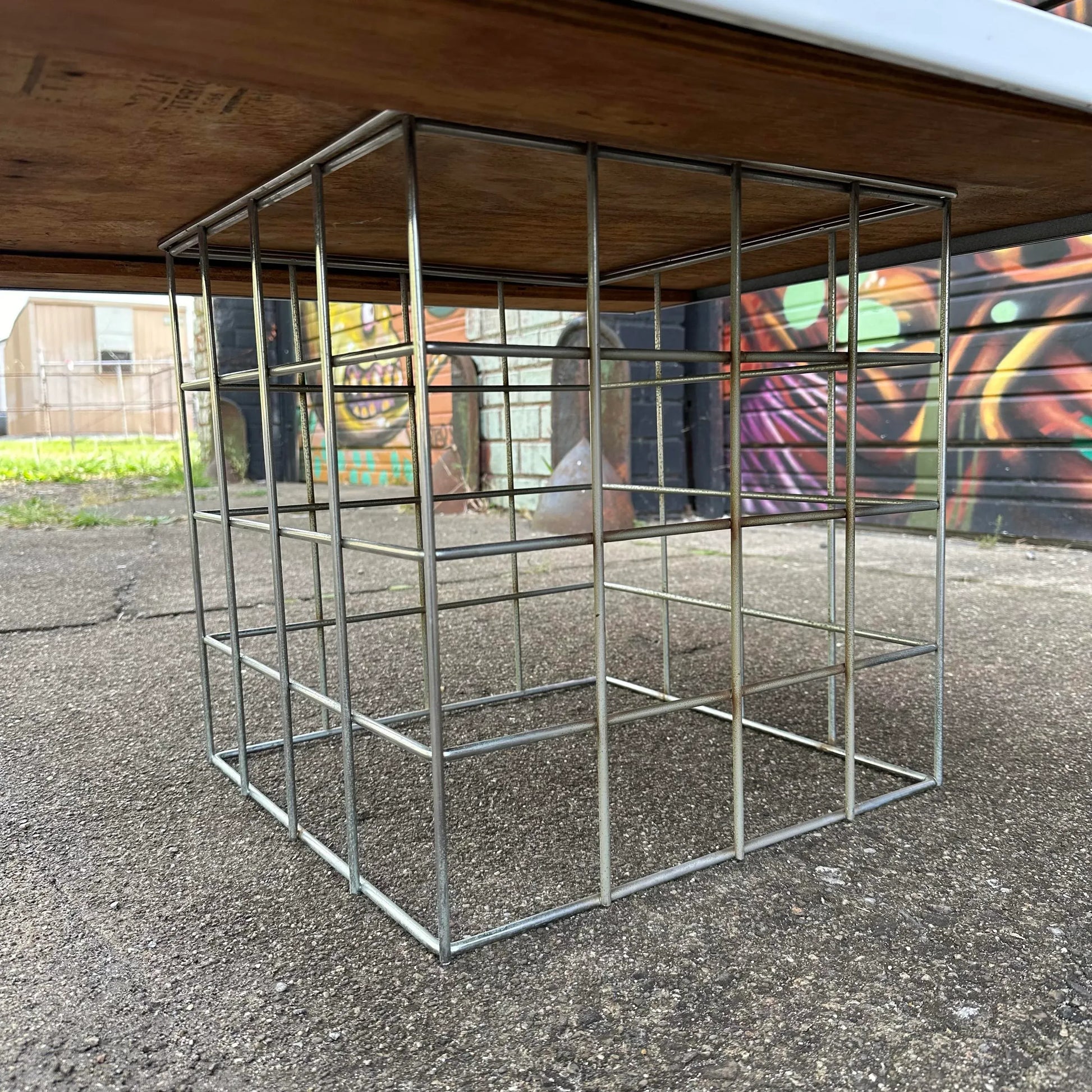 This square-shaped side table top is made of enamel and features a blue, green, and black geometric pattern on its top looks like alexander girard. The pedestal base is made of a cage/crate style chrome cube. We’ve never seen this table before and are unsure of the maker, it came from a home loaded with early Herman Miller