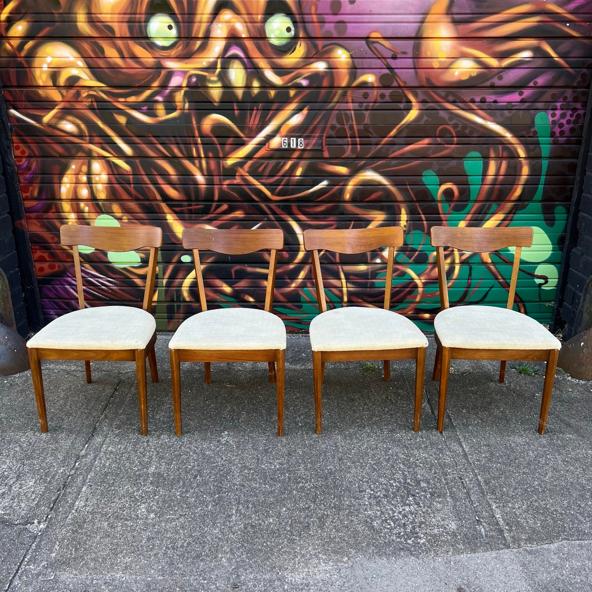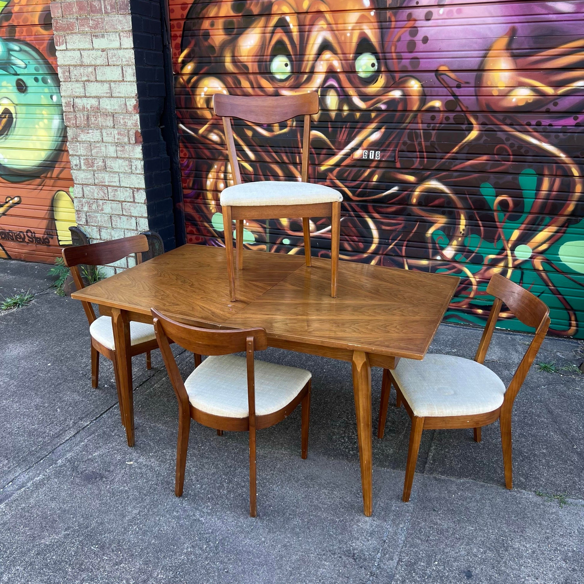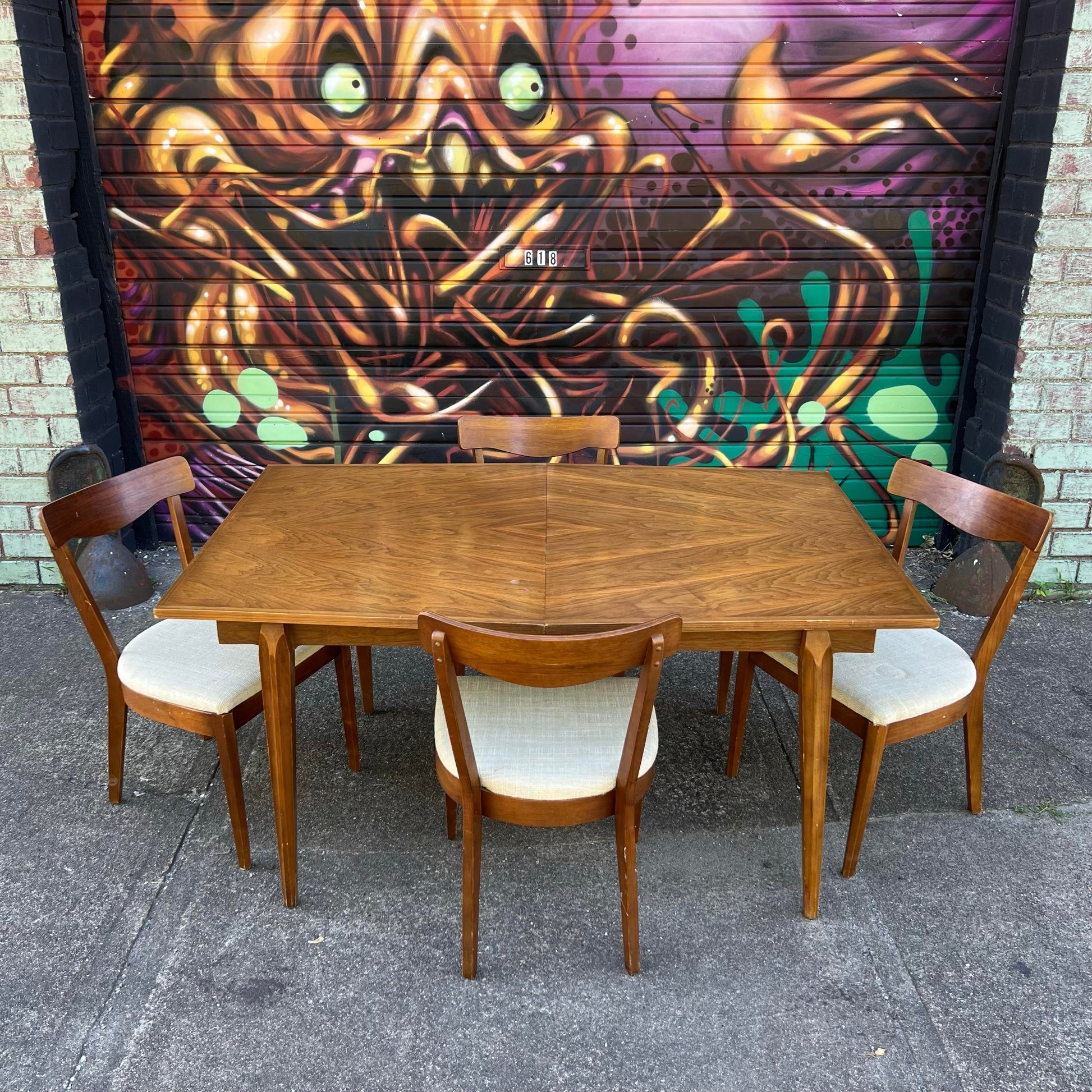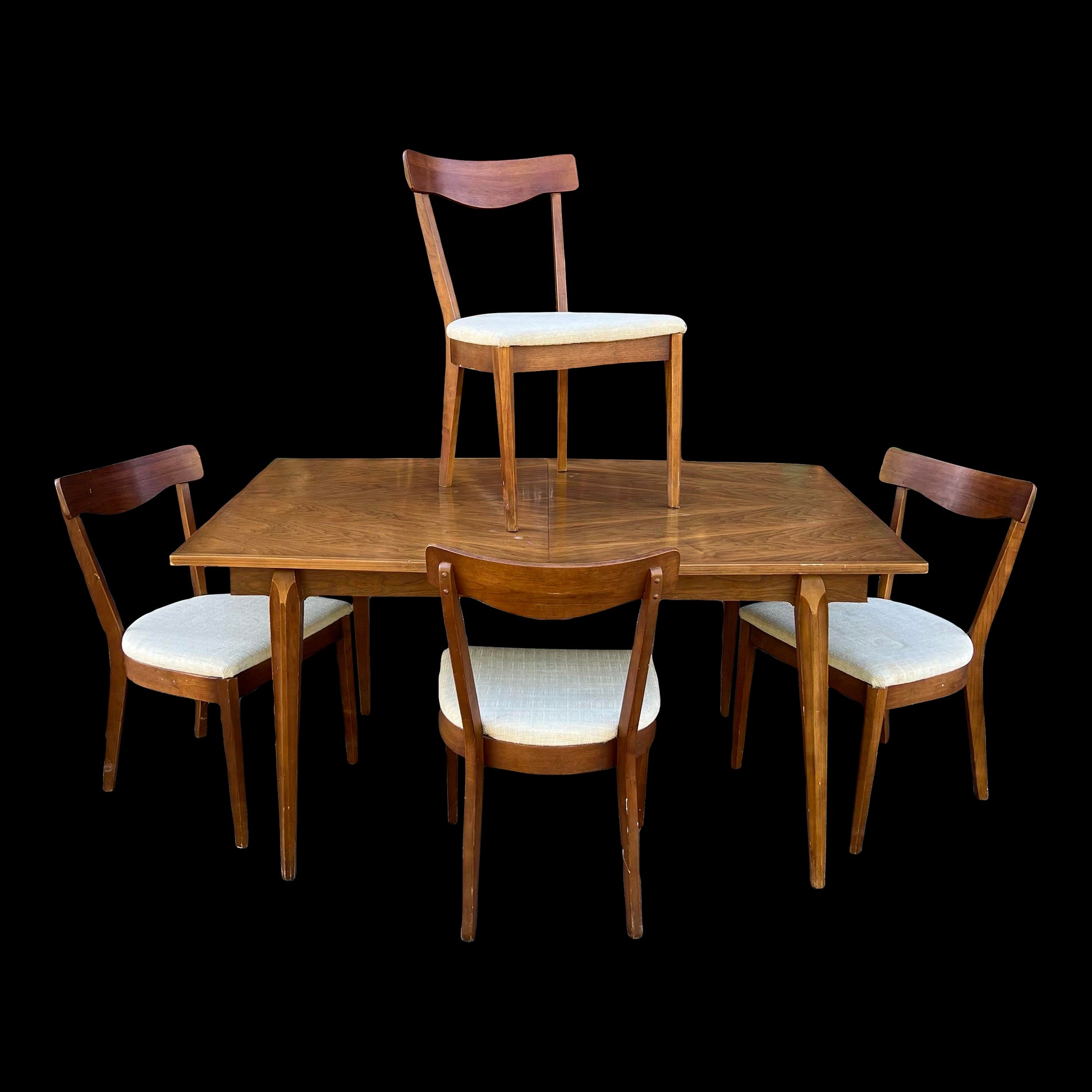 This table features a beautiful diamond shaped wood grain on the top of the table. The chairs have a petit and iconic mid century modern design.