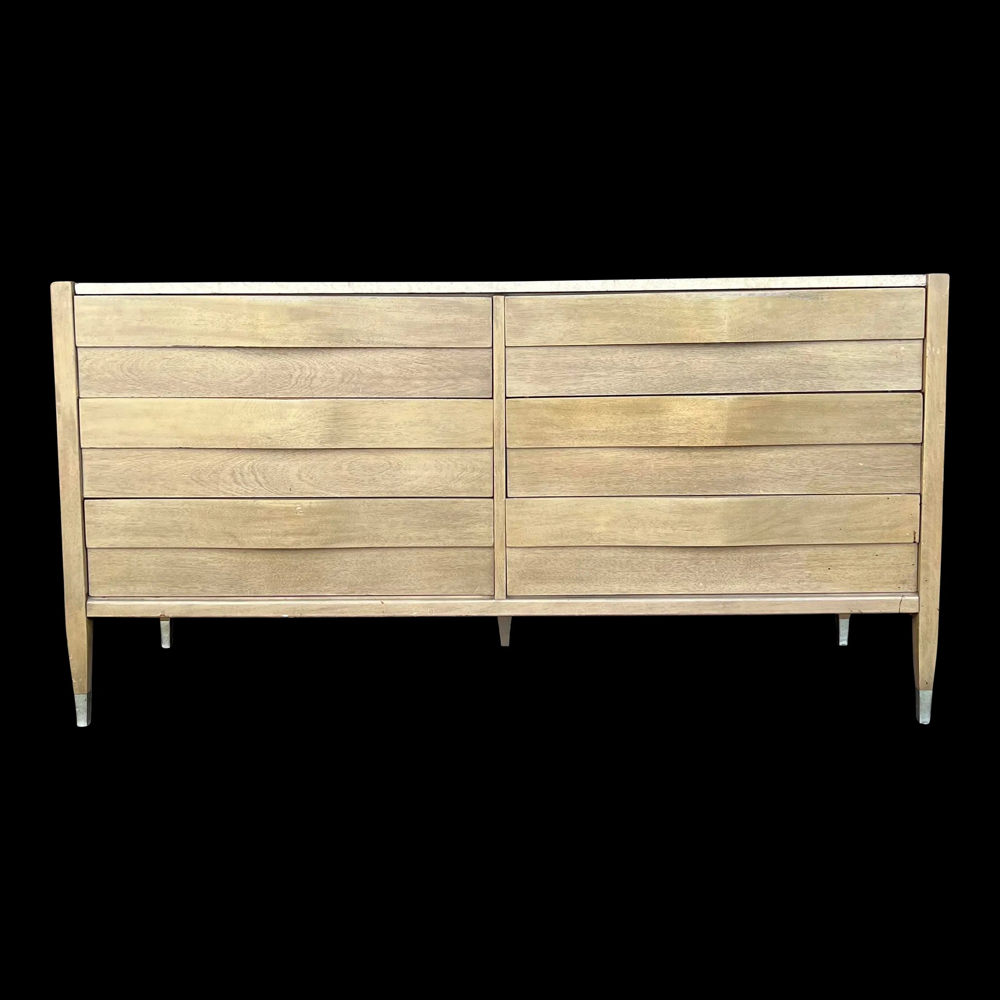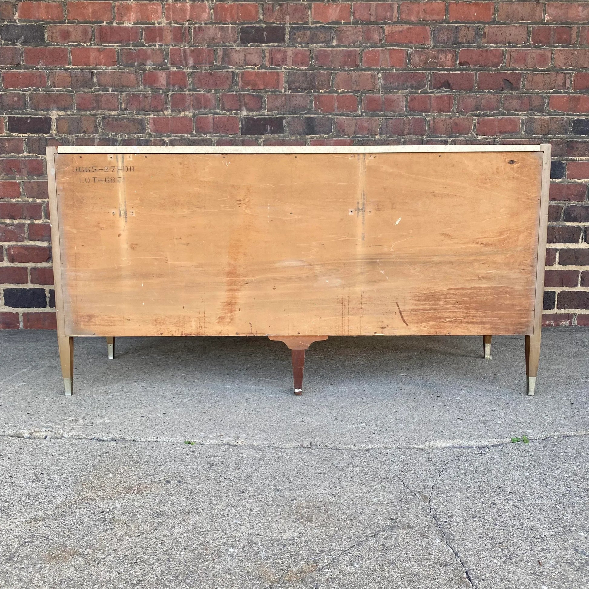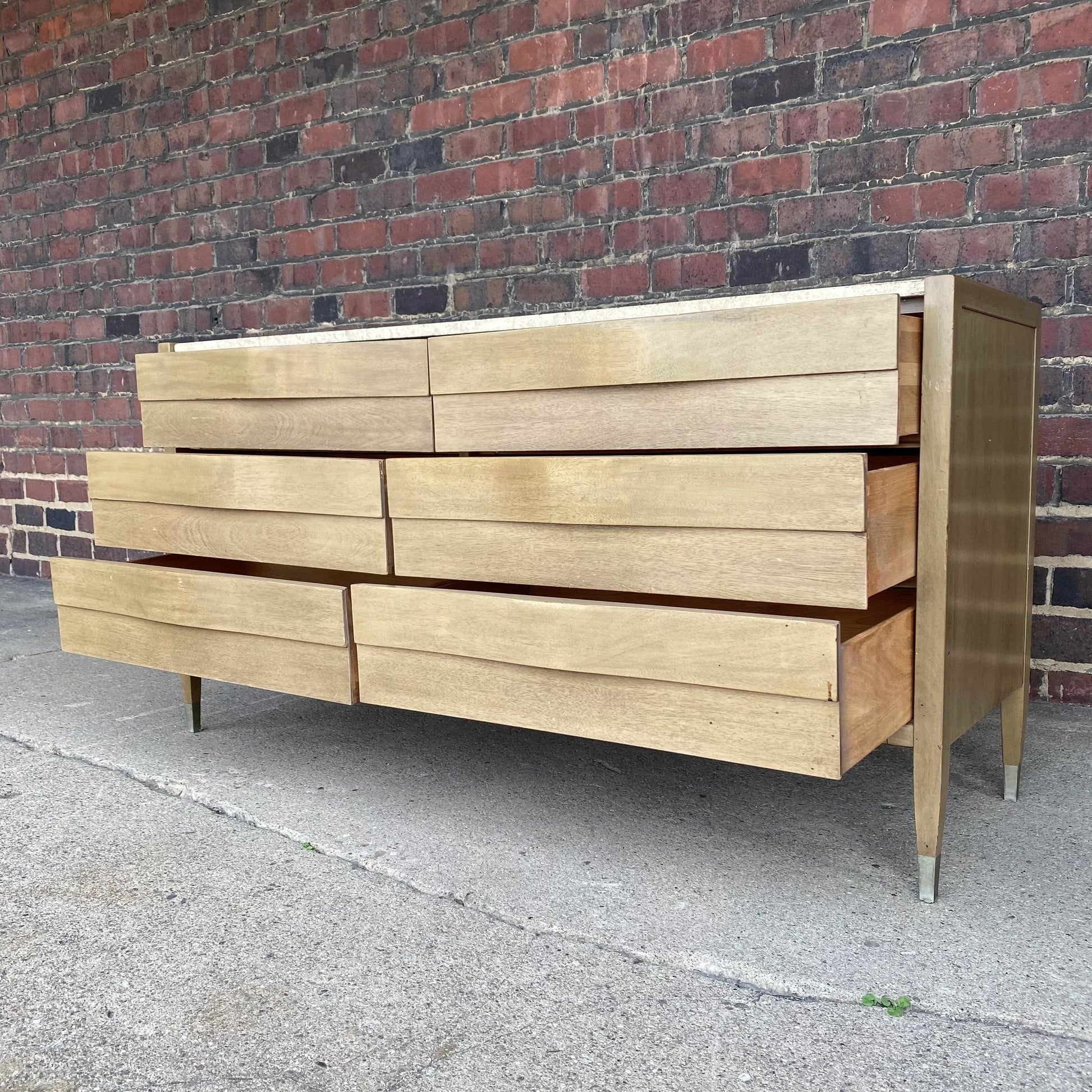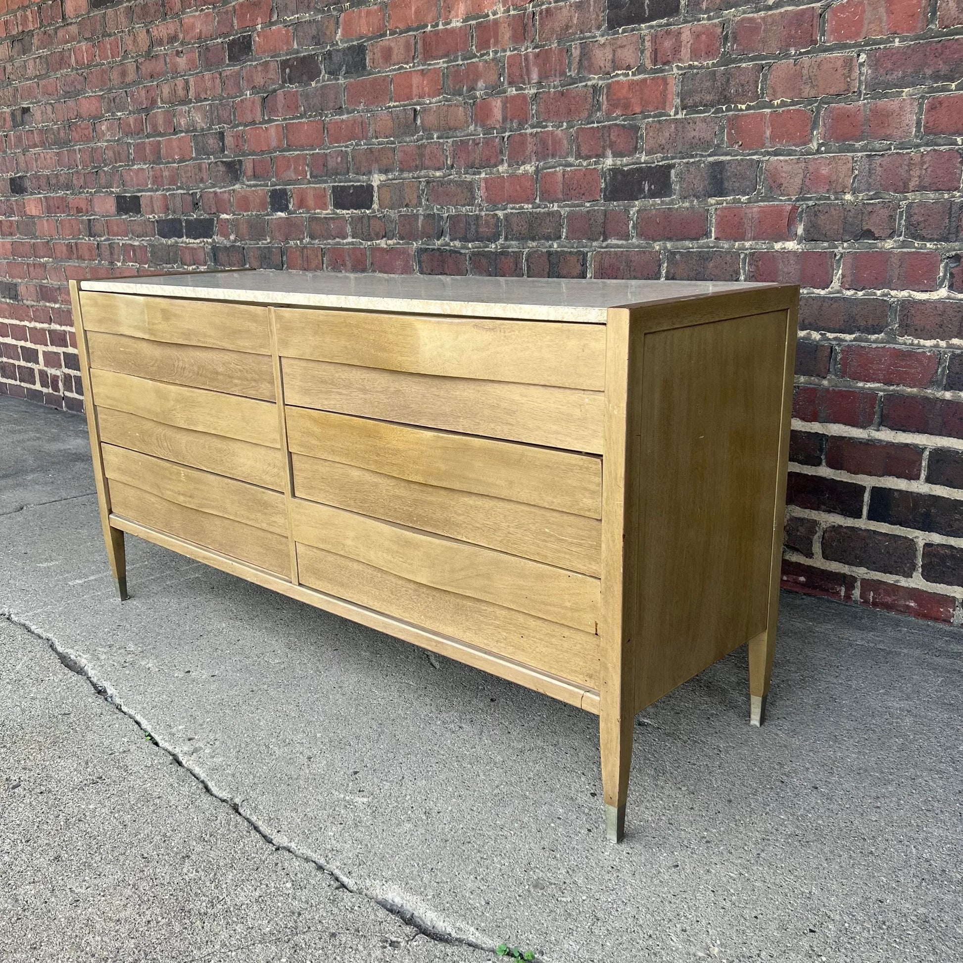 American of Martinsville long low dresser with waved front drawers and travertine top.