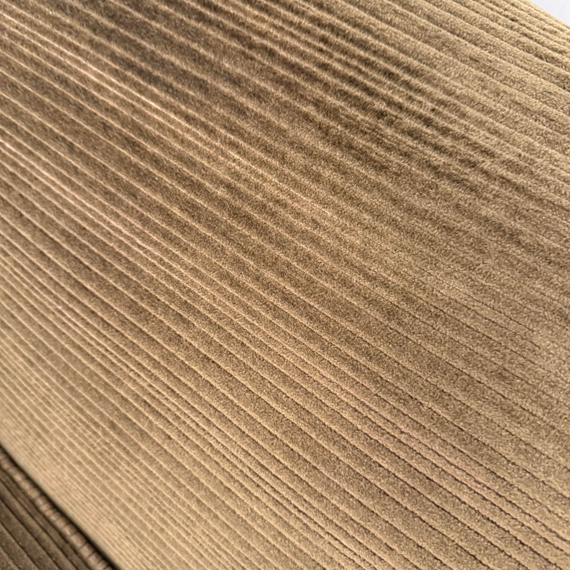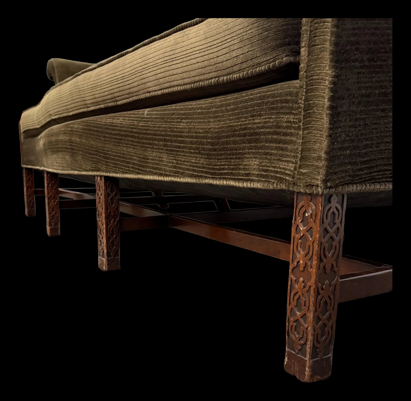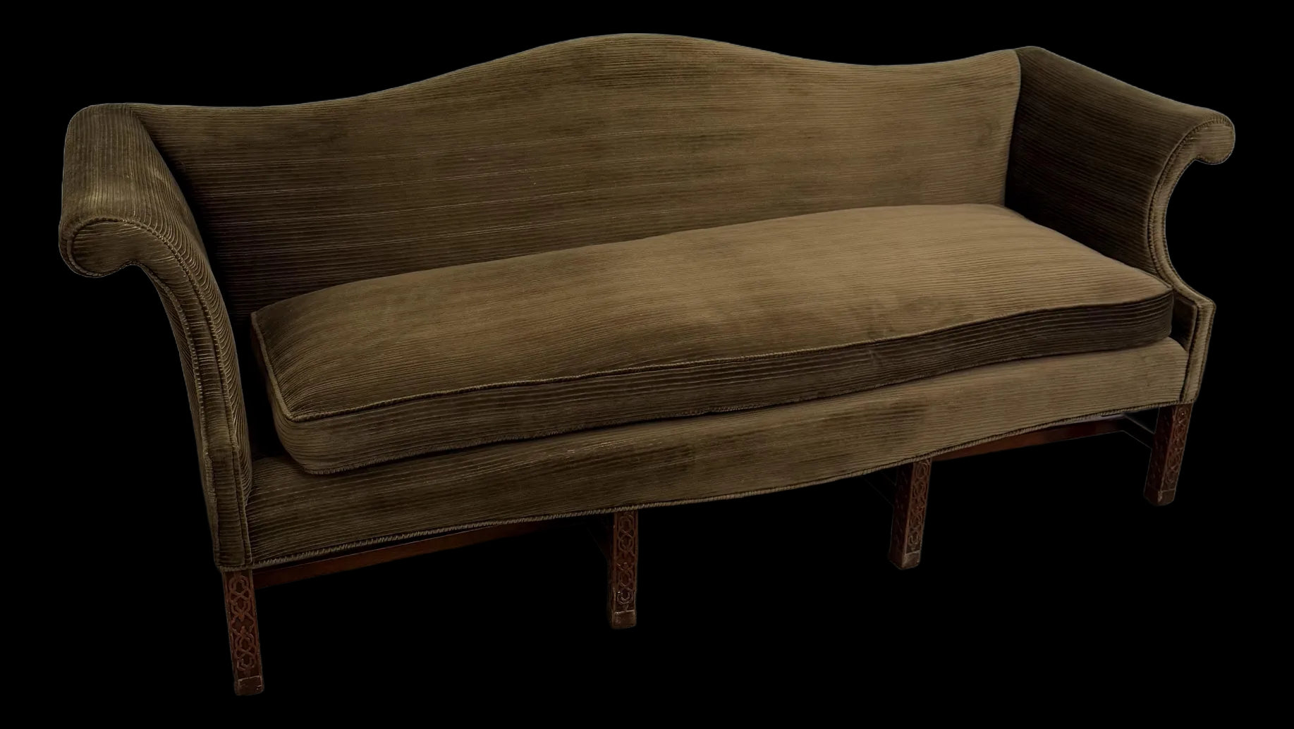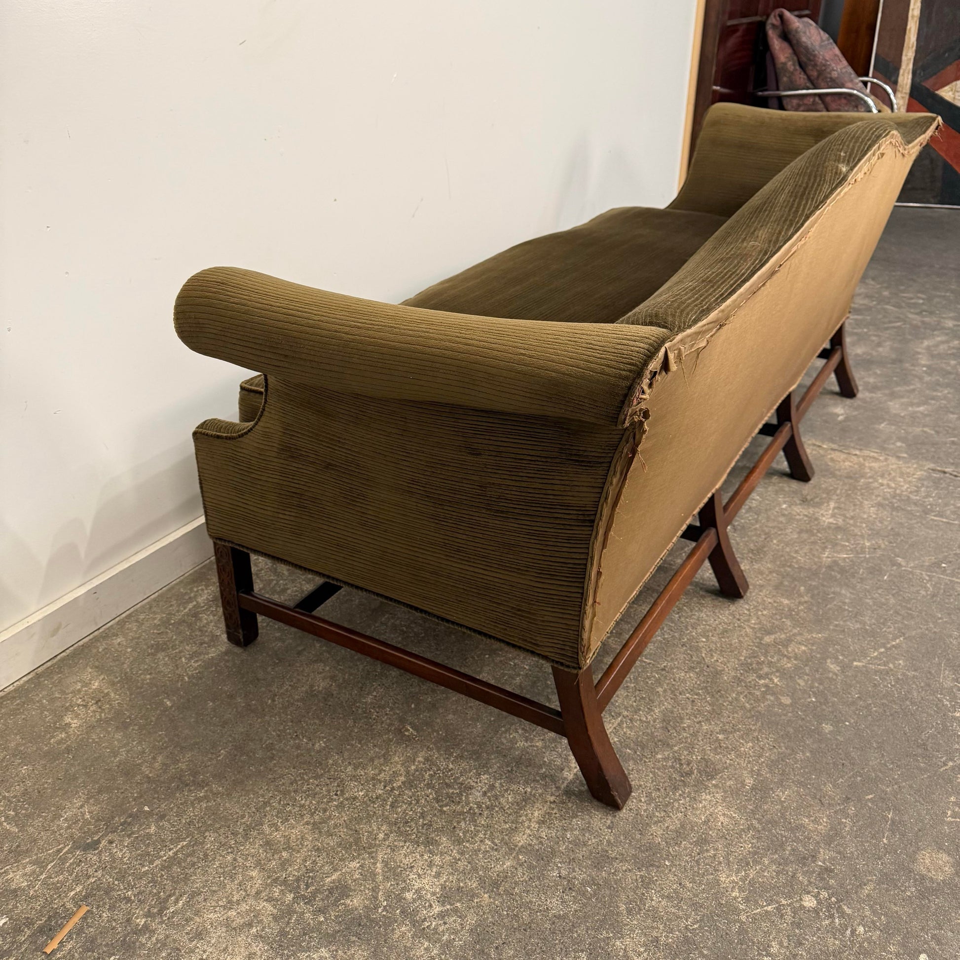 Antique English Chippendale Style Sofa. This sofa features carved wooden legs and a Georgia camelback style with brown corduroy upholstery. There is no makers mark on the sofa. The back is not upholstered. Please make note.