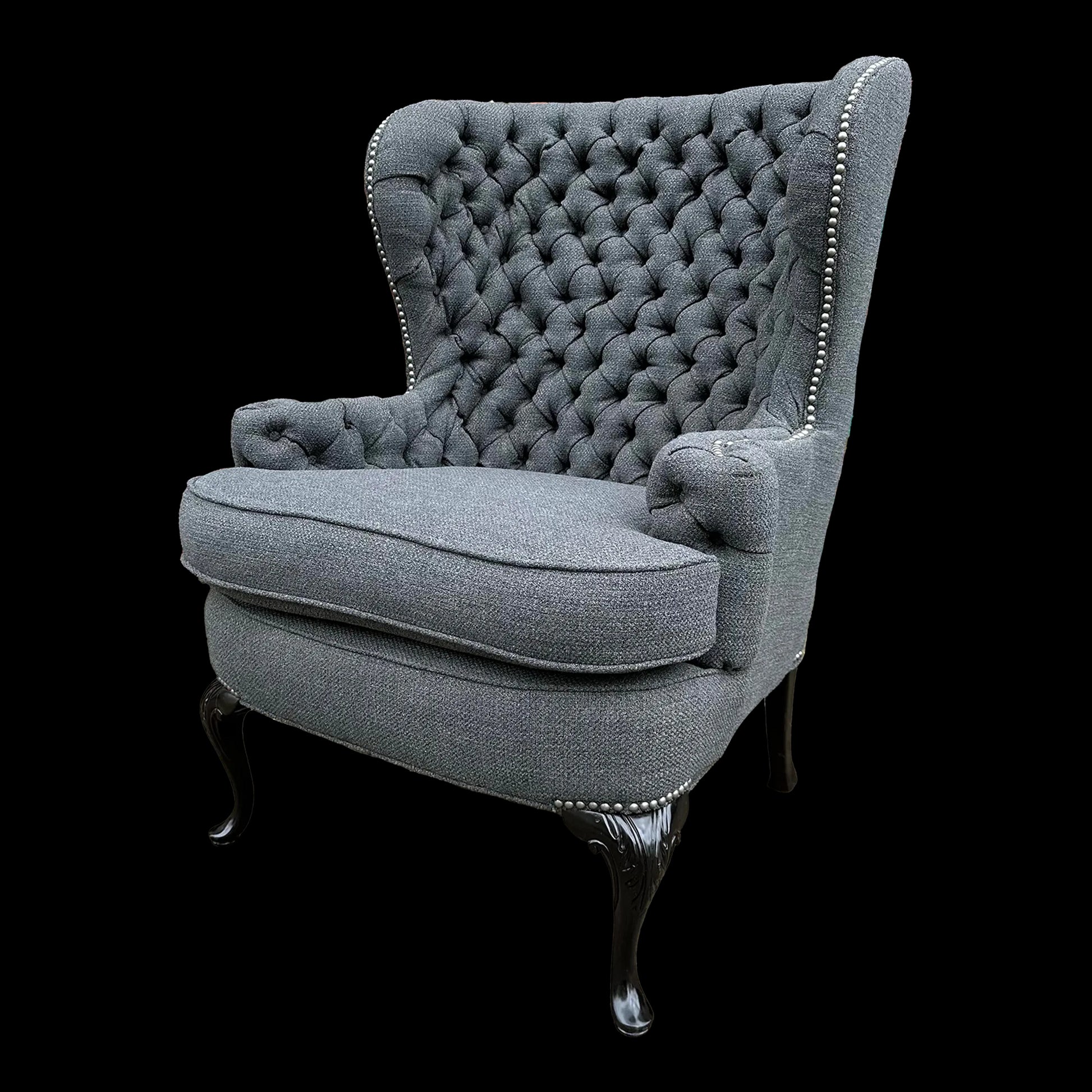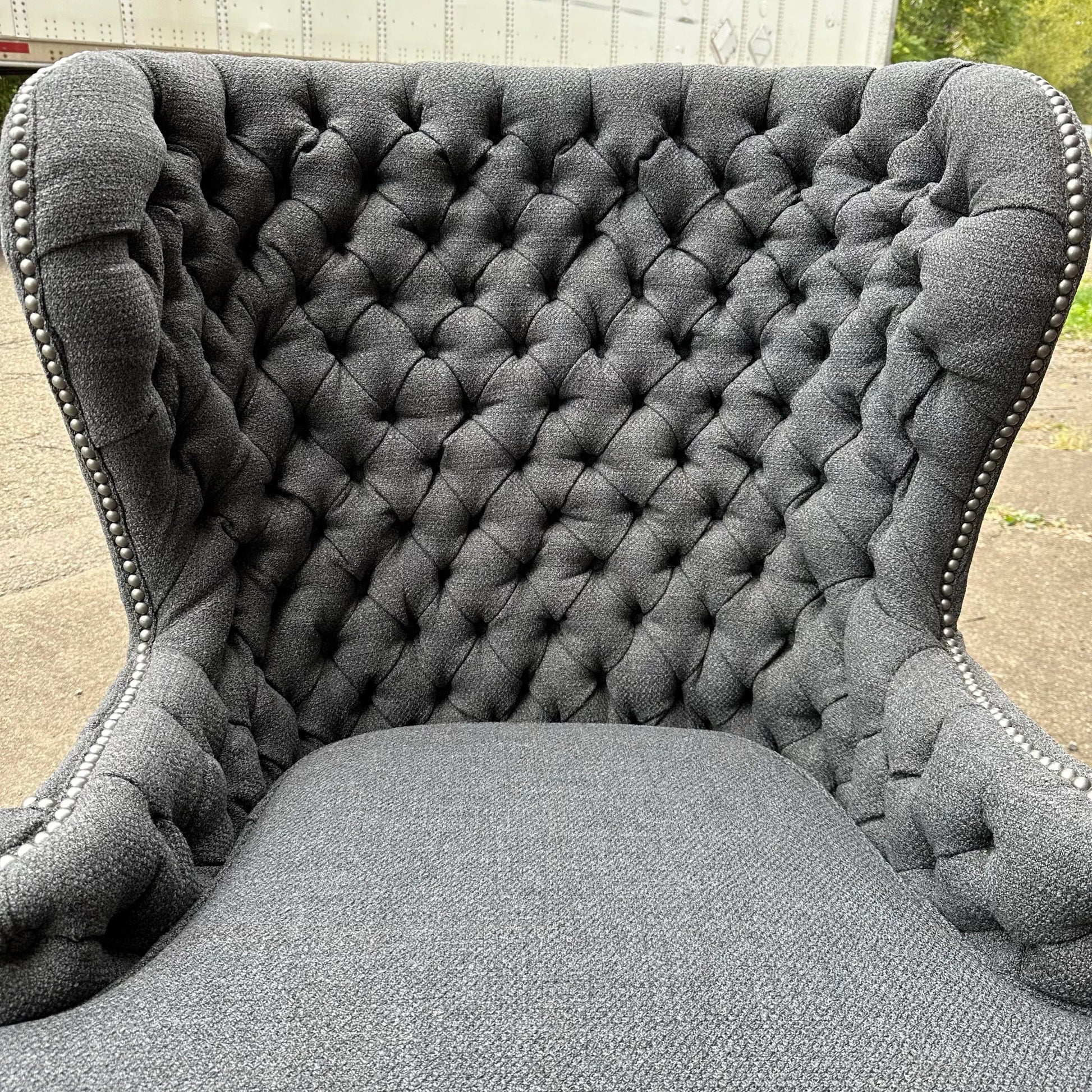 Antique Tufted Tall Winged Back Lounge Chair Reupholstered Nailhead Trim