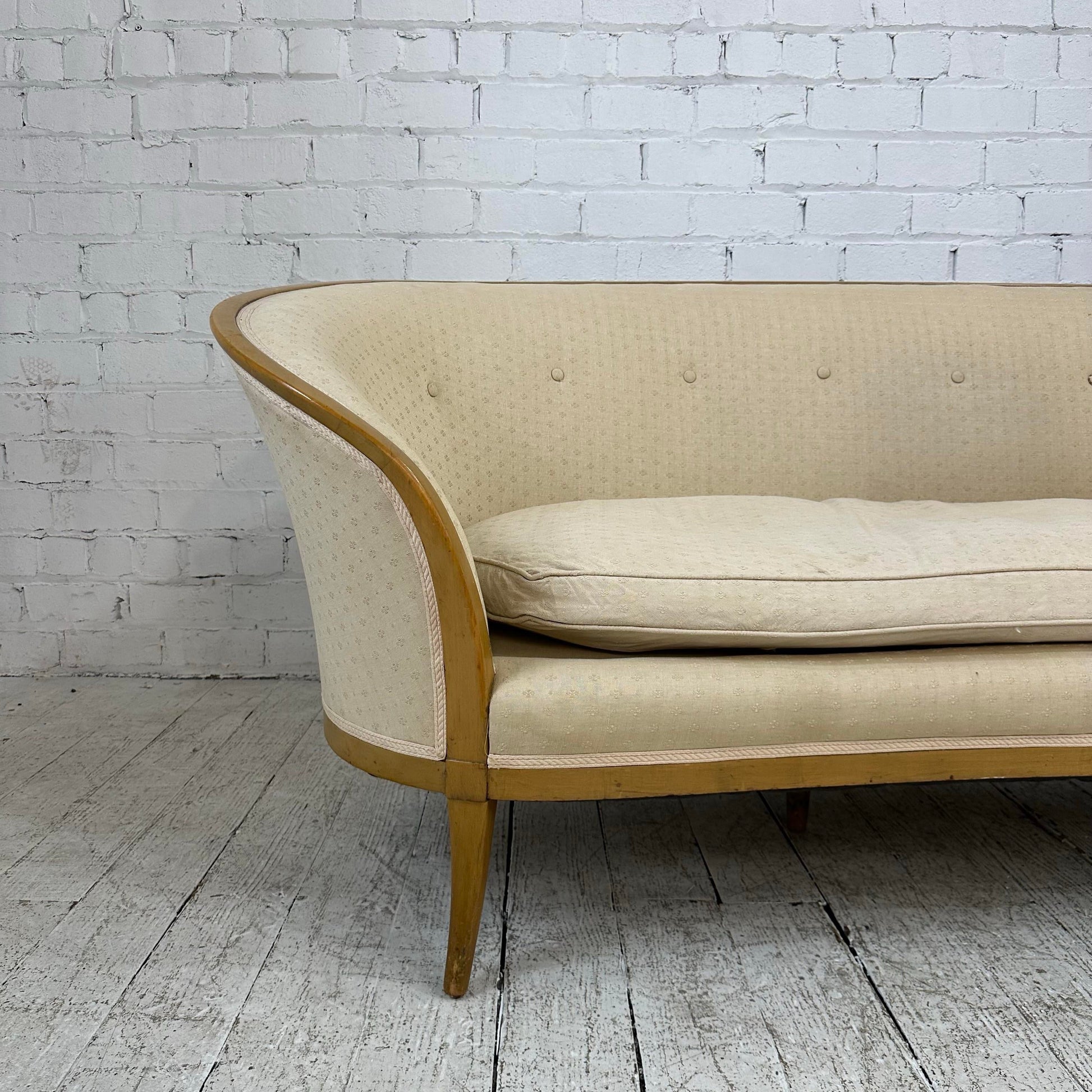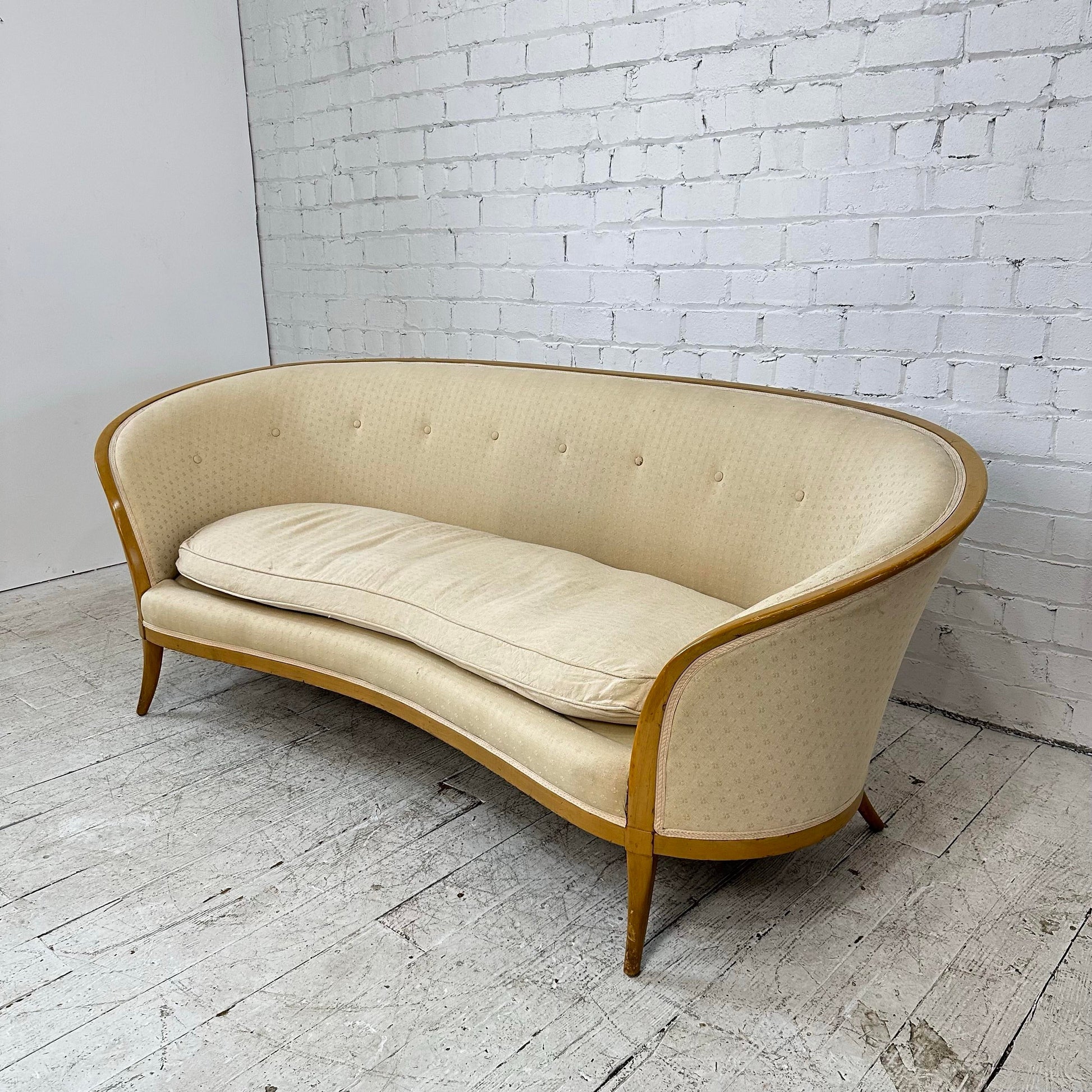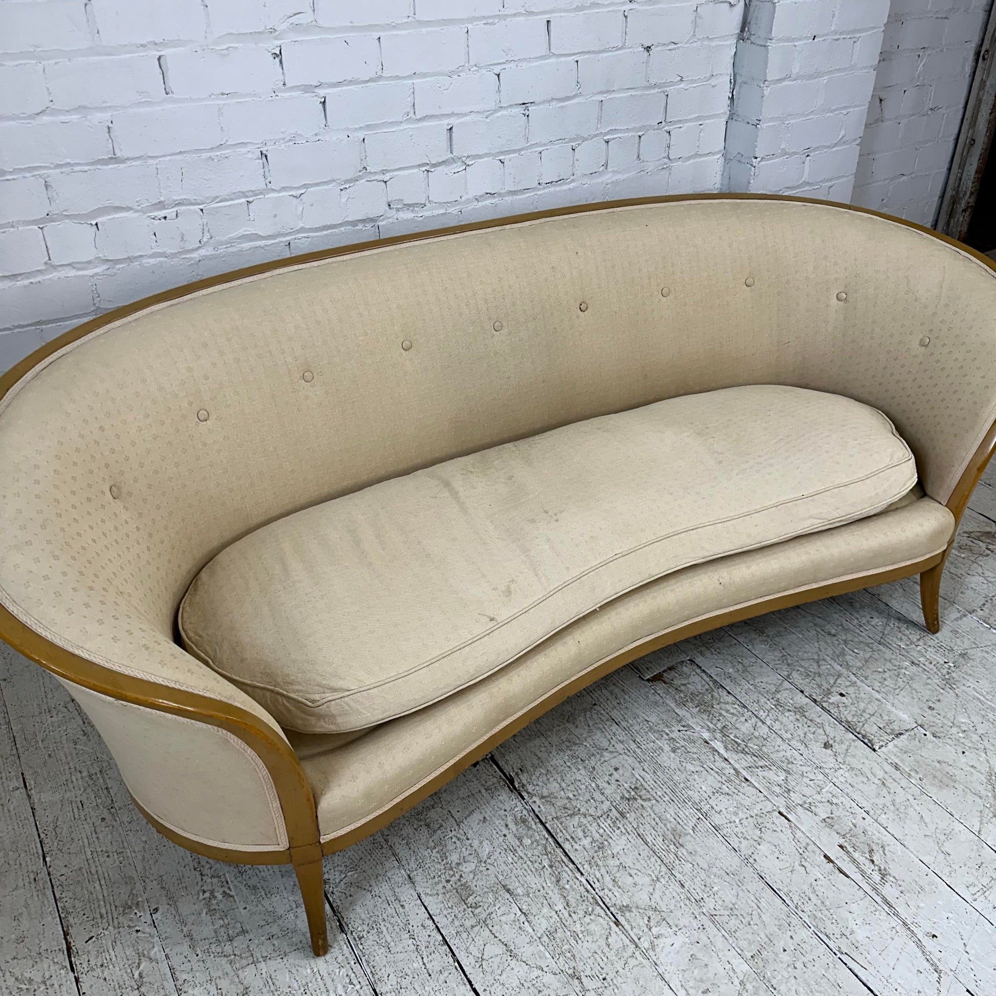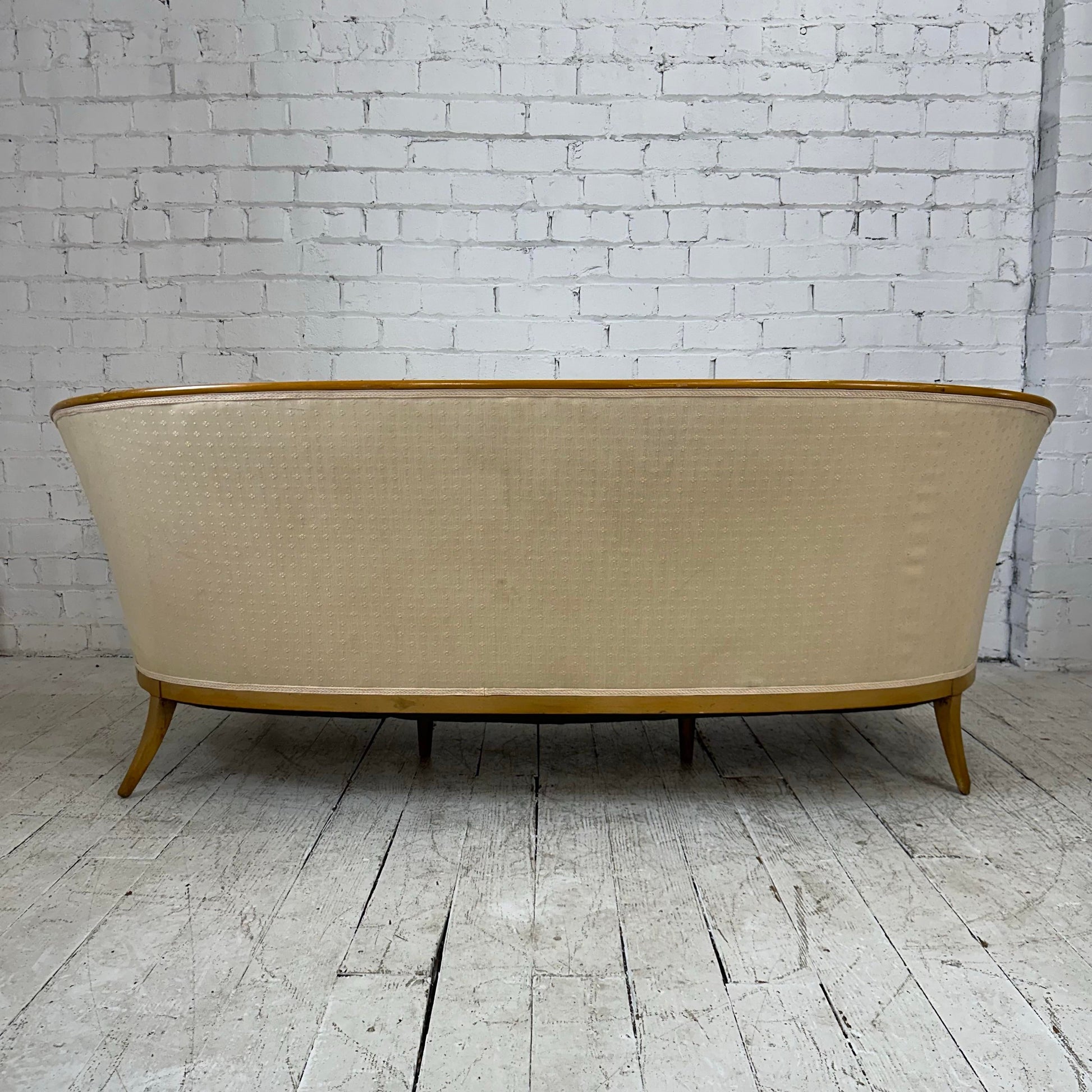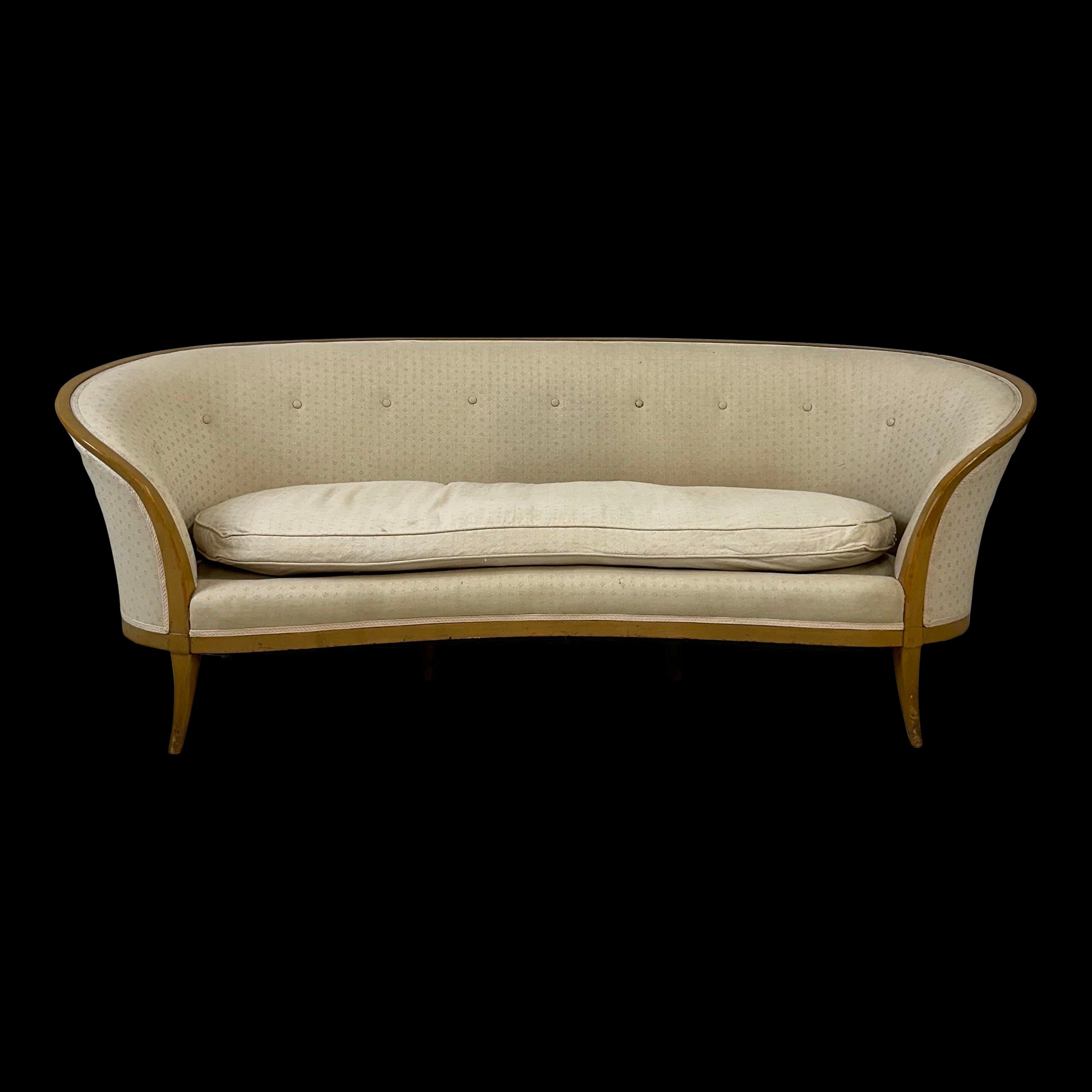 This sofa features a Beautiful tall curved back with curved legs and in ivory fabric. There no makers mark on the sofa.