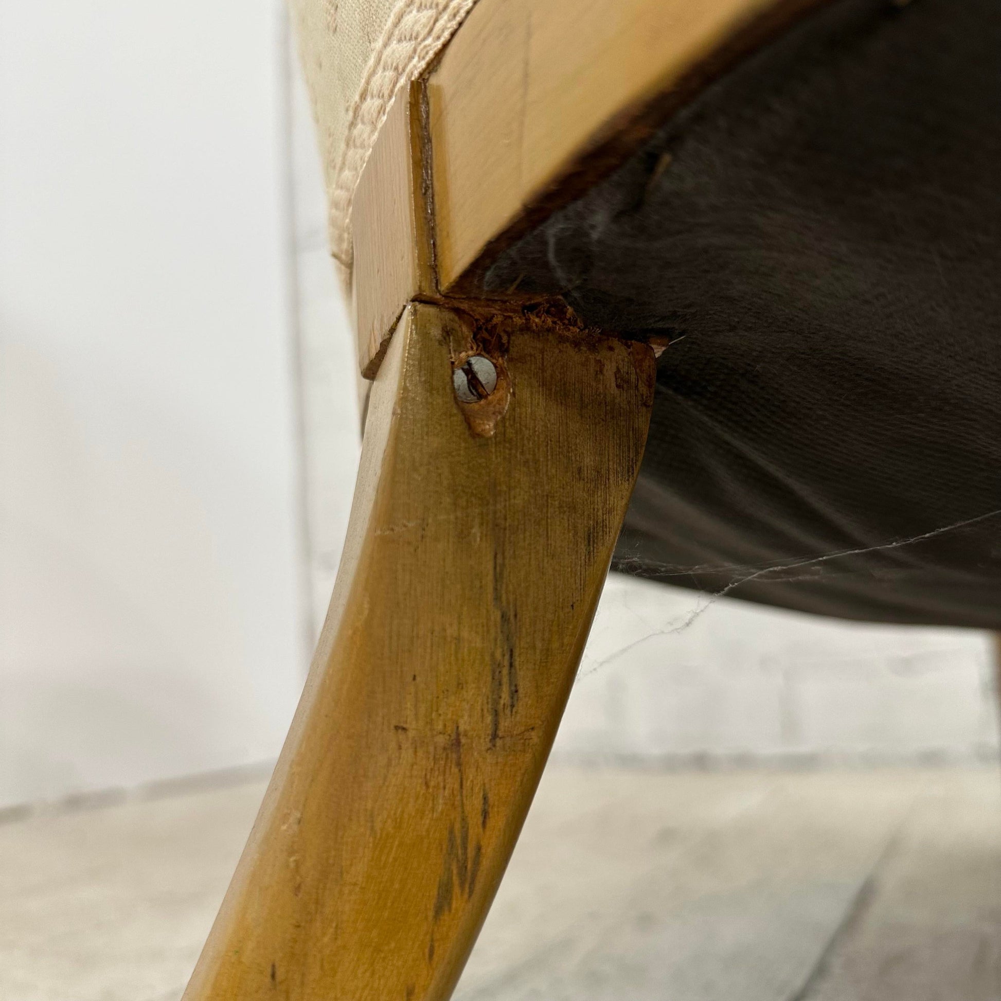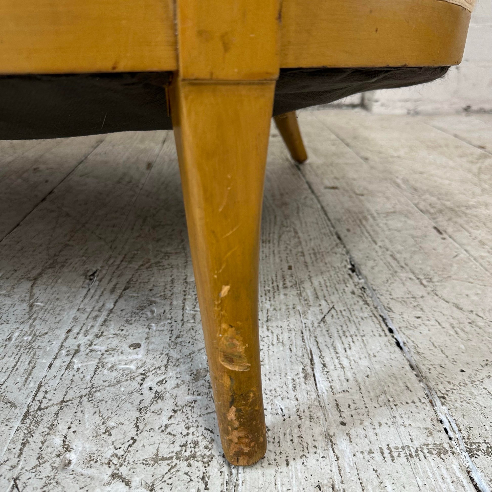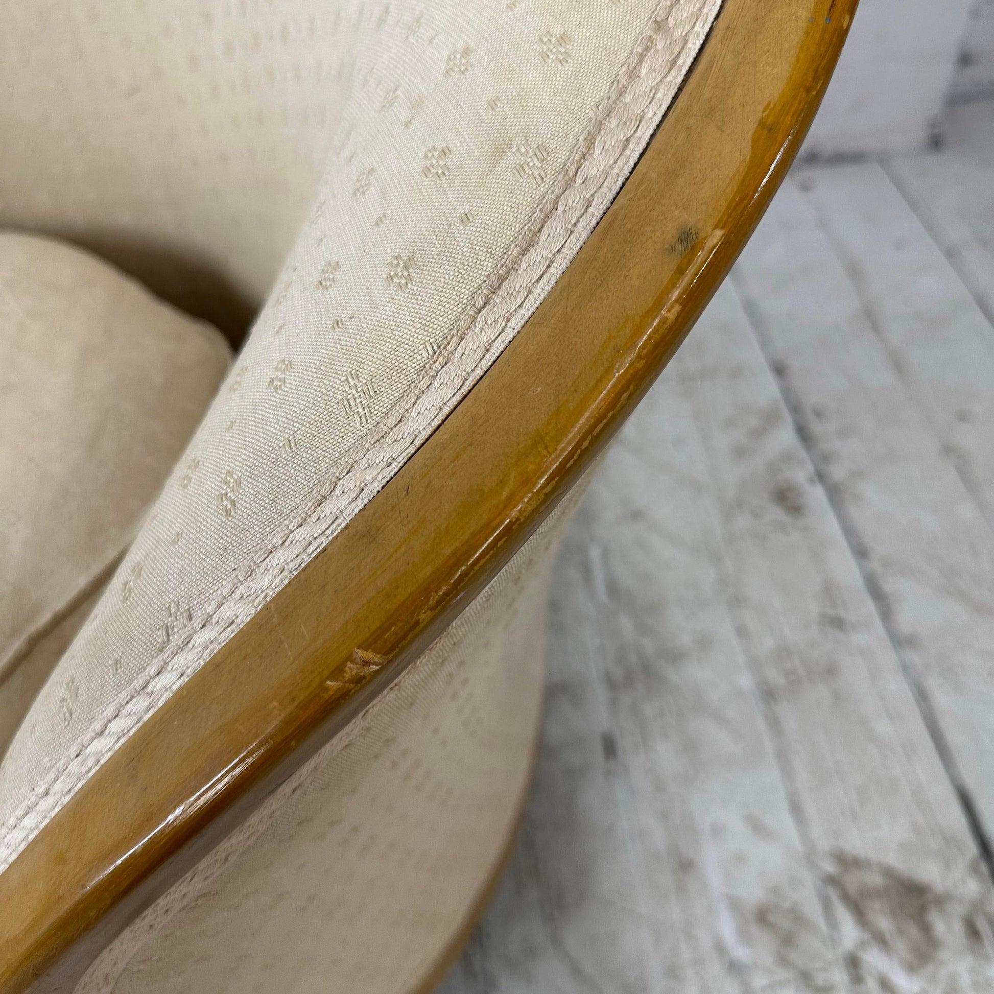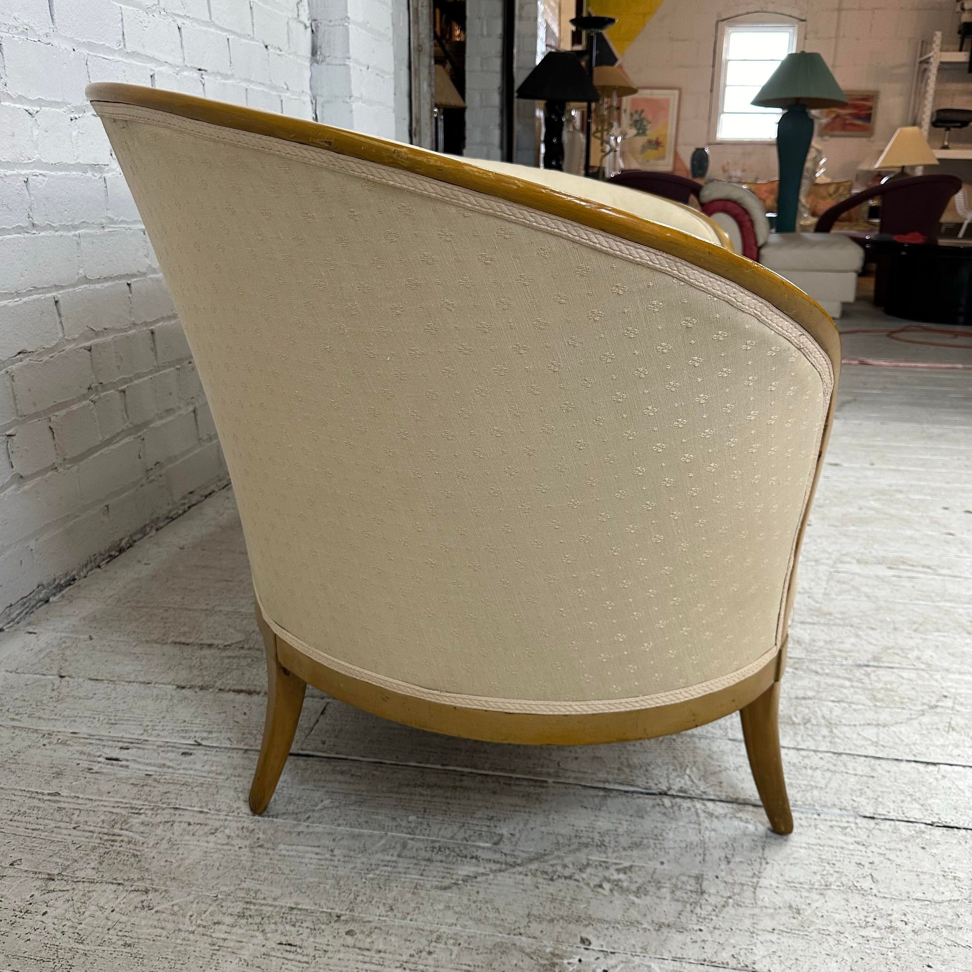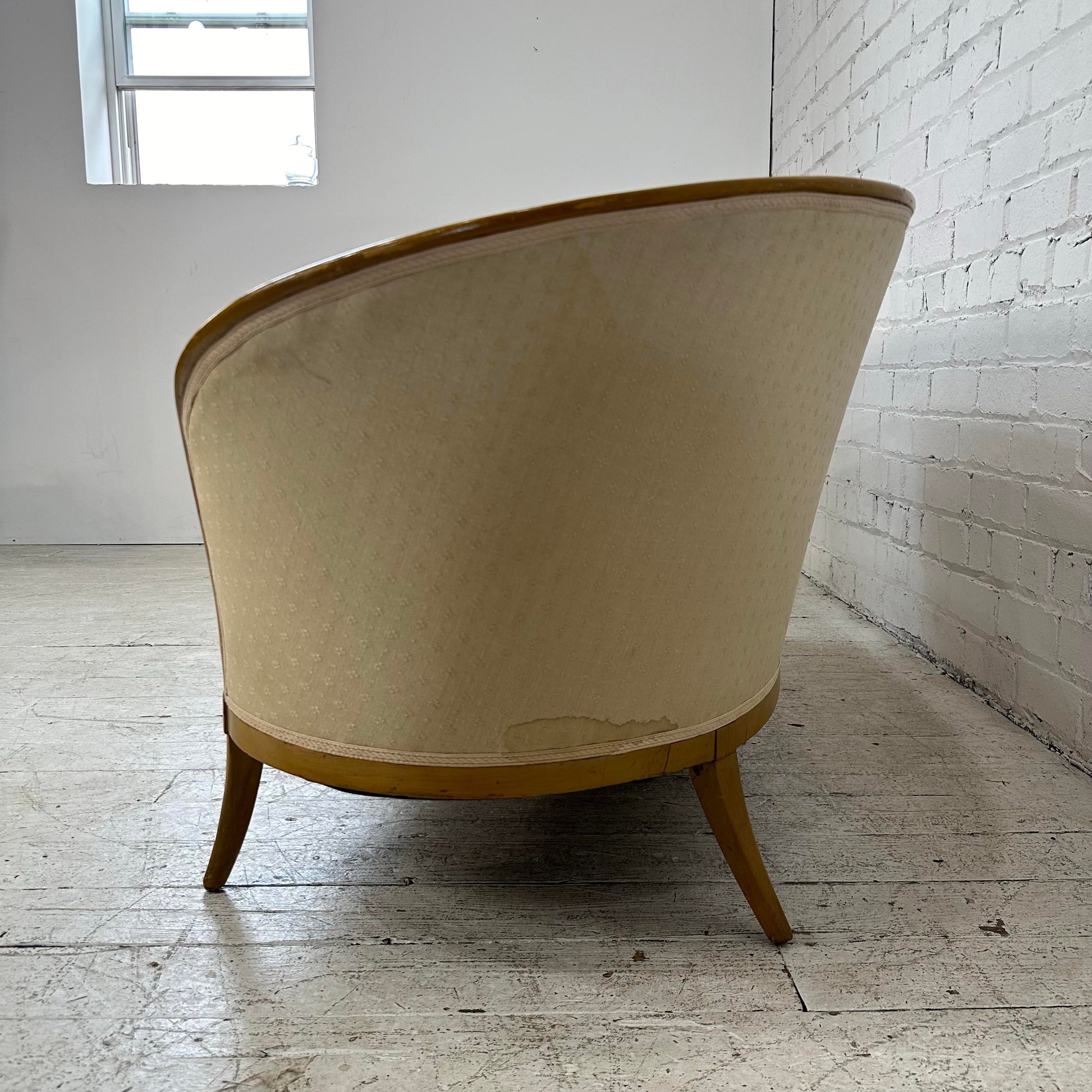 This sofa features a Beautiful tall curved back with curved legs and in ivory fabric. There no makers mark on the sofa.