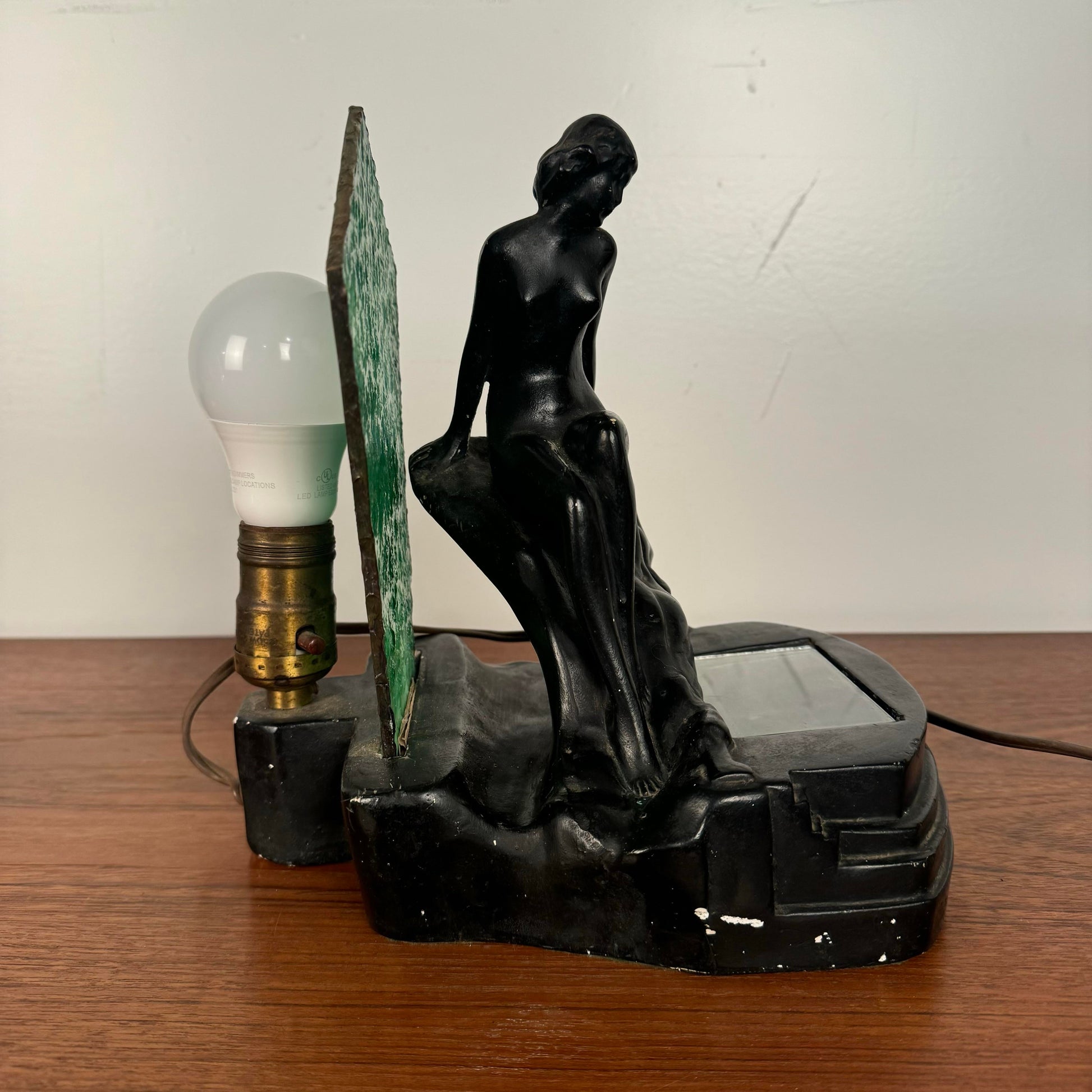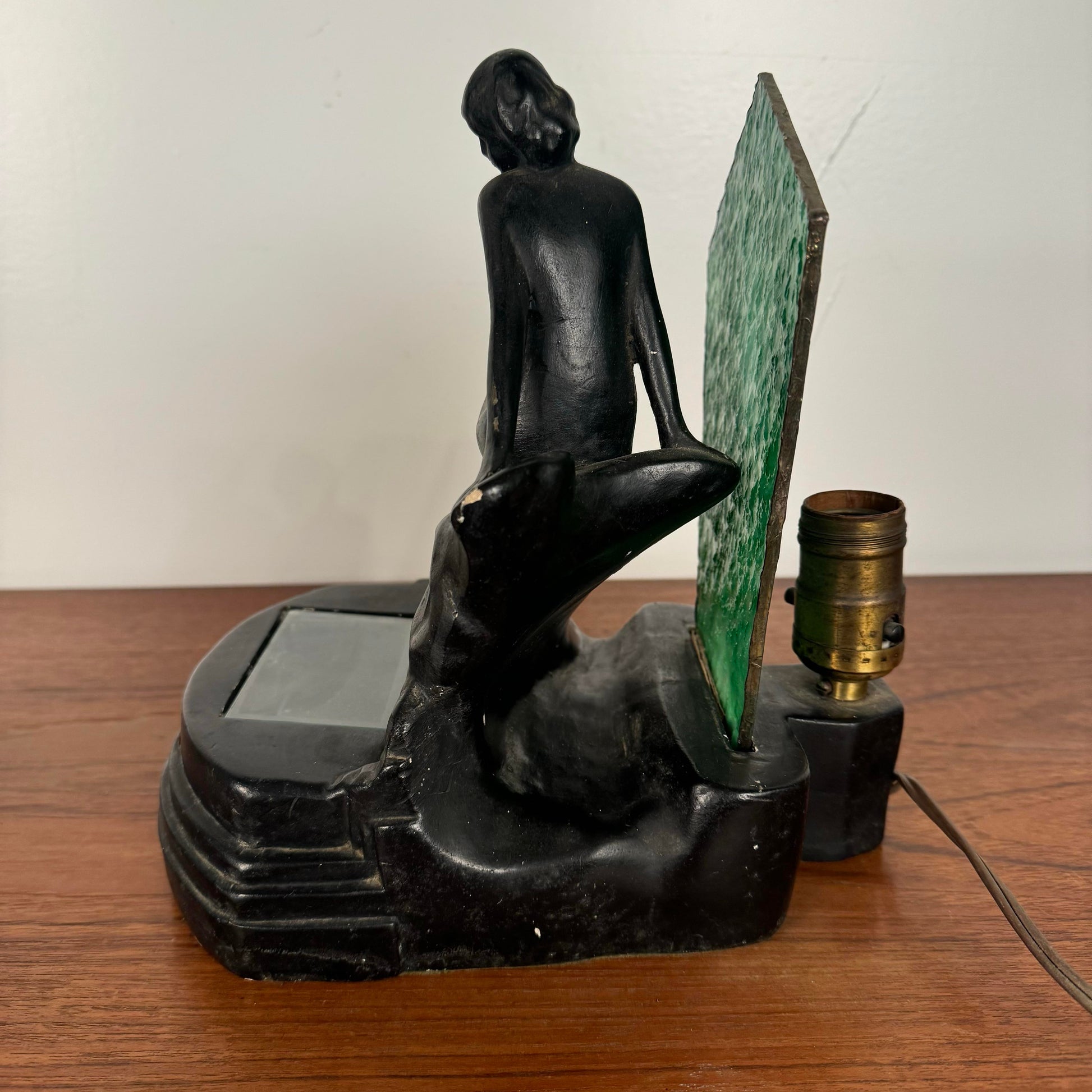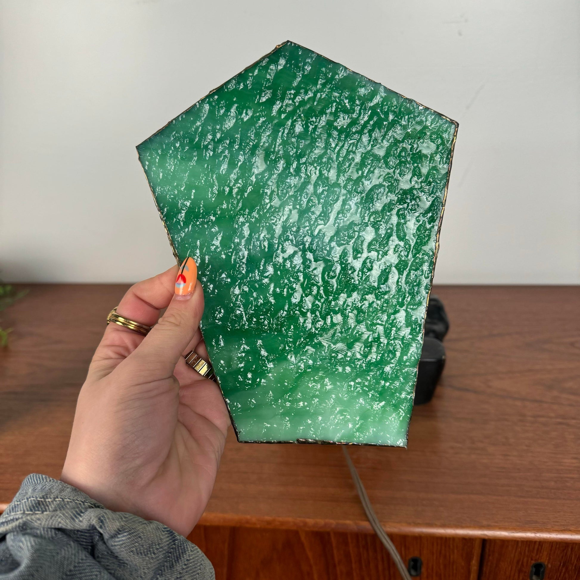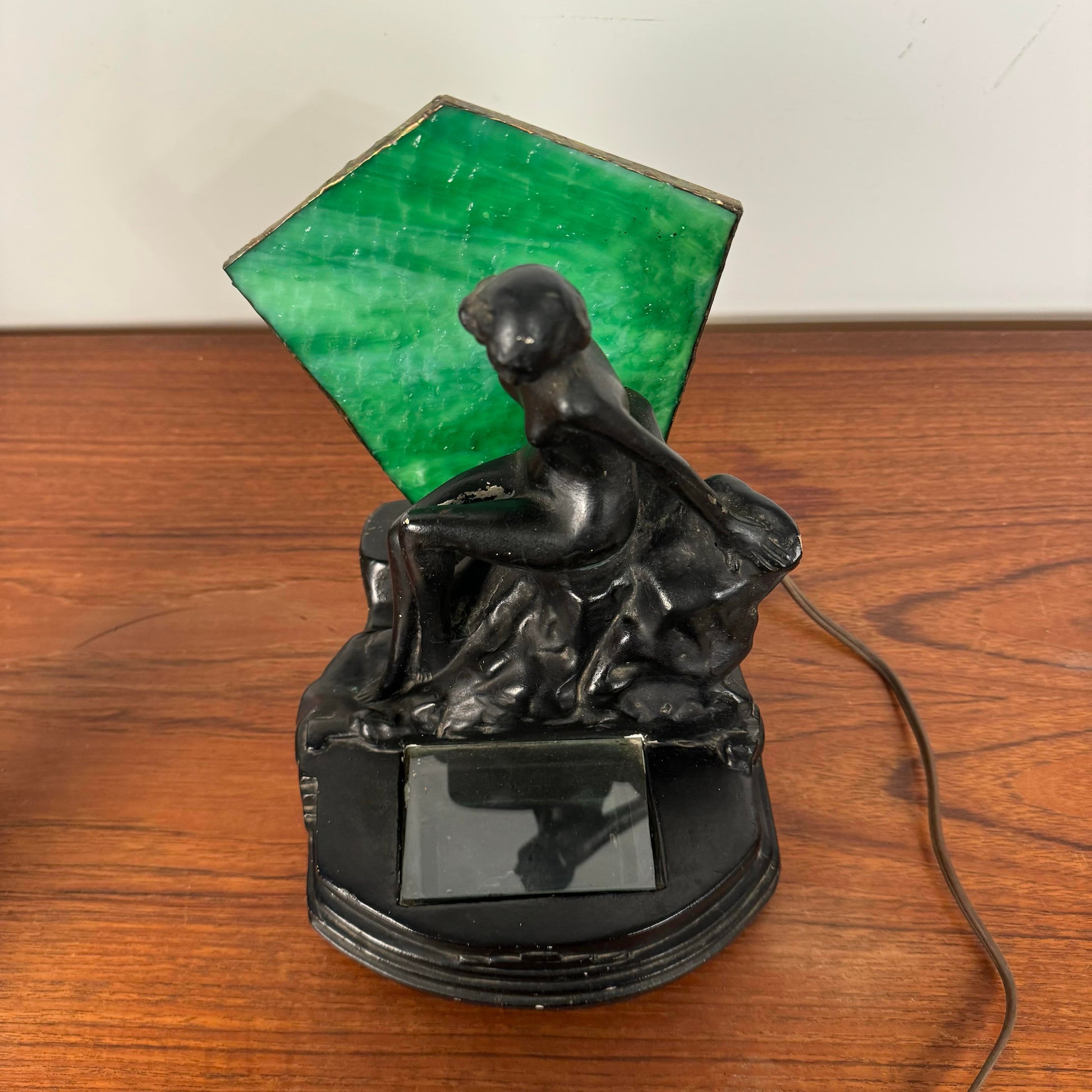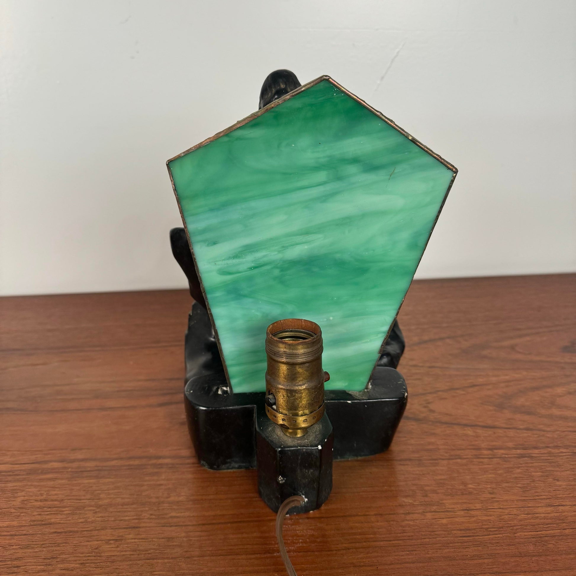 Art deco style lamp with imagery of a woman sitting in front of a leaded green stained glass pentagon.