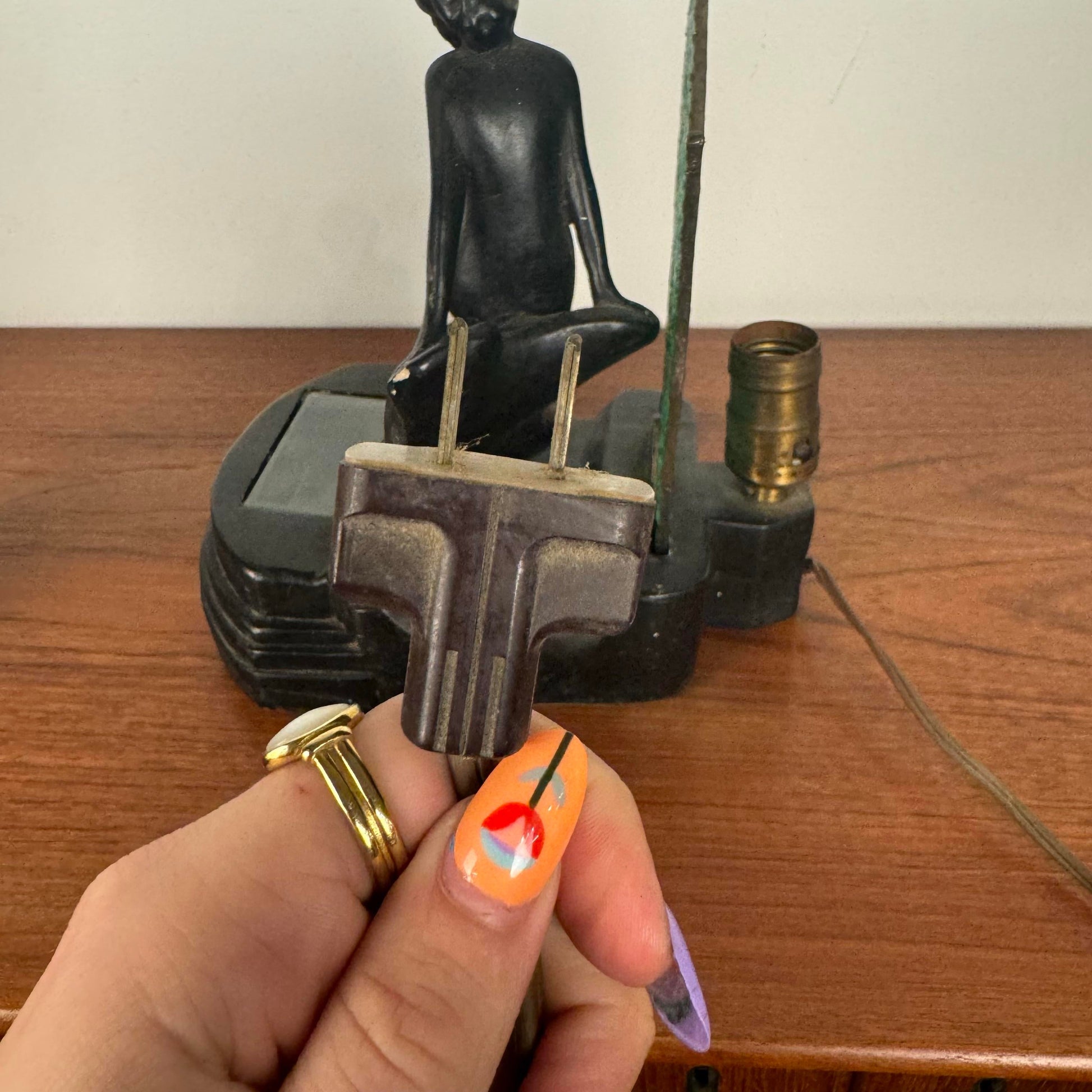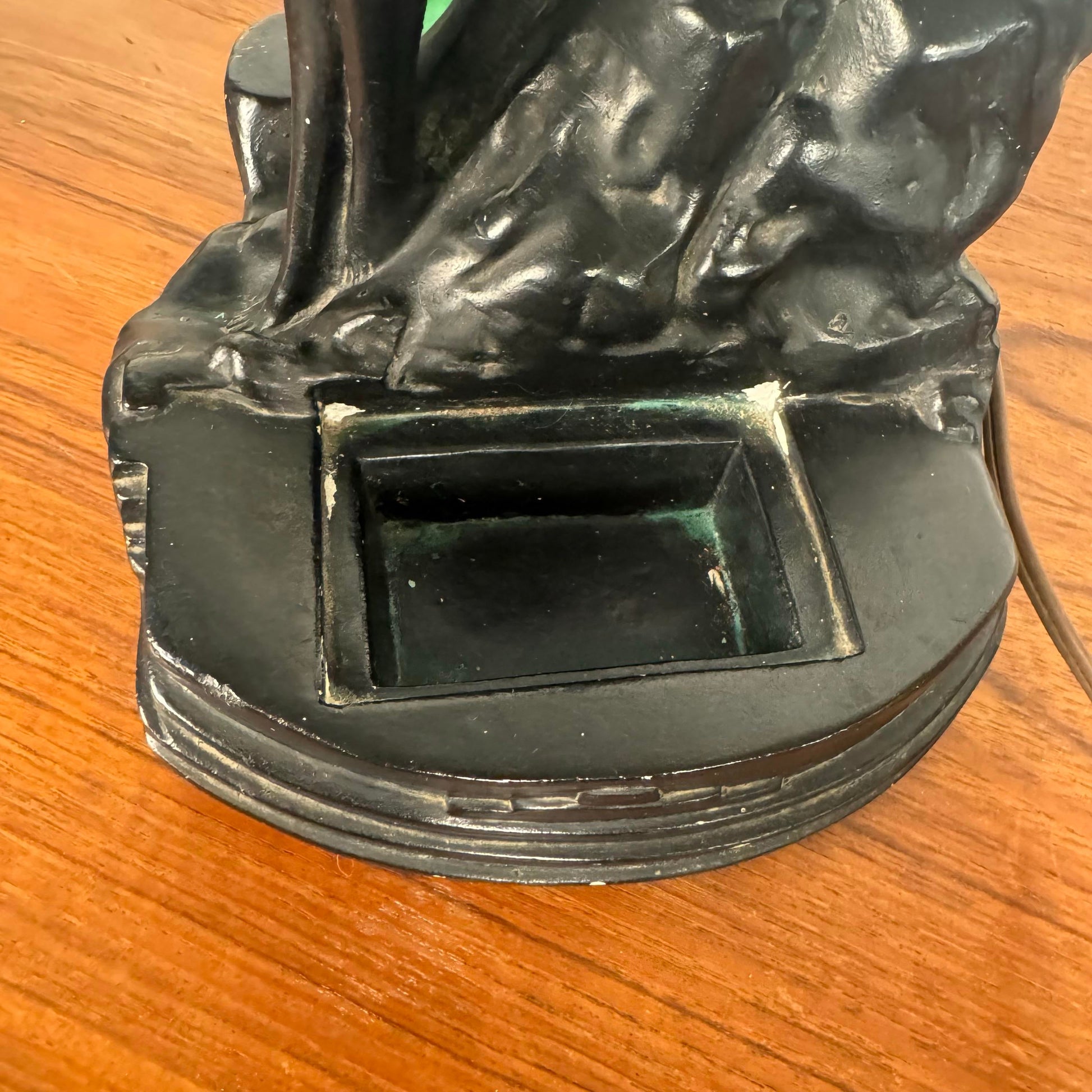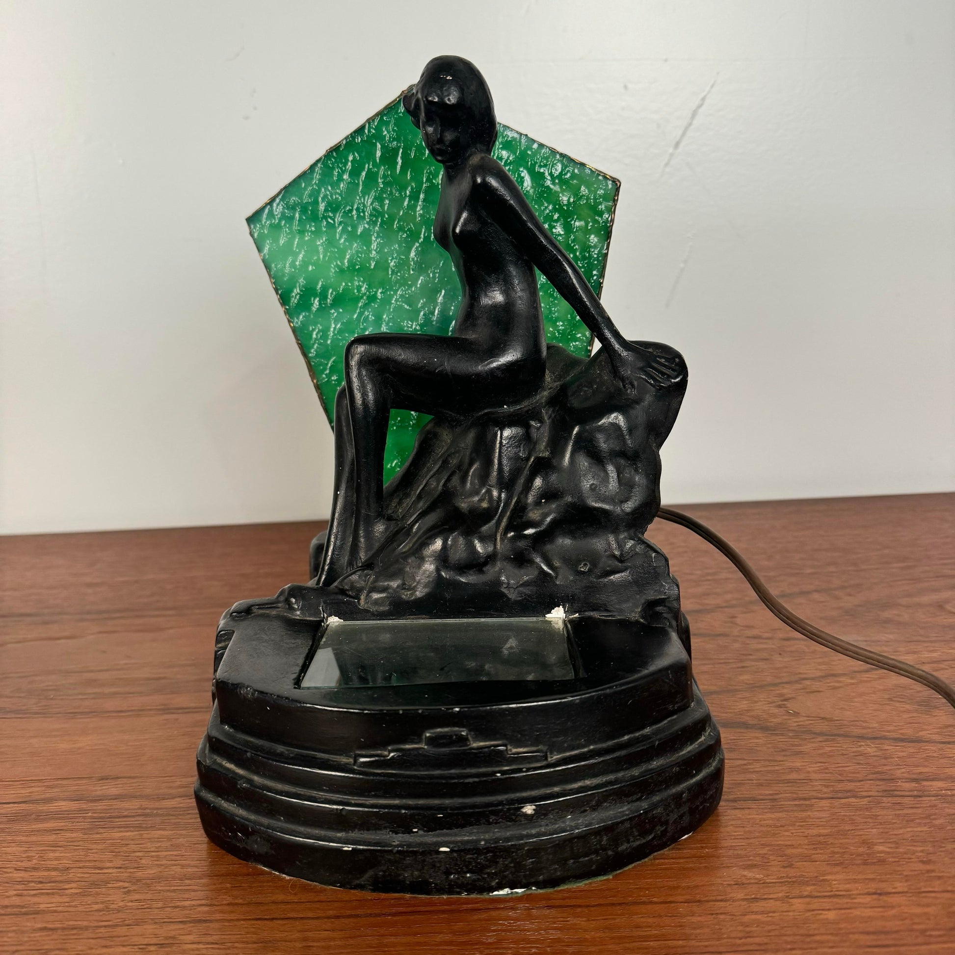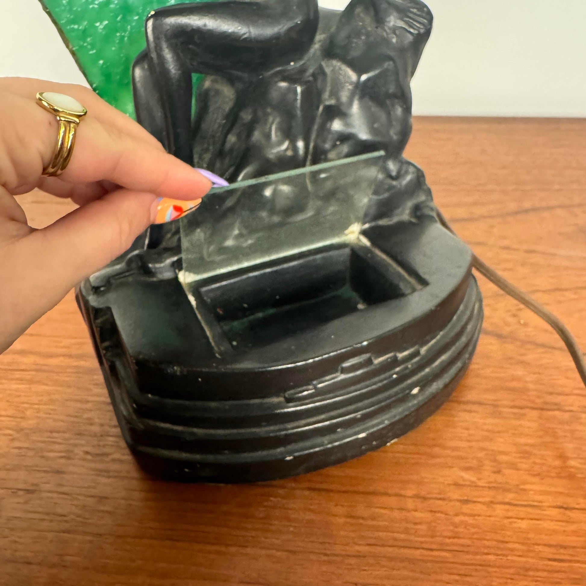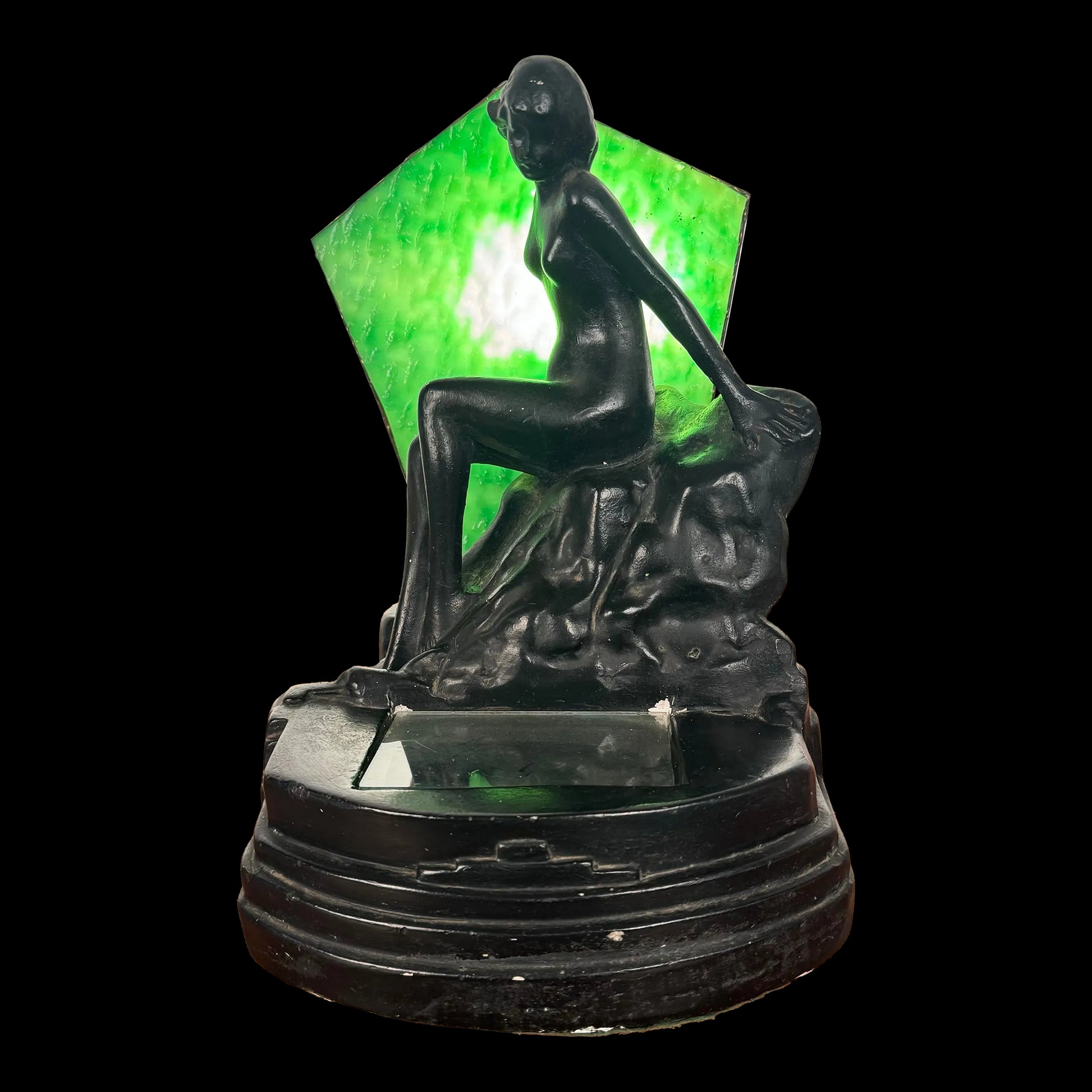 Art deco style lamp with imagery of a woman sitting in front of a leaded green stained glass pentagon.