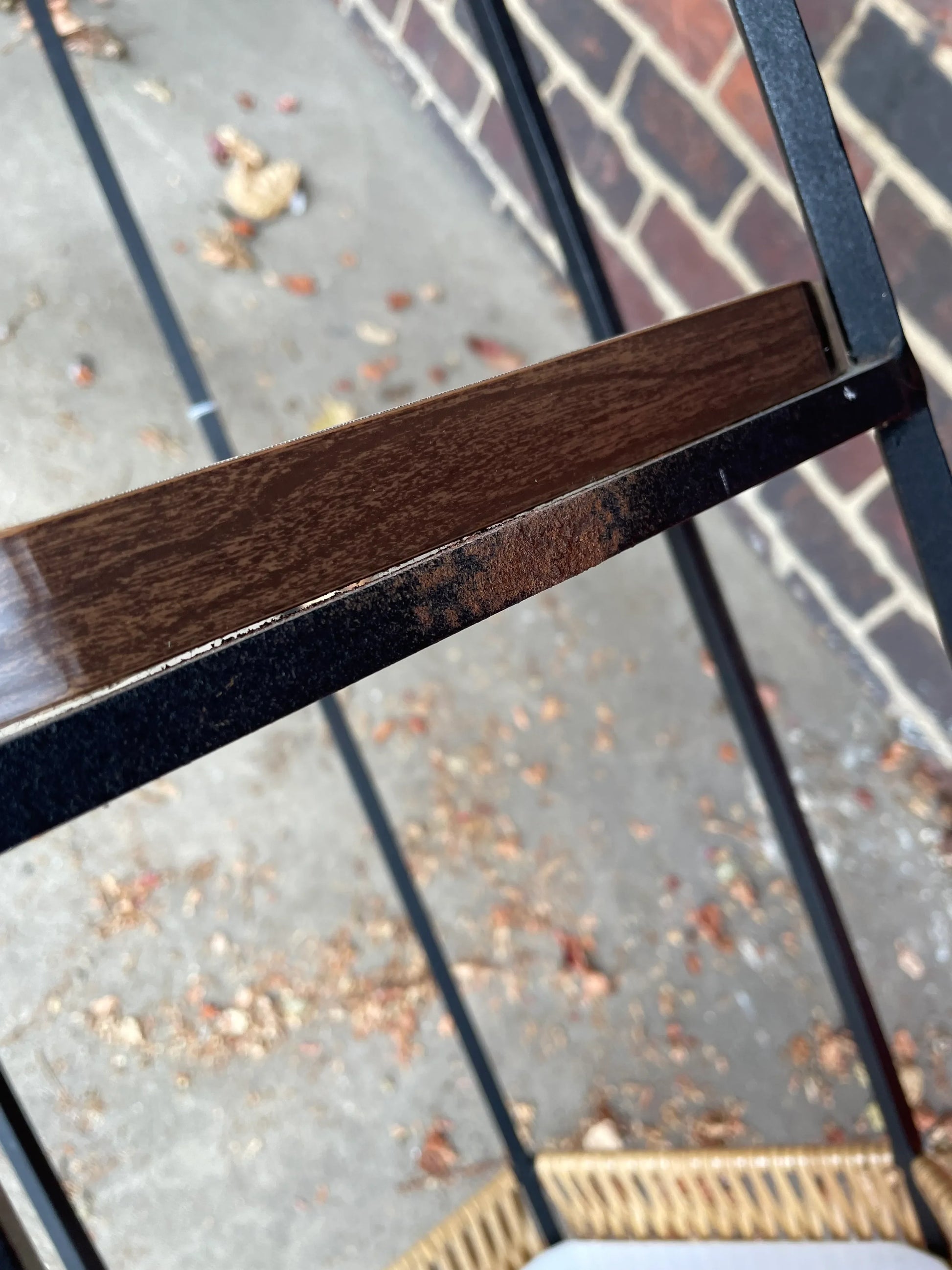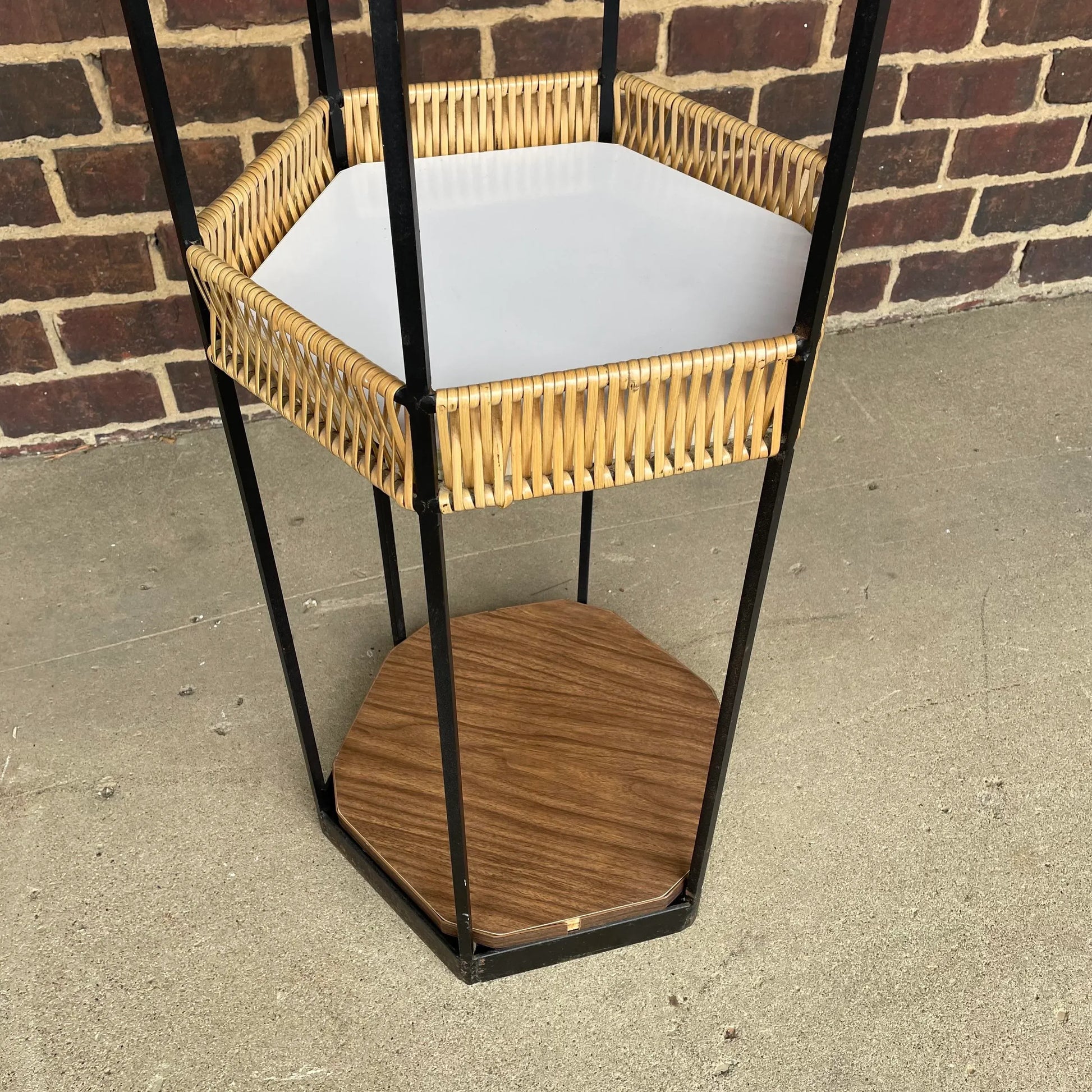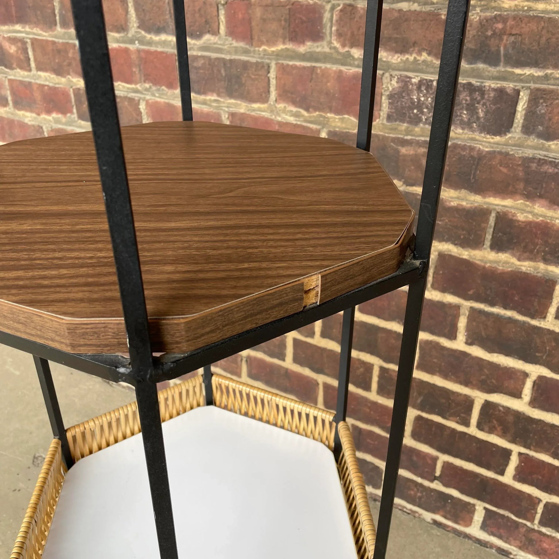 This rare cylindrical shelf unit was designed by Arthur Umanoff for Shaver Howard. This piece has accents of wicker, wood veneer, and steel.