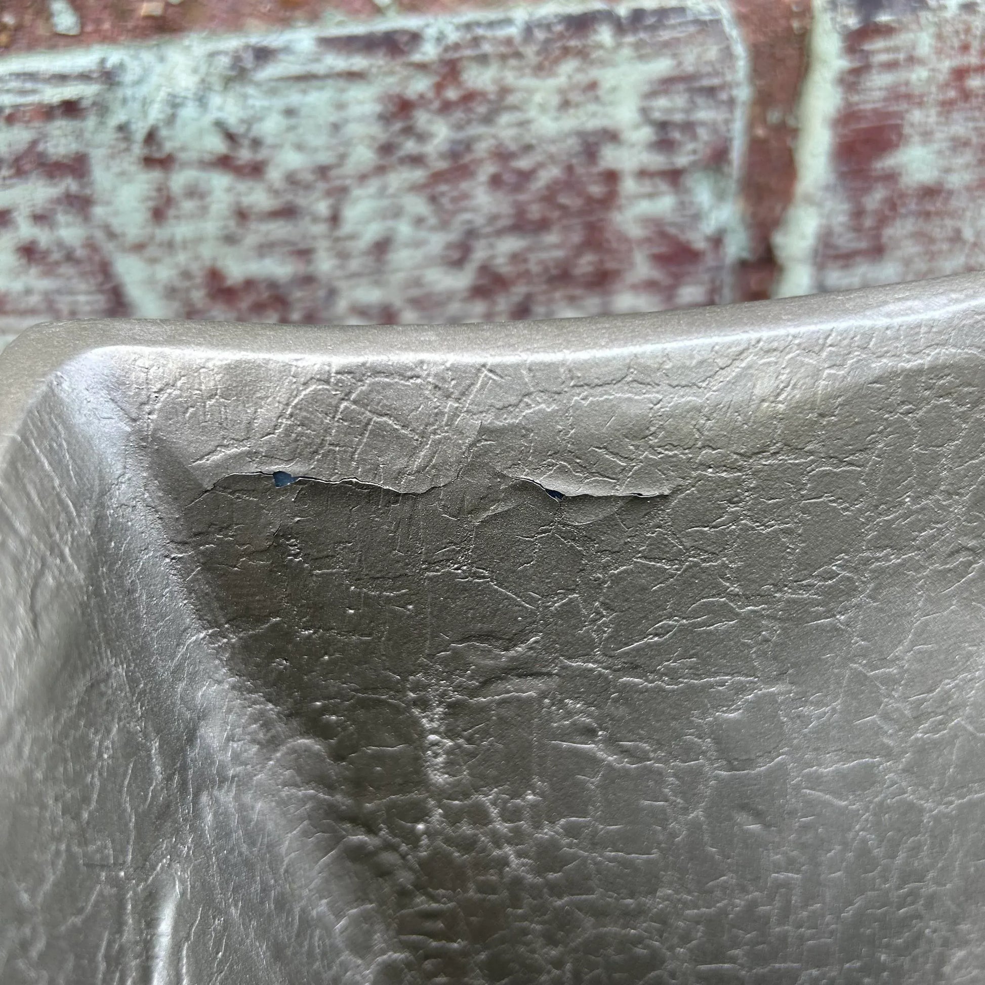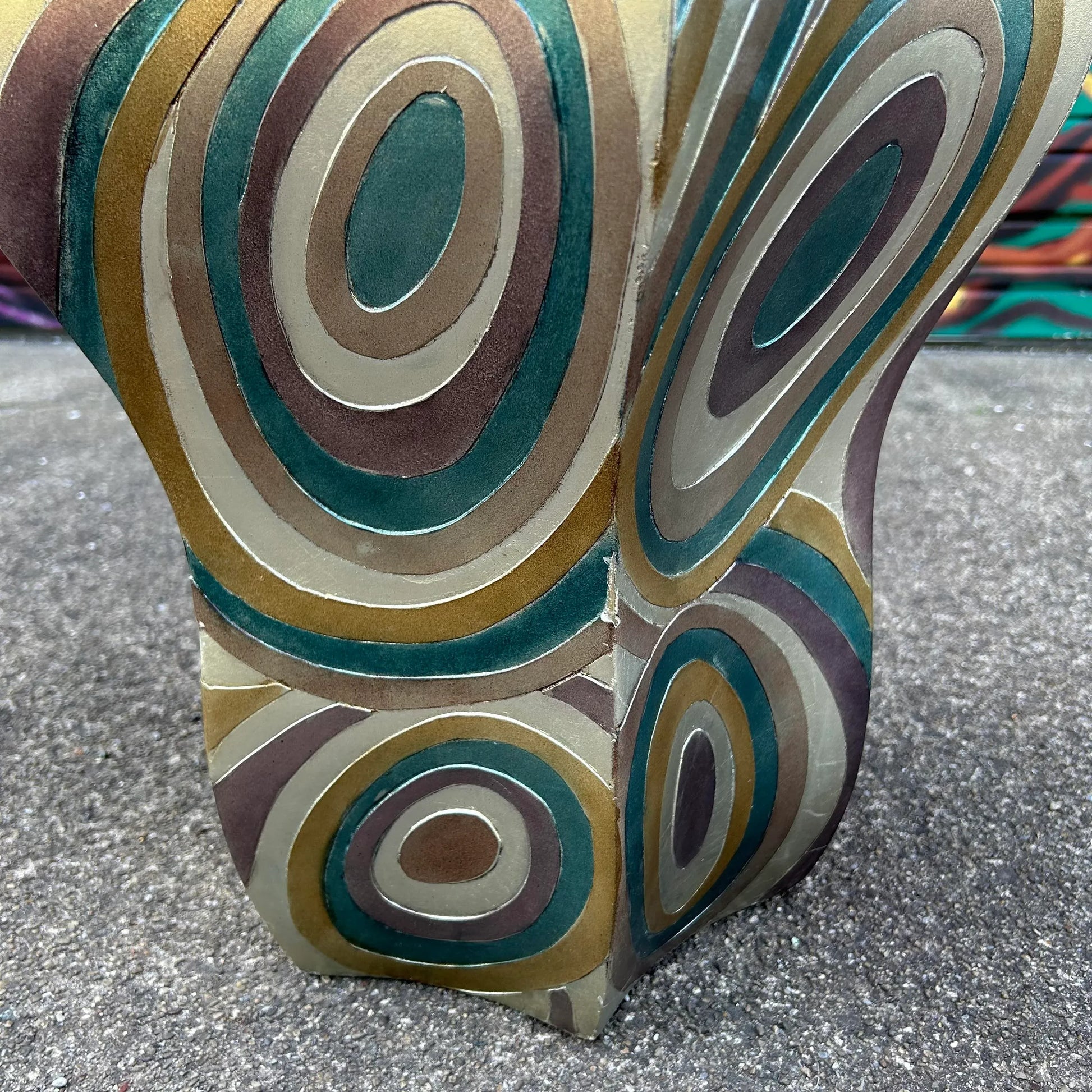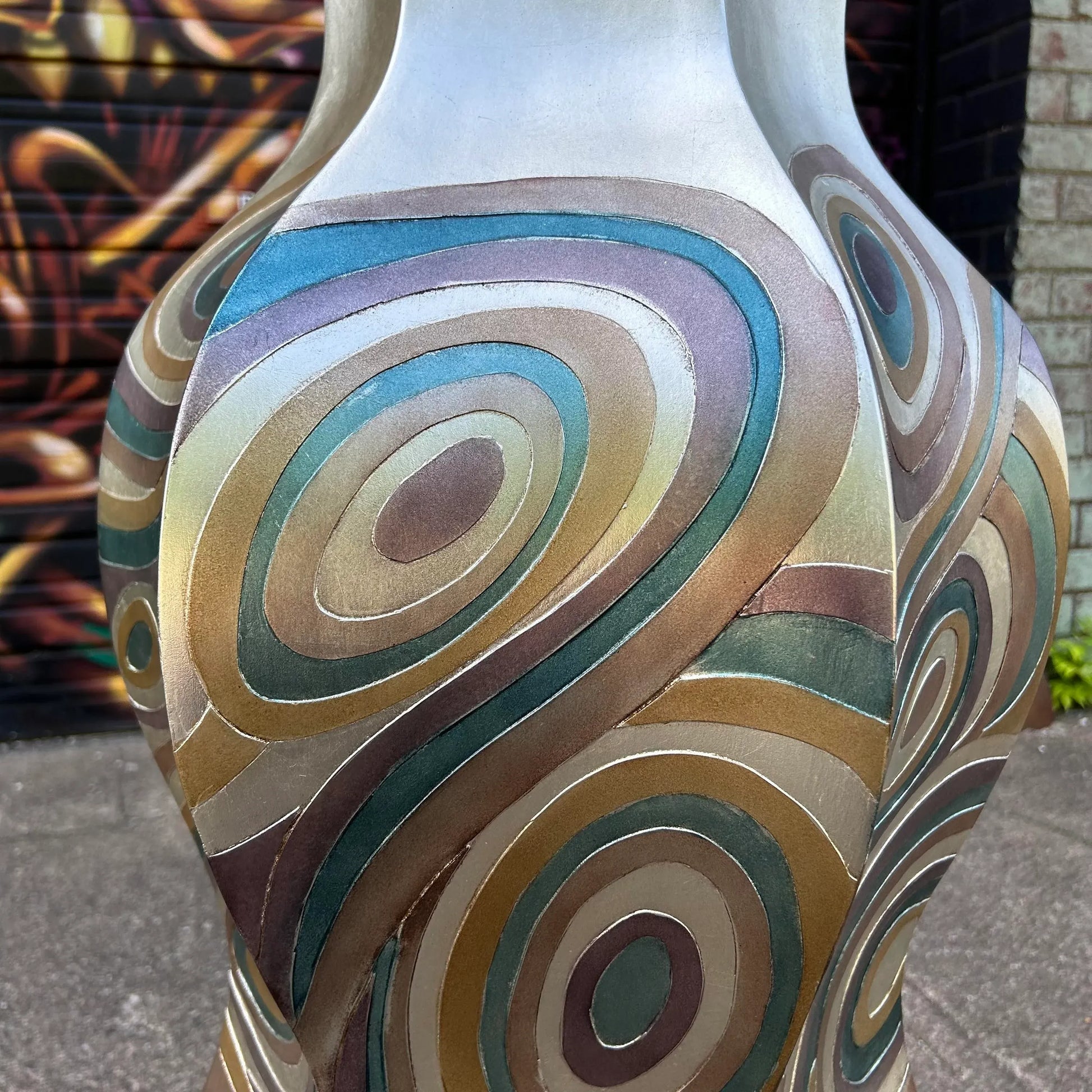 Post modern oversized vessel by Artmax. Silver vase with swirls of maroon, teal, and gold throughout the piece.