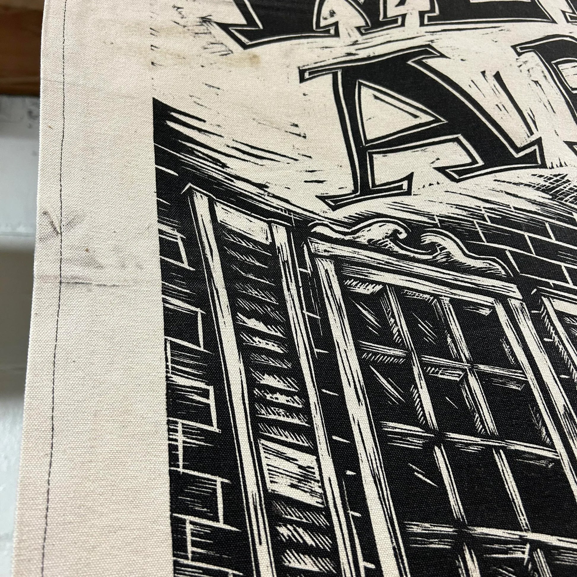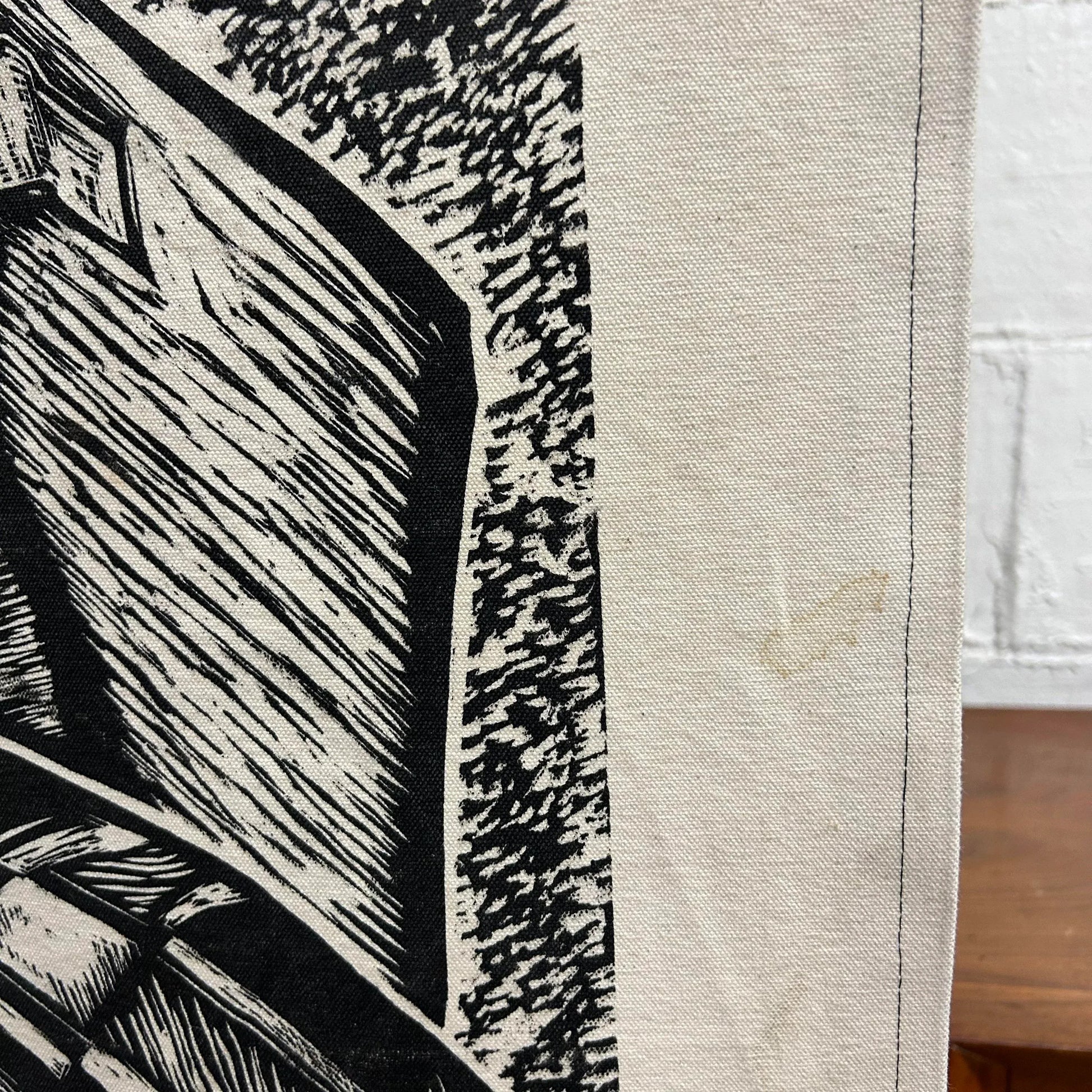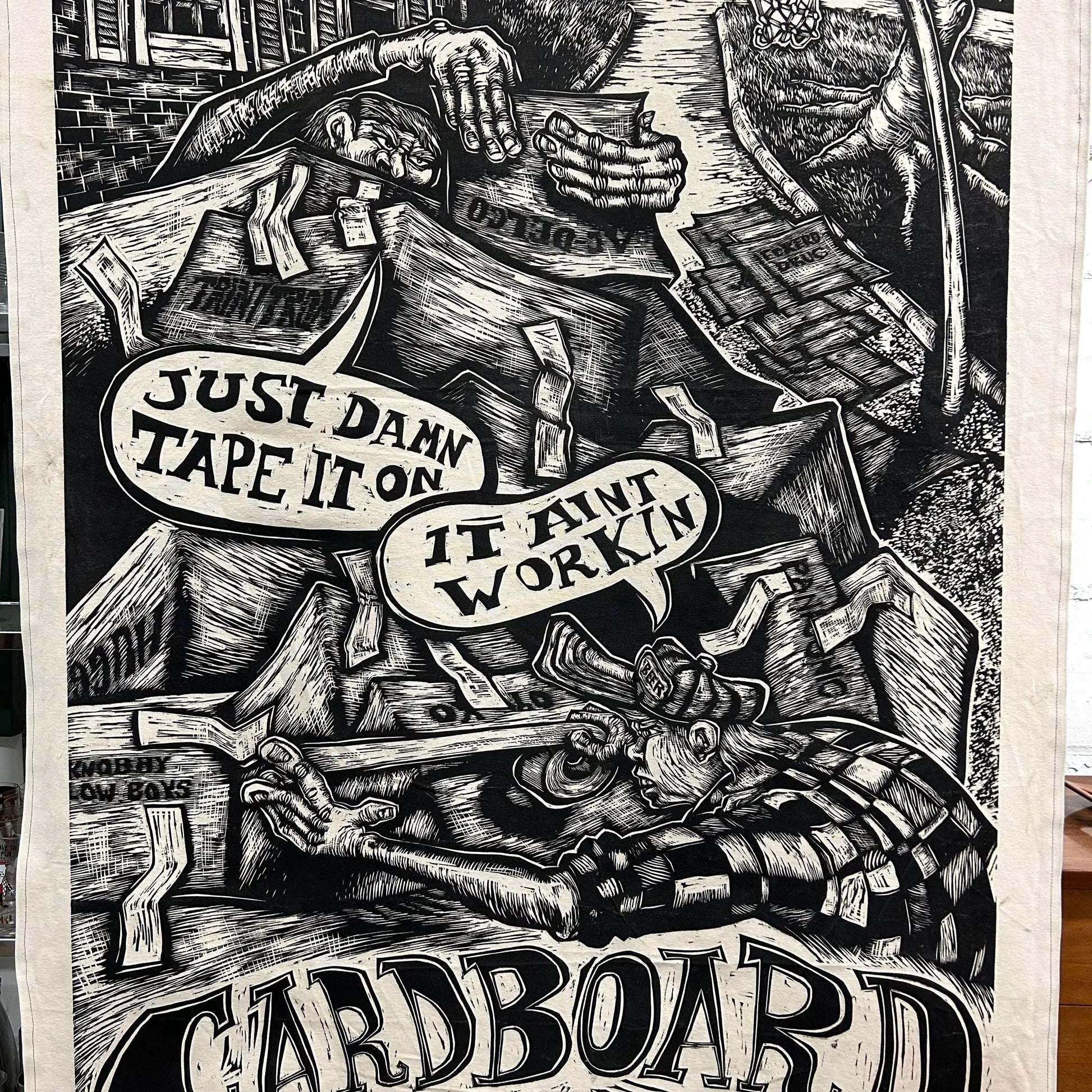 “We Built a Big-Ass Cardboard Goat” by David Ellis. This massive block print piece measures 49.5” width and 96” height. It 8d printed on canvas. David Ellis is part of renounced NYC based graffiti group, The Barnstormers.