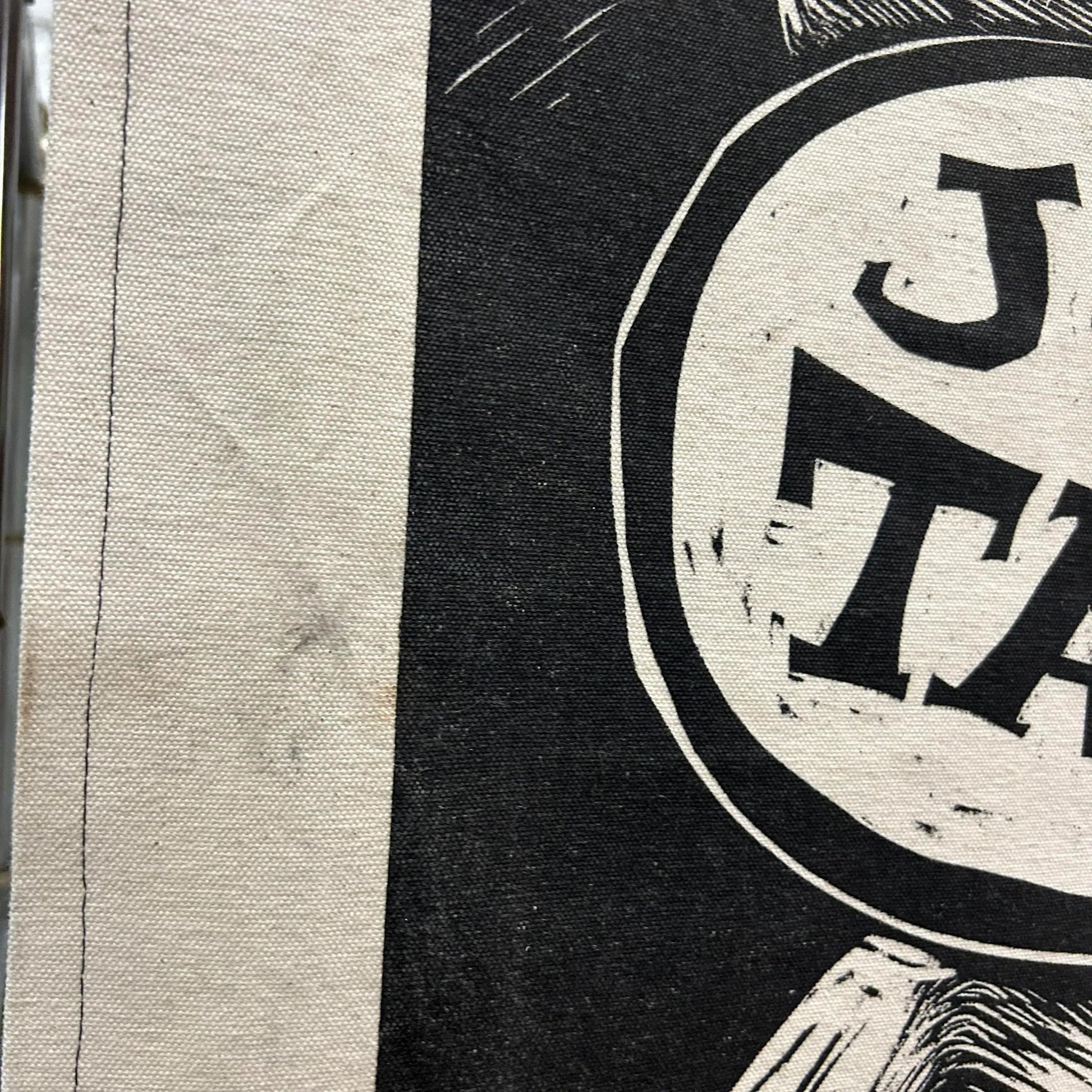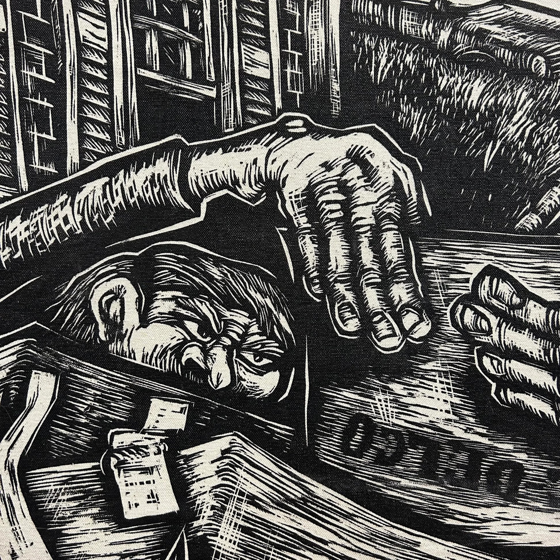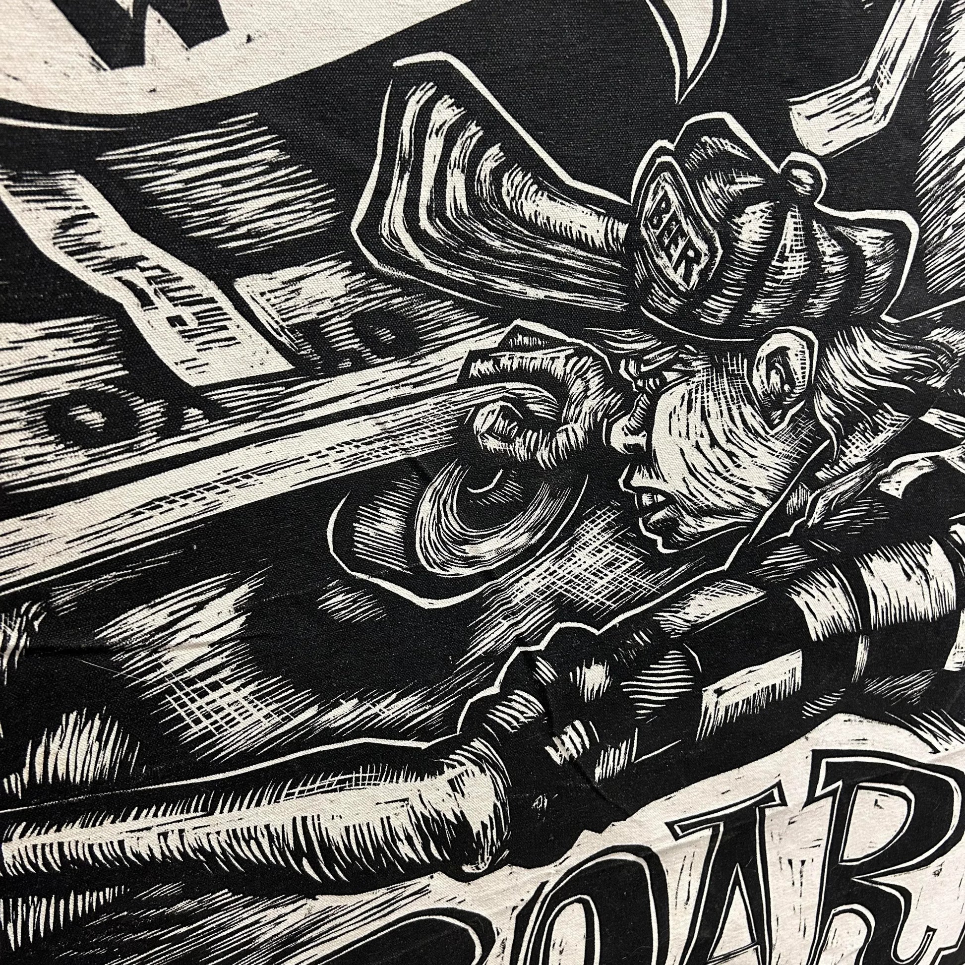 “We Built a Big-Ass Cardboard Goat” by David Ellis. This massive block print piece measures 49.5” width and 96” height. It 8d printed on canvas. David Ellis is part of renounced NYC based graffiti group, The Barnstormers.