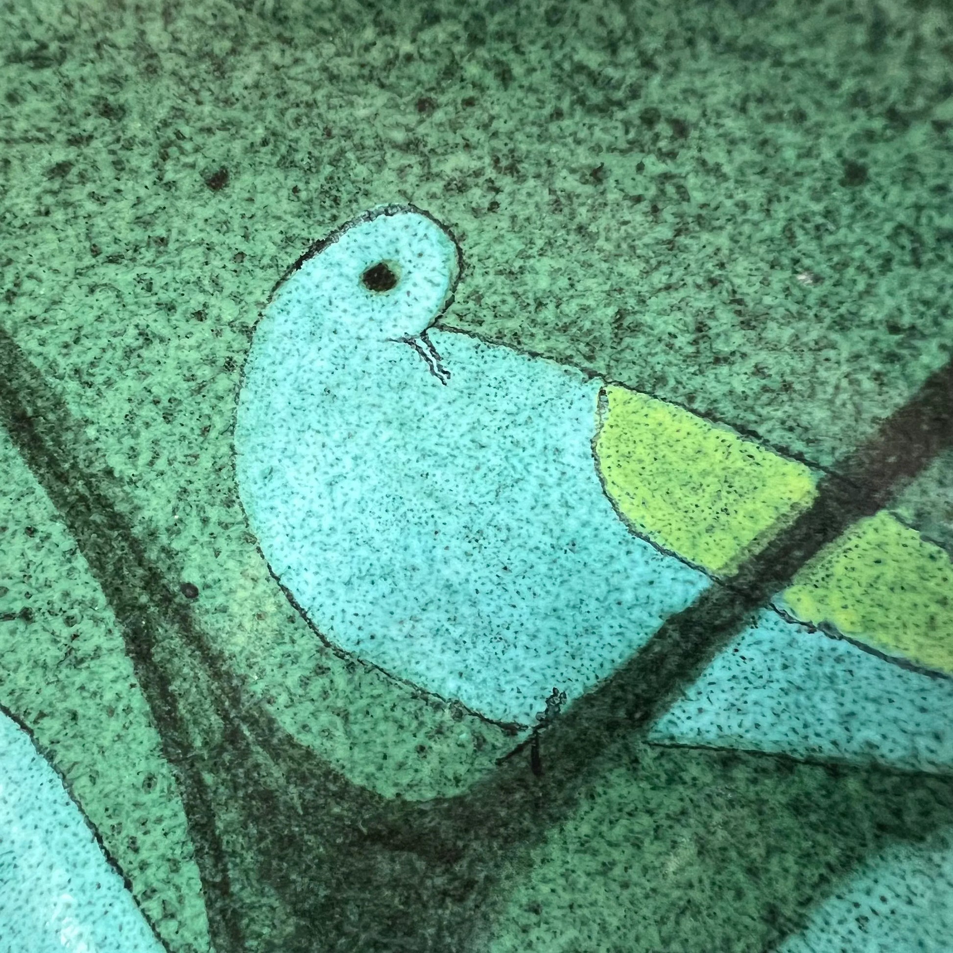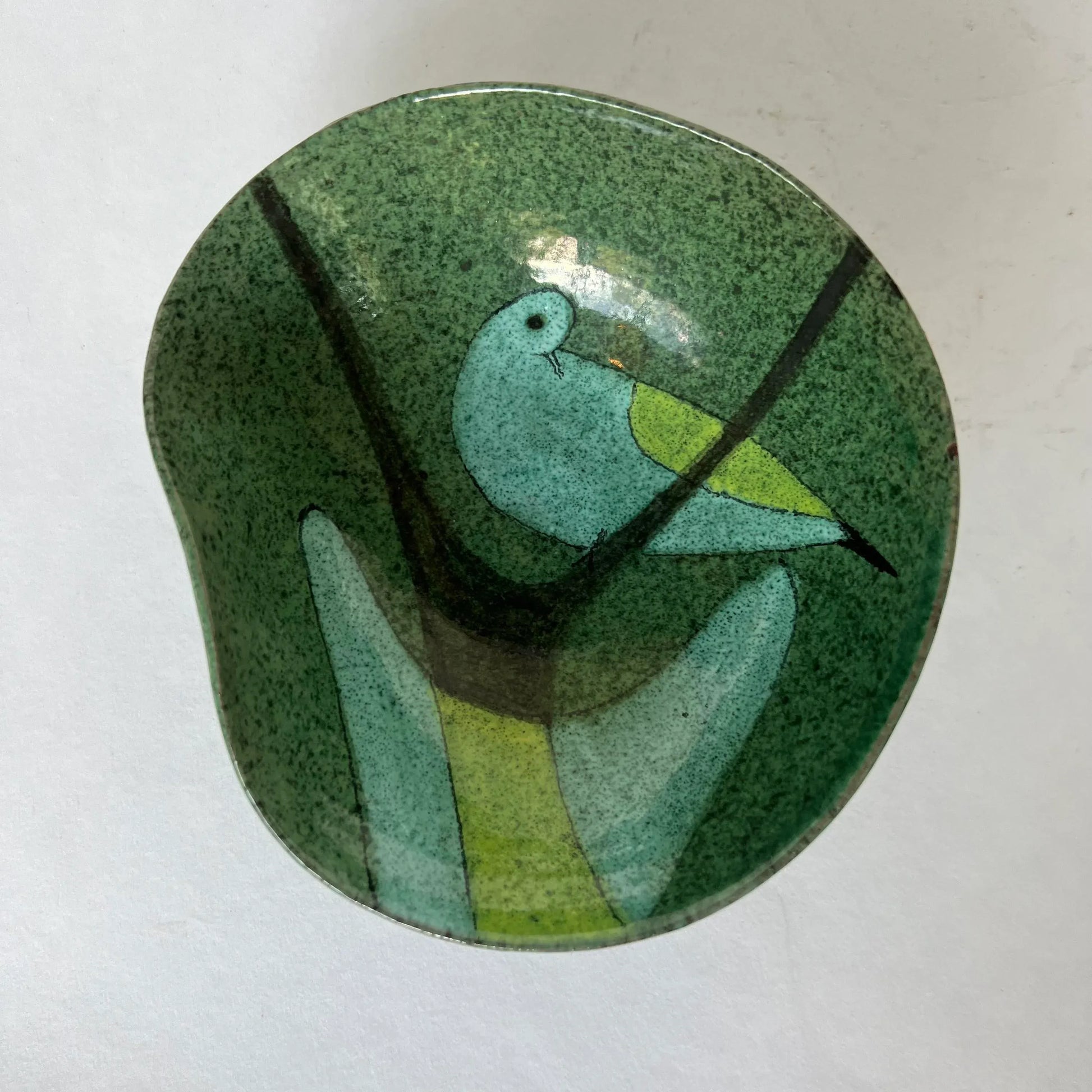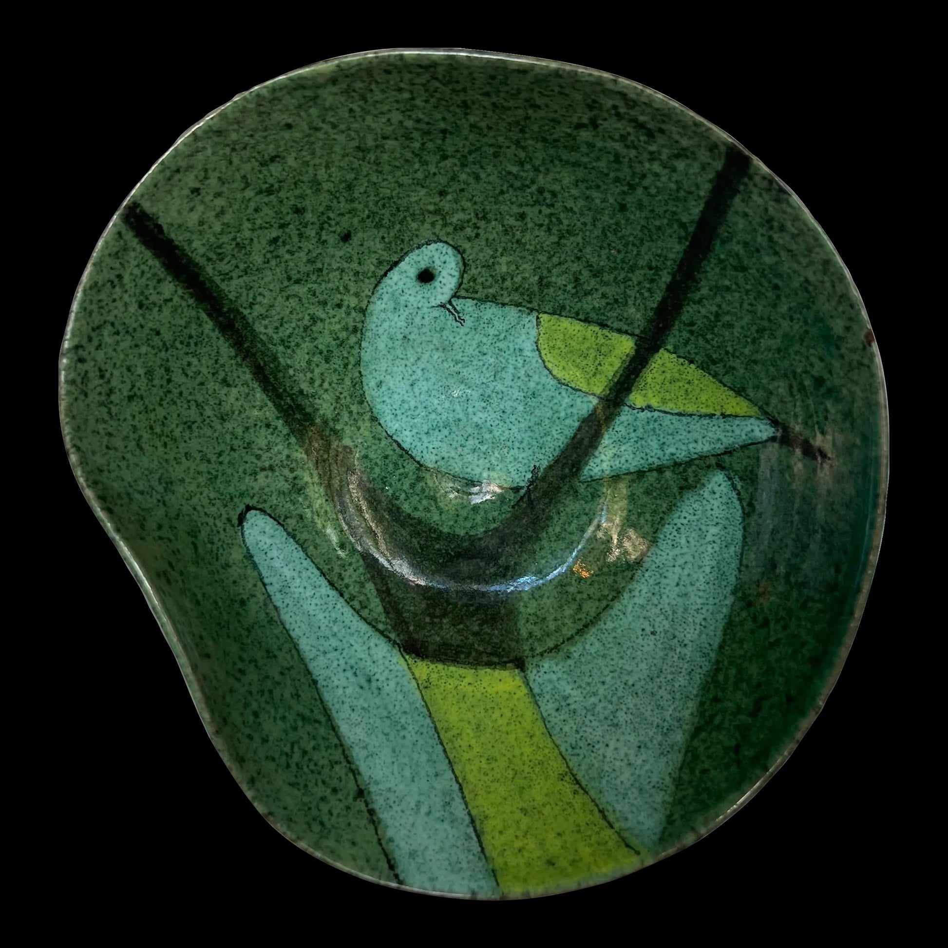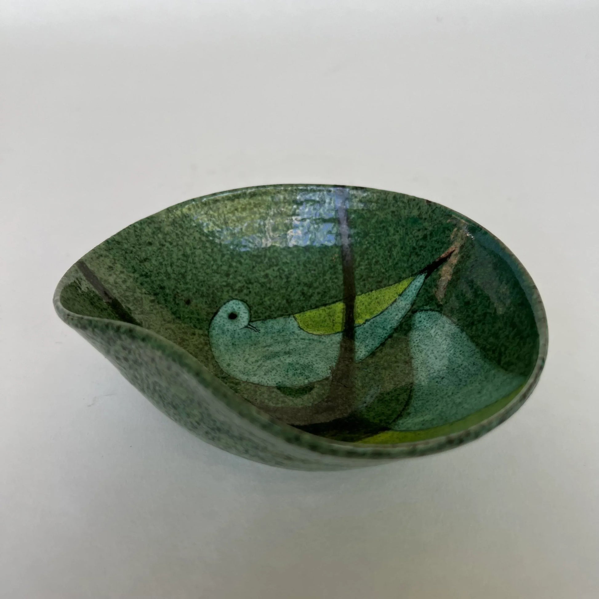 Beautifully Shaped Ceramic Dish With Bird Design Blue Green Teal Signed