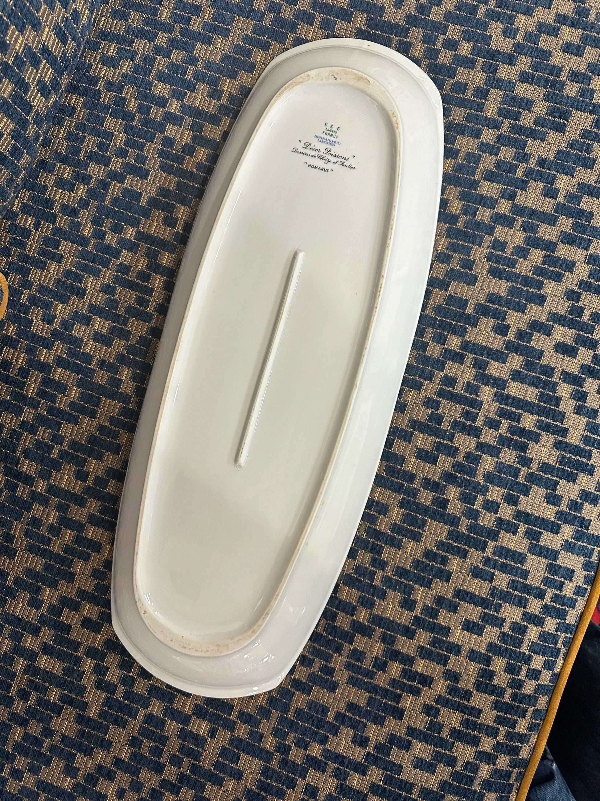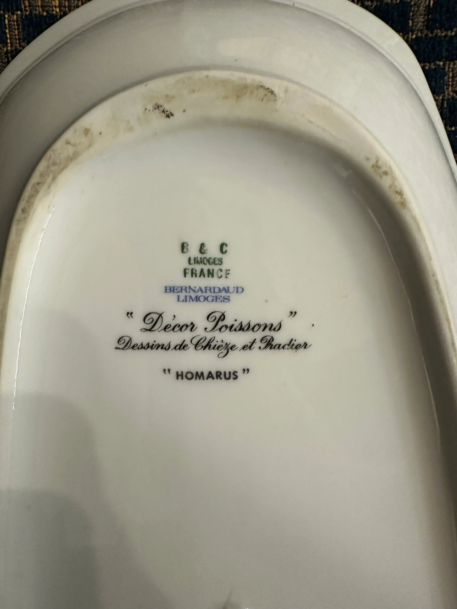 Measuring 22.75 inches long, 8.5 inches wide, and 2 inches tall, this generously sized dish offers ample space for serving and is sure to impress guests. It features the signature Bernard and Limoges mark, ensuring authenticity and quality. This dish is perfect for collectors of fine porcelain, seafood enthusiasts, or anyone looking to add a sophisticated touch to their dining décor.
