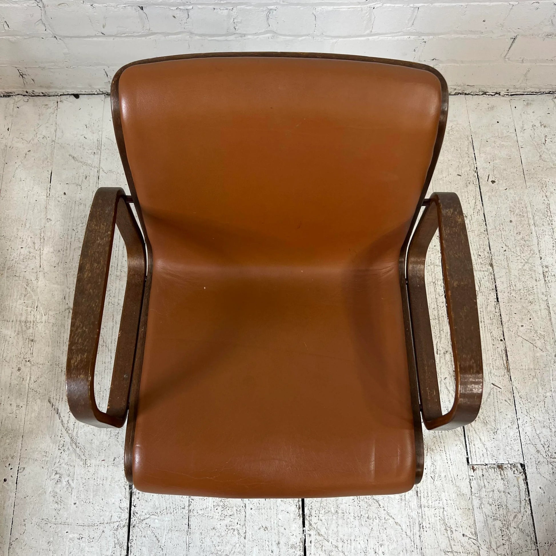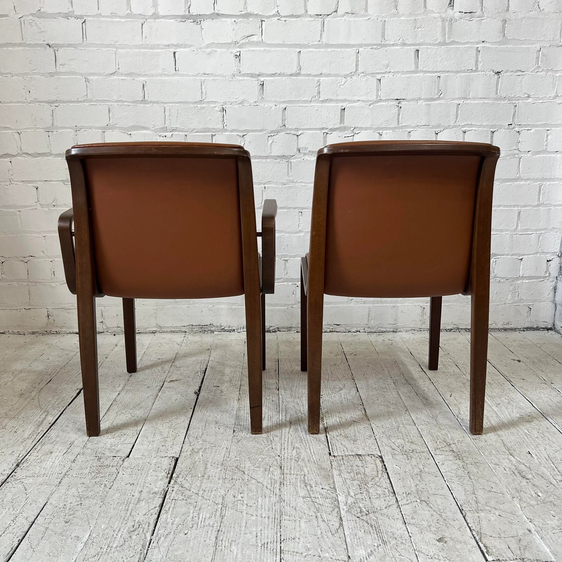 Set of 6 bentwood chairs by Bill Stephens for Knoll. Covered in real rust color leather. 2 arm chairs, 4 side chairs