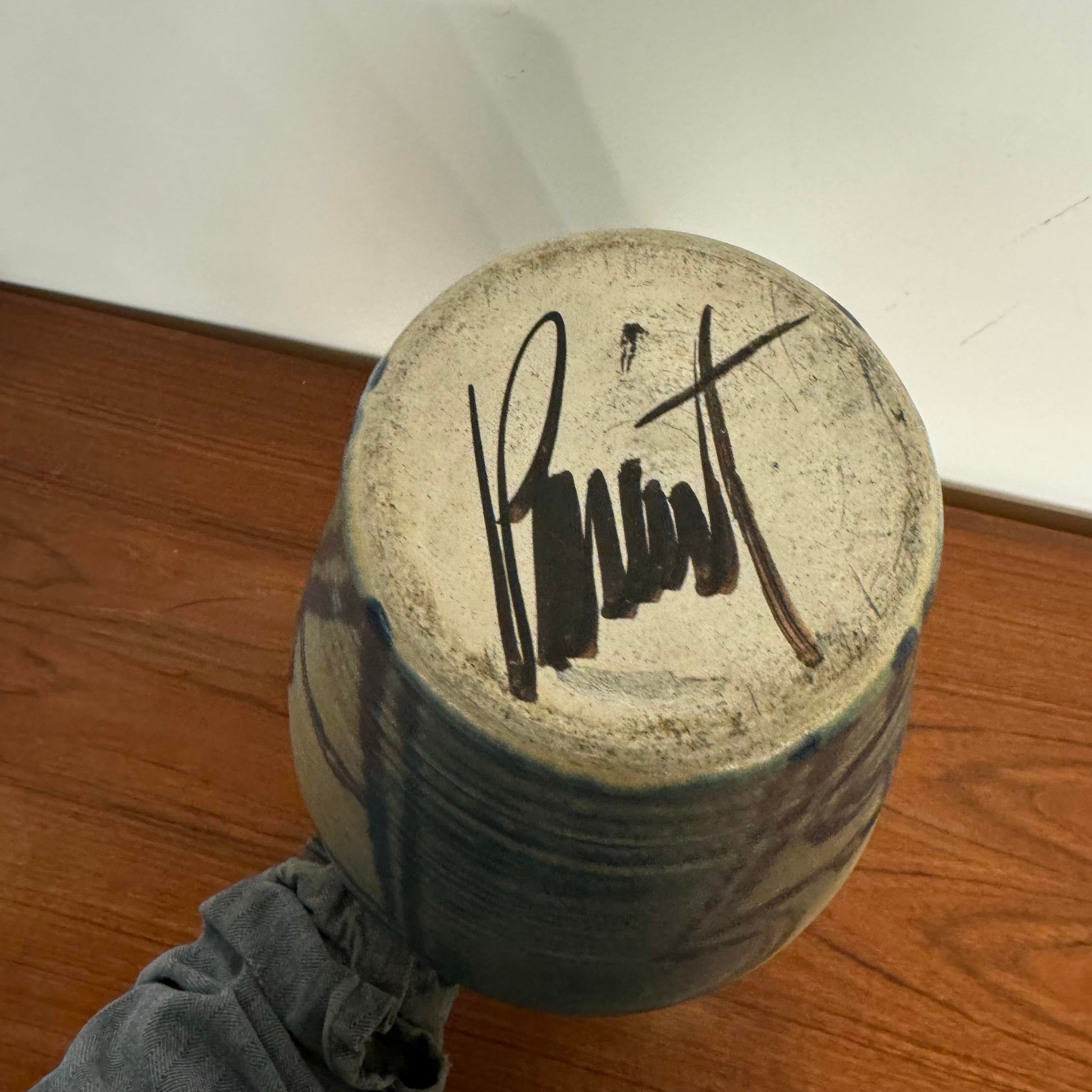 Ceramic vase with tan and blue linear abstract glazing. Signature on bottom.