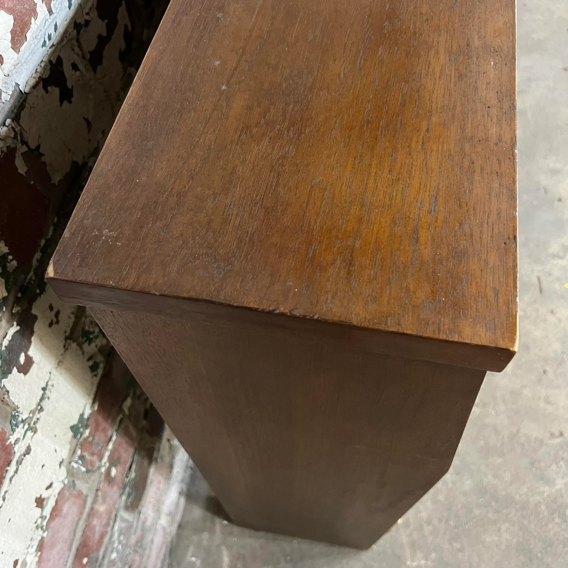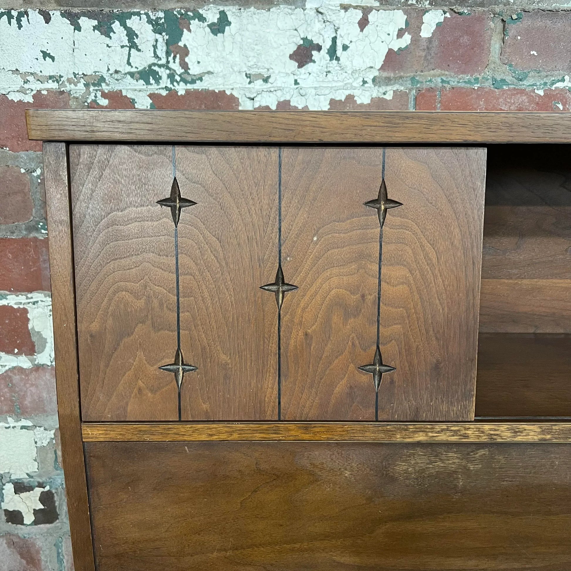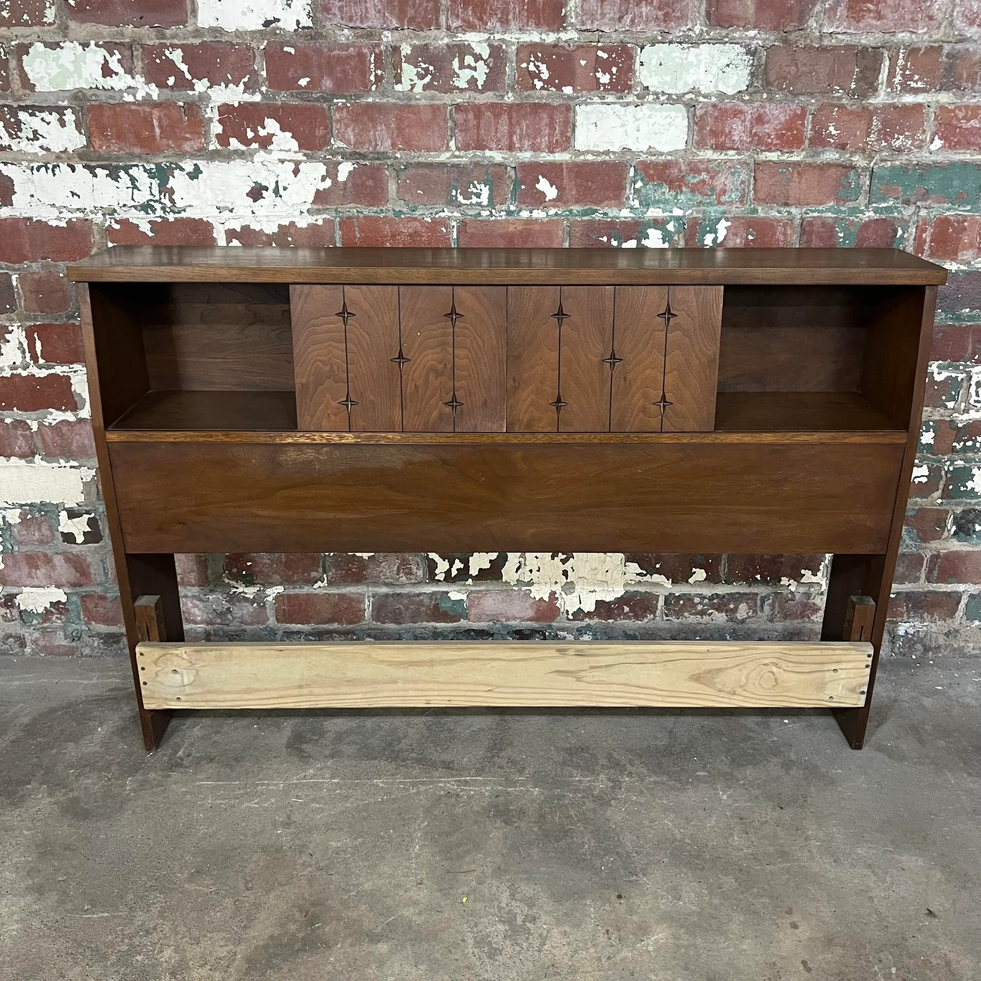 Mid century modern full size headboard with storage and sliding doors. There is an outlet and cord but we could not confirm that it is in working condition.