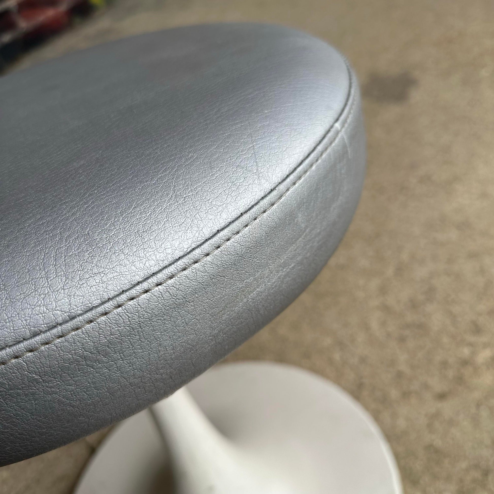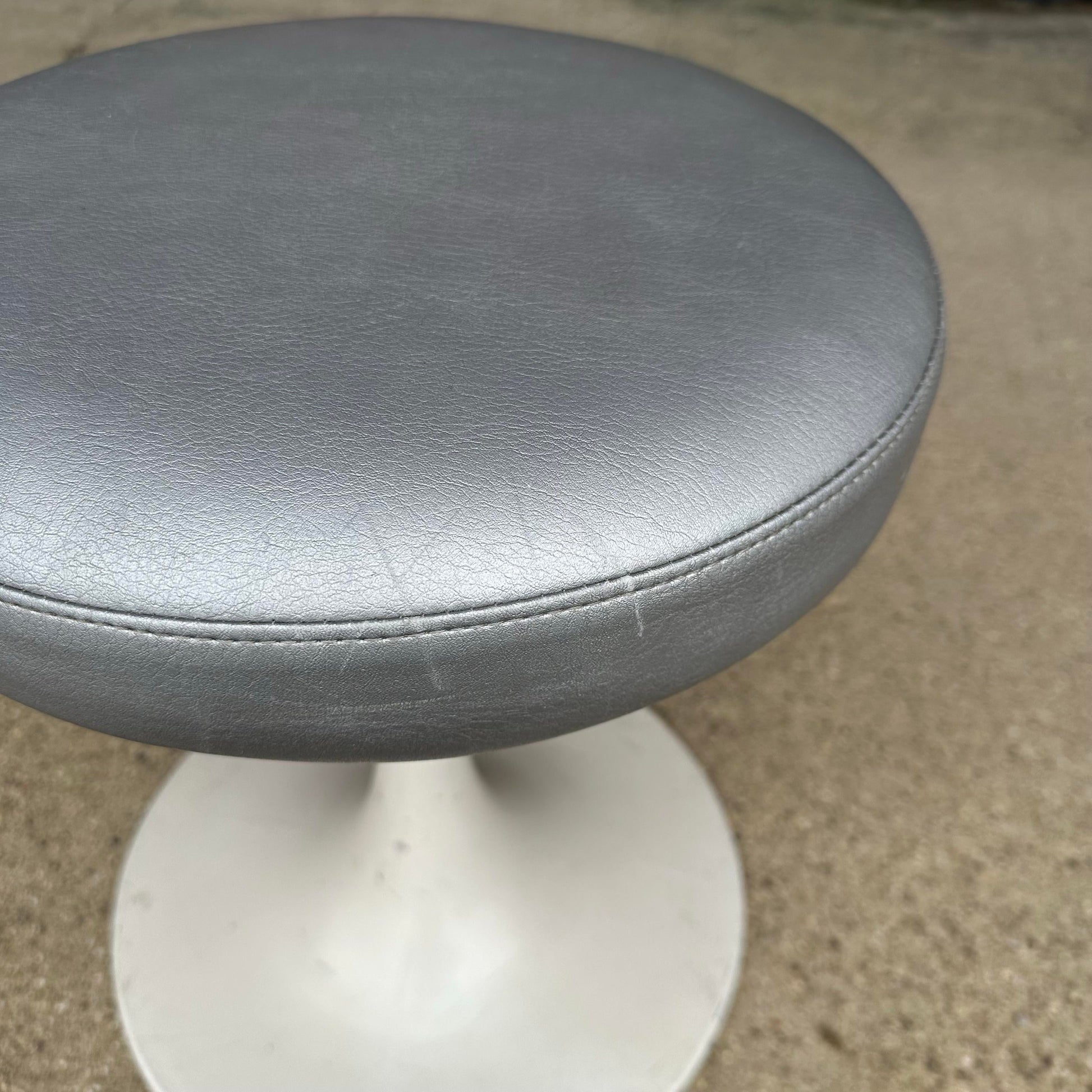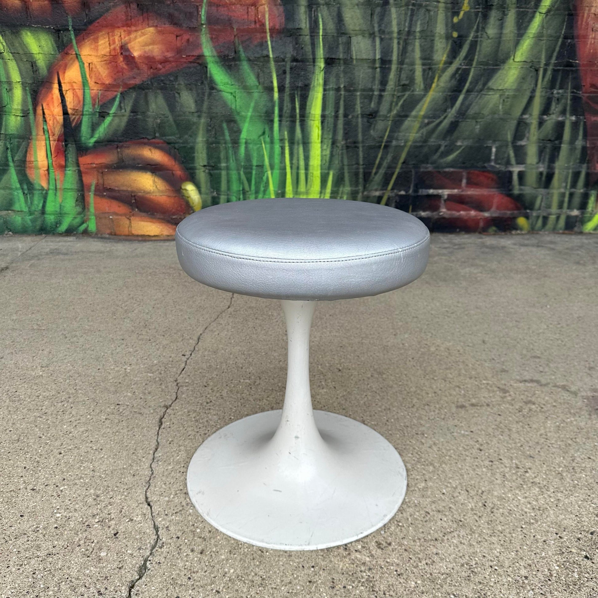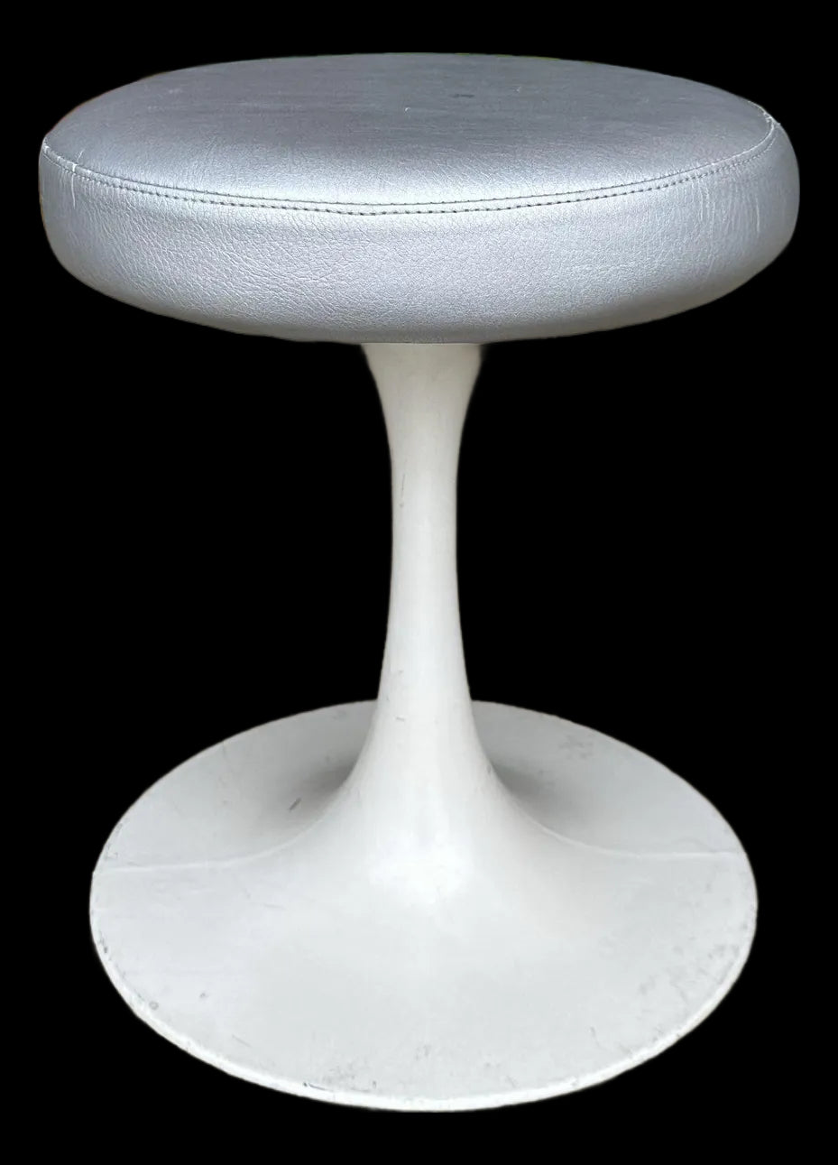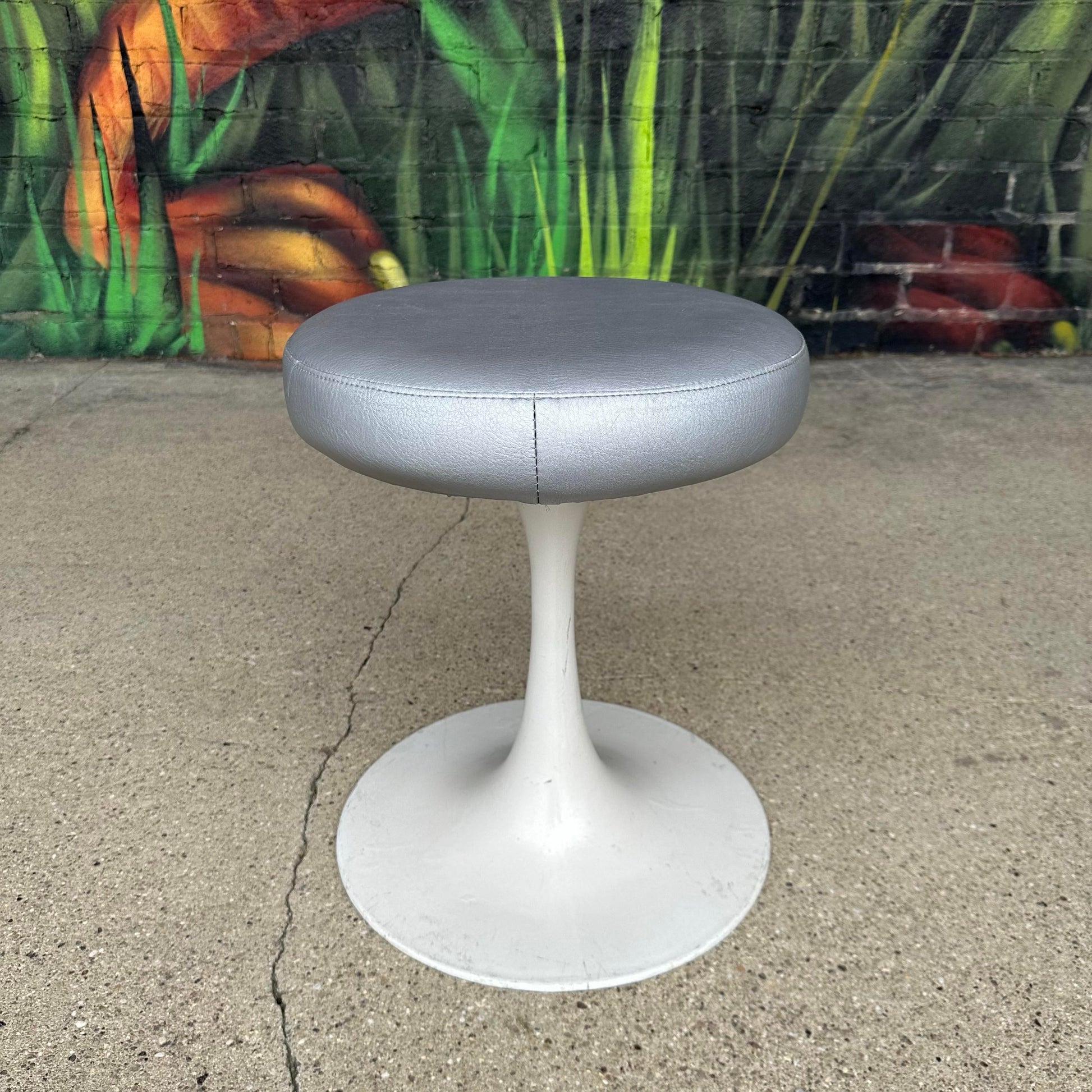 This low sitting stool is a classic mid-century modern silhouette. This space age style stool is from Brevet CRE ROSSI, an Italian company, in the style of Eero Saarinen’s iconic tulip-based furniture for Knoll. It has a rounded silver vinyl seat at top a tulip shaped white metal base.