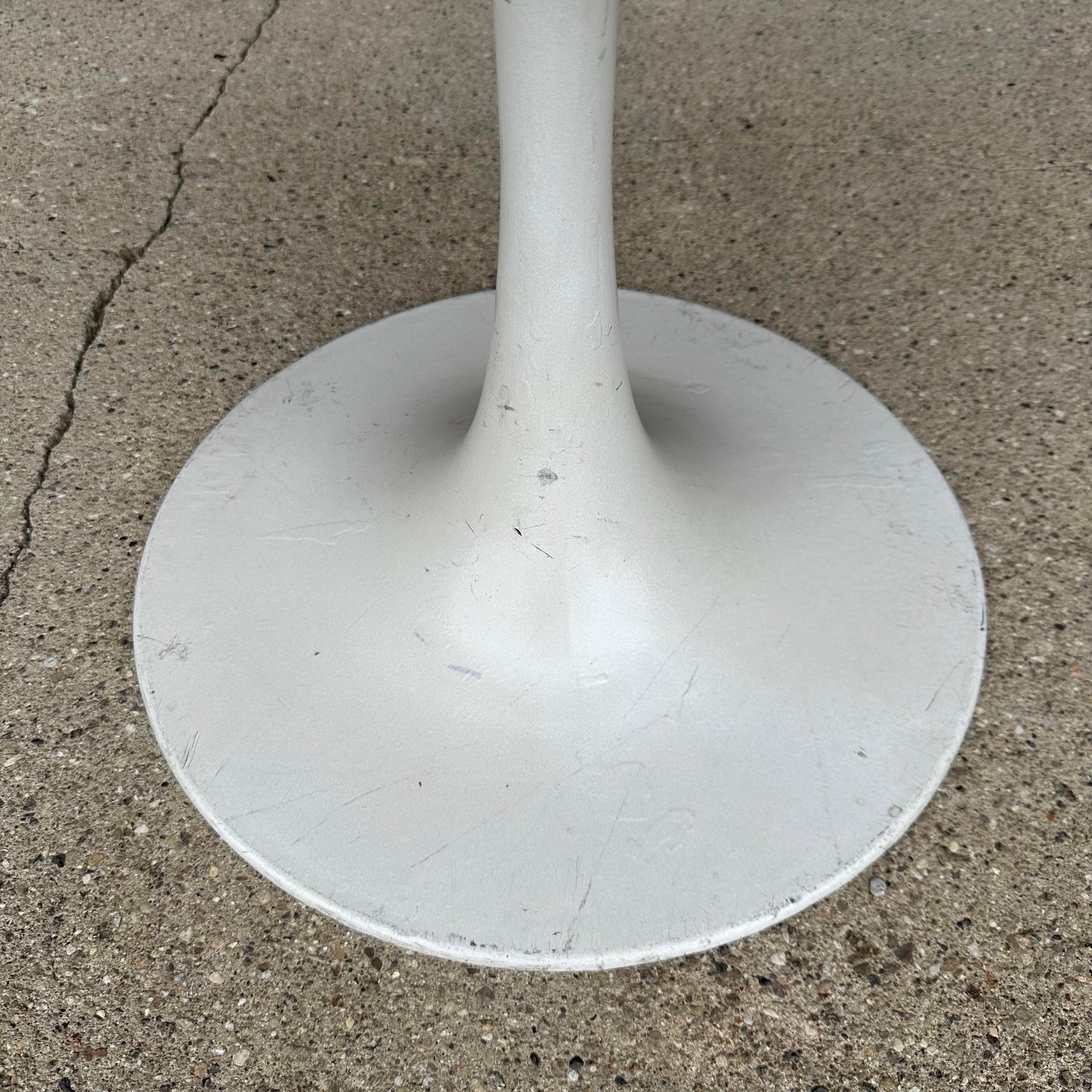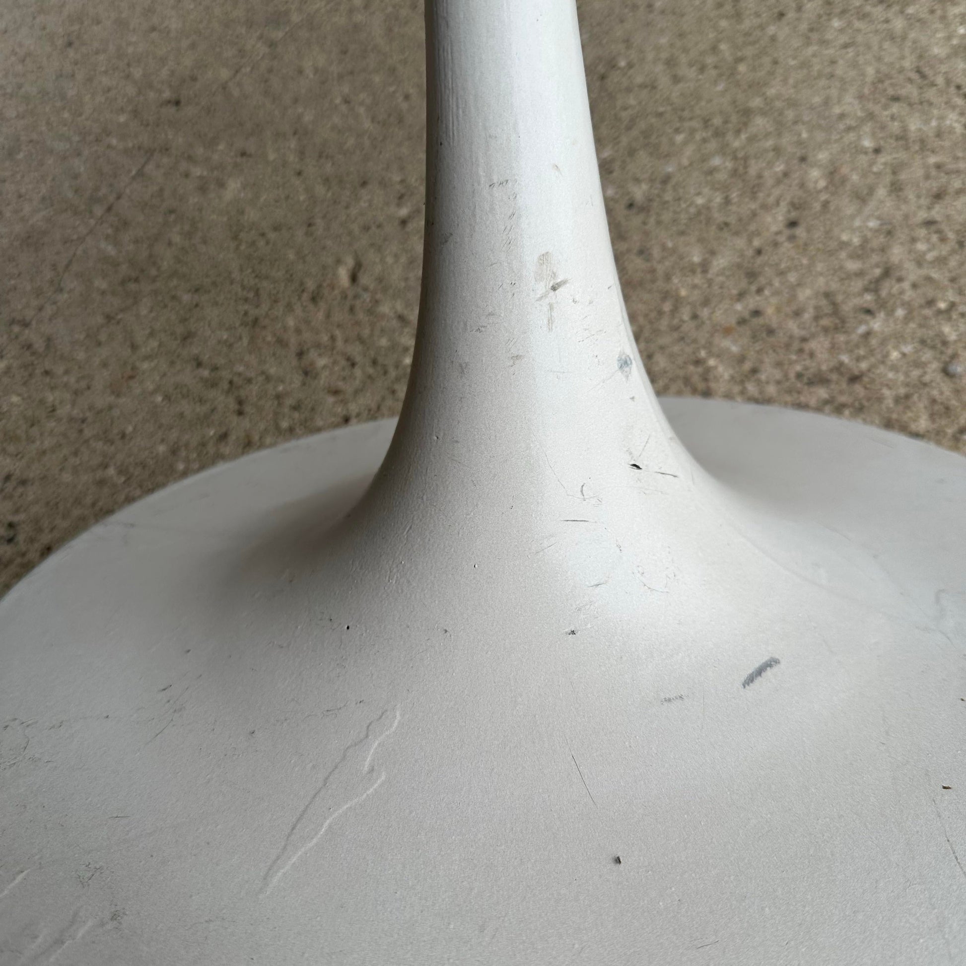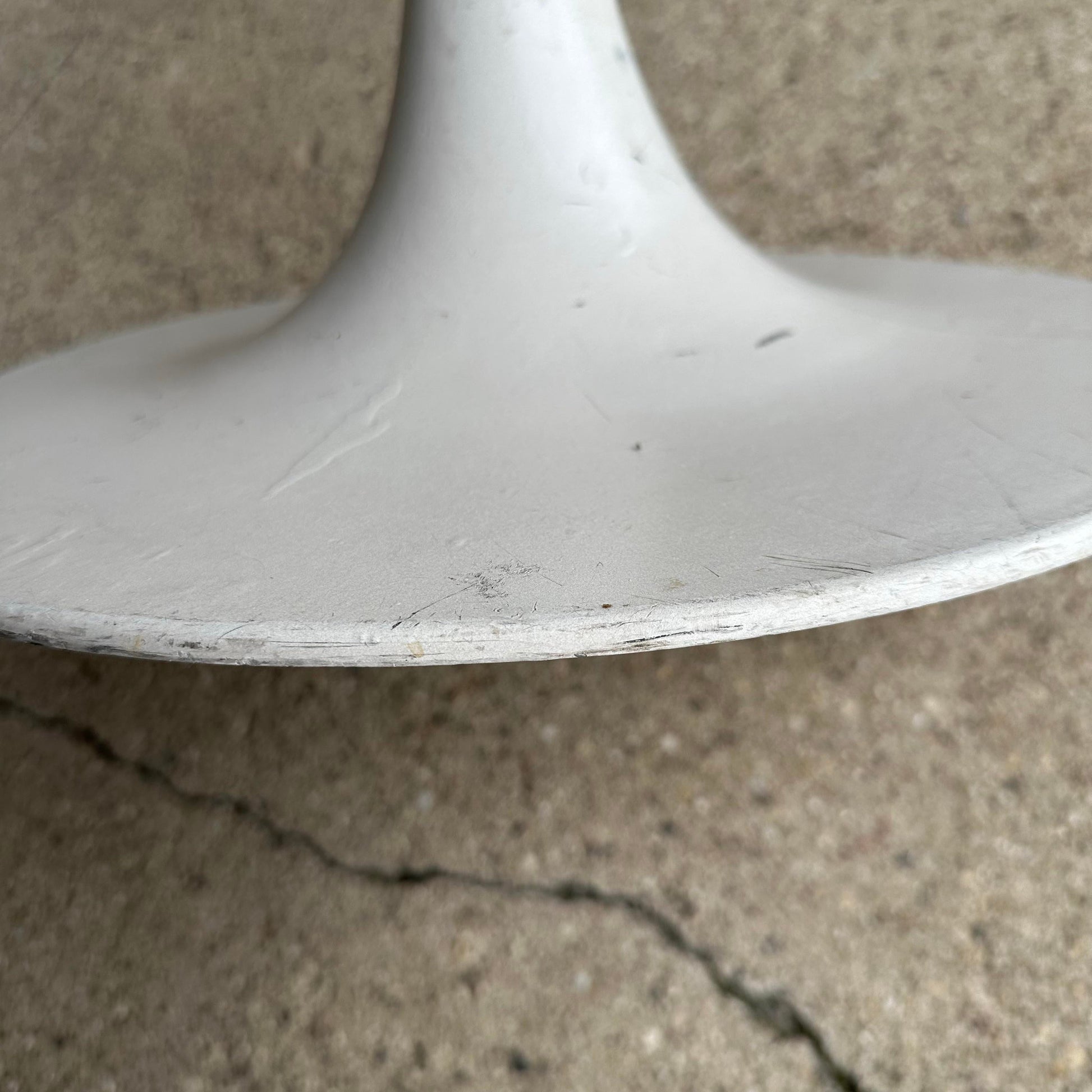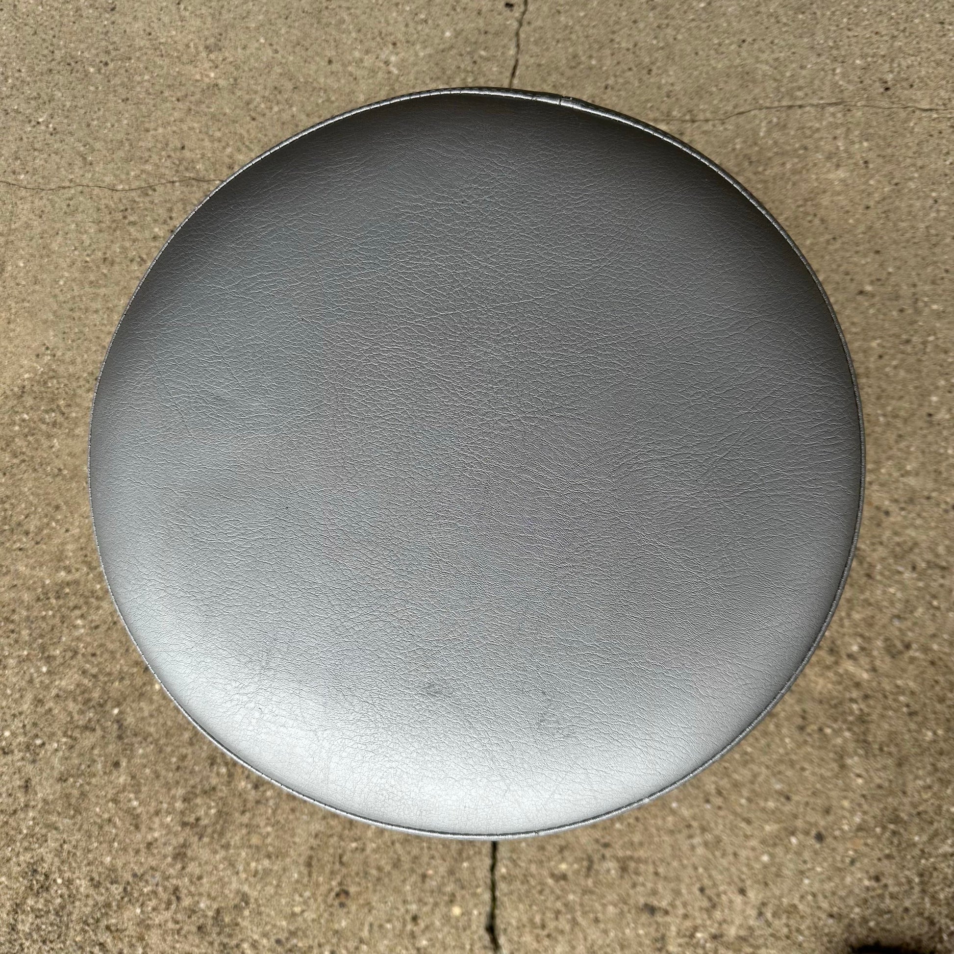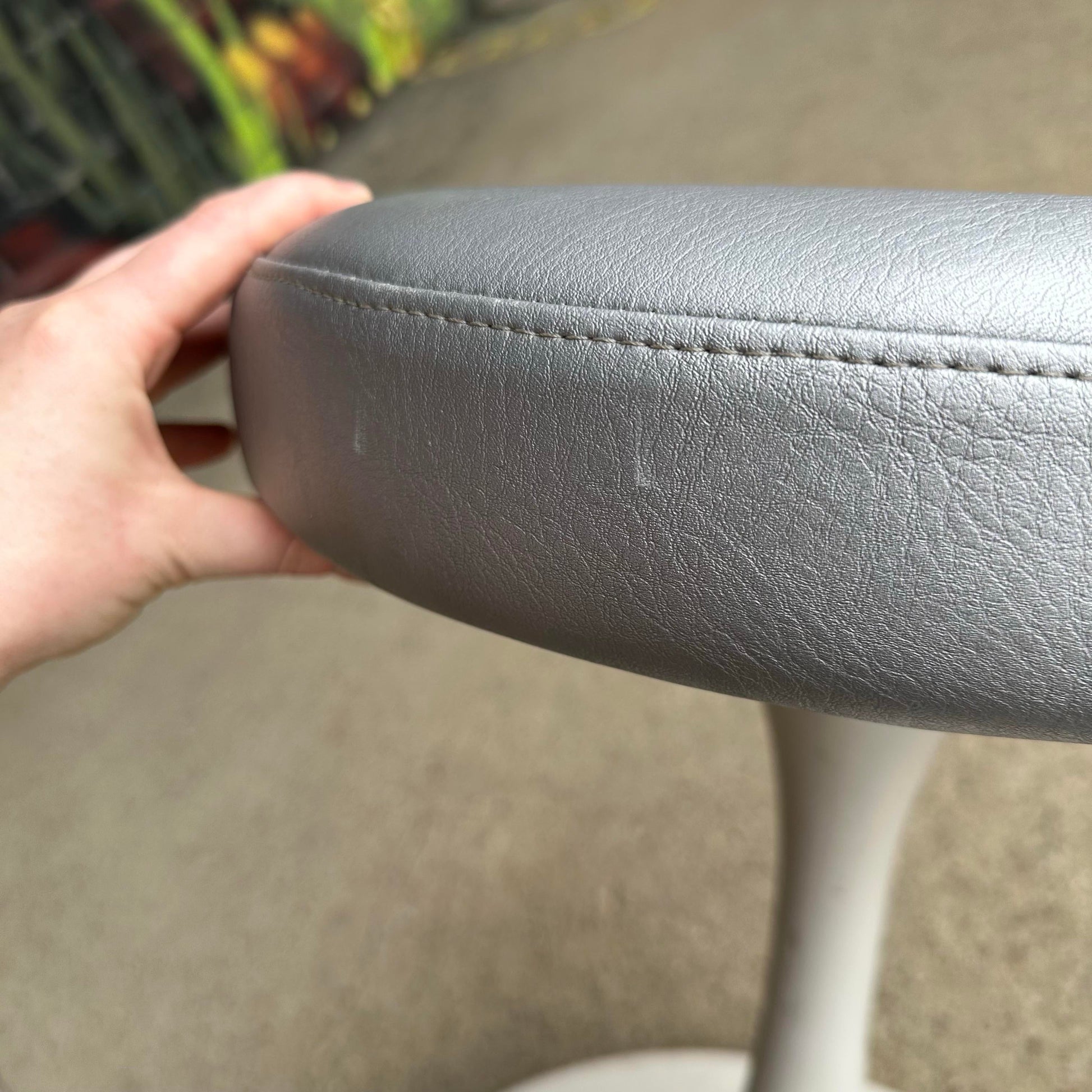 This low sitting stool is a classic mid-century modern silhouette. This space age style stool is from Brevet CRE ROSSI, an Italian company, in the style of Eero Saarinen’s iconic tulip-based furniture for Knoll. It has a rounded silver vinyl seat at top a tulip shaped white metal base.