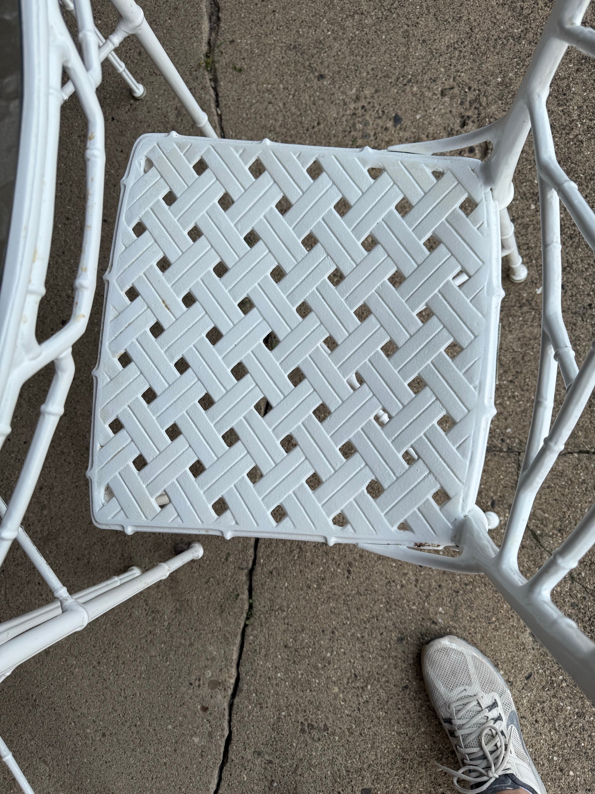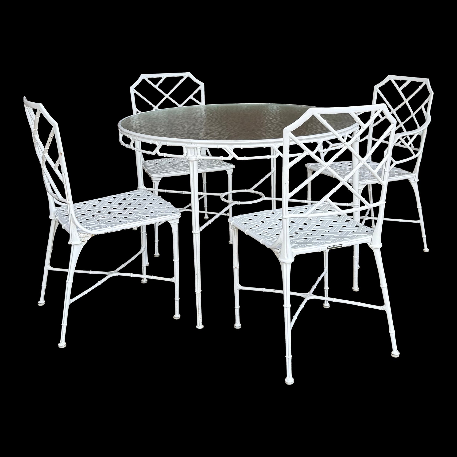 Elegant and timeless, this vintage Brown Jordan Calcutta dining set includes a round dining table and four matching chairs—three side chairs and one armchair—all clearly tagged by the manufacturer. Crafted from solid aluminum, the Calcutta line is known for its graceful faux-bamboo detailing, durability, and high-end design, making it a sought-after staple for indoor or outdoor living spaces. The round table features a classic slatted top and pairs beautifully with the intricate latticework backs of the chairs.