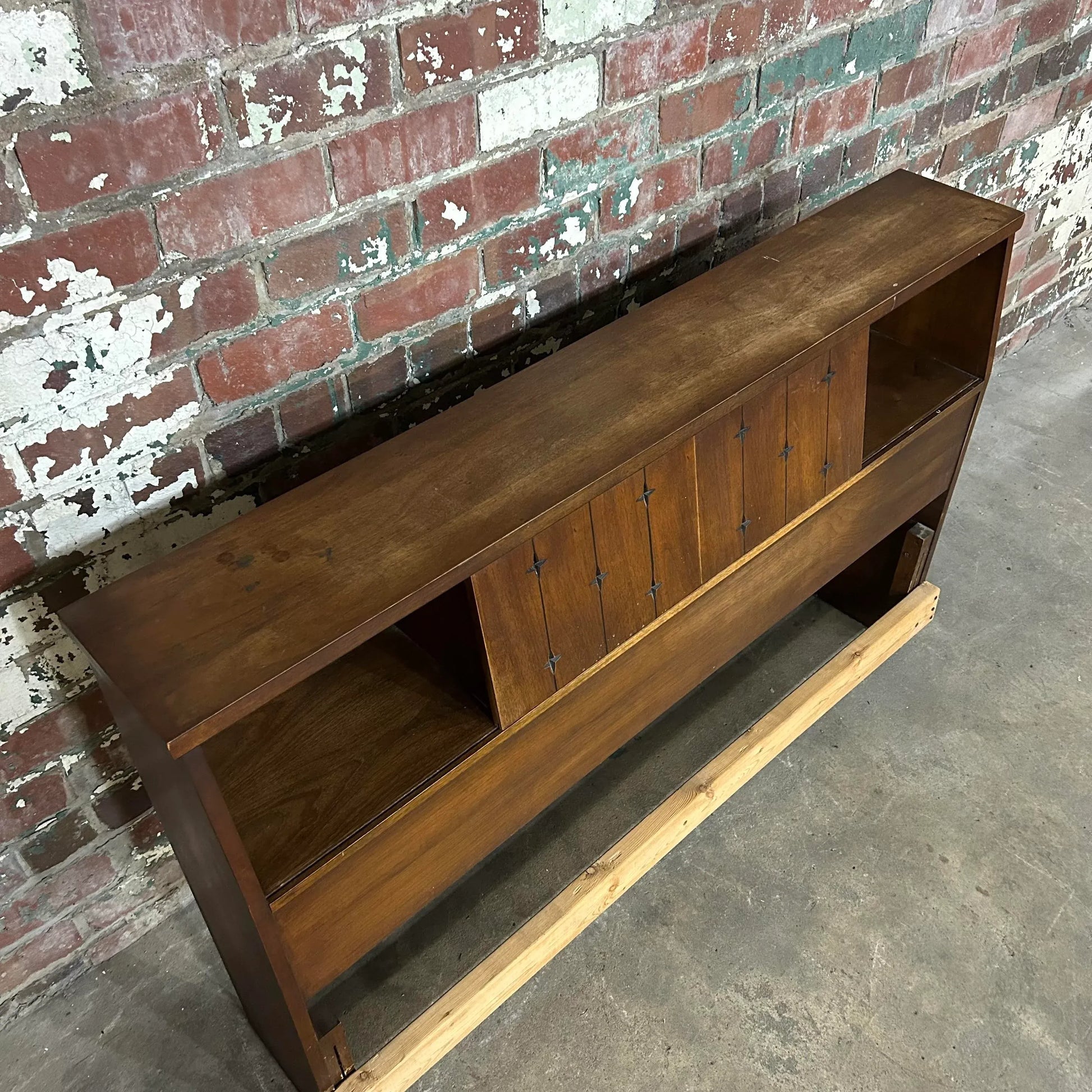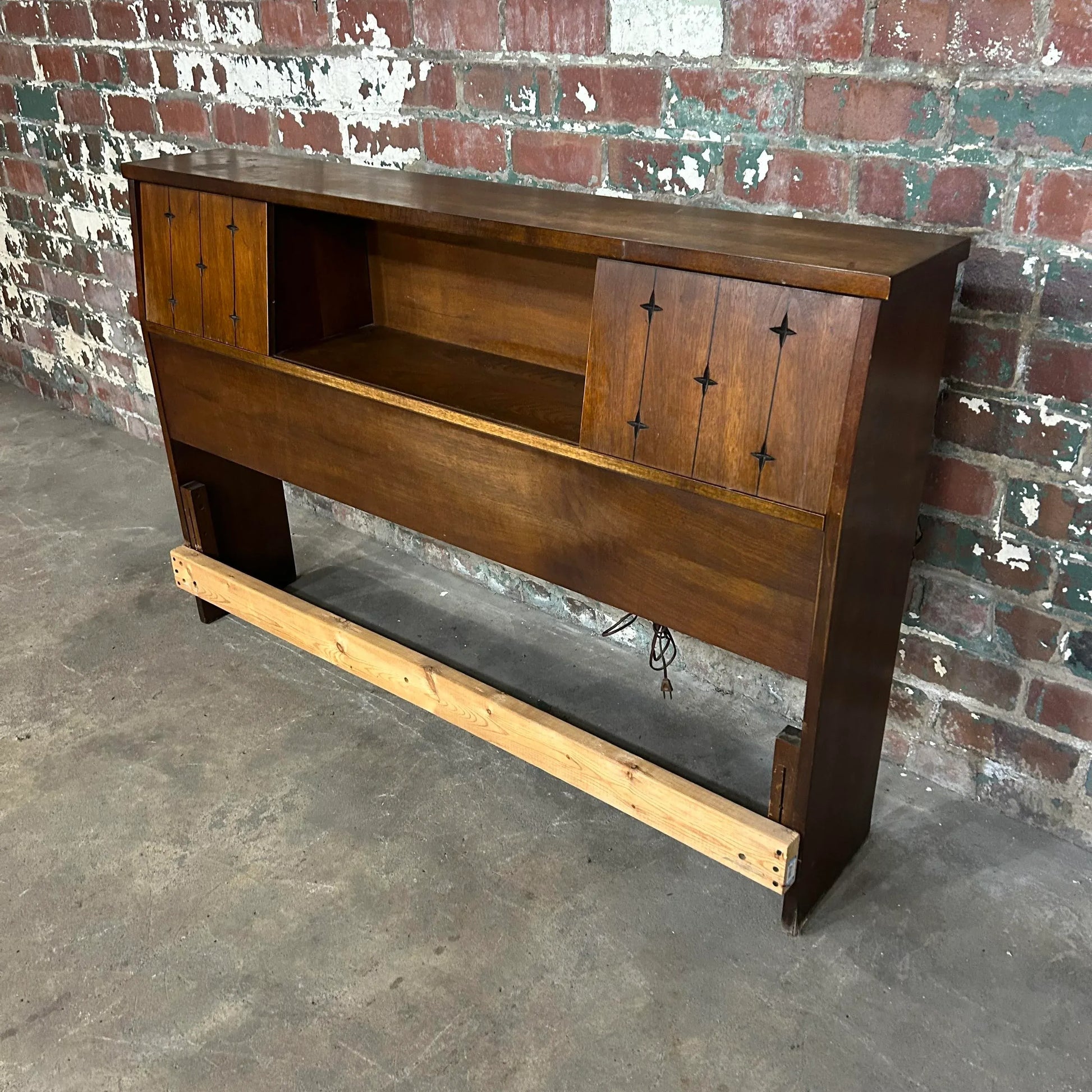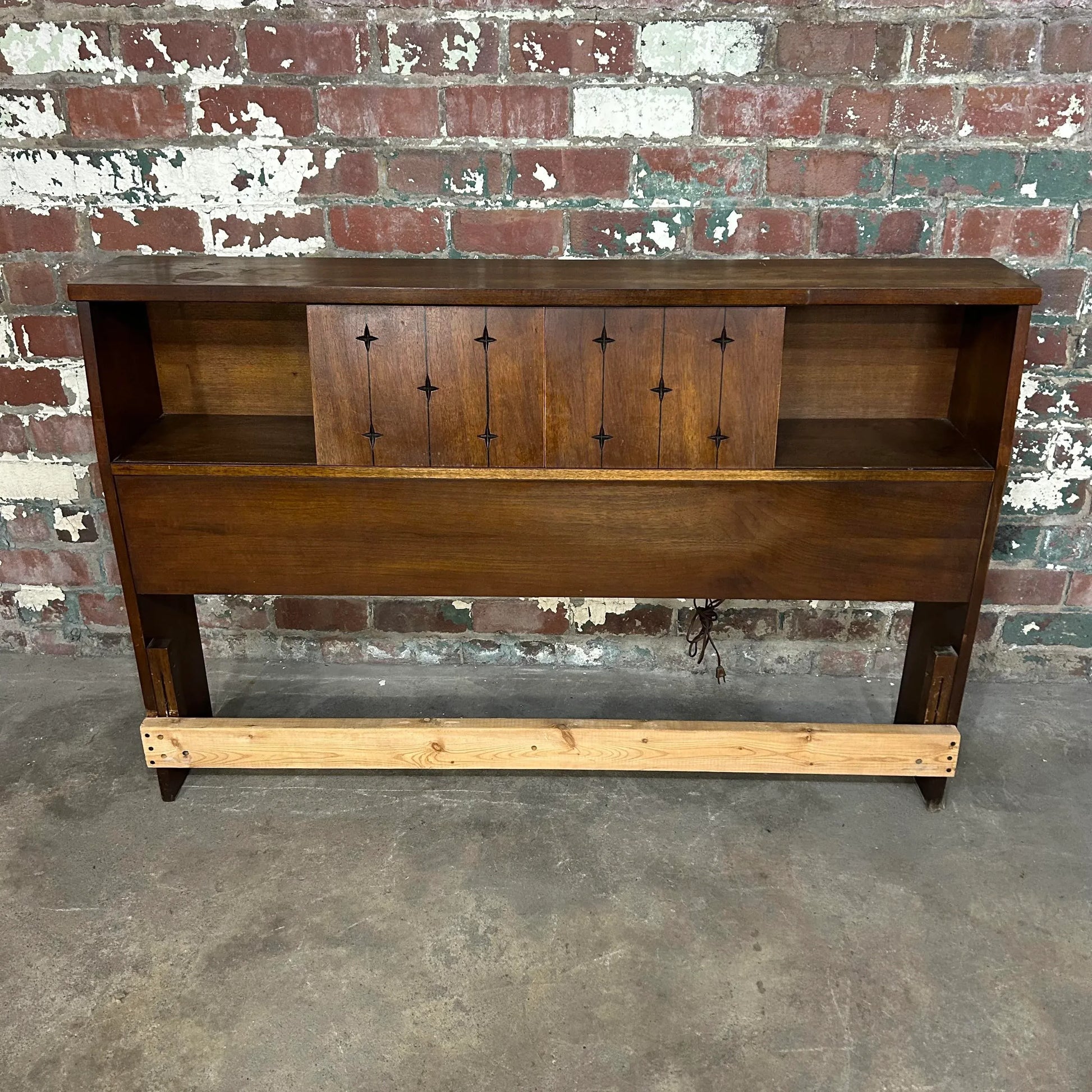 Mid century modern full size headboard from Broyhill’s Saga line. This headboard has storage up top with sliding doors. There is an outlet with cord that has not been tested.