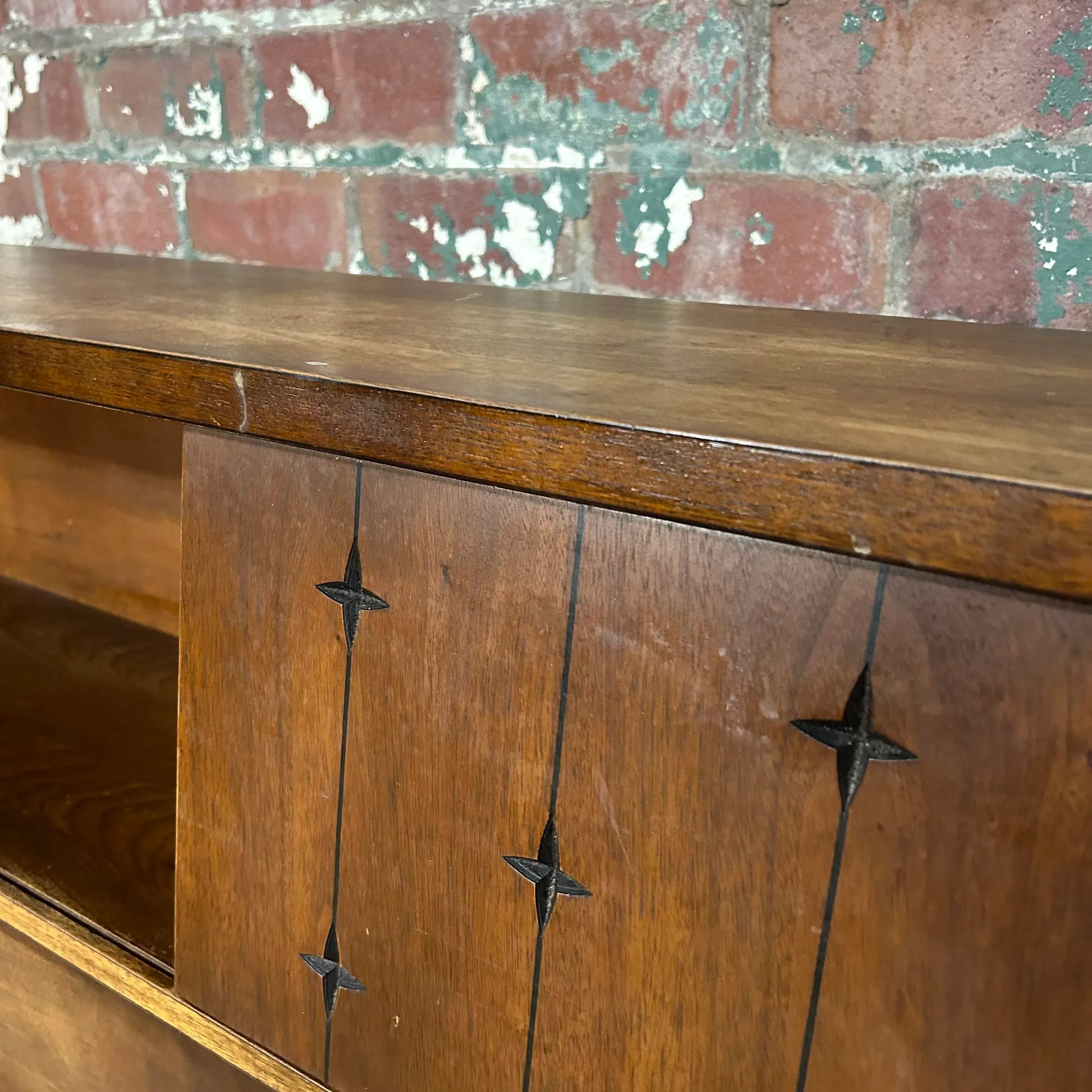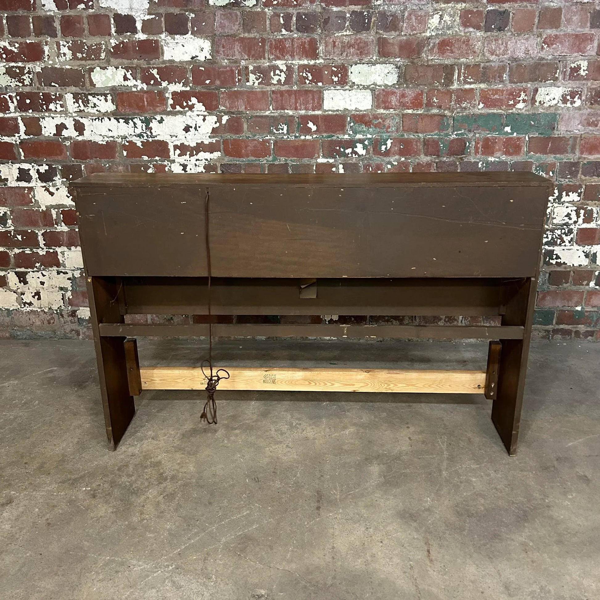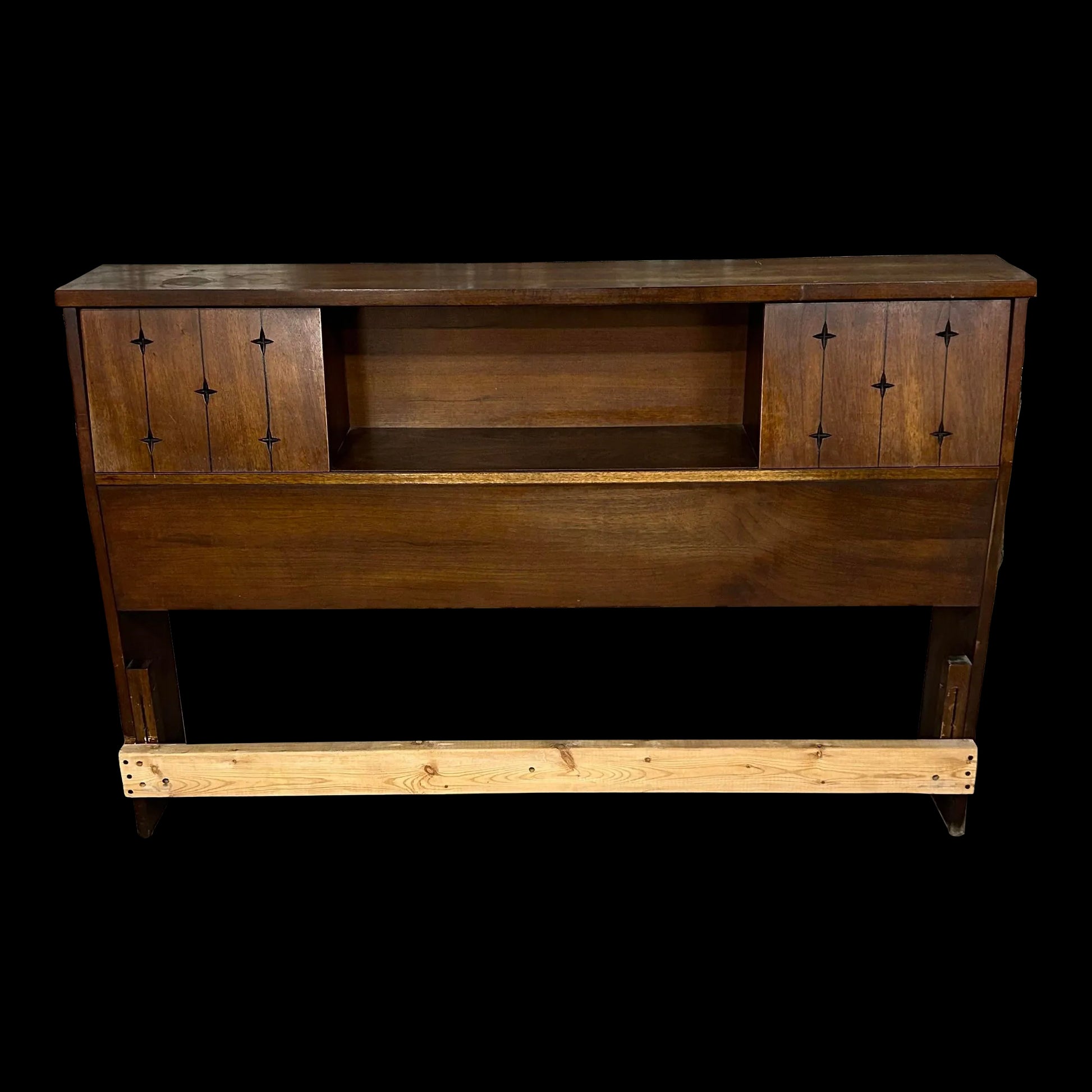 Mid century modern full size headboard from Broyhill’s Saga line. This headboard has storage up top with sliding doors. There is an outlet with cord that has not been tested.