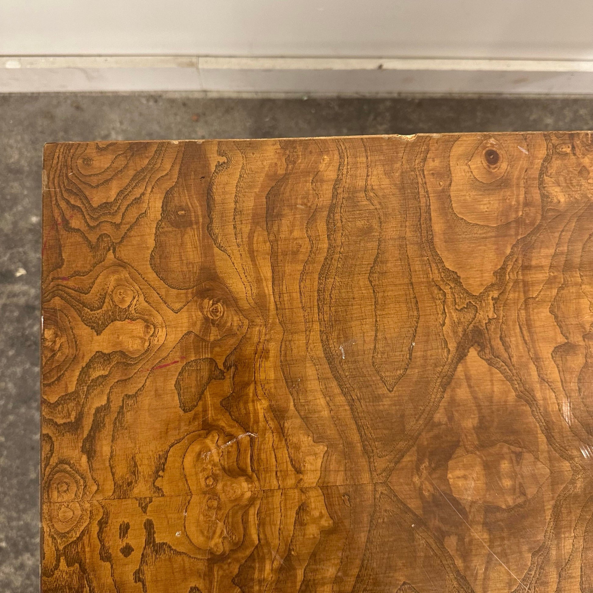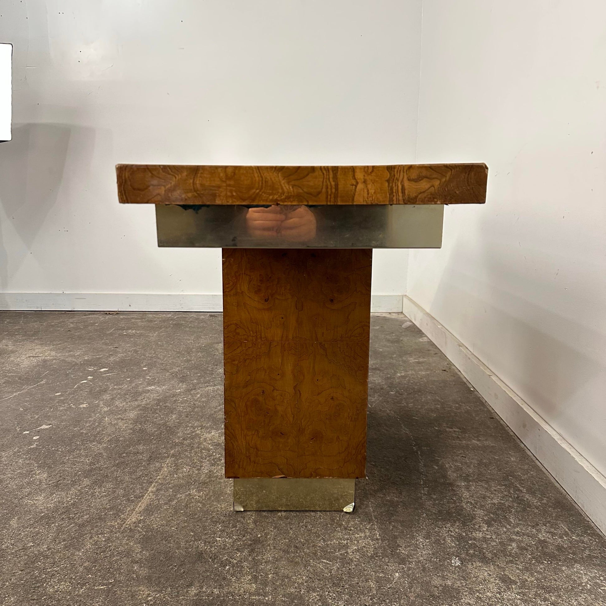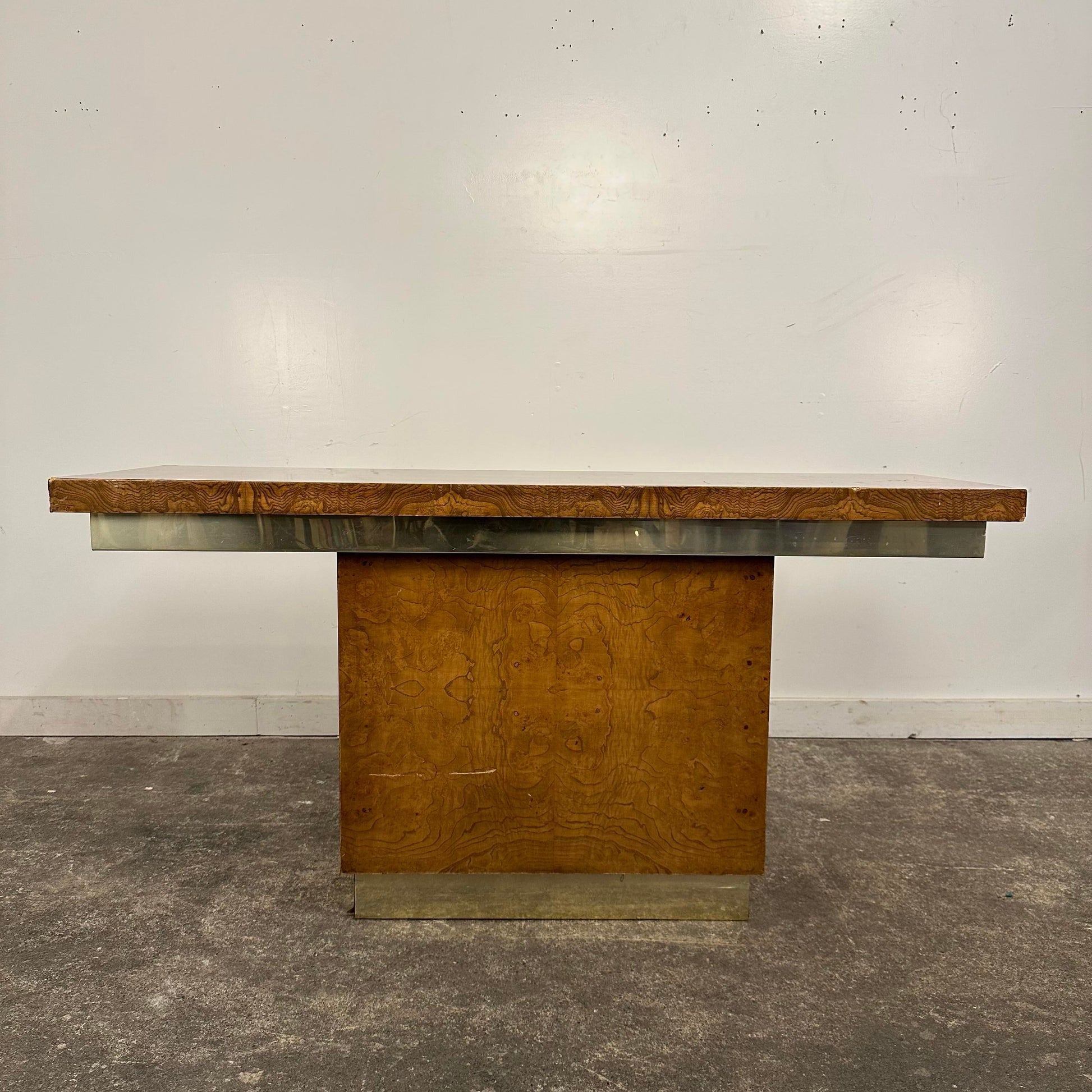 Burlwood and brass Sofa table Console Table. This console table features a stunning burl wood top and elegant brass accents. This unique piece combines natural textures with a touch of glam, creating a perfect balance of rustic charm and sophisticated style. Ideal as an entryway statement or sofa table.
