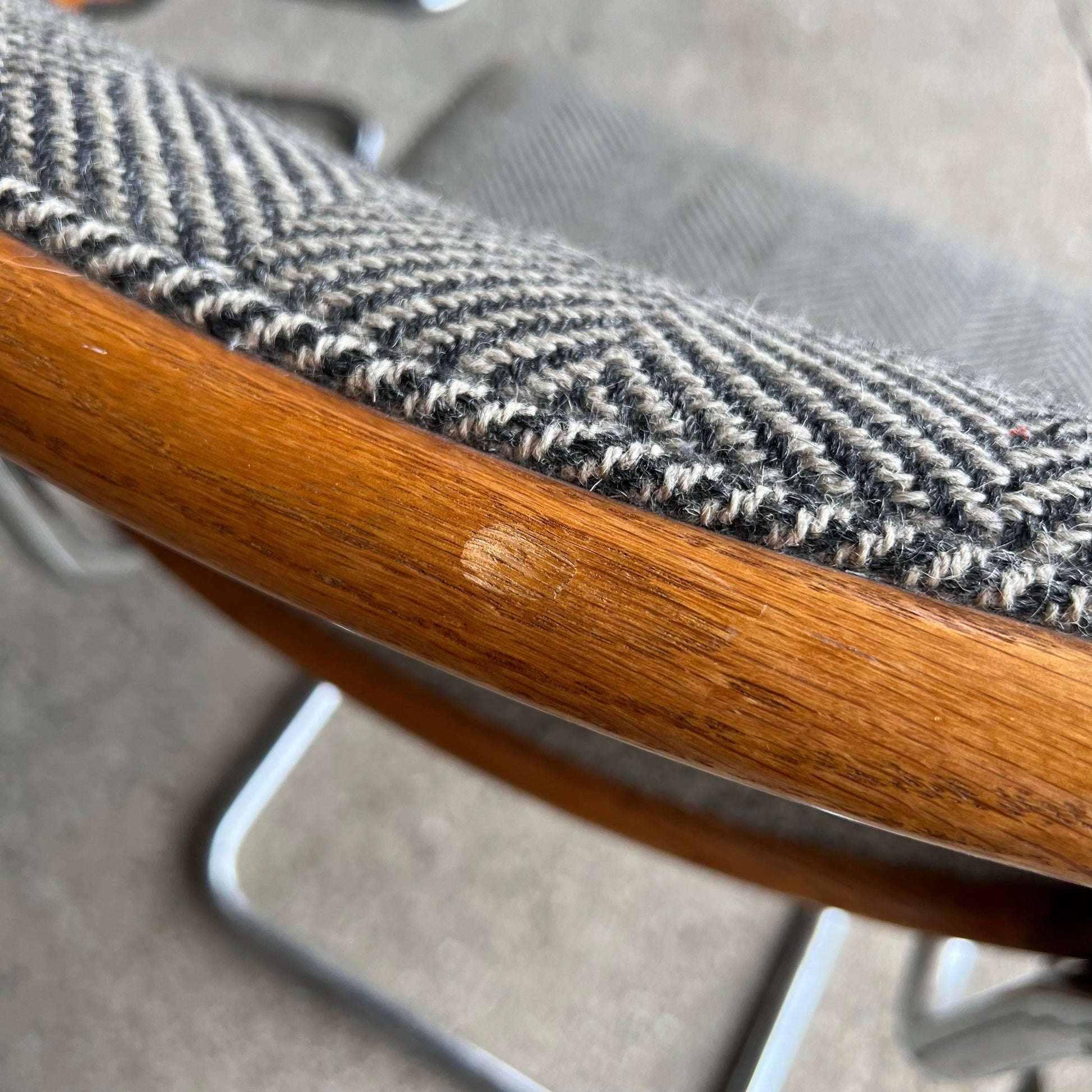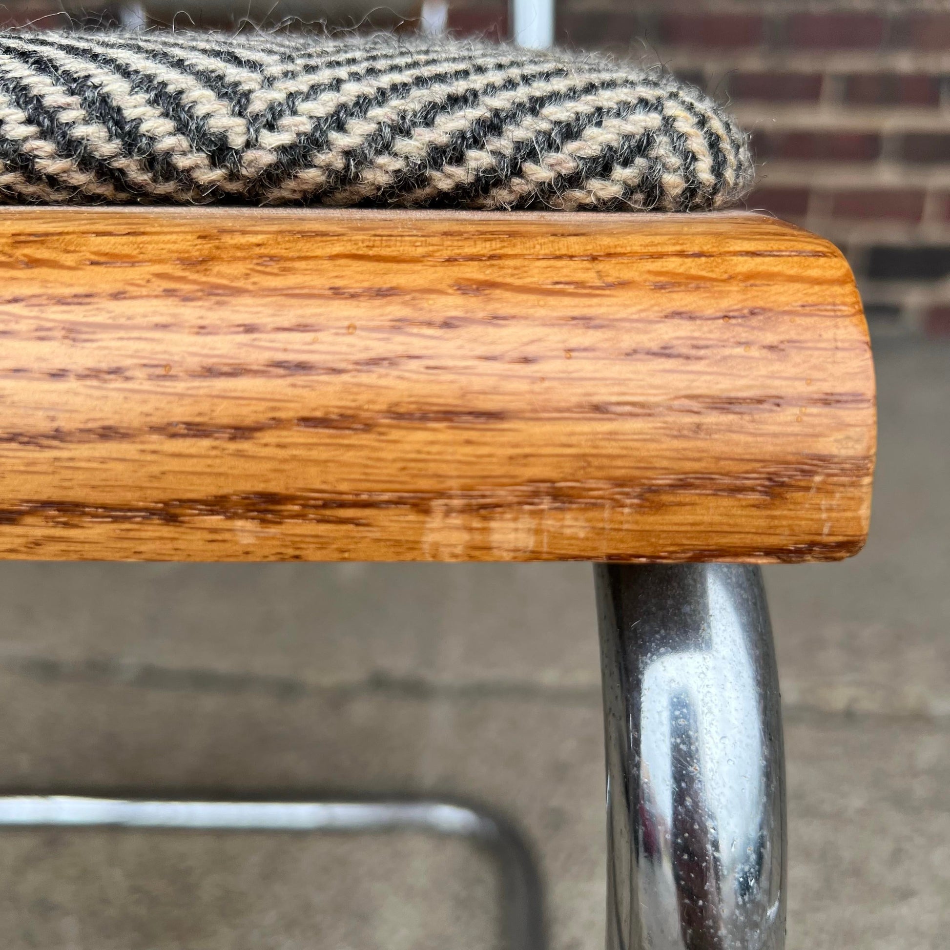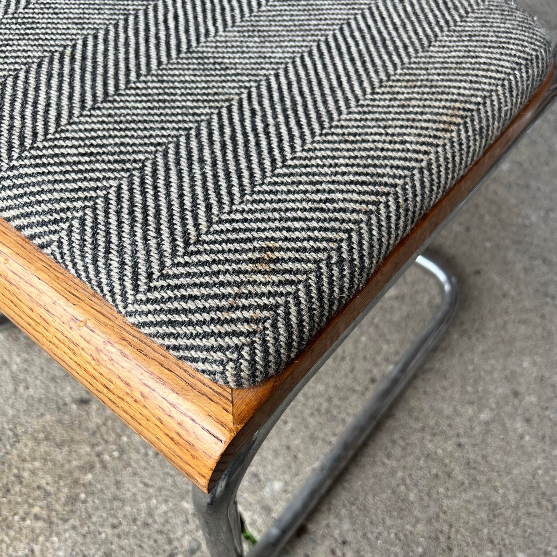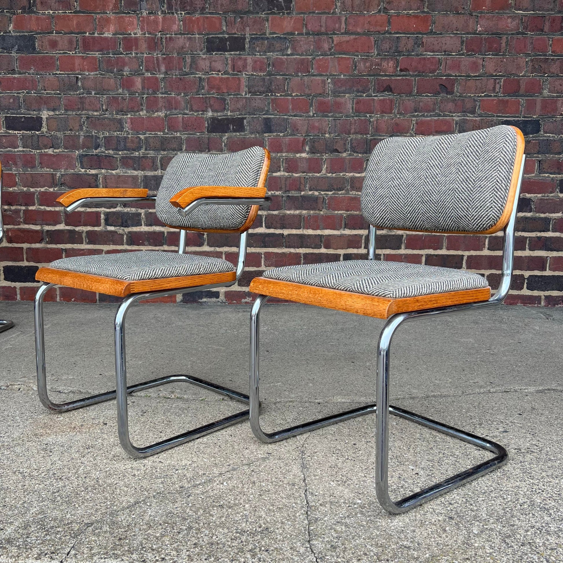 These cantilever chairs are a classic for a reason. Tubular chrome frames juxtaposed with grainy oak makes for a stunning melange of materials. The fabric is a heavy woven chevron of black and beige. This set of 6 would bring a taste of modern into any dining room.